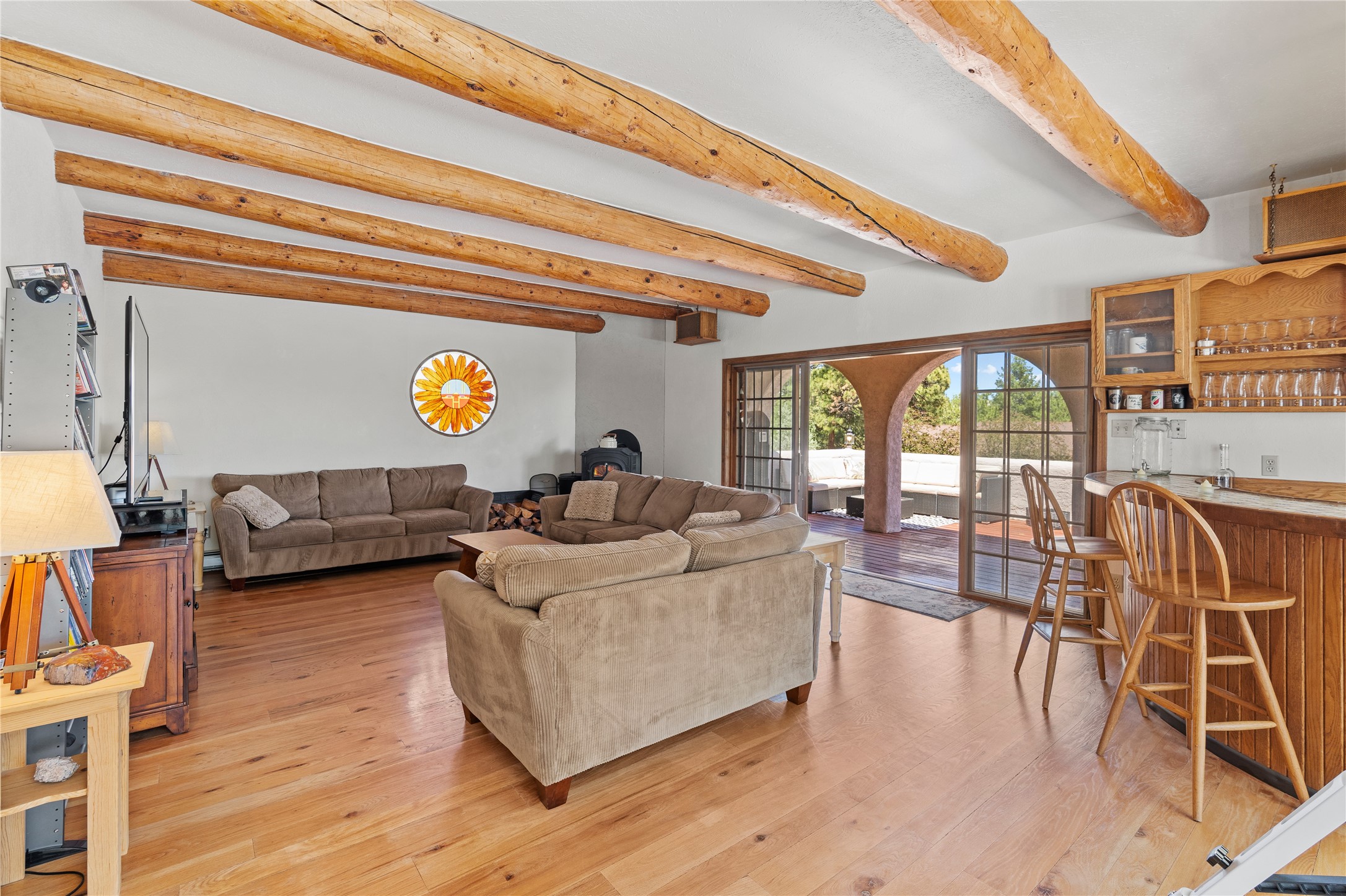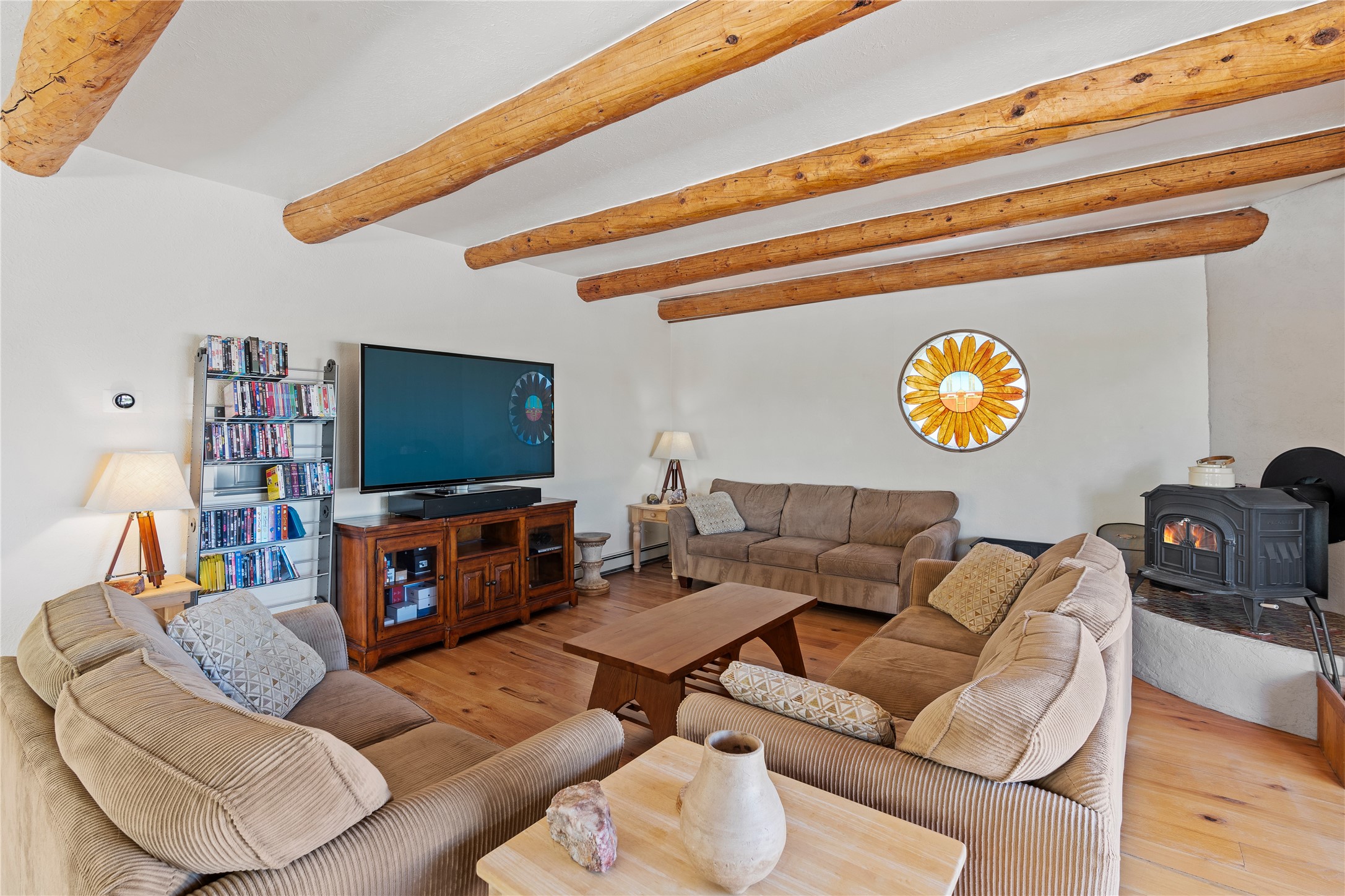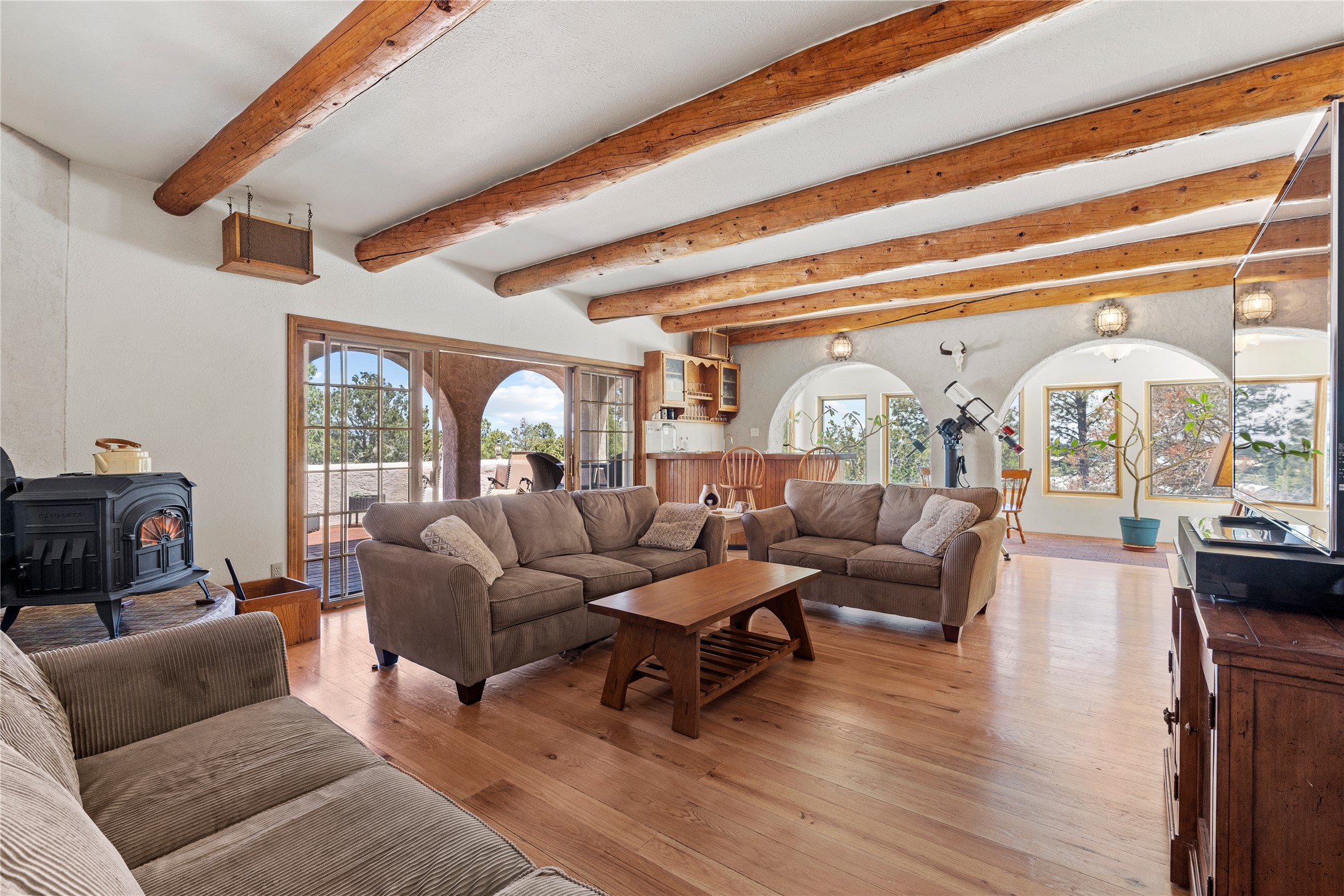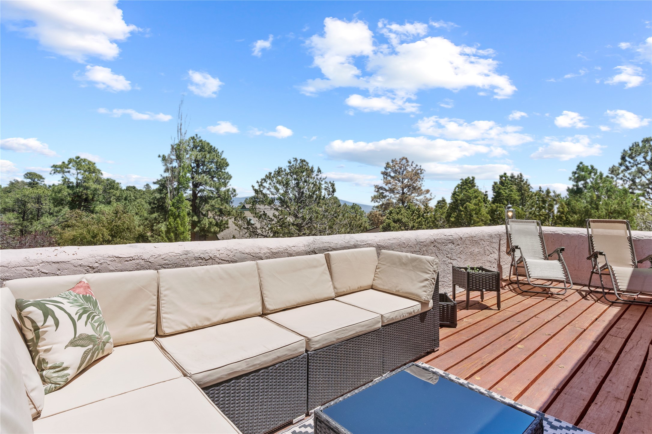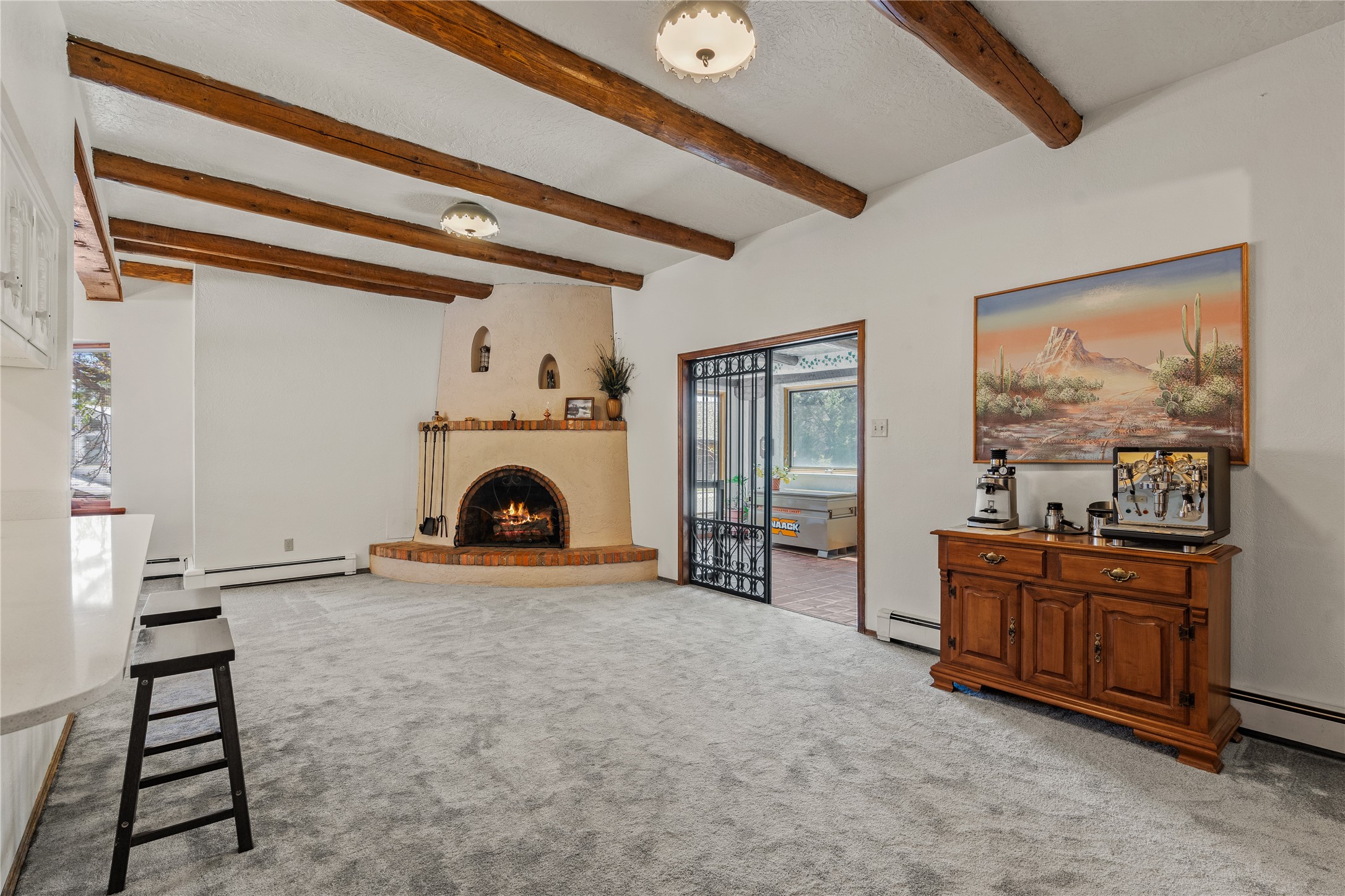 Charming Two-Story Corner Lot Home in North Mesa! Nestled behind a lush wall of mature trees and bushes, this home offers privacy, character, and a peaceful setting. Step inside through the brick-accented entry to discover warm vigas-beamed ceilings that carry throughout the main living spaces, adding rustic elegance. A cozy carpeted living room with a large front-facing window floods the space with natural light. Flowing seamlessly from the living room is the open great room, which combines the dining area and spacious family room anchored by a gas kiva fireplace and a tiled sunroom, offering a tranquil space to enjoy year-round. Adjacent to the great room is a white galley-style kitchen featuring quartz counters, stainless steel appliances, and a beautiful chandelier that highlights the ceiling beams. A convenient pass-through counter doubles as bar seating and opens to the family room, making it perfect for entertaining or casual meals. Down the hallway are two guest bedrooms and a guest bathroom. A spacious primary en-suite offers multiple closets and a bathroom with a walk-in shower. Also on this level is a laundry closet, as well as access to a two-car garage. Upstairs, the home continues to impress with a secondary family room featuring rich oak wood floors, a cozy wood-burning stove, and a wet bar--ideal for relaxing or hosting. A second tiled sunroom provides additional light-filled living space, while sliding doors open to a partially covered deck with ample room for lounge seating, outdoor dining, and entertaining. This upper level also includes an additional guest bedroom and a guest bathroom, offering flexible space for guests or hobbies. Throughout the home, you'll find double-pane windows with built-in blinds for energy efficiency and clean aesthetics. The backyard offers a private oasis with a grassy lawn with mature fruit trees. Also, take note of the large concrete driveway with RV parking and 30A RV power hookup.