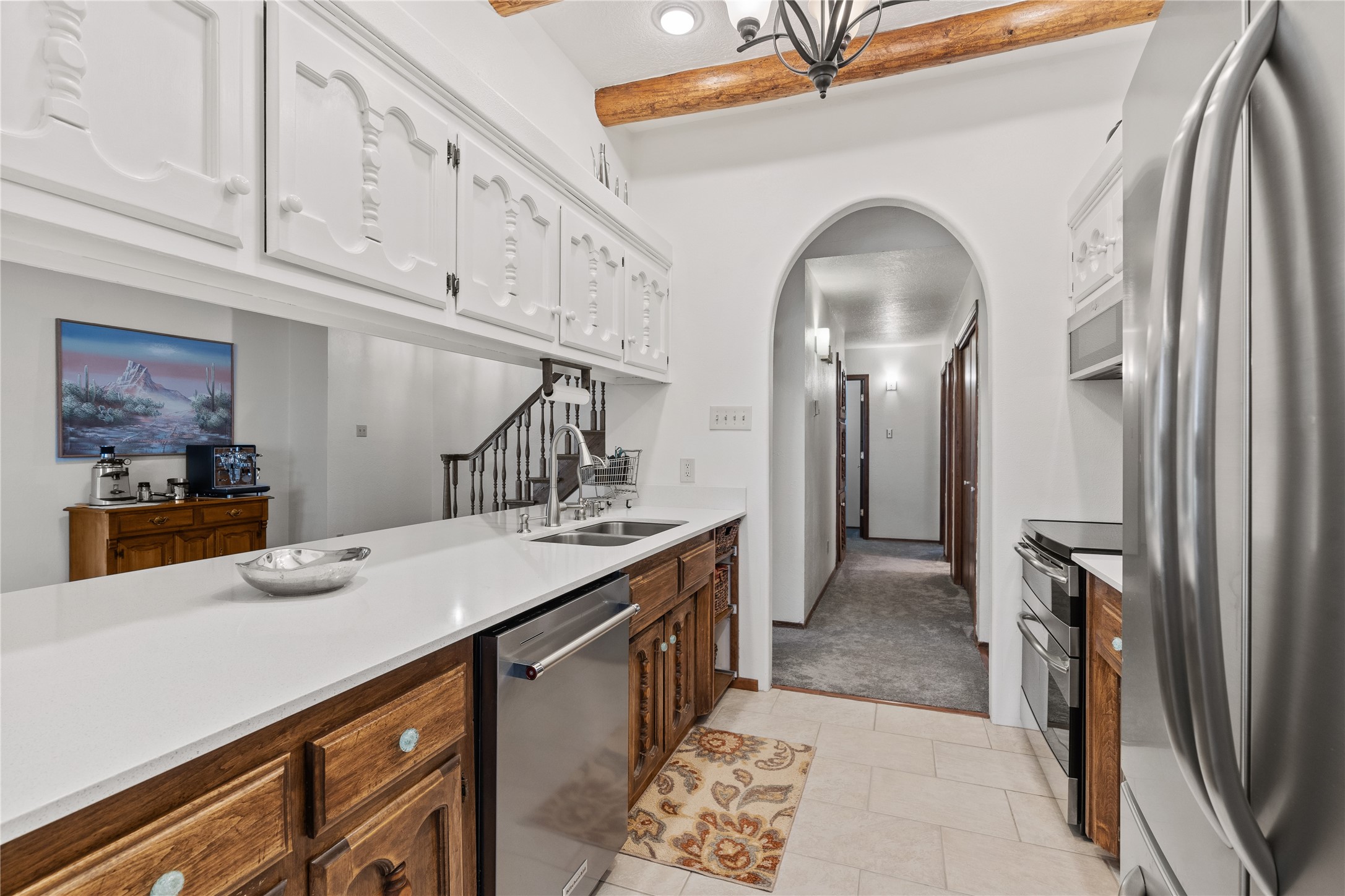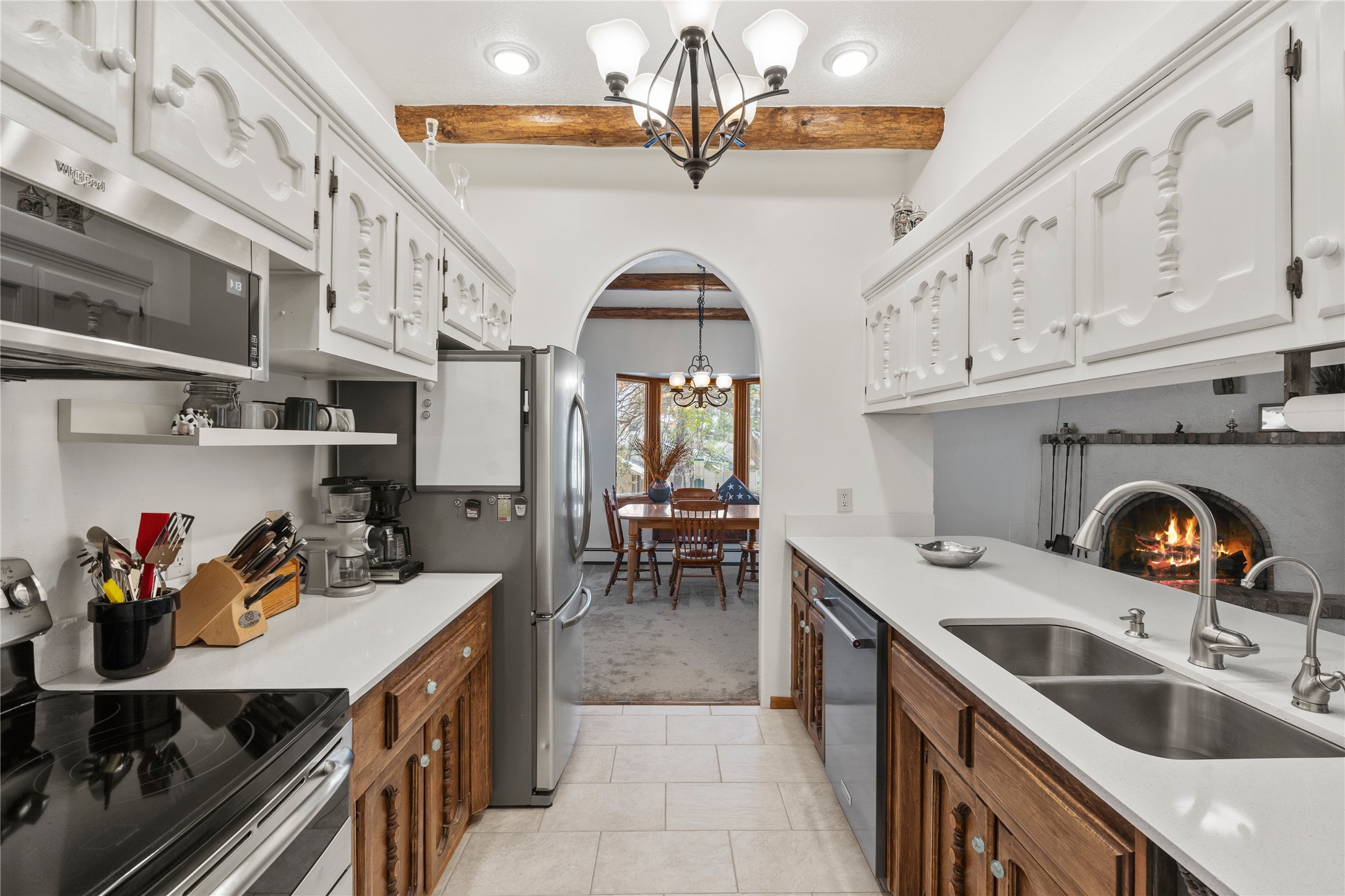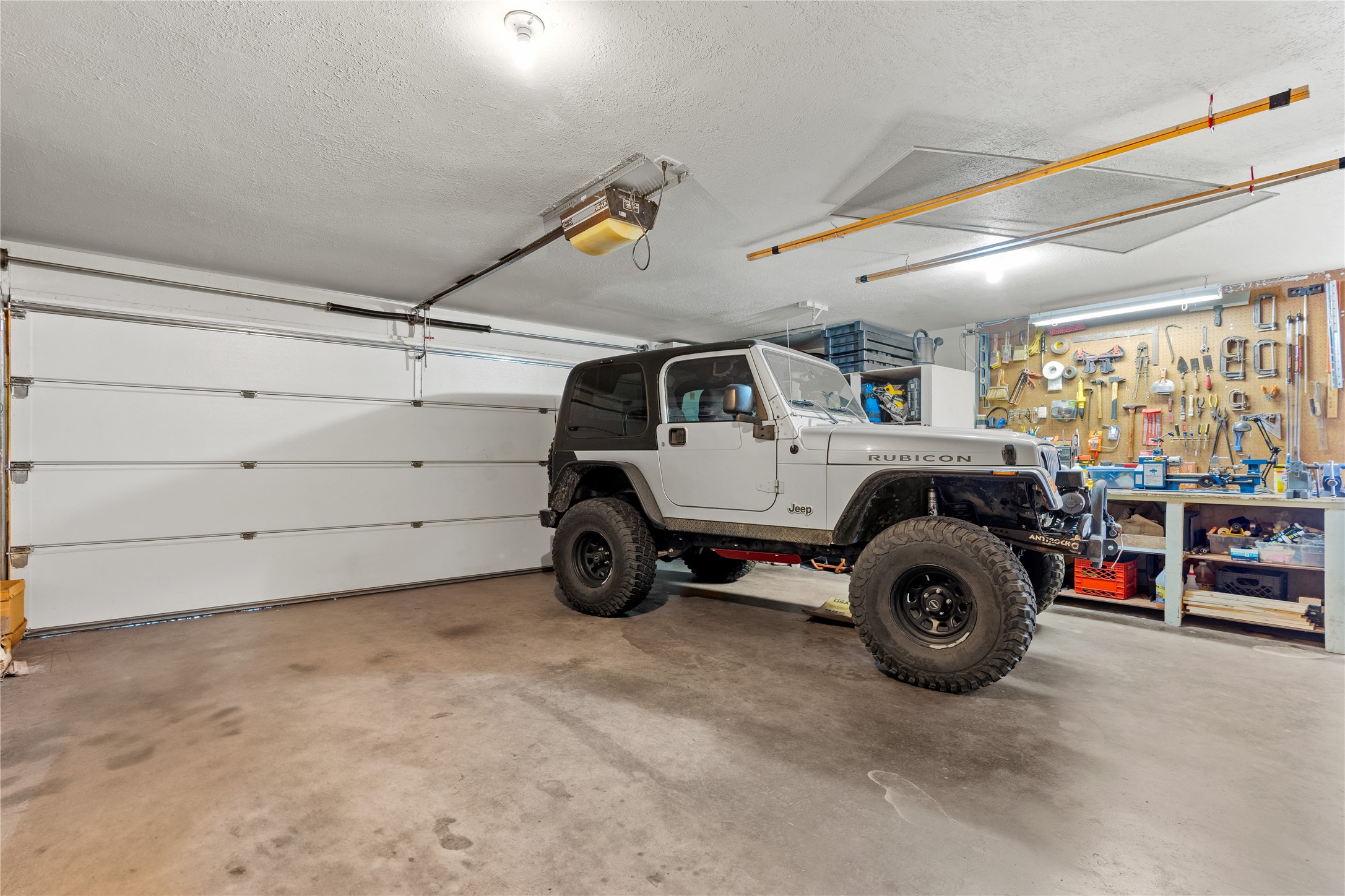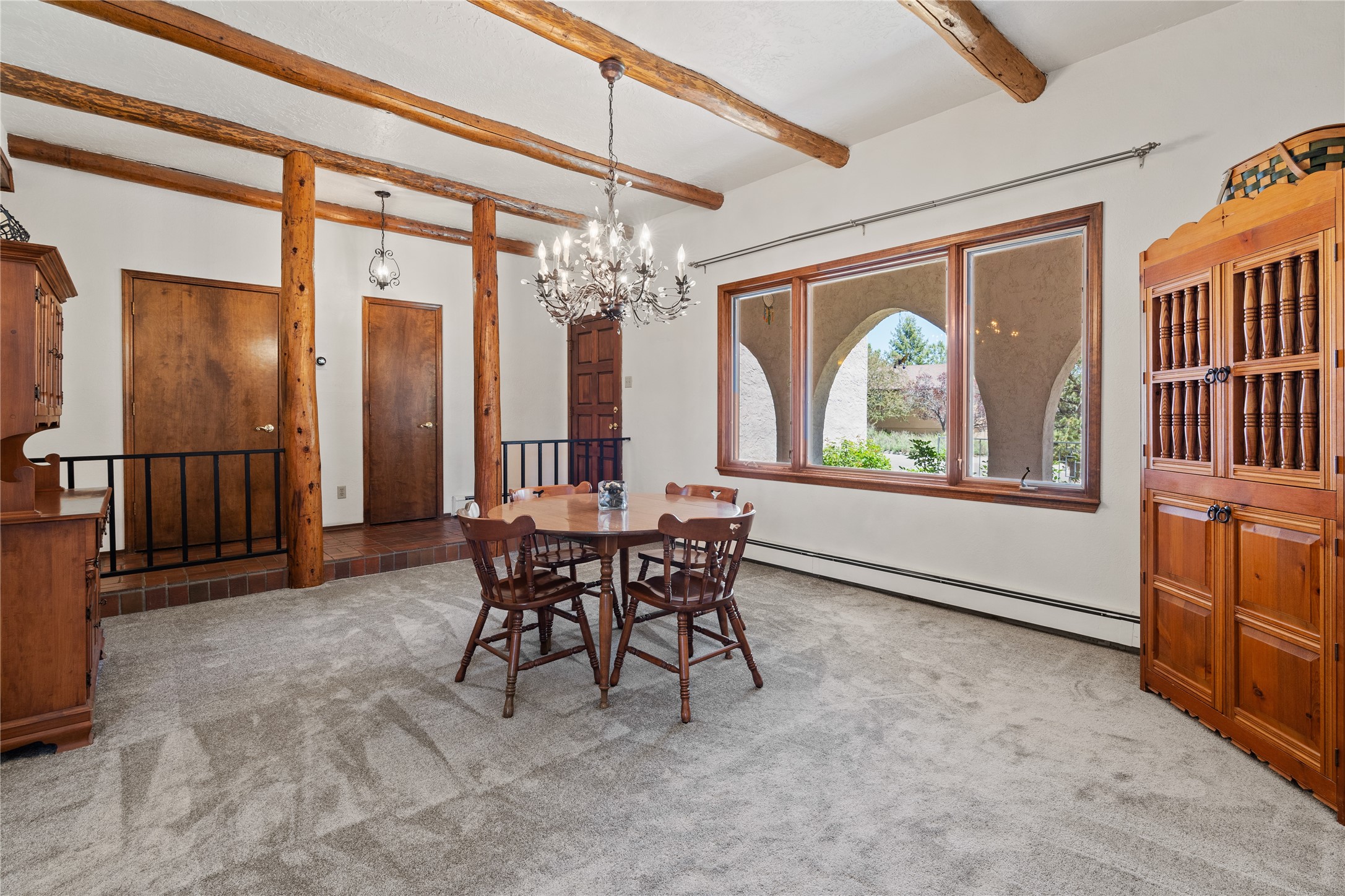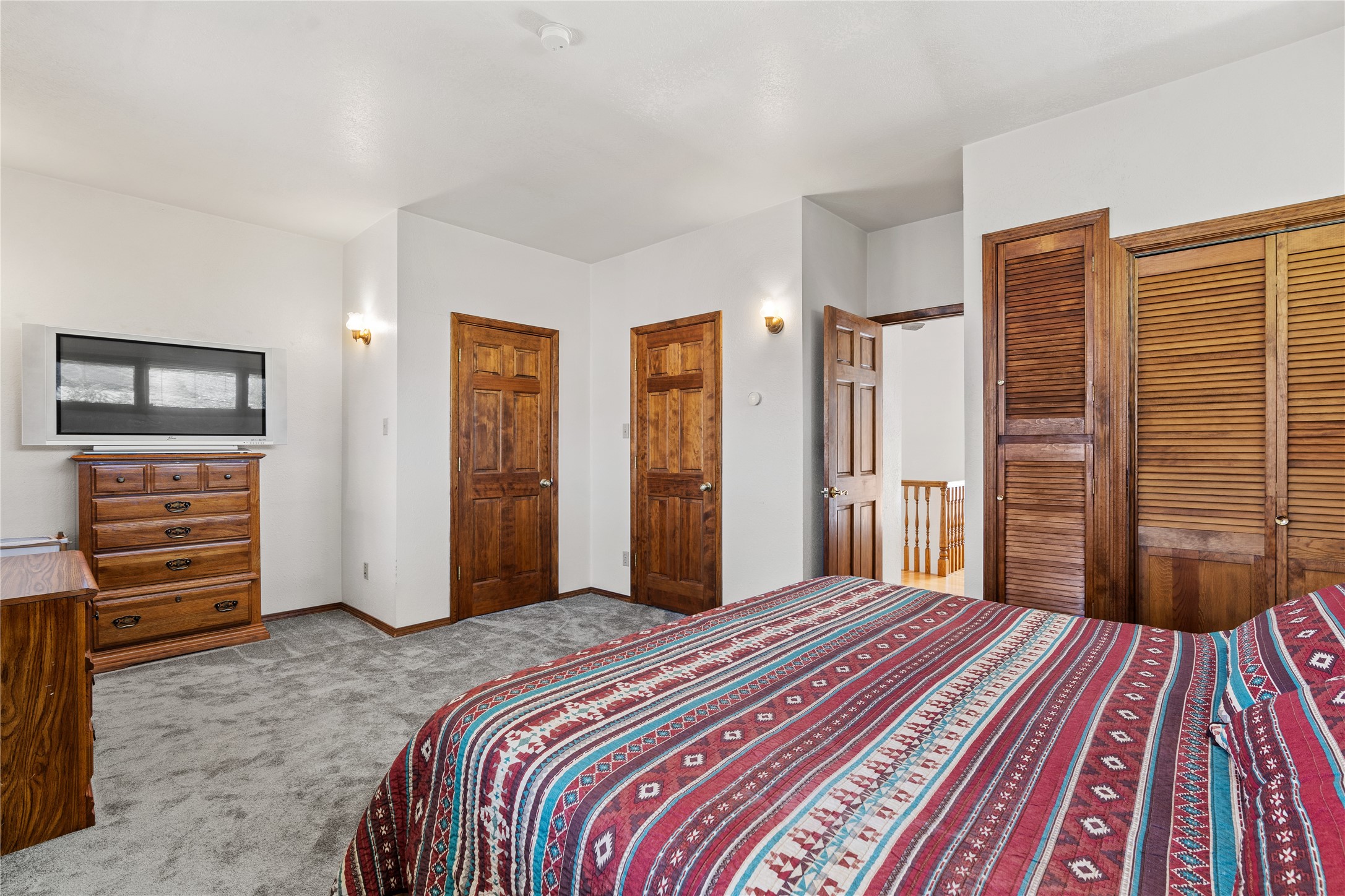 Charming Two-Story Corner Lot Home in North Mesa! Nestled behind a lush wall of mature trees and bushes, this home offers privacy, character, and a peaceful setting. Step inside through the brick-accented entry to discover warm vigas-beamed ceilings that carry throughout the main living spaces, adding rustic elegance. A cozy carpeted living room with a large front-facing window floods the space with natural light. Flowing seamlessly from the living room is the open great room, which combines the dining area and spacious family room anchored by a gas kiva fireplace and a tiled sunroom, offering a tranquil space to enjoy year-round. Adjacent to the great room is a white galley-style kitchen featuring quartz counters, stainless steel appliances, and a beautiful chandelier that highlights the ceiling beams. A convenient pass-through counter doubles as bar seating and opens to the family room, making it perfect for entertaining or casual meals. Down the hallway are two guest bedrooms and a guest bathroom. A spacious primary en-suite offers multiple closets and a bathroom with a walk-in shower. Also on this level is a laundry closet, as well as access to a two-car garage. Upstairs, the home continues to impress with a secondary family room featuring rich oak wood floors, a cozy wood-burning stove, and a wet bar--ideal for relaxing or hosting. A second tiled sunroom provides additional light-filled living space, while sliding doors open to a partially covered deck with ample room for lounge seating, outdoor dining, and entertaining. This upper level also includes an additional guest bedroom and a guest bathroom, offering flexible space for guests or hobbies. Throughout the home, you'll find double-pane windows with built-in blinds for energy efficiency and clean aesthetics. The backyard offers a private oasis with a grassy lawn with mature fruit trees. Also, take note of the large concrete driveway with RV parking and 30A RV power hookup.