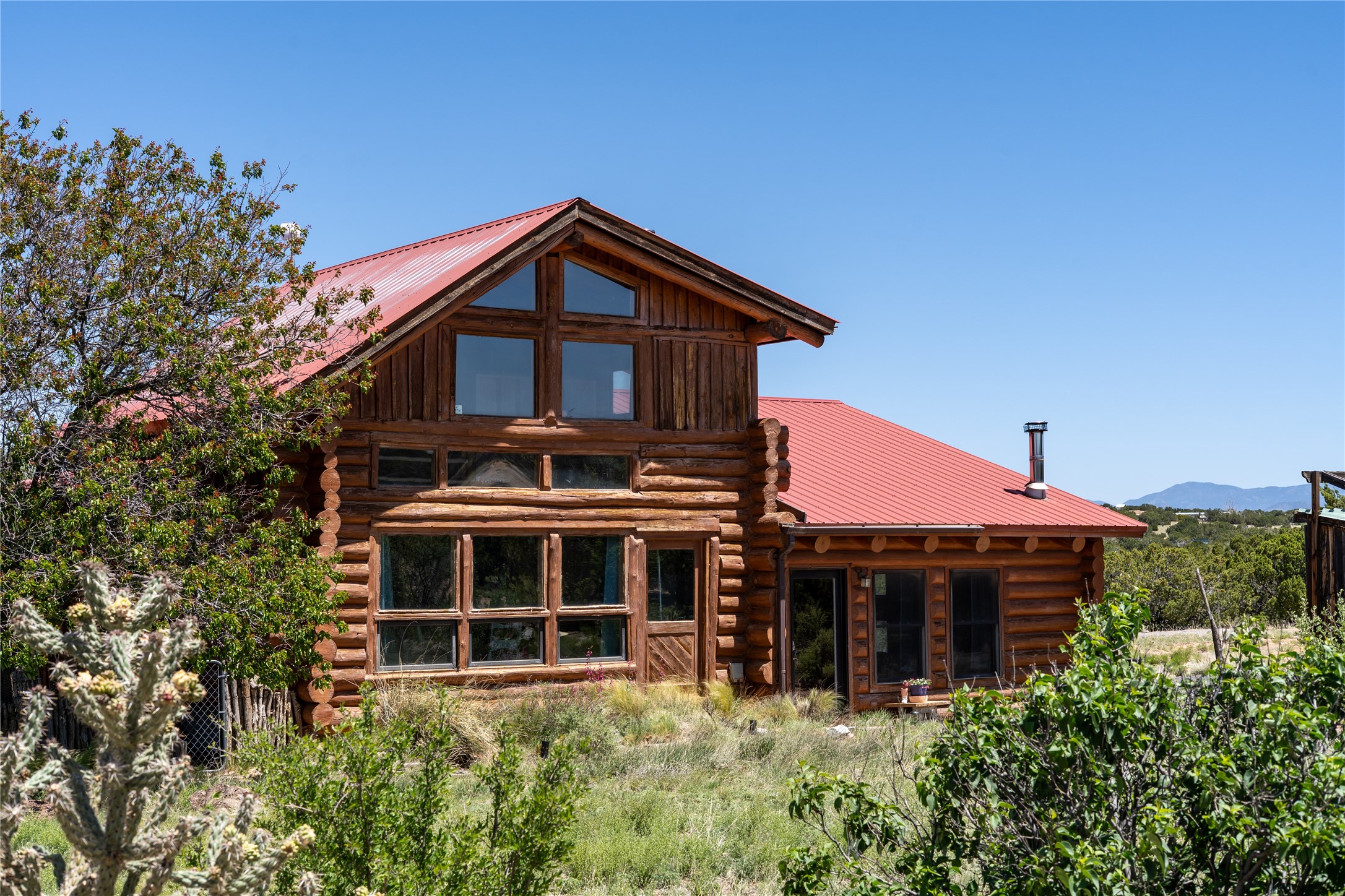 Escape to your private slice of the Wild West with this stunning 2-story, 2-bedroom, 2-bathroom true log cabin. Nestled on over 10 sprawling acres with an enviable address on the historic Camino Los Abuelos, this home is surrounded by wide open skies and rolling desert terrain, and enjoys paved road the whole way to the driveway.Step inside and enjoy the warmth of handcrafted log walls, soaring ceilings, and a cozy wood-burning stove. Downstairs, a well-appointed kitchen flows into 2 living spaces, the primary suite, and an unfinished sunroom. Upstairs, a spacious loft-style bedroom with its own 3/4 bath is perched, awaiting your southwestern accents.Whether you're sipping coffee on the porch, stargazing in the clear New Mexico skies, or exploring your very own high desert acreage, this home is a true retreat. Ideal for artists, adventurers, homesteaders, or anyone craving solitude and inspiration. Located within minutes of the San Marcos Feed Store and Beer Creek Brewery, and close enough to Santa Fe's rich culture, galleries, and cuisine--but far enough to enjoy peace, privacy, and panoramic views.