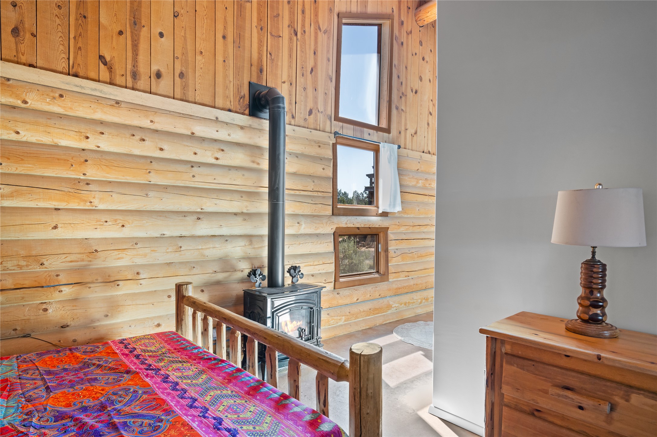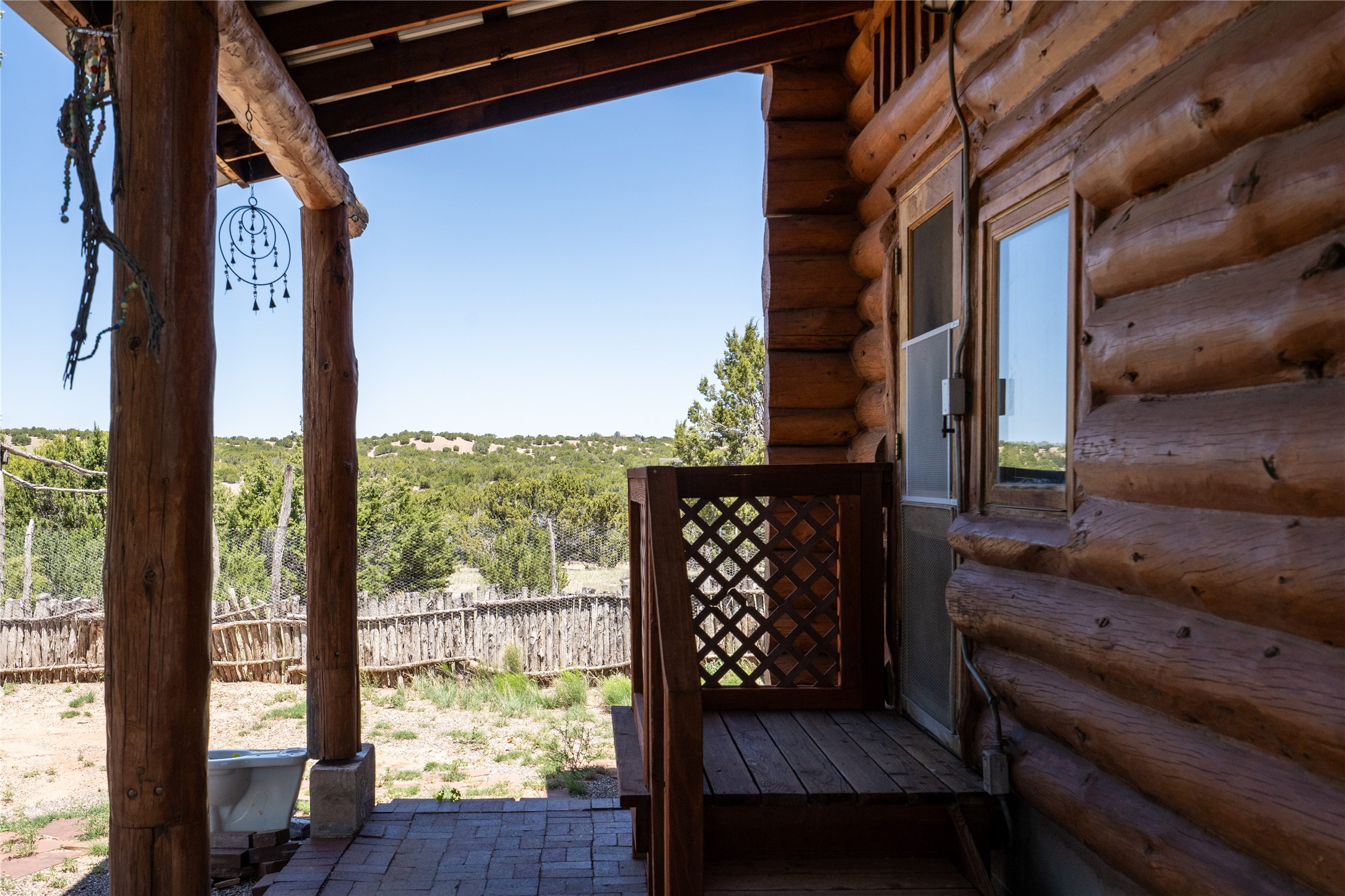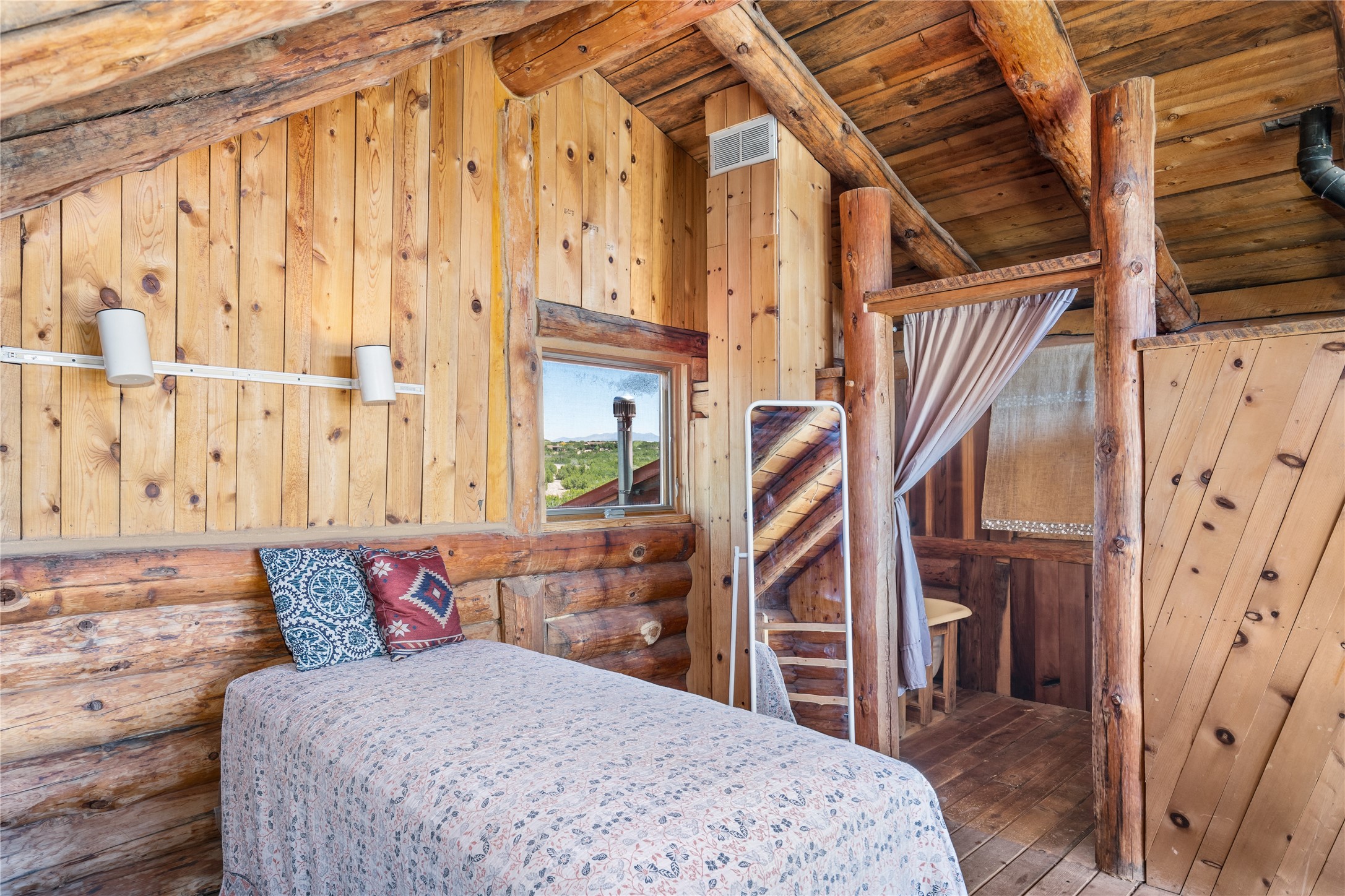 Escape to your private slice of the Wild West with this stunning 2-story, 2-bedroom, 2-bathroom true log cabin. Nestled on over 10 sprawling acres with an enviable address on the historic Camino Los Abuelos, this home is surrounded by wide open skies and rolling desert terrain, and enjoys paved road the whole way to the driveway.Step inside and enjoy the warmth of handcrafted log walls, soaring ceilings, and a cozy wood-burning stove. Downstairs, a well-appointed kitchen flows into 2 living spaces, the primary suite, and an unfinished sunroom. Upstairs, a spacious loft-style bedroom with its own 3/4 bath is perched, awaiting your southwestern accents.Whether you're sipping coffee on the porch, stargazing in the clear New Mexico skies, or exploring your very own high desert acreage, this home is a true retreat. Ideal for artists, adventurers, homesteaders, or anyone craving solitude and inspiration. Located within minutes of the San Marcos Feed Store and Beer Creek Brewery, and close enough to Santa Fe's rich culture, galleries, and cuisine--but far enough to enjoy peace, privacy, and panoramic views.