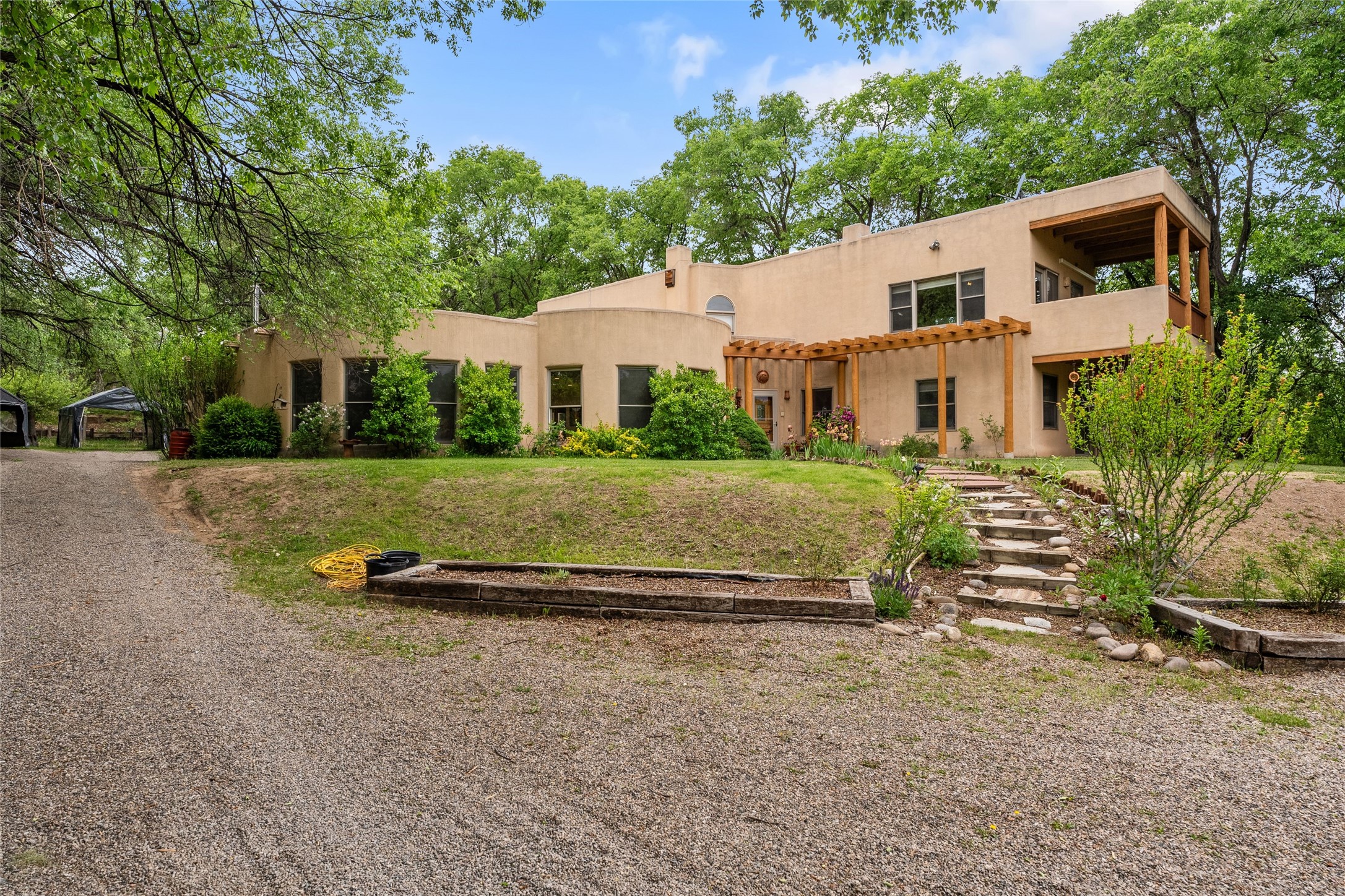 Welcome to 65 E. Sombrillo--Private and secluded--a stunning rural retreat nestled in a peaceful valley between mountain ranges and surrounded by small farming parcels. This custom-built, 4,007 sq. ft single-family home offers 3 bedrooms and 3 bathrooms, office and chapel, on over 2 acres of private, gated land. Built by Tyaga and Company, the home combines modern comfort with country charm, featuring active solar panels, radiant floor heating, ceiling fans in every room, and mini-split systems for efficient heating and cooling. Enjoy cozy evenings with 2 wood-burning fireplaces and a wood stove. The property includes a new boiler and hot water heater, a private well, 2.4 acre-feet of surface irrigation rights (just $150/year), underground sprinklers, a fully enclosed 350 sq ft chicken coop and a 75' by 30' fully enclosed dog run. The GACO-upgraded roof includes a 50-year warranty for peace of mind. River frontage, horse and farm animal-friendly, light-filled throughout, this home is perfect for those seeking tranquility without sacrificing convenience--located just 25 miles from of Santa Fe, with an easy commute to Los Alamos or Taos. Whether you're tending a garden, raising animals, or as a great base for hiking, river running and ski trips This property offers an exceptional lifestyle in the heart of Northern New Mexico.