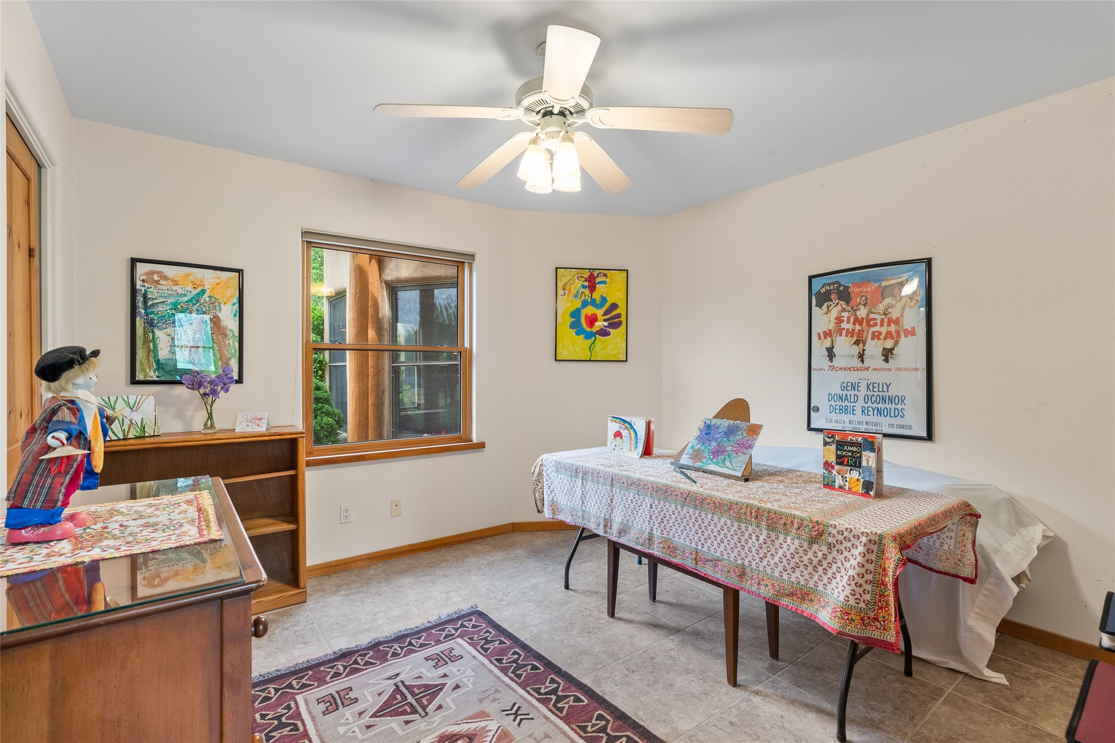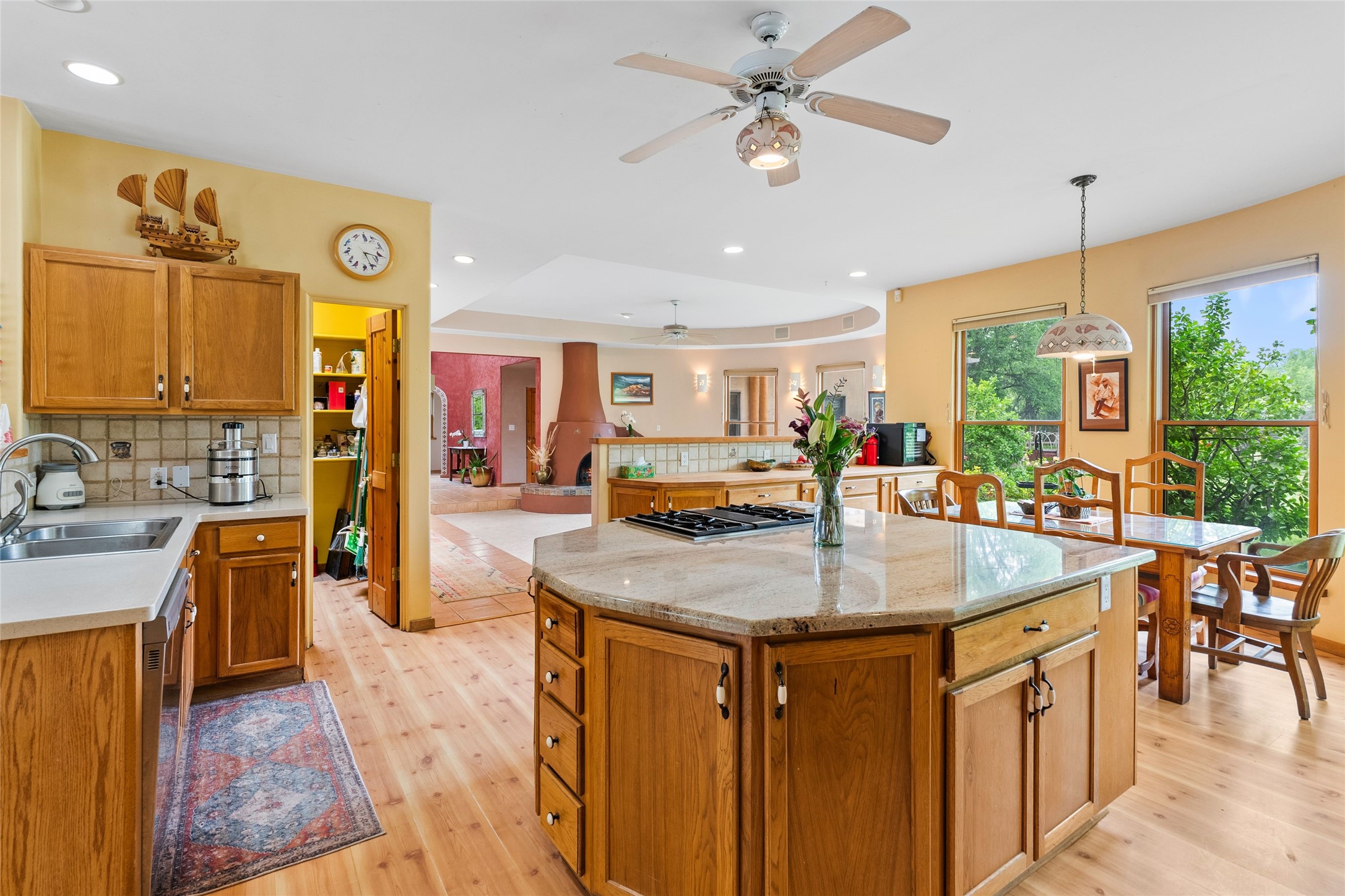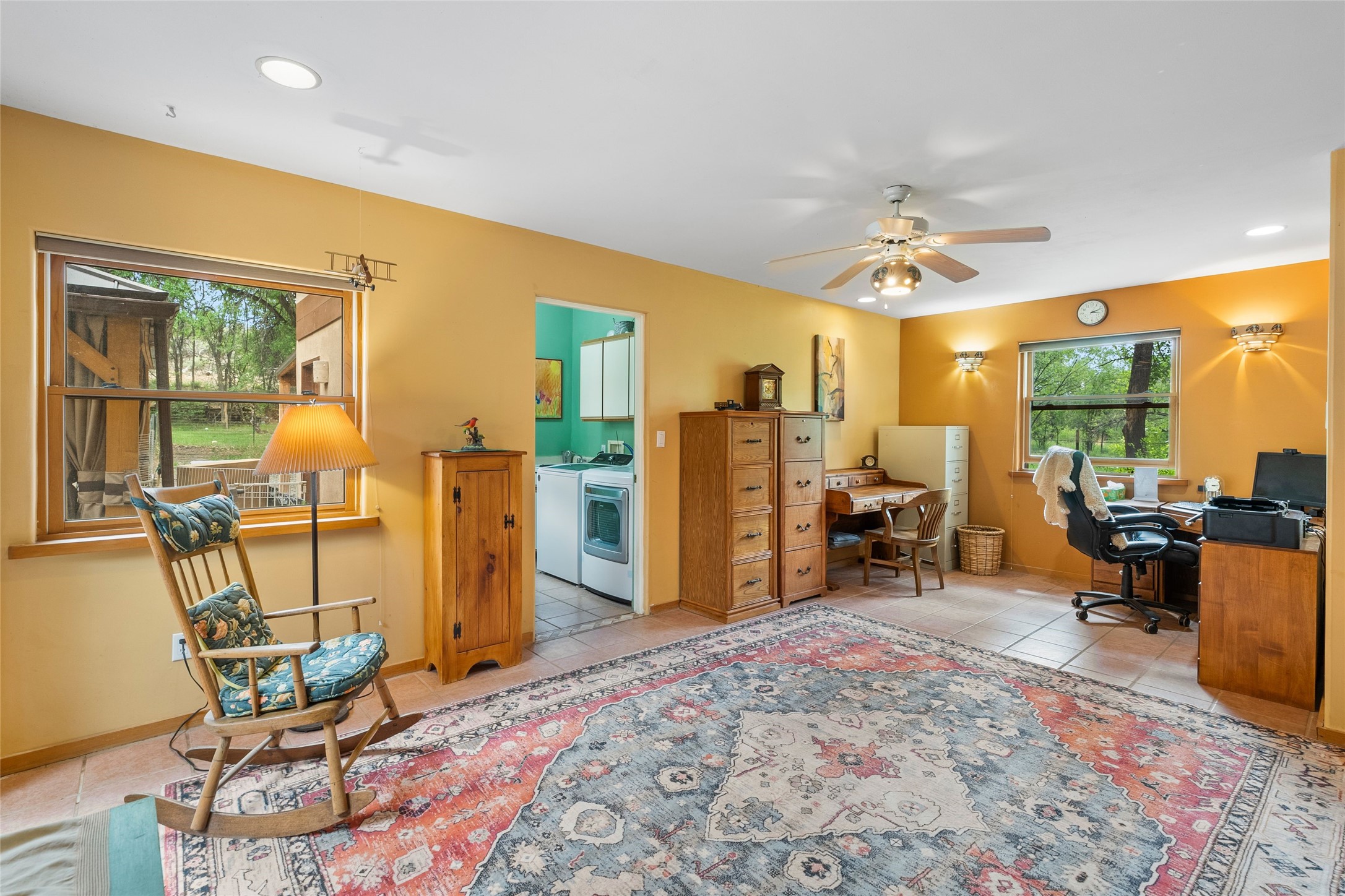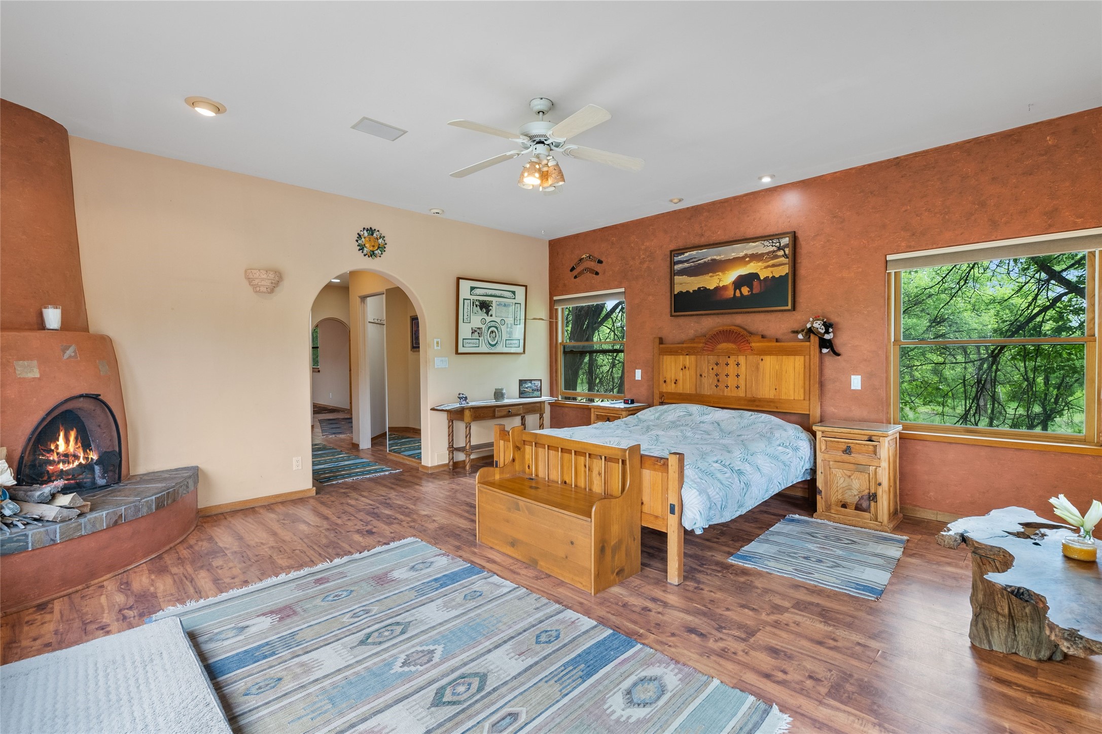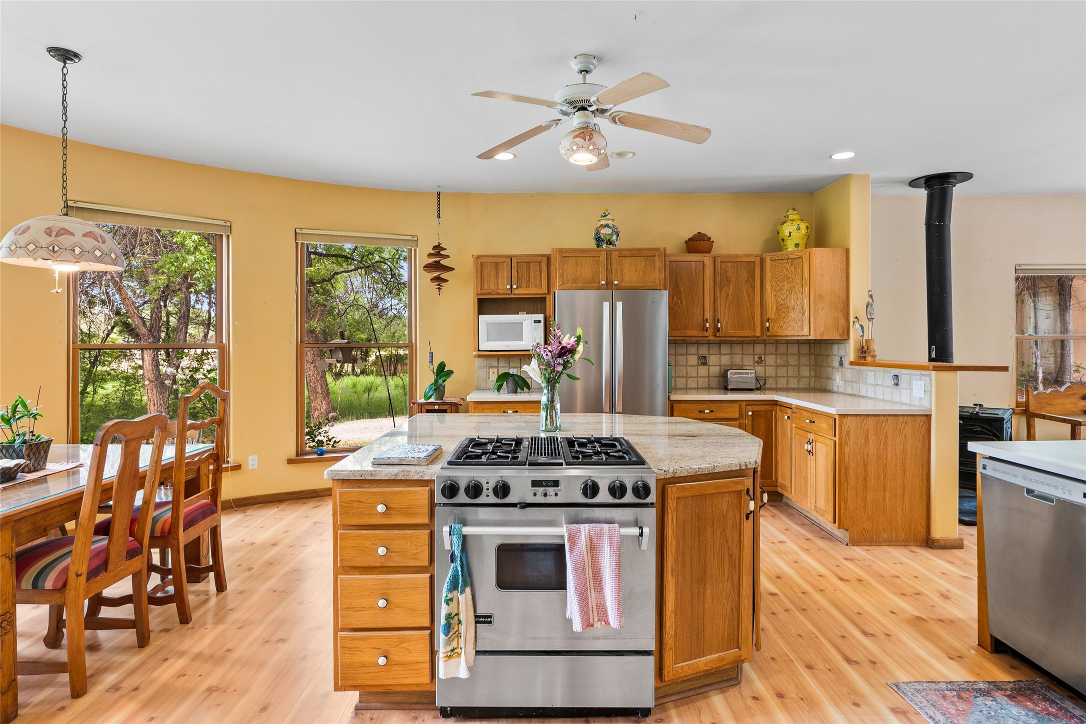 Welcome to 65 E. Sombrillo--Private and secluded--a stunning rural retreat nestled in a peaceful valley between mountain ranges and surrounded by small farming parcels. This custom-built, 4,007 sq. ft single-family home offers 3 bedrooms and 3 bathrooms, office and chapel, on over 2 acres of private, gated land. Built by Tyaga and Company, the home combines modern comfort with country charm, featuring active solar panels, radiant floor heating, ceiling fans in every room, and mini-split systems for efficient heating and cooling. Enjoy cozy evenings with 2 wood-burning fireplaces and a wood stove. The property includes a new boiler and hot water heater, a private well, 2.4 acre-feet of surface irrigation rights (just $150/year), underground sprinklers, a fully enclosed 350 sq ft chicken coop and a 75' by 30' fully enclosed dog run. The GACO-upgraded roof includes a 50-year warranty for peace of mind. River frontage, horse and farm animal-friendly, light-filled throughout, this home is perfect for those seeking tranquility without sacrificing convenience--located just 25 miles from of Santa Fe, with an easy commute to Los Alamos or Taos. Whether you're tending a garden, raising animals, or as a great base for hiking, river running and ski trips This property offers an exceptional lifestyle in the heart of Northern New Mexico.