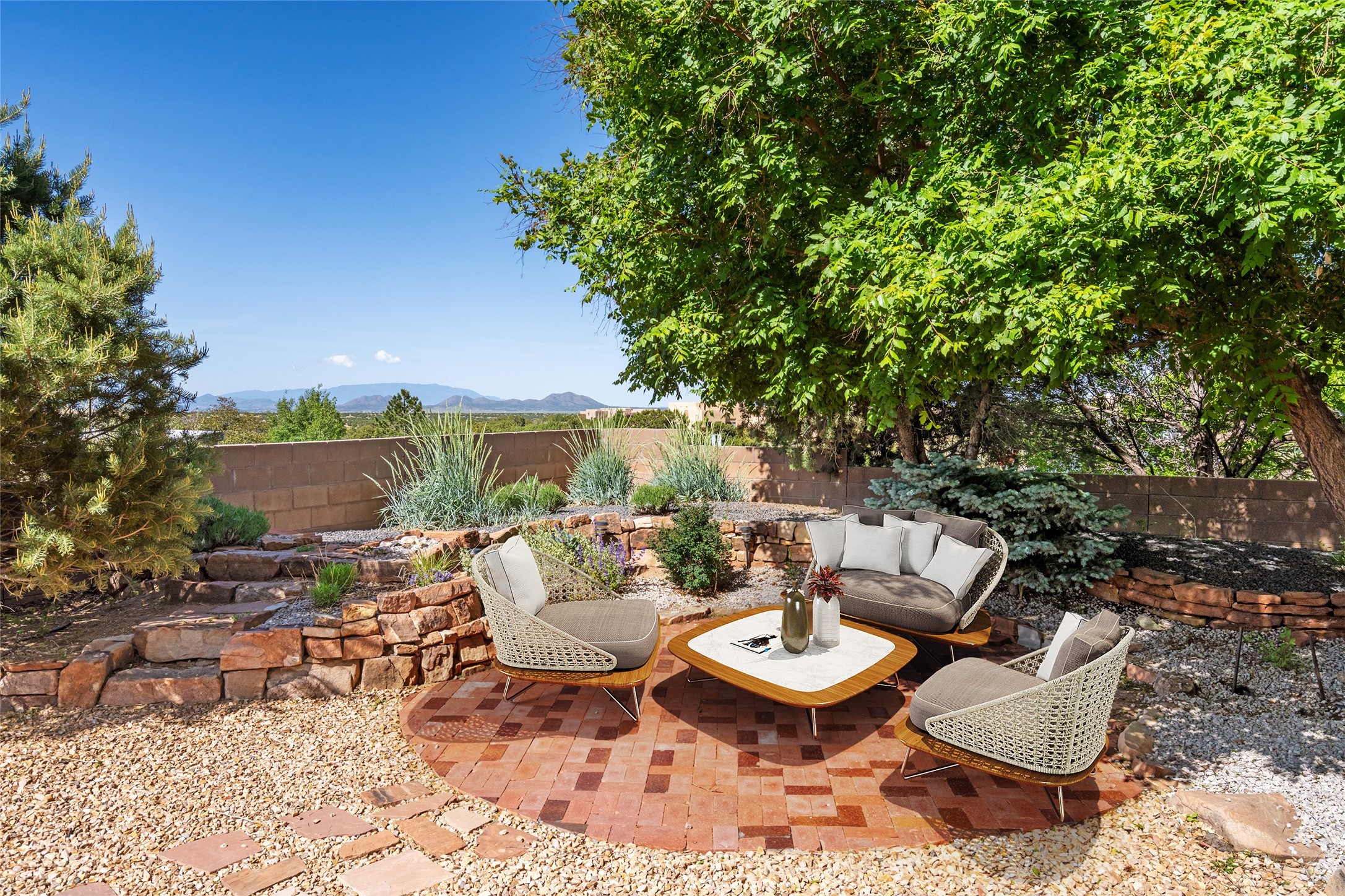 Enjoy panoramic views of the Ortiz and Sandia Mountains from this beautifully maintained single-level home in the sought-after community of Rancho Viejo. Thoughtfully designed for comfort and versatility, and painted to exude a contemporary flair, this open-concept residence features stylish tiled floors, a cozy kiva wood-burning fireplace, and abundant natural light throughout. The private primary suite is a true retreat, offering a fully updated bathroom with a stunning tiled walk-in shower, dual vanities, and a spacious walk-in closet. On the opposite side of the home, two additional bedrooms share a well-appointed guest bath--one of which makes an ideal home office or creative space. A flexible den just off the main living area provides additional options as a media room, formal dining space, hobby area, or second office--customize it to suit your lifestyle. Outside, the beautifully landscaped lot showcases native plants, mature trees, flowering rose bushes, and lovely flagstone patios and stone walkways. With no neighbors directly behind the home and views of a large community park and estate lots, the setting offers peace, privacy, and an exceptional sense of space. Rancho Viejo is a vibrant community offering over 15 miles of paved walking trails, several community parks, and well-maintained open spaces--all just 20 minutes from the Santa Fe Plaza. Dining, shopping, and daily conveniences are just minutes away. Don't miss the opportunity to own this serene and stylish home with unmatched views--schedule your showing today!