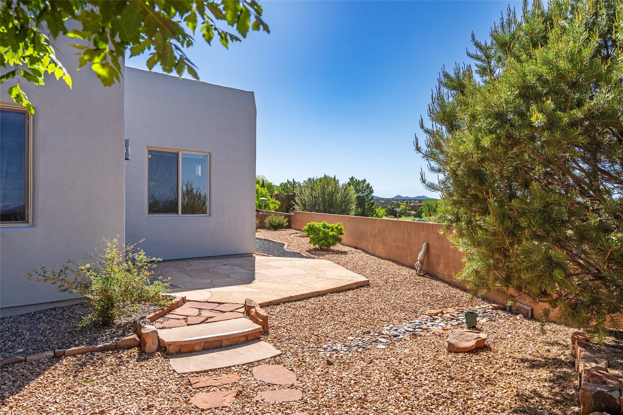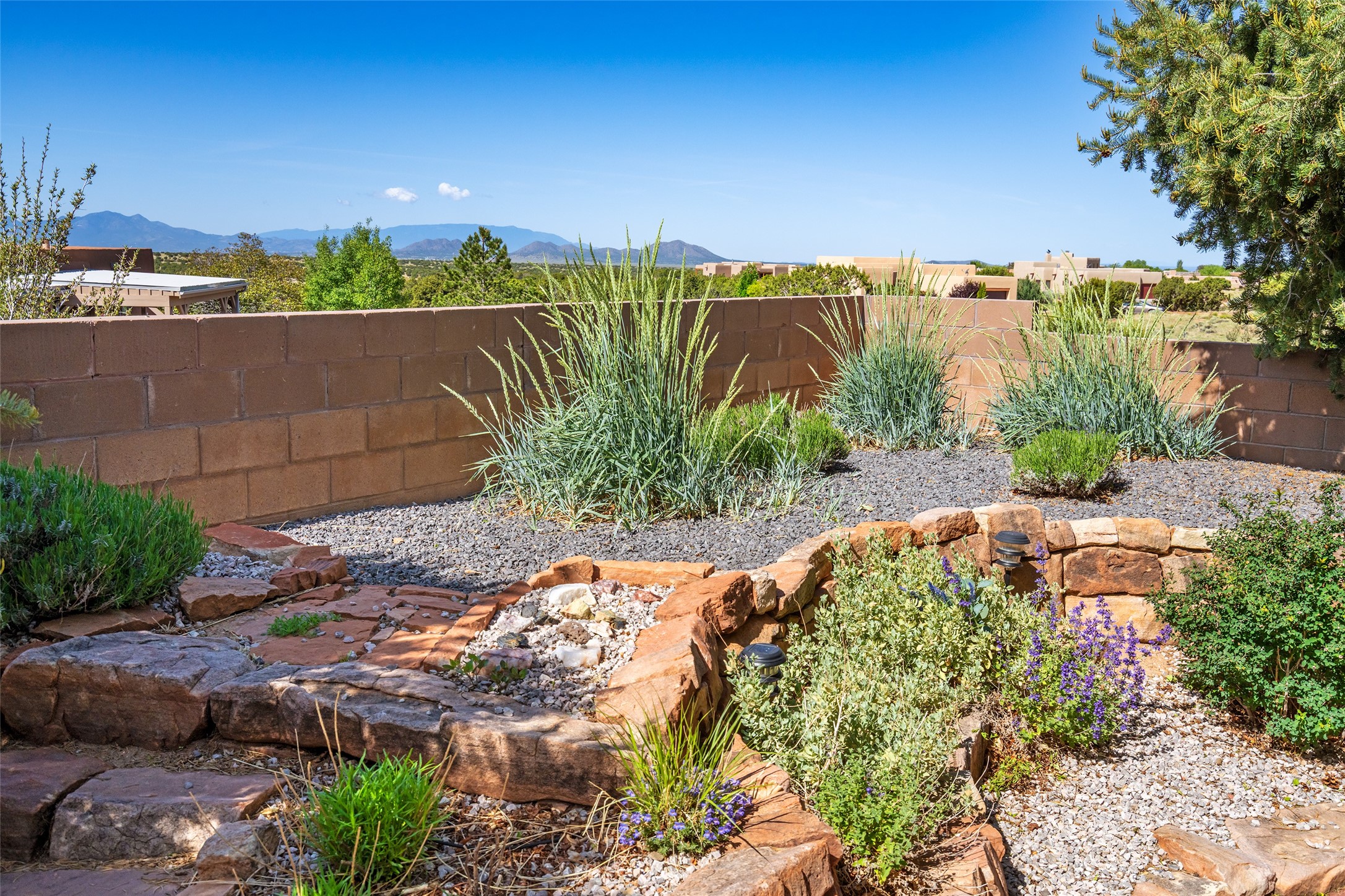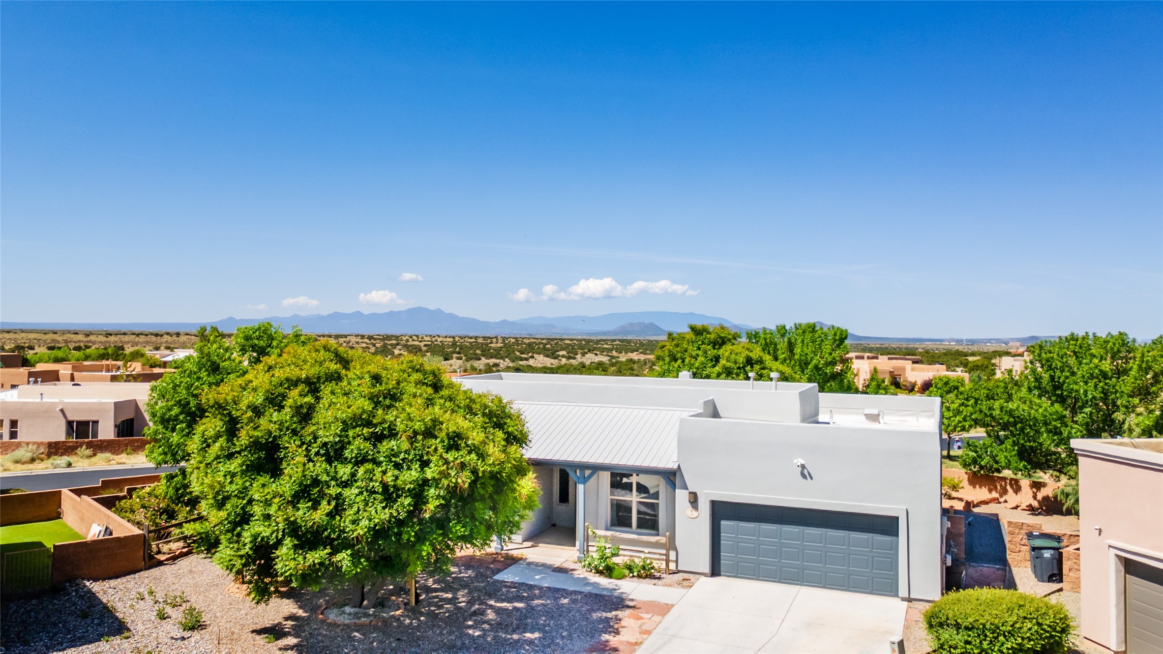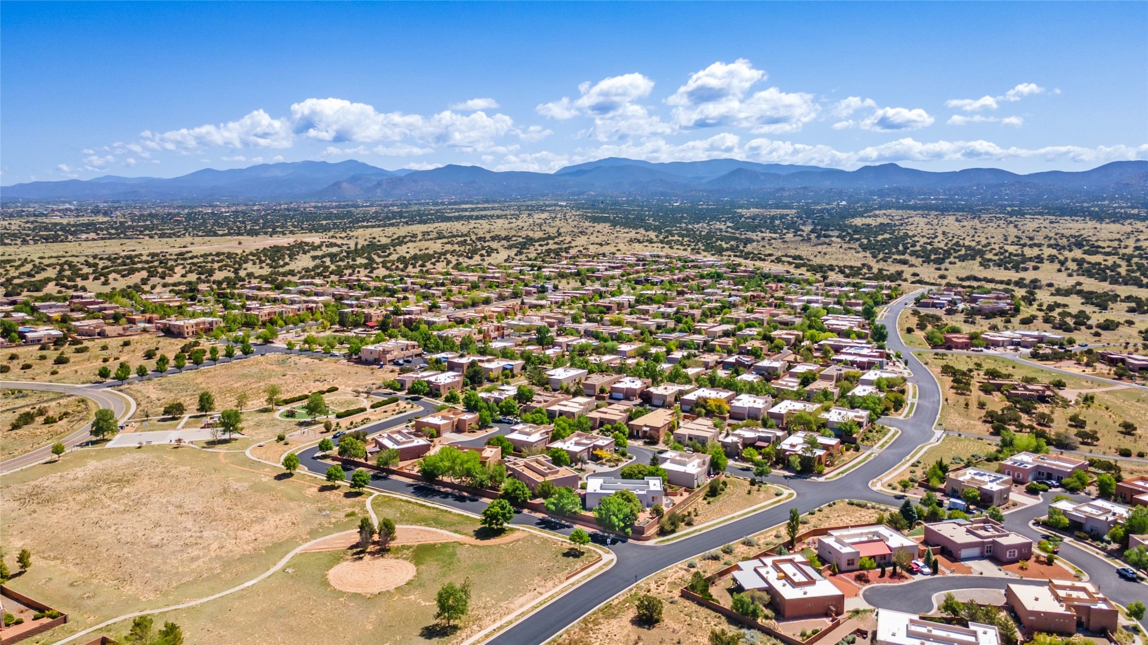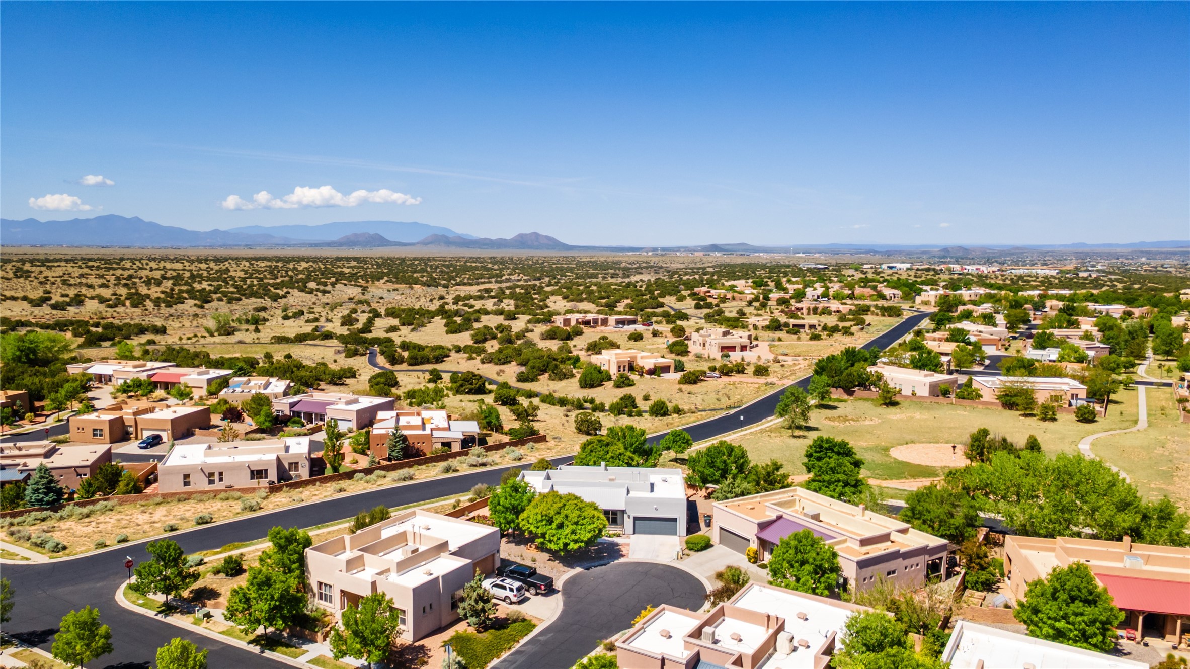 Enjoy panoramic views of the Ortiz and Sandia Mountains from this beautifully maintained single-level home in the sought-after community of Rancho Viejo. Thoughtfully designed for comfort and versatility, and painted to exude a contemporary flair, this open-concept residence features stylish tiled floors, a cozy kiva wood-burning fireplace, and abundant natural light throughout. The private primary suite is a true retreat, offering a fully updated bathroom with a stunning tiled walk-in shower, dual vanities, and a spacious walk-in closet. On the opposite side of the home, two additional bedrooms share a well-appointed guest bath--one of which makes an ideal home office or creative space. A flexible den just off the main living area provides additional options as a media room, formal dining space, hobby area, or second office--customize it to suit your lifestyle. Outside, the beautifully landscaped lot showcases native plants, mature trees, flowering rose bushes, and lovely flagstone patios and stone walkways. With no neighbors directly behind the home and views of a large community park and estate lots, the setting offers peace, privacy, and an exceptional sense of space. Rancho Viejo is a vibrant community offering over 15 miles of paved walking trails, several community parks, and well-maintained open spaces--all just 20 minutes from the Santa Fe Plaza. Dining, shopping, and daily conveniences are just minutes away. Don't miss the opportunity to own this serene and stylish home with unmatched views--schedule your showing today!
