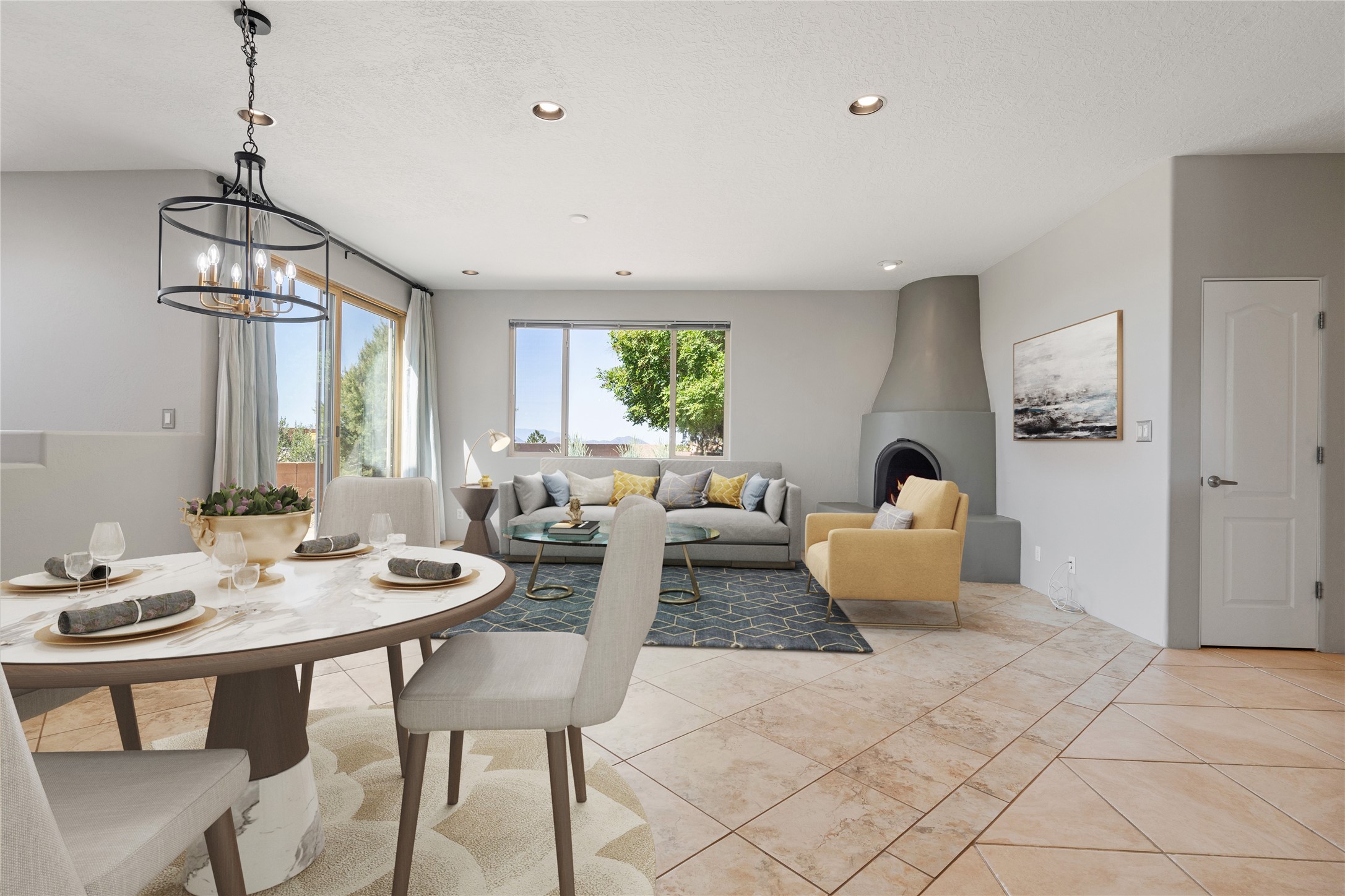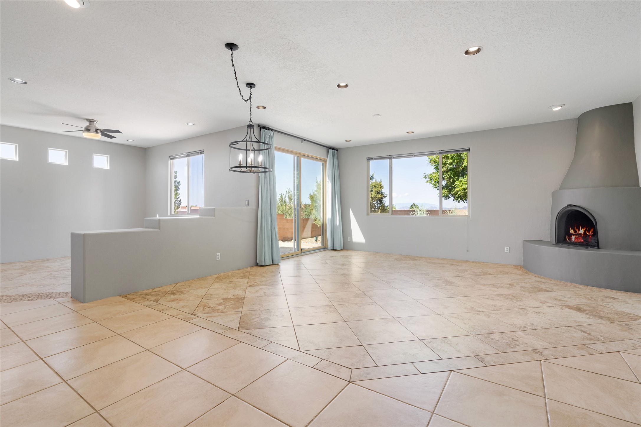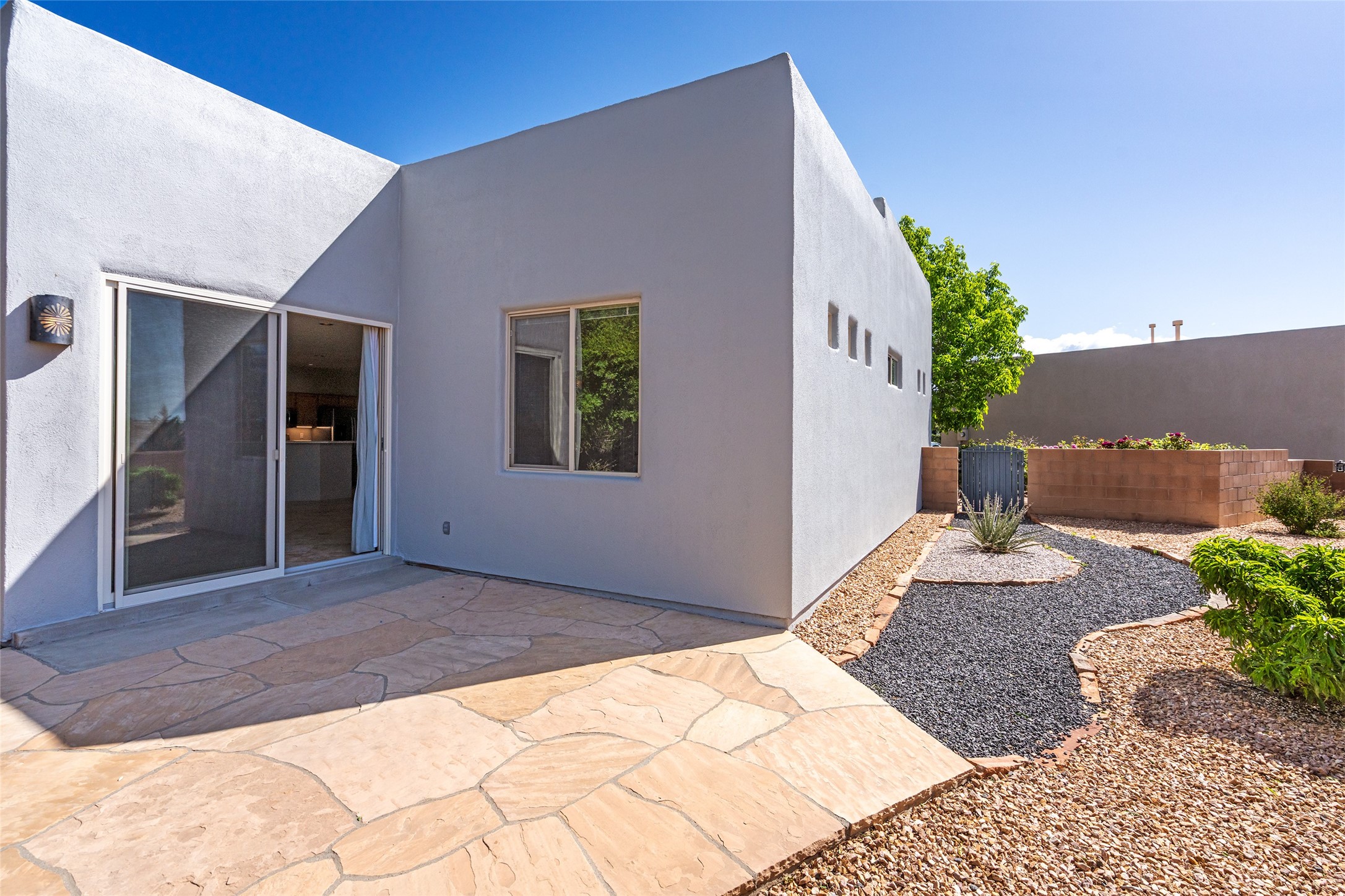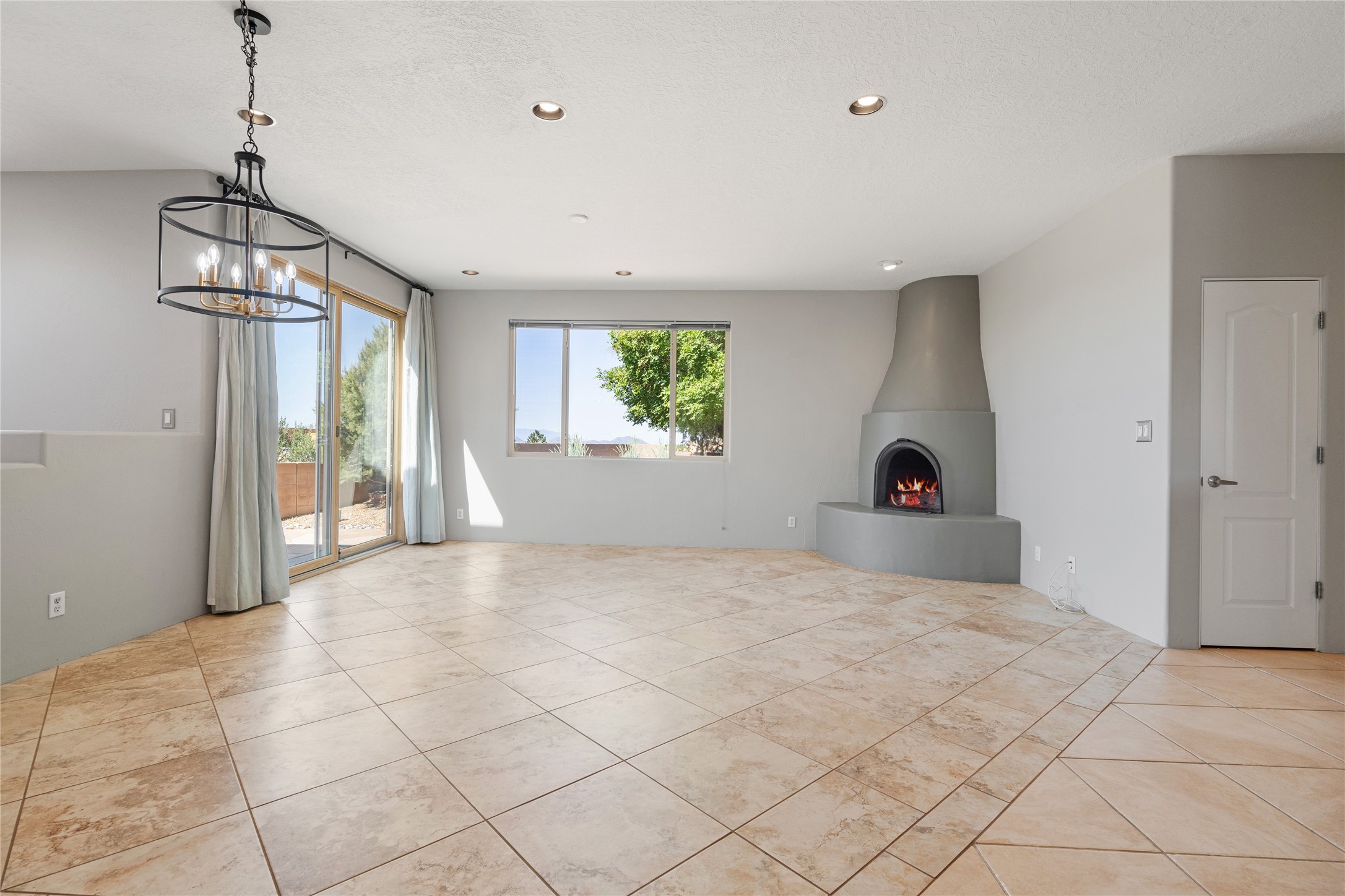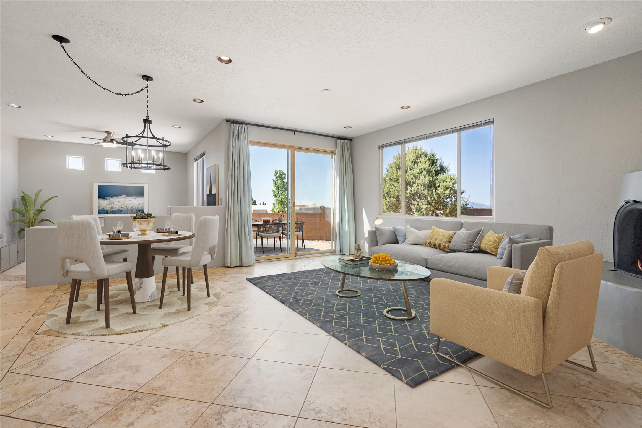 Enjoy panoramic views of the Ortiz and Sandia Mountains from this beautifully maintained single-level home in the sought-after community of Rancho Viejo. Thoughtfully designed for comfort and versatility, and painted to exude a contemporary flair, this open-concept residence features stylish tiled floors, a cozy kiva wood-burning fireplace, and abundant natural light throughout. The private primary suite is a true retreat, offering a fully updated bathroom with a stunning tiled walk-in shower, dual vanities, and a spacious walk-in closet. On the opposite side of the home, two additional bedrooms share a well-appointed guest bath--one of which makes an ideal home office or creative space. A flexible den just off the main living area provides additional options as a media room, formal dining space, hobby area, or second office--customize it to suit your lifestyle. Outside, the beautifully landscaped lot showcases native plants, mature trees, flowering rose bushes, and lovely flagstone patios and stone walkways. With no neighbors directly behind the home and views of a large community park and estate lots, the setting offers peace, privacy, and an exceptional sense of space. Rancho Viejo is a vibrant community offering over 15 miles of paved walking trails, several community parks, and well-maintained open spaces--all just 20 minutes from the Santa Fe Plaza. Dining, shopping, and daily conveniences are just minutes away. Don't miss the opportunity to own this serene and stylish home with unmatched views--schedule your showing today!
