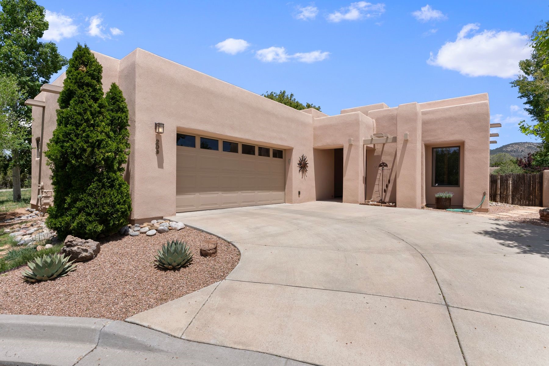 Located in the desirable Plazas at Old Pecos Trail community, this beautifully maintained 2-bedroom, 2-bath home offers a perfect blend of comfort, style, and convenience. Just a 10-minute drive to downtown Santa Fe and close to hiking trails, shopping, restaurants, and medical facilities, this home is ideally situated for both relaxation and accessibility.Inside, you'll find an open-concept layout with tall ceilings and abundant natural light. The living room features a cozy gas fireplace, built-in shelves, and seamless flow into the dining and kitchen areas. The updated kitchen boasts granite countertops, a large center island, and newer appliances, making it a functional and inviting space for cooking and entertaining.The spacious primary suite includes patio access through sliding doors, a covered portal, a walk-in shower, and a separate soaking tub. Step outside to enjoy the beautifully landscaped, low-maintenance yard complete with a water feature, a covered portal off the dining room, and an enclosed backyard with a raised privacy wall--ideal for outdoor dining or quiet retreat. An oversized two-car garage adds extra storage and convenience. Additional highlights include forced air cooling, a tankless water heater, and a washer and dryer that stay with the home.This bright and welcoming home is move-in ready and perfect for those seeking comfort and charm in a prime Santa Fe location.