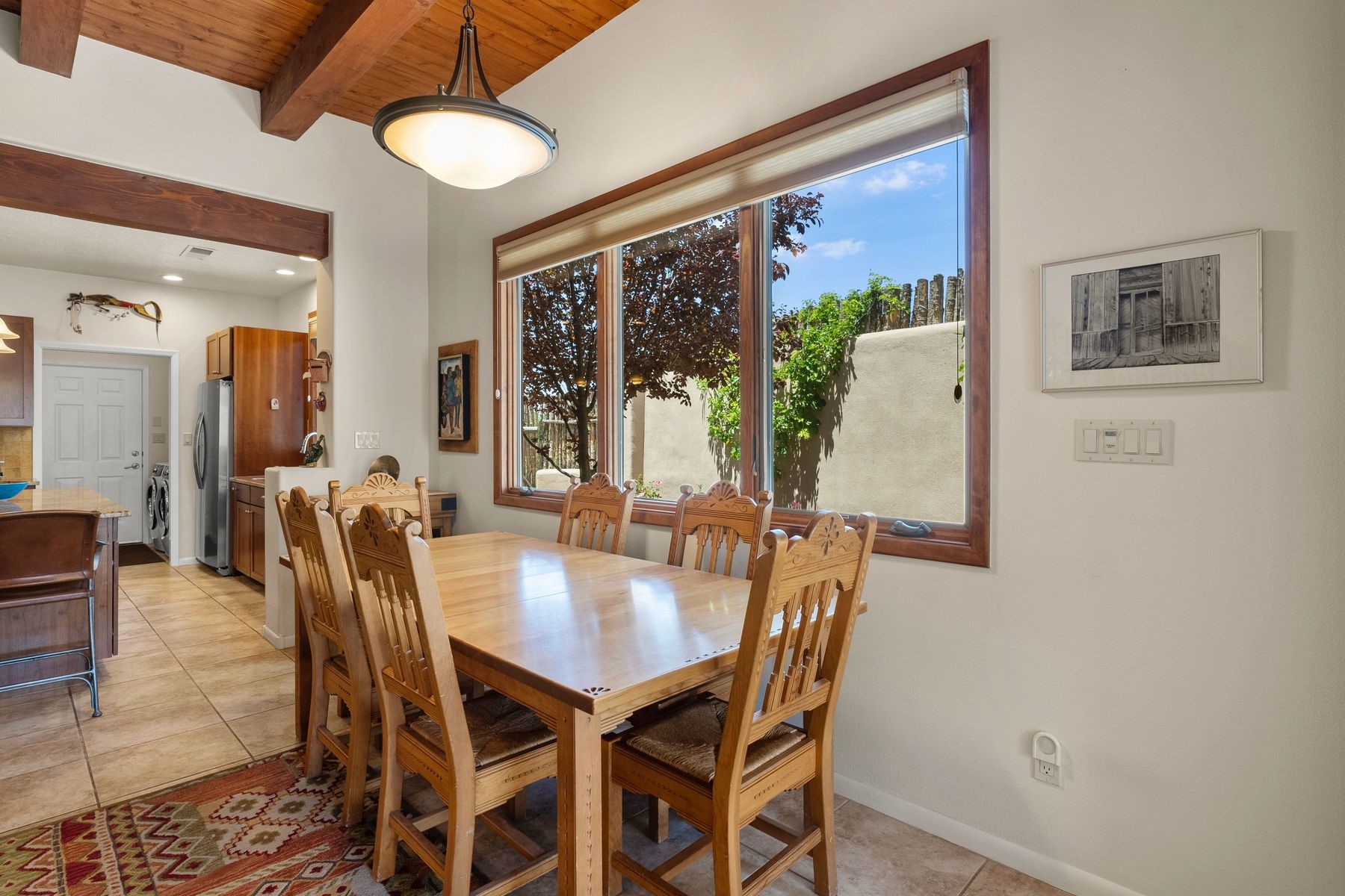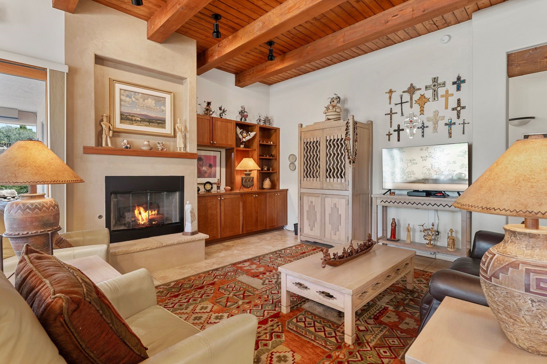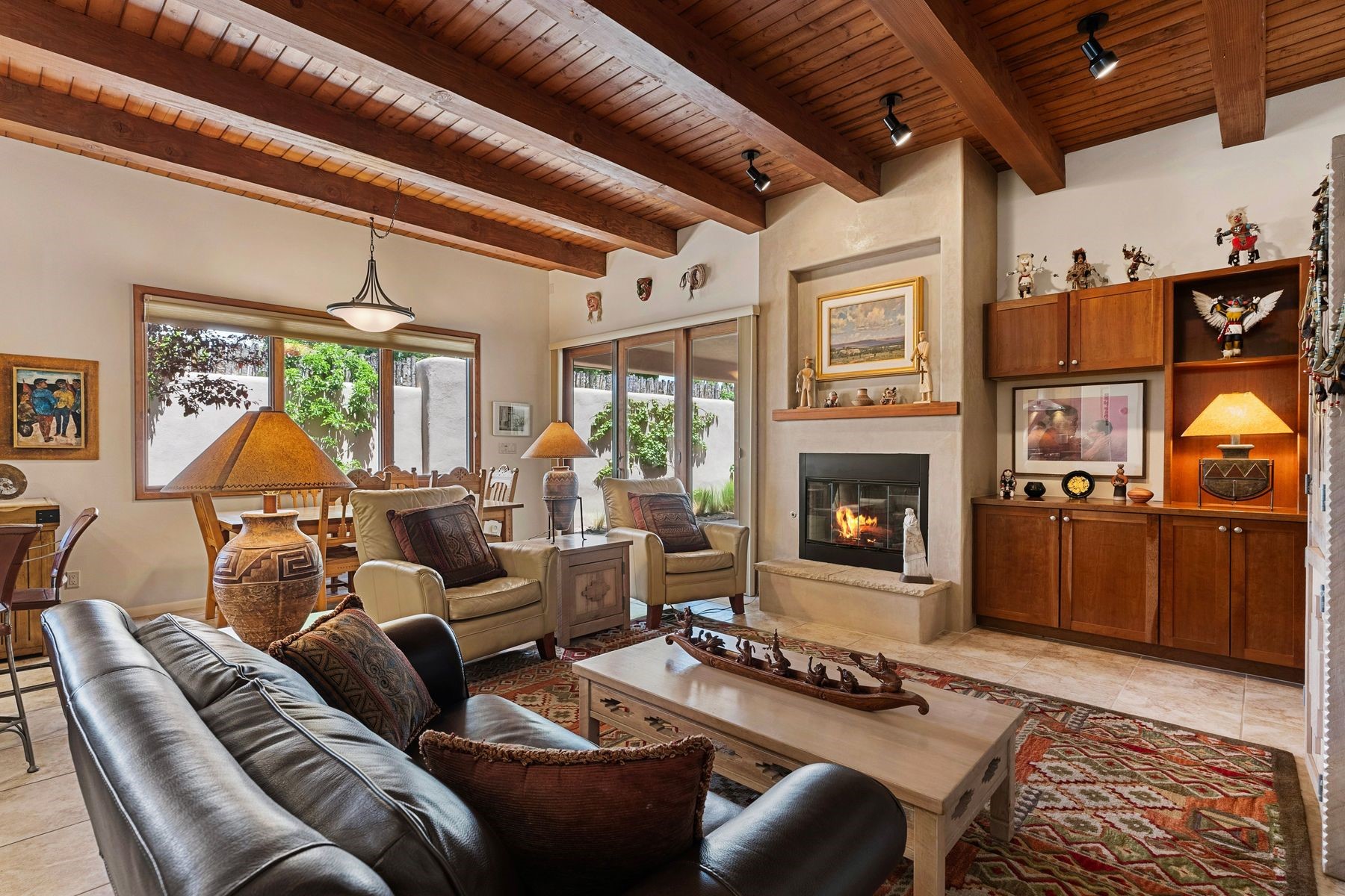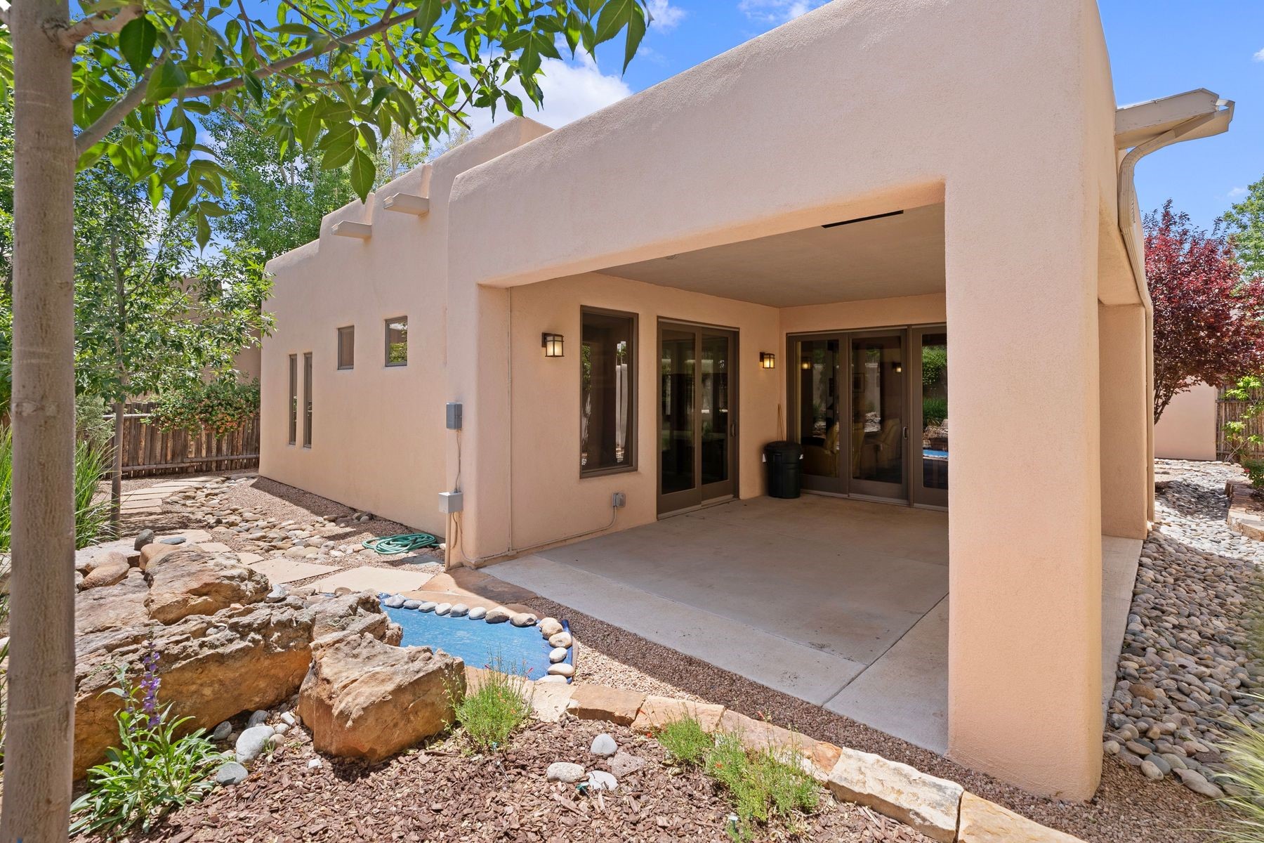Located in the desirable Plazas at Old Pecos Trail community, this beautifully maintained 2-bedroom, 2-bath home offers a perfect blend of comfort, style, and convenience. Just a 10-minute drive to downtown Santa Fe and close to hiking trails, shopping, restaurants, and medical facilities, this home is ideally situated for both relaxation and accessibility.Inside, you'll find an open-concept layout with tall ceilings and abundant natural light. The living room features a cozy gas fireplace, built-in shelves, and seamless flow into the dining and kitchen areas. The updated kitchen boasts granite countertops, a large center island, and newer appliances, making it a functional and inviting space for cooking and entertaining.The spacious primary suite includes patio access through sliding doors, a covered portal, a walk-in shower, and a separate soaking tub. Step outside to enjoy the beautifully landscaped, low-maintenance yard complete with a water feature, a covered portal off the dining room, and an enclosed backyard with a raised privacy wall--ideal for outdoor dining or quiet retreat. An oversized two-car garage adds extra storage and convenience. Additional highlights include forced air cooling, a tankless water heater, and a washer and dryer that stay with the home.This bright and welcoming home is move-in ready and perfect for those seeking comfort and charm in a prime Santa Fe location.