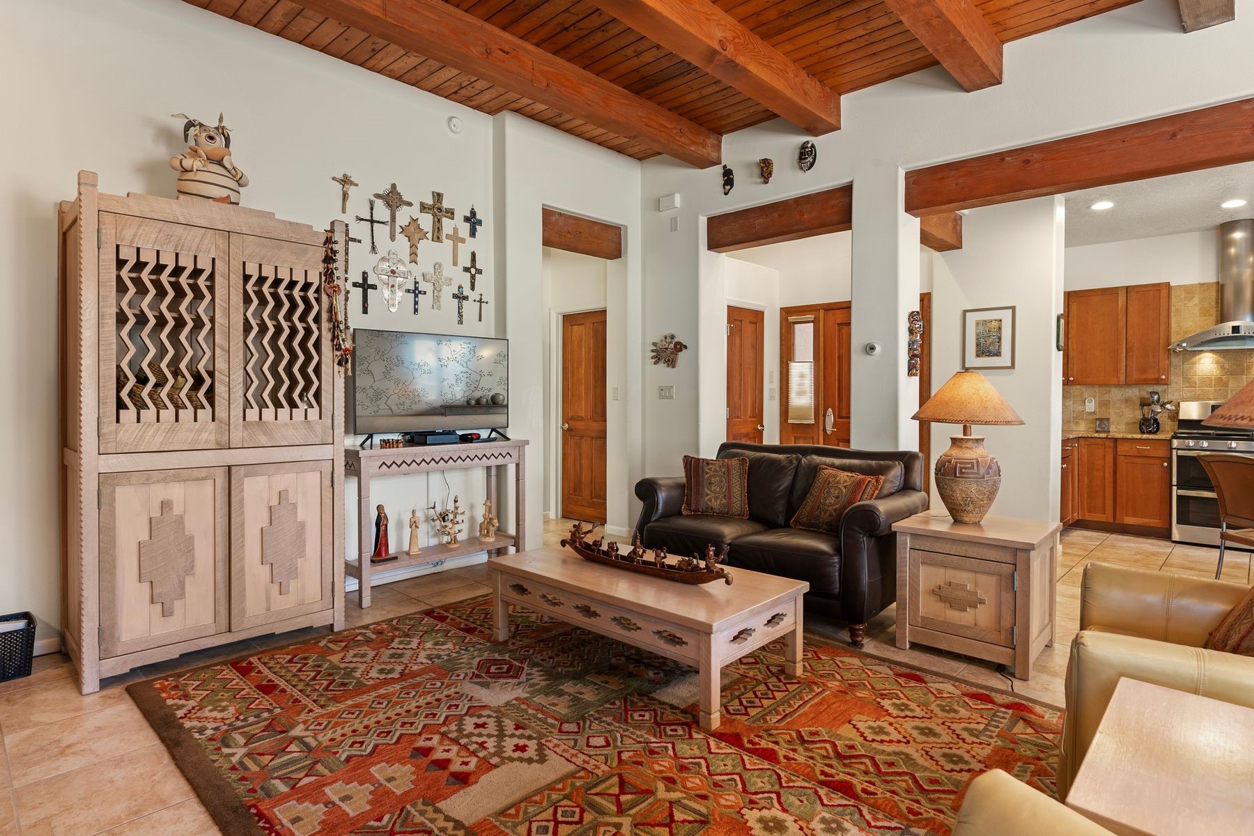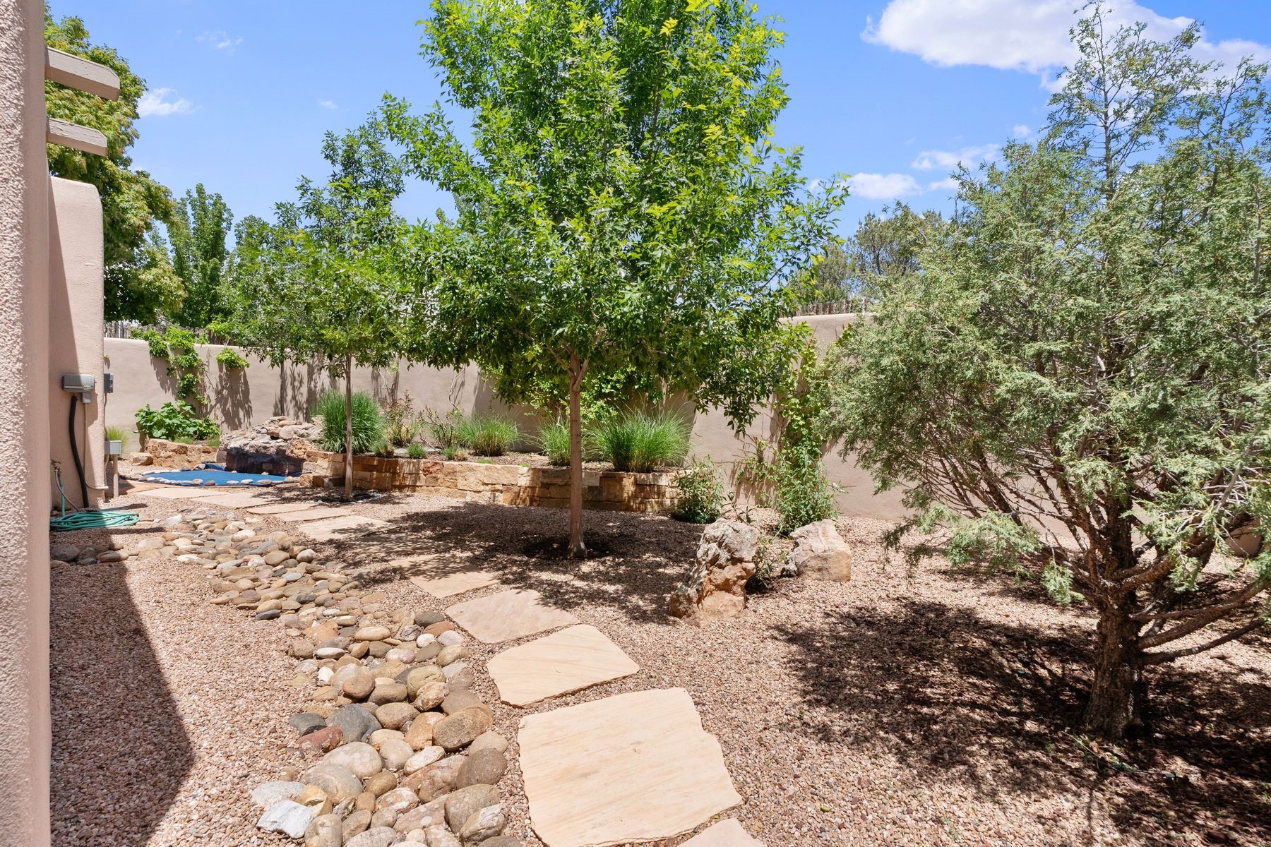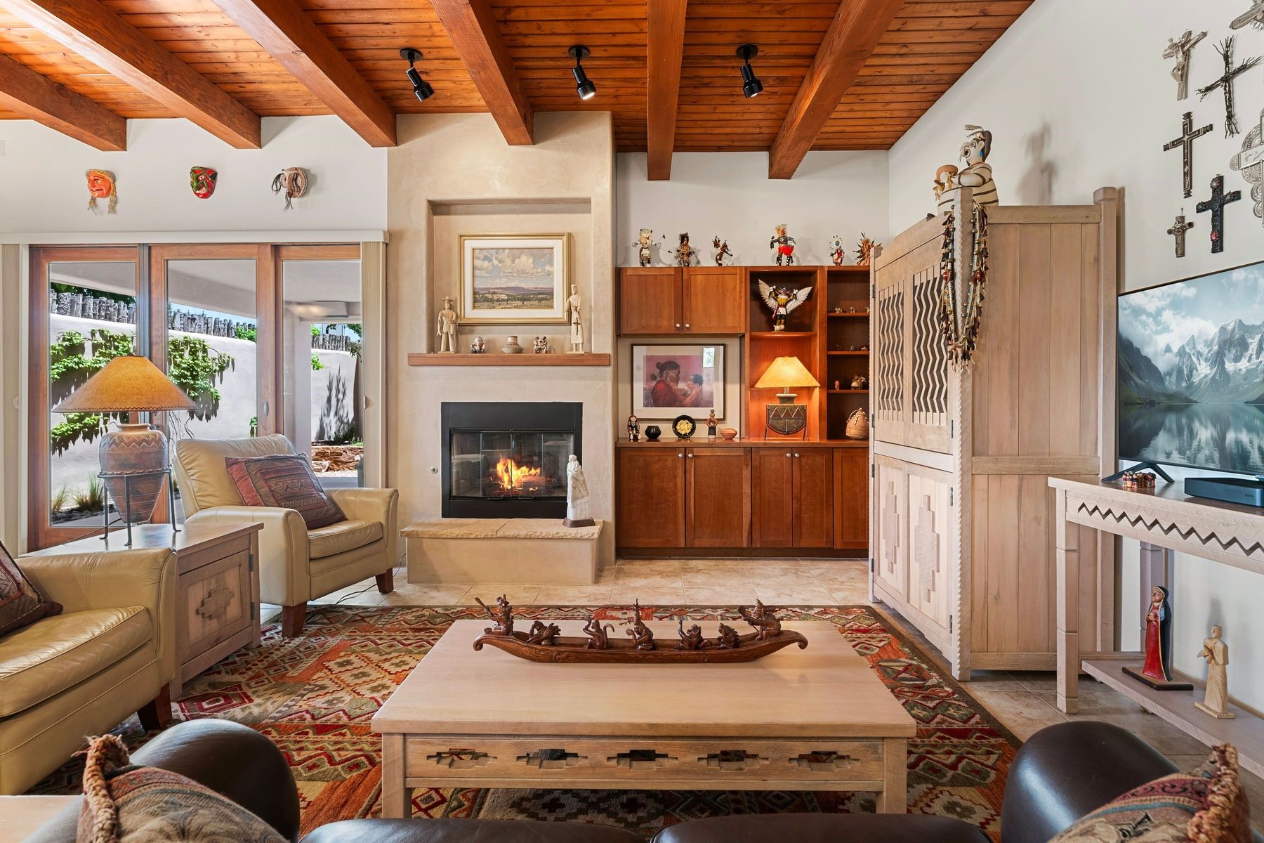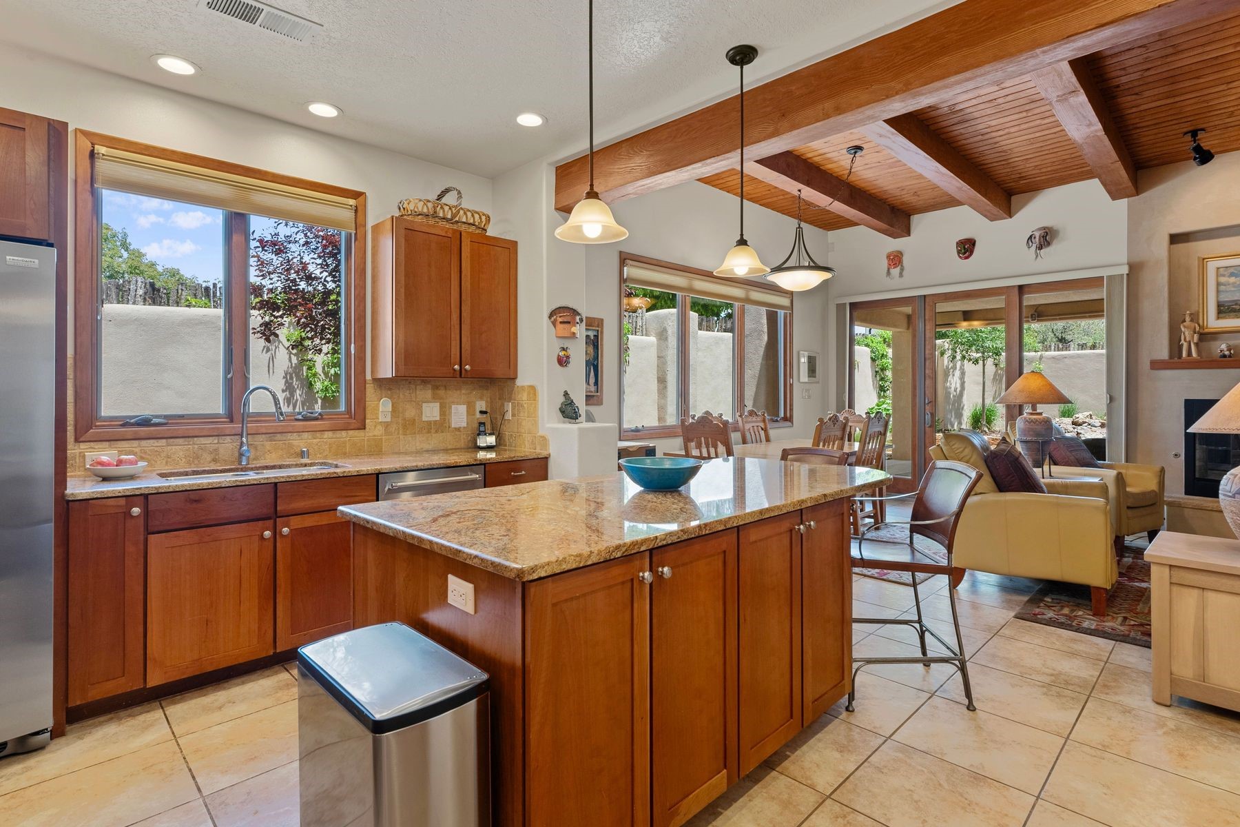 Located in the desirable Plazas at Old Pecos Trail community, this beautifully maintained 2-bedroom, 2-bath home offers a perfect blend of comfort, style, and convenience. Just a 10-minute drive to downtown Santa Fe and close to hiking trails, shopping, restaurants, and medical facilities, this home is ideally situated for both relaxation and accessibility.Inside, you'll find an open-concept layout with tall ceilings and abundant natural light. The living room features a cozy gas fireplace, built-in shelves, and seamless flow into the dining and kitchen areas. The updated kitchen boasts granite countertops, a large center island, and newer appliances, making it a functional and inviting space for cooking and entertaining.The spacious primary suite includes patio access through sliding doors, a covered portal, a walk-in shower, and a separate soaking tub. Step outside to enjoy the beautifully landscaped, low-maintenance yard complete with a water feature, a covered portal off the dining room, and an enclosed backyard with a raised privacy wall--ideal for outdoor dining or quiet retreat. An oversized two-car garage adds extra storage and convenience. Additional highlights include forced air cooling, a tankless water heater, and a washer and dryer that stay with the home.This bright and welcoming home is move-in ready and perfect for those seeking comfort and charm in a prime Santa Fe location.