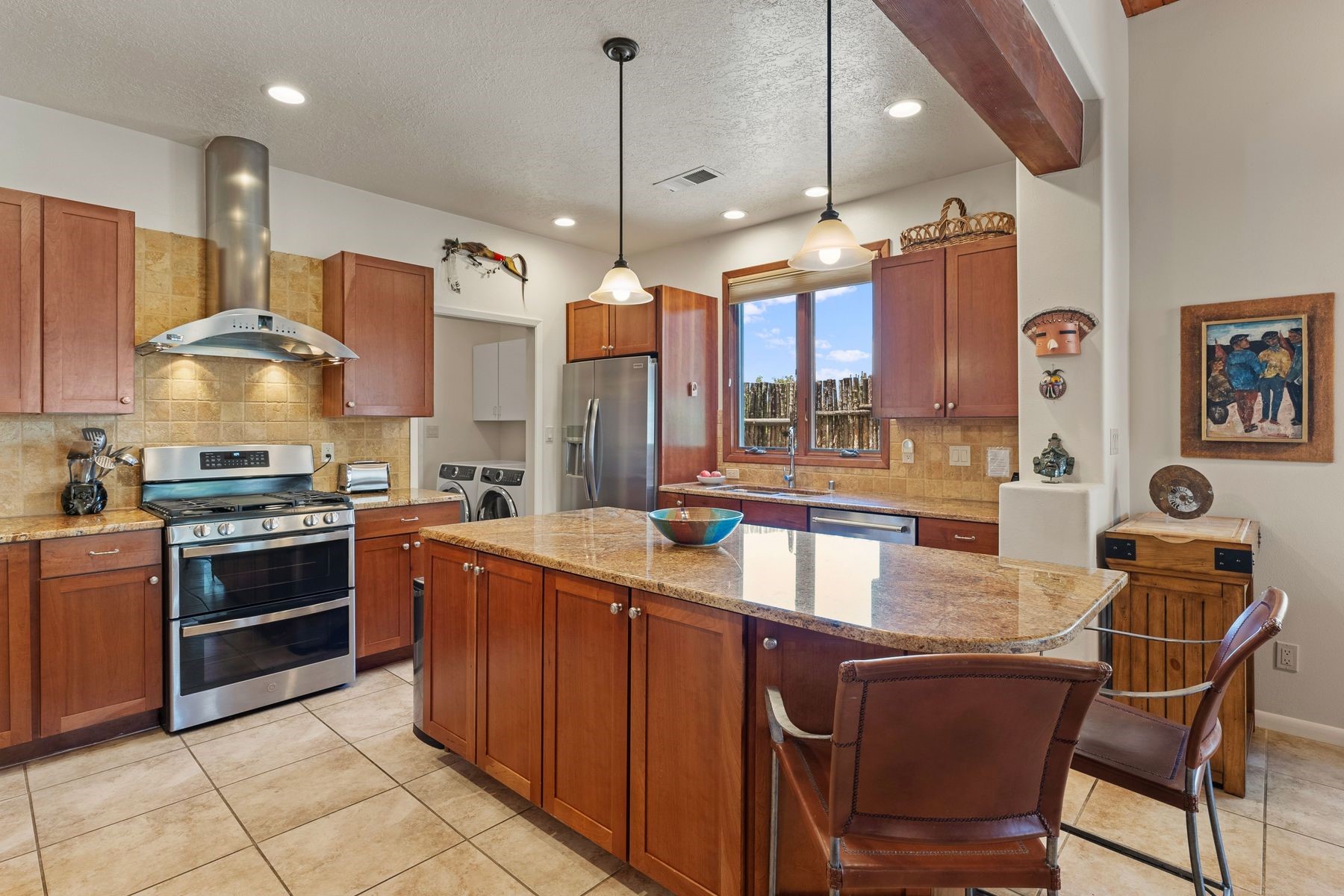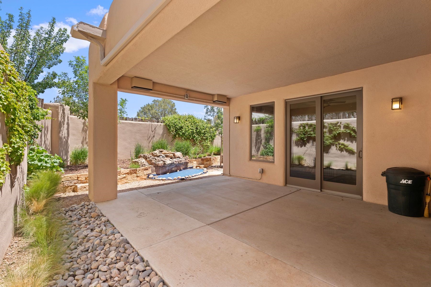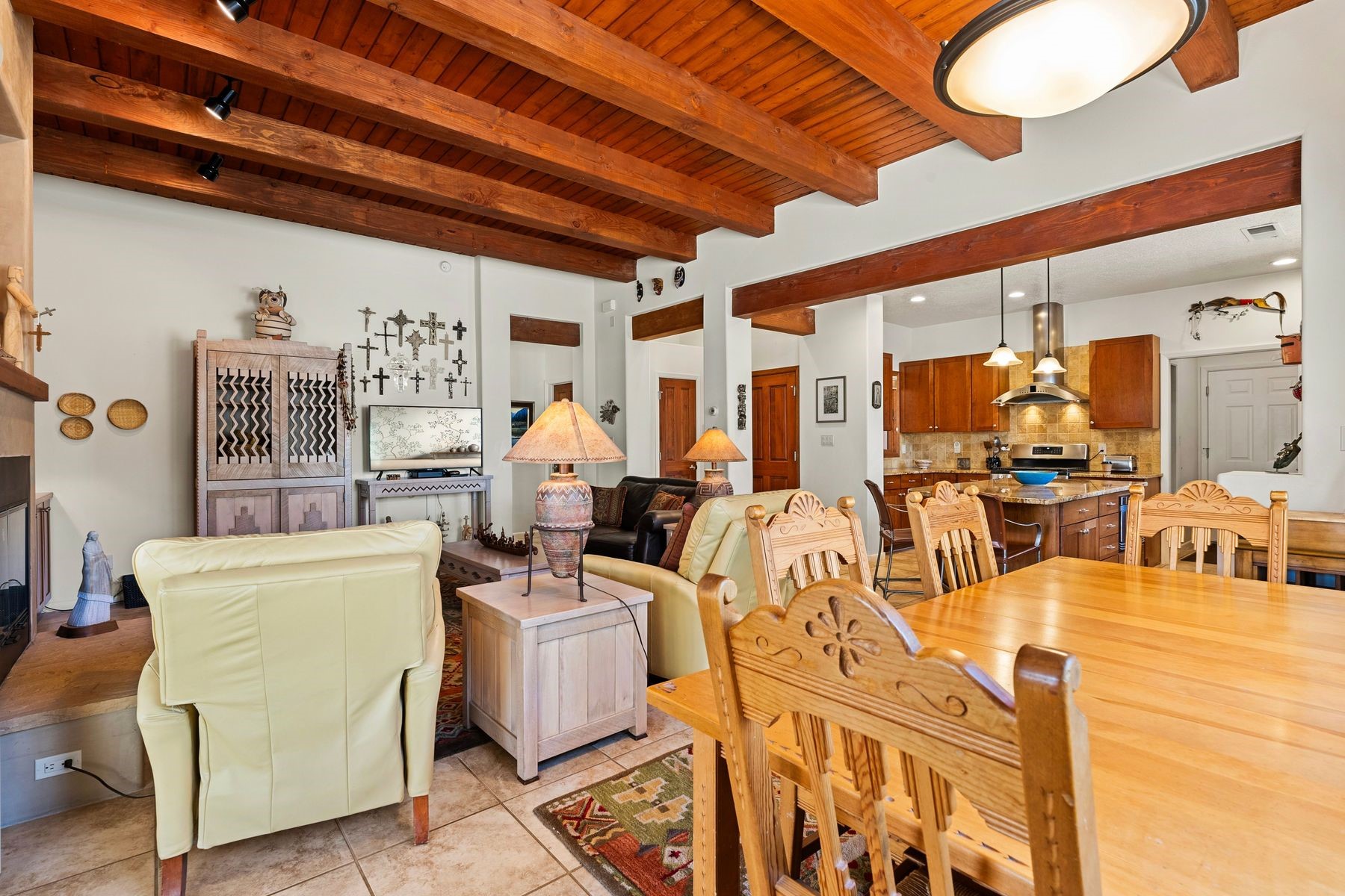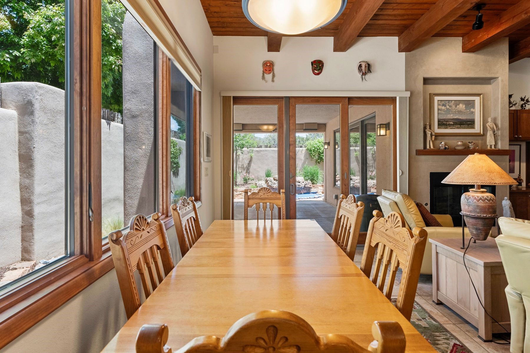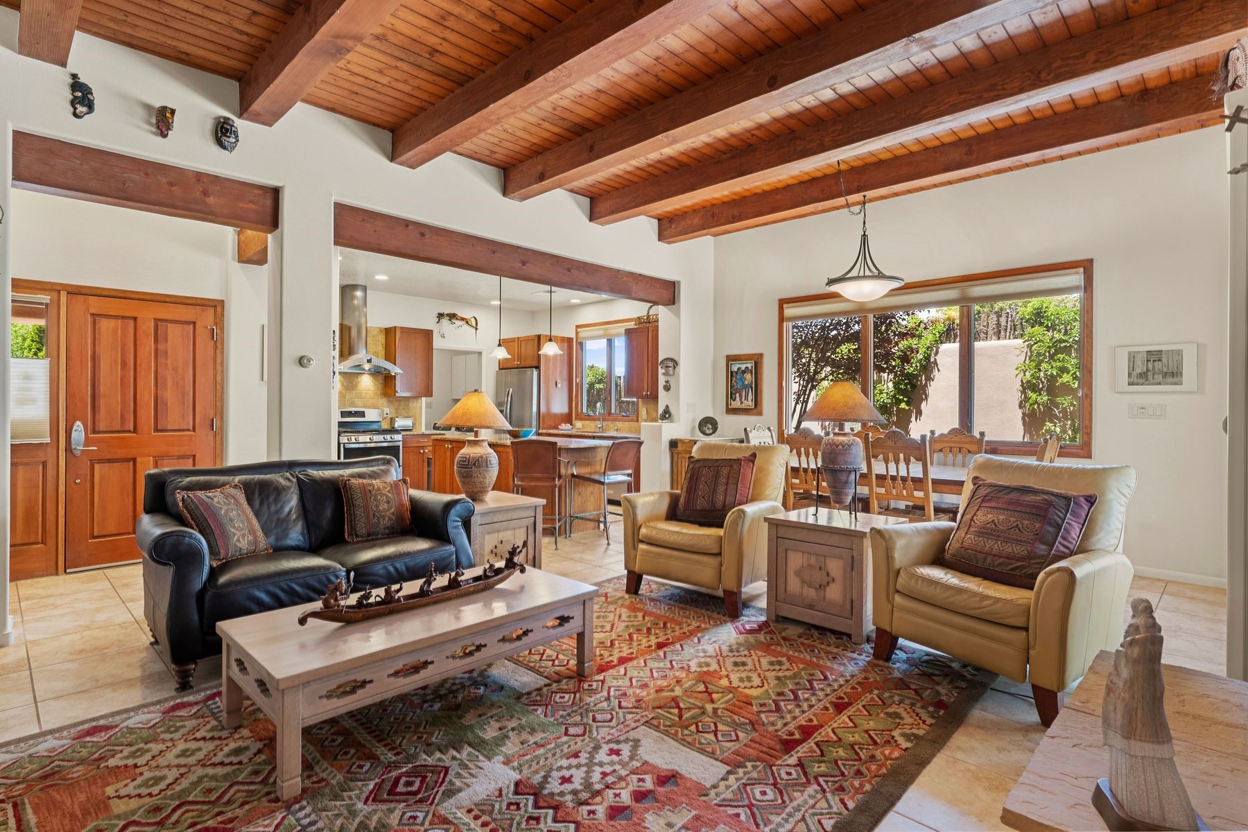 Located in the desirable Plazas at Old Pecos Trail community, this beautifully maintained 2-bedroom, 2-bath home offers a perfect blend of comfort, style, and convenience. Just a 10-minute drive to downtown Santa Fe and close to hiking trails, shopping, restaurants, and medical facilities, this home is ideally situated for both relaxation and accessibility.Inside, you'll find an open-concept layout with tall ceilings and abundant natural light. The living room features a cozy gas fireplace, built-in shelves, and seamless flow into the dining and kitchen areas. The updated kitchen boasts granite countertops, a large center island, and newer appliances, making it a functional and inviting space for cooking and entertaining.The spacious primary suite includes patio access through sliding doors, a covered portal, a walk-in shower, and a separate soaking tub. Step outside to enjoy the beautifully landscaped, low-maintenance yard complete with a water feature, a covered portal off the dining room, and an enclosed backyard with a raised privacy wall--ideal for outdoor dining or quiet retreat. An oversized two-car garage adds extra storage and convenience. Additional highlights include forced air cooling, a tankless water heater, and a washer and dryer that stay with the home.This bright and welcoming home is move-in ready and perfect for those seeking comfort and charm in a prime Santa Fe location.