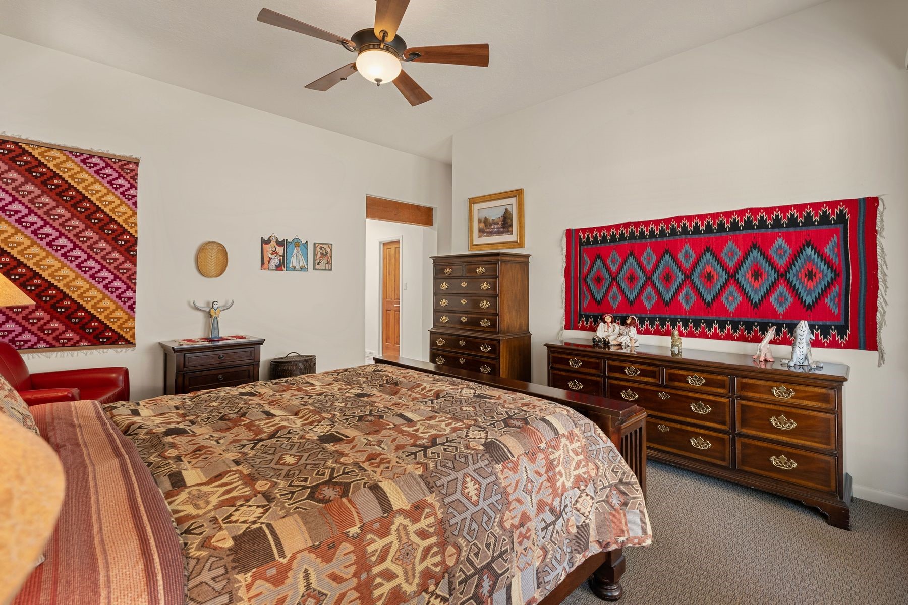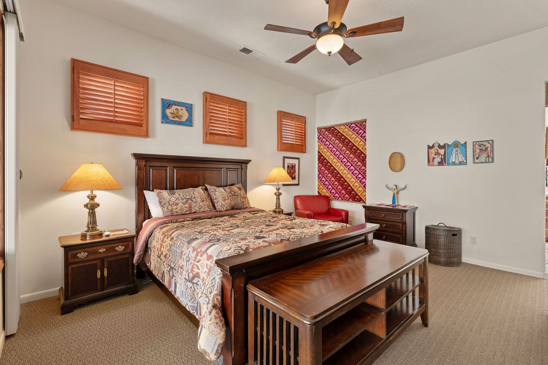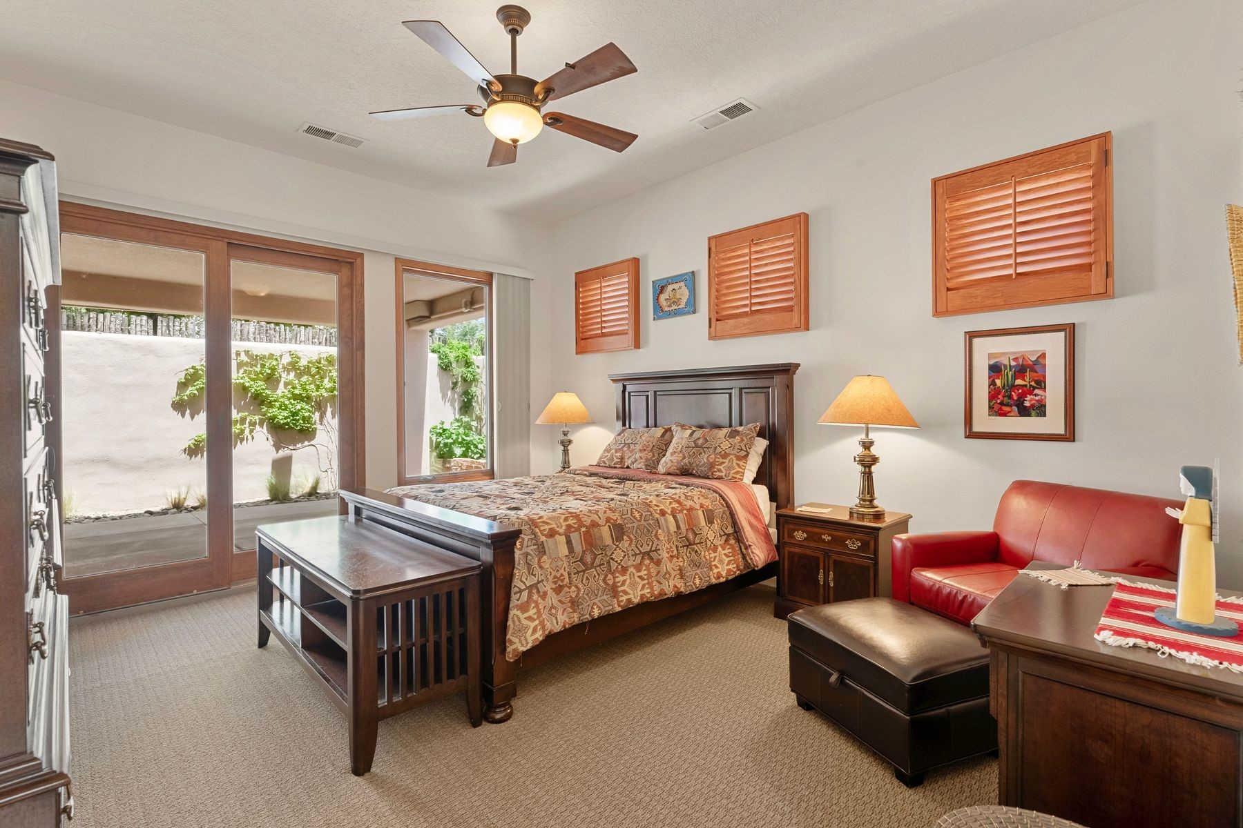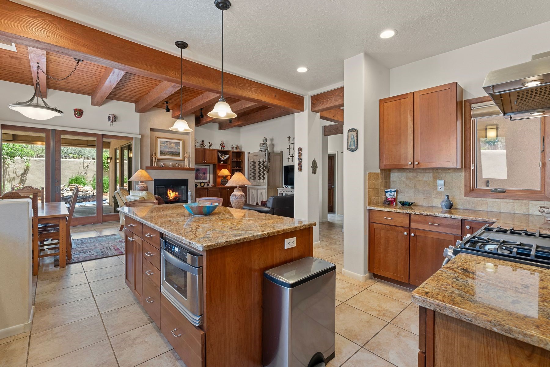 Located in the desirable Plazas at Old Pecos Trail community, this beautifully maintained 2-bedroom, 2-bath home offers a perfect blend of comfort, style, and convenience. Just a 10-minute drive to downtown Santa Fe and close to hiking trails, shopping, restaurants, and medical facilities, this home is ideally situated for both relaxation and accessibility.Inside, you'll find an open-concept layout with tall ceilings and abundant natural light. The living room features a cozy gas fireplace, built-in shelves, and seamless flow into the dining and kitchen areas. The updated kitchen boasts granite countertops, a large center island, and newer appliances, making it a functional and inviting space for cooking and entertaining.The spacious primary suite includes patio access through sliding doors, a covered portal, a walk-in shower, and a separate soaking tub. Step outside to enjoy the beautifully landscaped, low-maintenance yard complete with a water feature, a covered portal off the dining room, and an enclosed backyard with a raised privacy wall--ideal for outdoor dining or quiet retreat. An oversized two-car garage adds extra storage and convenience. Additional highlights include forced air cooling, a tankless water heater, and a washer and dryer that stay with the home.This bright and welcoming home is move-in ready and perfect for those seeking comfort and charm in a prime Santa Fe location.