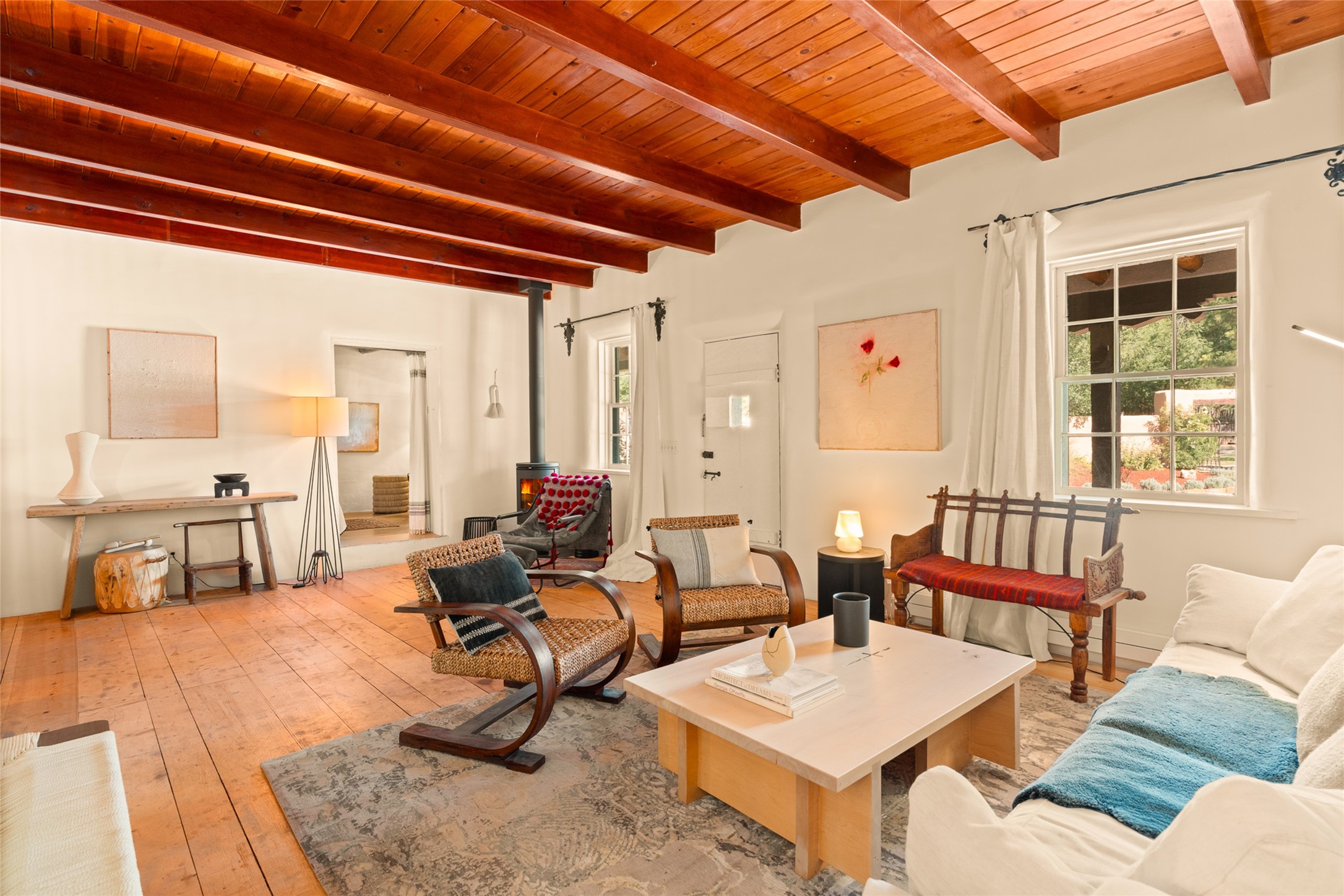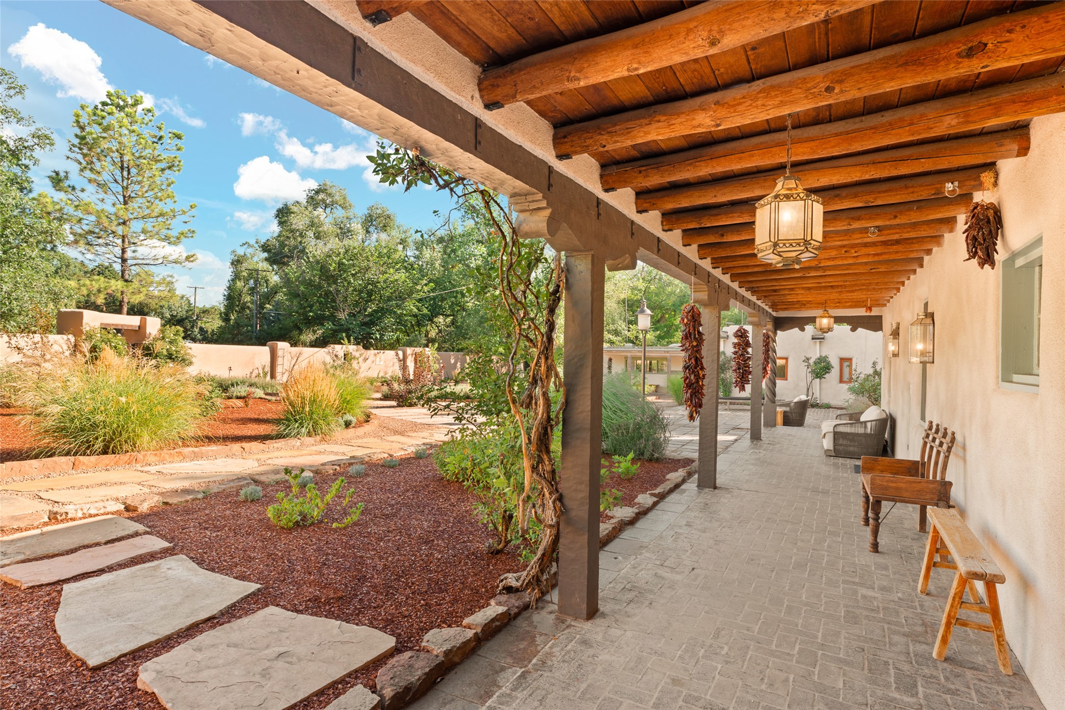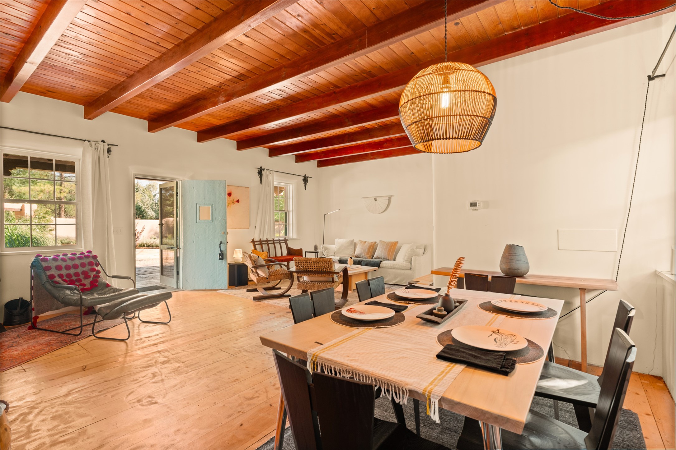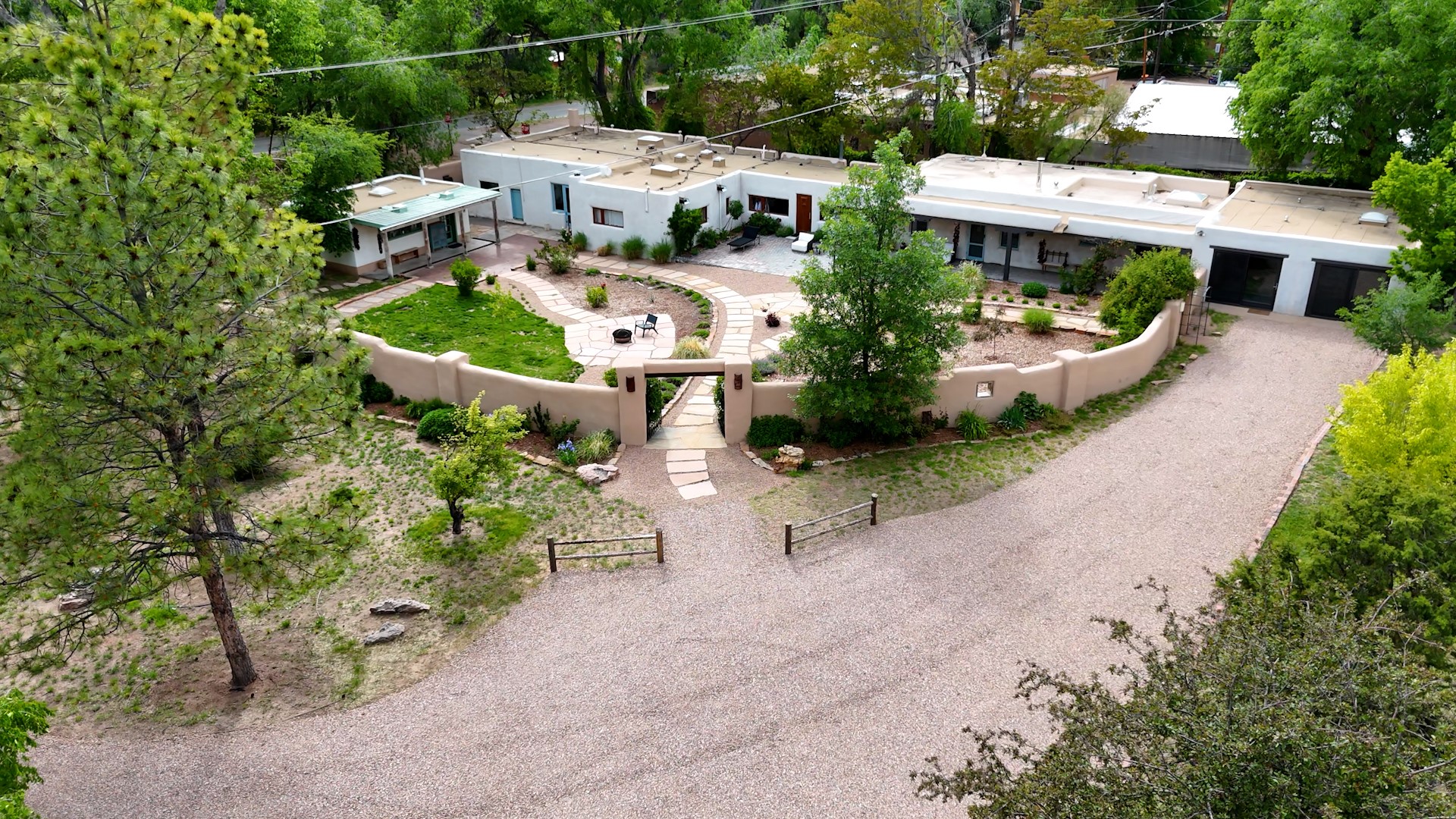 Recently updated with a rich old world charm and history (formerly El Cuervito Ranch), this private and gated compound is situated in the lush village of Tesuque just steps away from El Nido Restaurant, the famed Tesuque Village Market and the world-renowned Santa Fe Opera. Consisting of 0.754 beautifully manicured acres, the entry courtyard has stone pathways and seasonal greenery, creating a warm and inviting playground for the senses. The property consists of a main house (two bedrooms/two baths), guesthouse (one bedroom/one bath), and three separate studio spaces all served by both a shared well and the Tesuque Community Water System. The interiors of these adobe and frame constructed homes are washed with light and have vast tree-lined views in every direction. Formal living spaces open out onto a plethora of indoor/outdoor entertaining options with sitting portals weaving the beauty of nature into the living environment. There is a nice separation of space between the structures, but the property also offers many uses as it is zoned Rural Commercial, allowing many business options for the homeowner. Classic in style, this sensuous property has been fitted with mini-split heating and A/C, plastered walls, wood floors, vigas and beams, completely walled and tucked away in one of Santa Fe's finest idyllic locales.