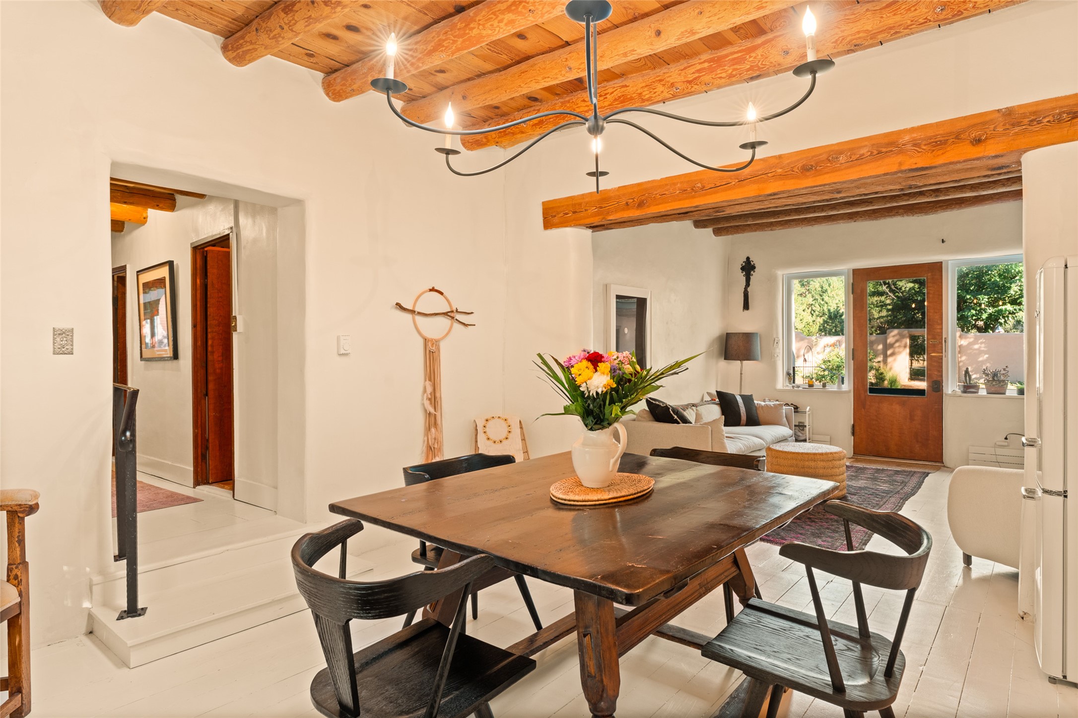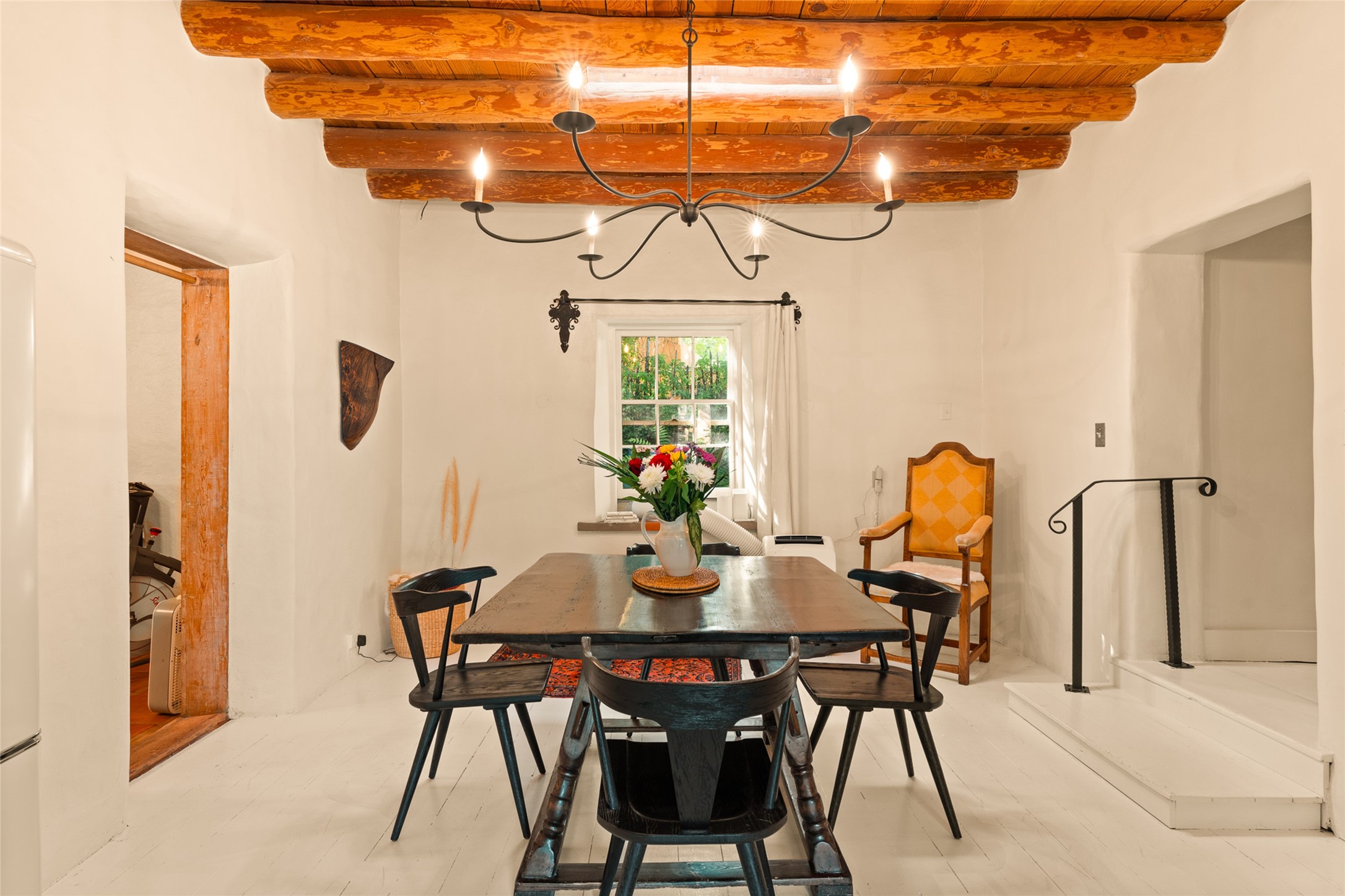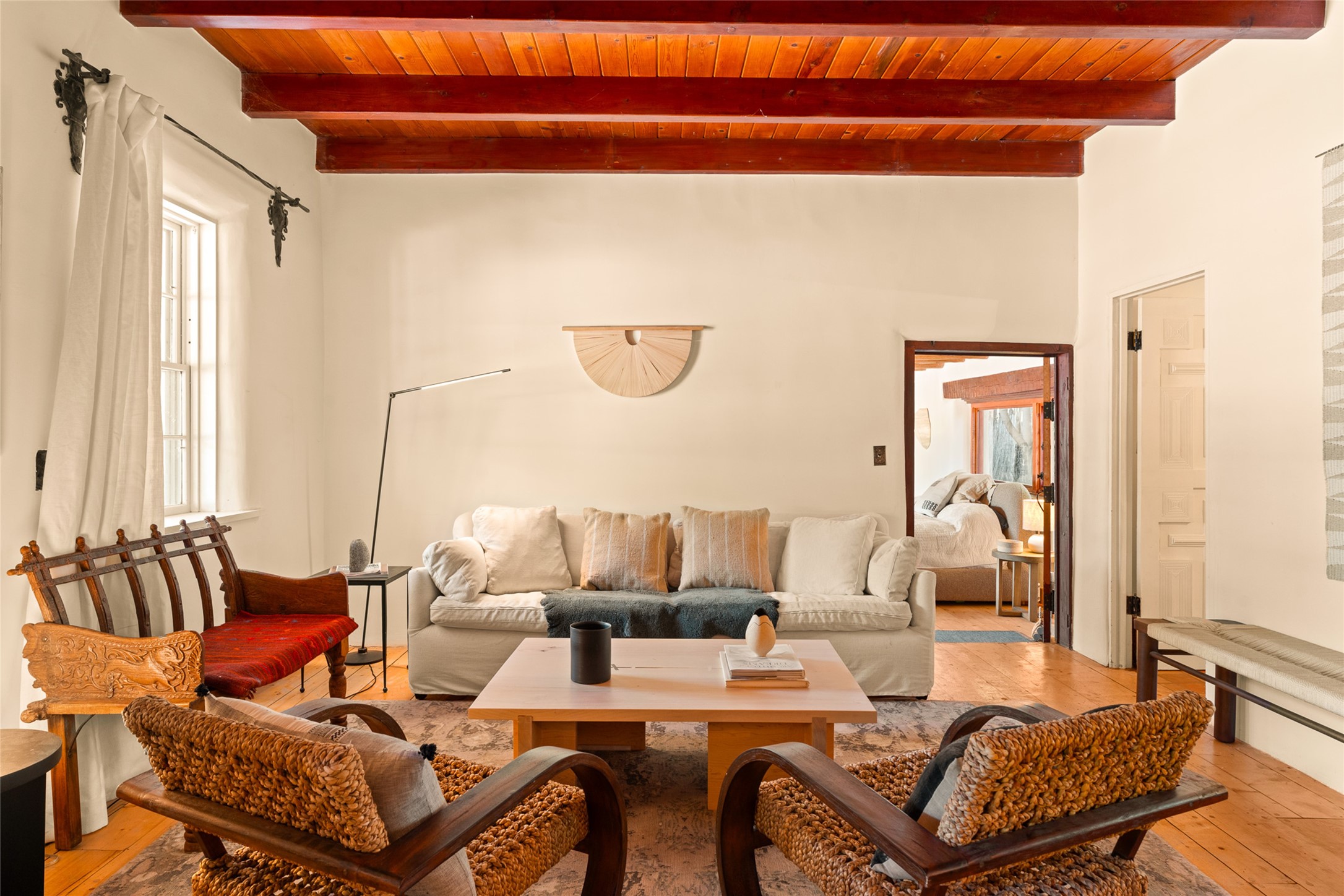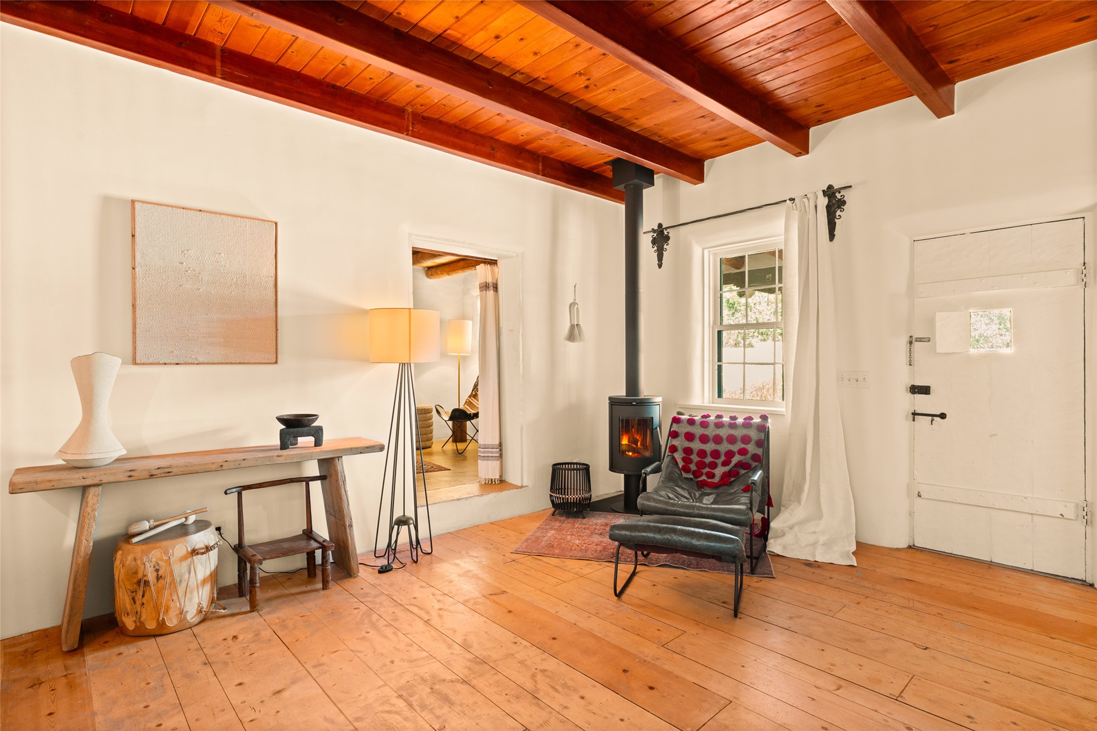 Recently updated with a rich old world charm and history (formerly El Cuervito Ranch), this private and gated compound is situated in the lush village of Tesuque just steps away from El Nido Restaurant, the famed Tesuque Village Market and the world-renowned Santa Fe Opera. Consisting of 0.754 beautifully manicured acres, the entry courtyard has stone pathways and seasonal greenery, creating a warm and inviting playground for the senses. The property consists of a main house (two bedrooms/two baths), guesthouse (one bedroom/one bath), and three separate studio spaces all served by both a shared well and the Tesuque Community Water System. The interiors of these adobe and frame constructed homes are washed with light and have vast tree-lined views in every direction. Formal living spaces open out onto a plethora of indoor/outdoor entertaining options with sitting portals weaving the beauty of nature into the living environment. There is a nice separation of space between the structures, but the property also offers many uses as it is zoned Rural Commercial, allowing many business options for the homeowner. Classic in style, this sensuous property has been fitted with mini-split heating and A/C, plastered walls, wood floors, vigas and beams, completely walled and tucked away in one of Santa Fe's finest idyllic locales.