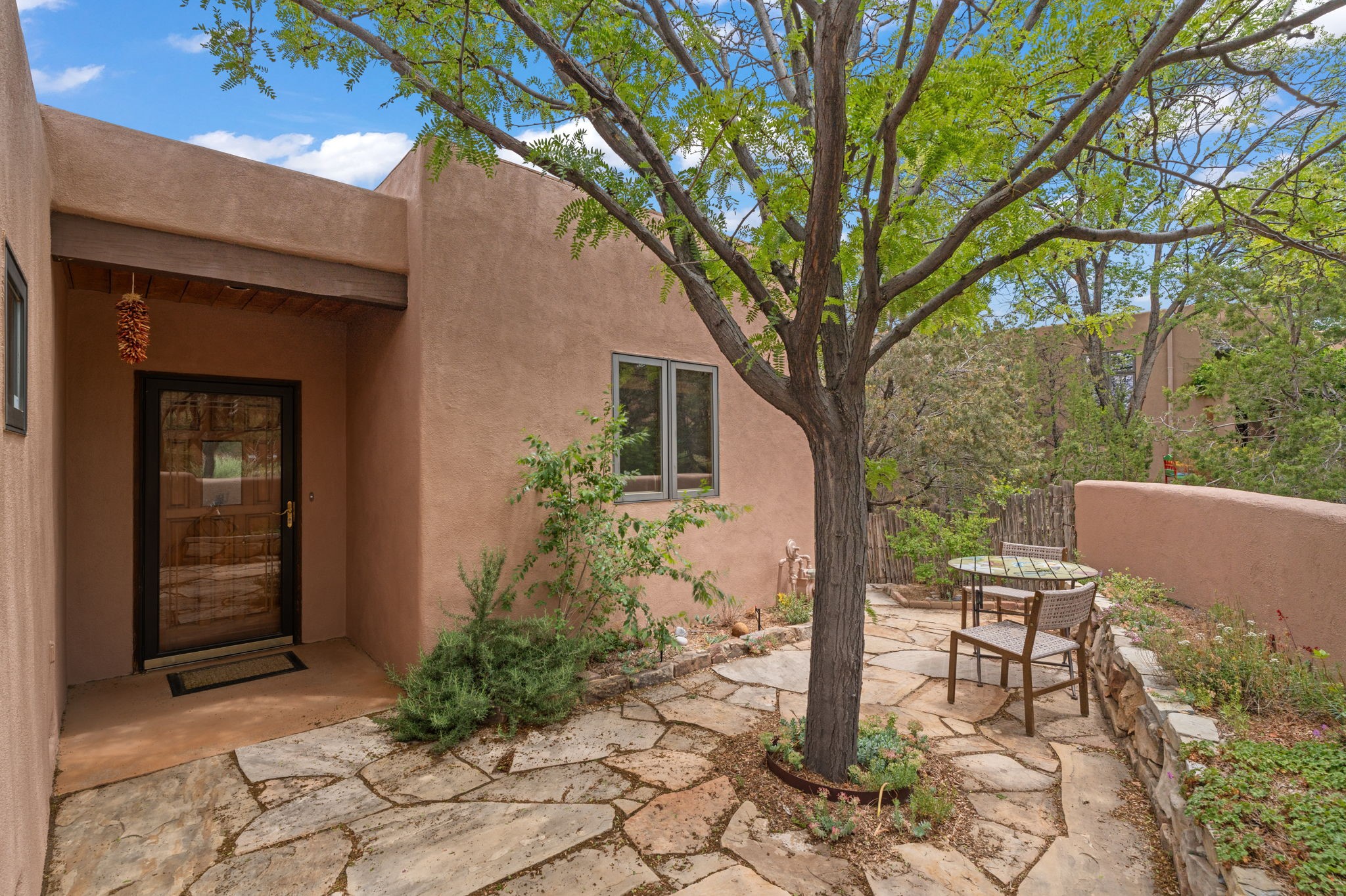 Sophisticated In-Town Living in highly sought-after Estancias Primera on charming La Viveza Court. Leave your home and walk to the Plaza via the lush arroyo. This two-story home has three outside living with an open living/dining/kitchen floor plan with wood-burning Kiva fireplace, plaster walls, wood floors and vigas, a main level powder room and tree-scaped patio. The two well-sized bedrooms have doors to walk out on to the terrace and feature en-suite full baths. In addition to a heated two-car garage with shelving, there are two nicely-sized storage areas. Estancias Primera is known for its reasonable HOA fees, privacy, and has a seasonal swimming pool, tennis courts and a clubhouse. This is the perfect lock-and-leave or full-time home. In five minutes, you're at the Plaza or Dale Ball trail system and in 20 minutes, the ski basin. The home has radiant floor heating and mini splits for air conditioning and additional heating.