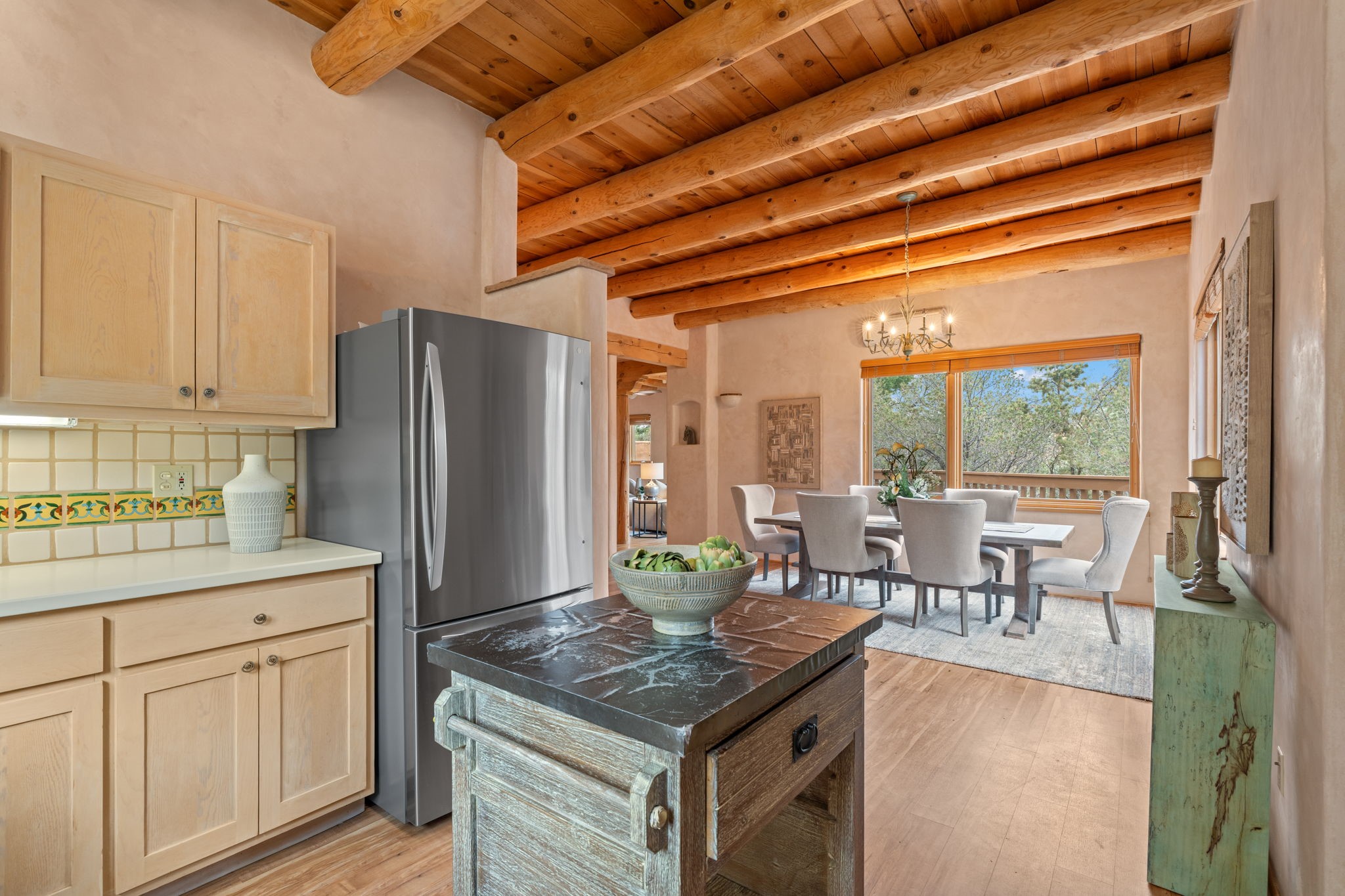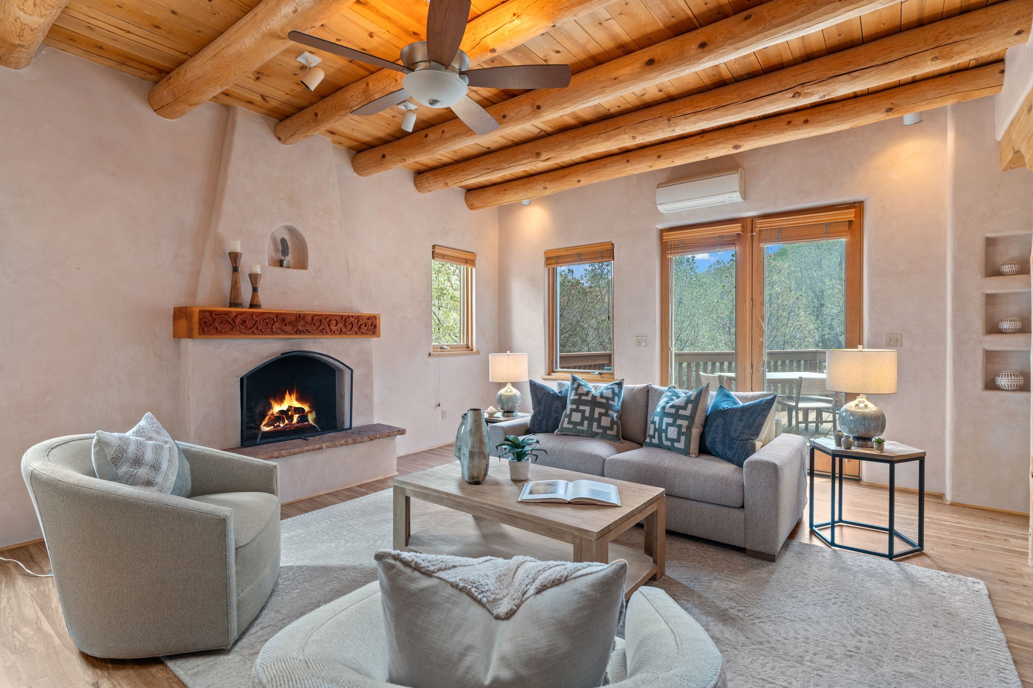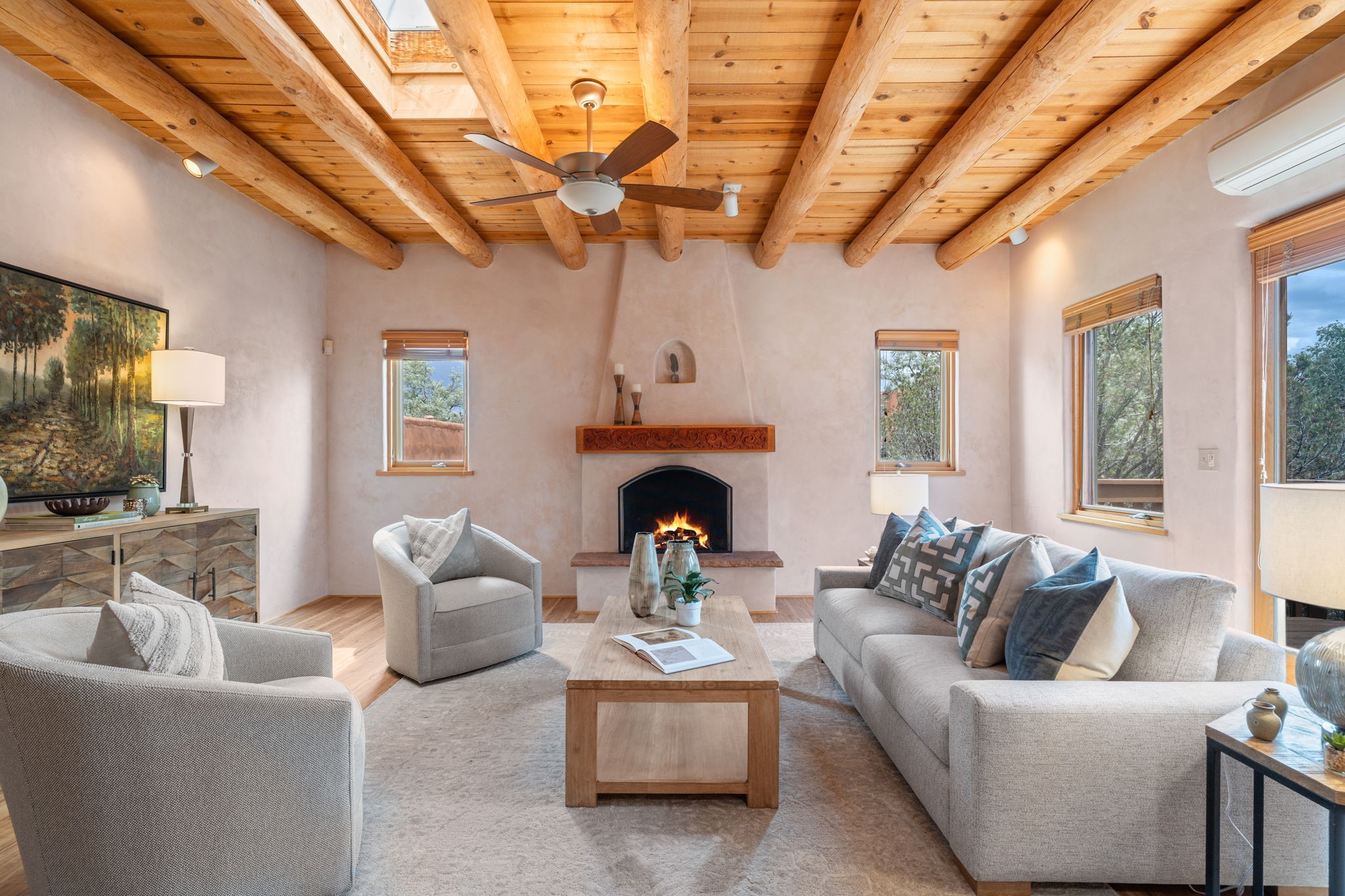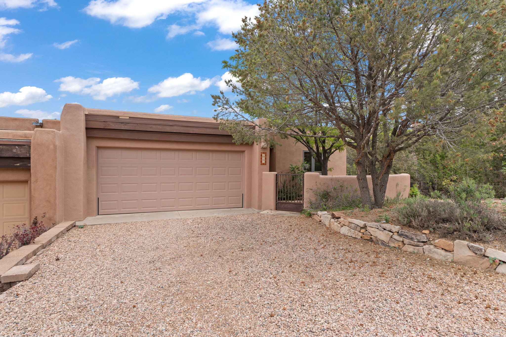 Sophisticated In-Town Living in highly sought-after Estancias Primera on charming La Viveza Court. Leave your home and walk to the Plaza via the lush arroyo. This two-story home has three outside living with an open living/dining/kitchen floor plan with wood-burning Kiva fireplace, plaster walls, wood floors and vigas, a main level powder room and tree-scaped patio. The two well-sized bedrooms have doors to walk out on to the terrace and feature en-suite full baths. In addition to a heated two-car garage with shelving, there are two nicely-sized storage areas. Estancias Primera is known for its reasonable HOA fees, privacy, and has a seasonal swimming pool, tennis courts and a clubhouse. This is the perfect lock-and-leave or full-time home. In five minutes, you're at the Plaza or Dale Ball trail system and in 20 minutes, the ski basin. The home has radiant floor heating and mini splits for air conditioning and additional heating.