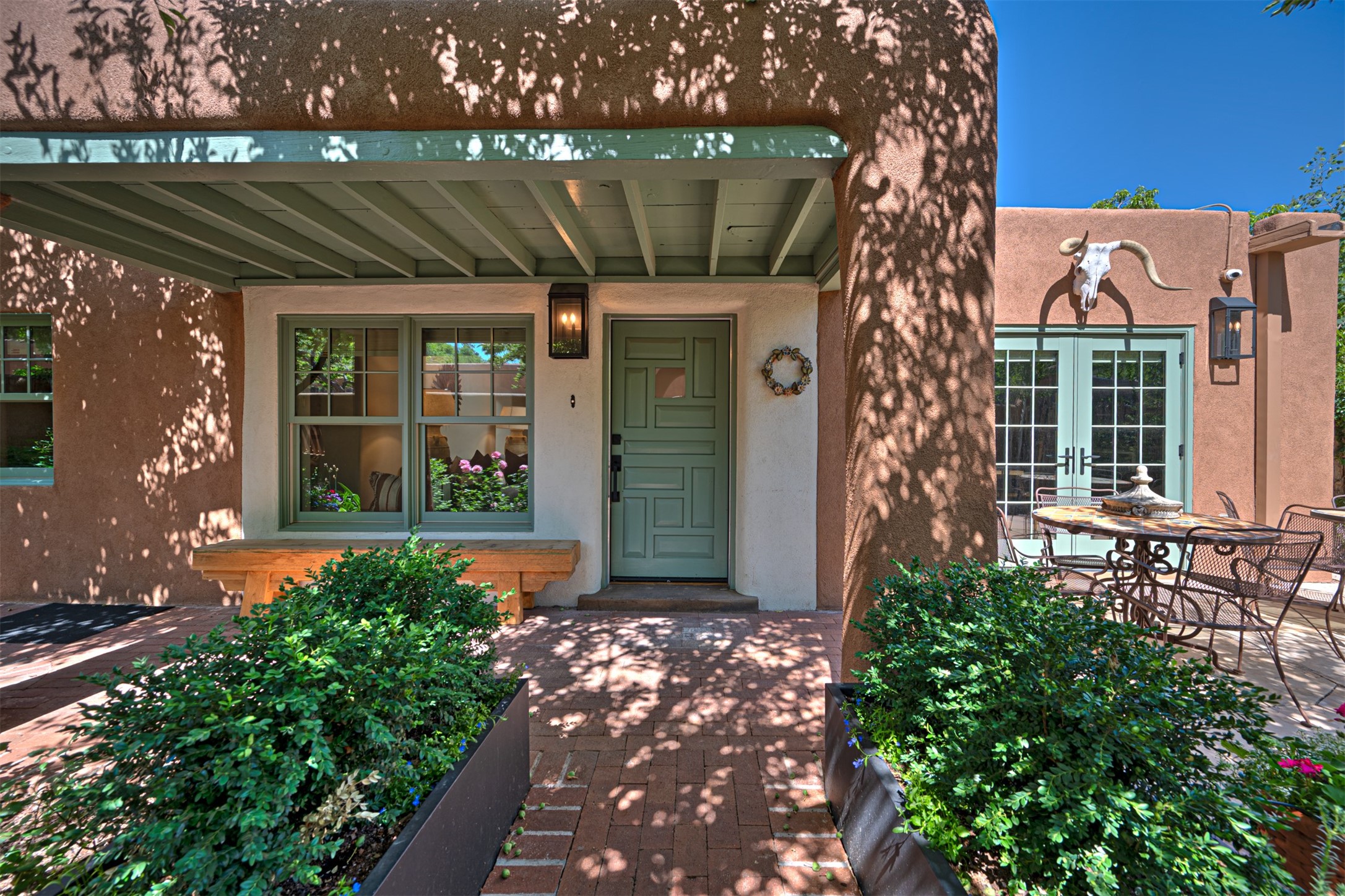 This entirely remodeled condo is free standing in historic downtown Santa Fe.. Fine dining, Canyon Road galleries and shopping is at your fingertips. No stone is left unturned in this romantic well appointed 2 bedroom each ensuite including an office, and powder room.. The inviting open kitchen & dining is spacious and light with access to two courtyards behind adobe walls and coyote fencing. Styled with a designer's detailed eye, this is rare perfection. Enter the private courtyard through a traditional gate. An oasis awaits with mature landscaping, roses, fruit trees all irrigated. This home has more than you expect of a gracious Eastside adobe. A one car garage, alarm system throughout and off street parking down a sleepy lane on the historic Acequia Madre make this the best Santa Fe get-a-way/lock up and go.