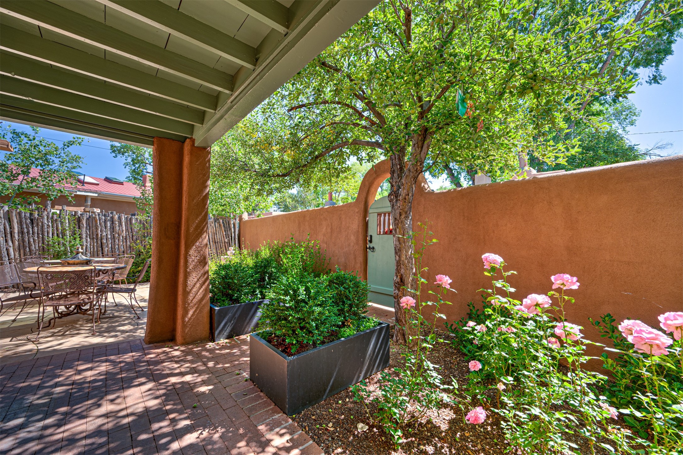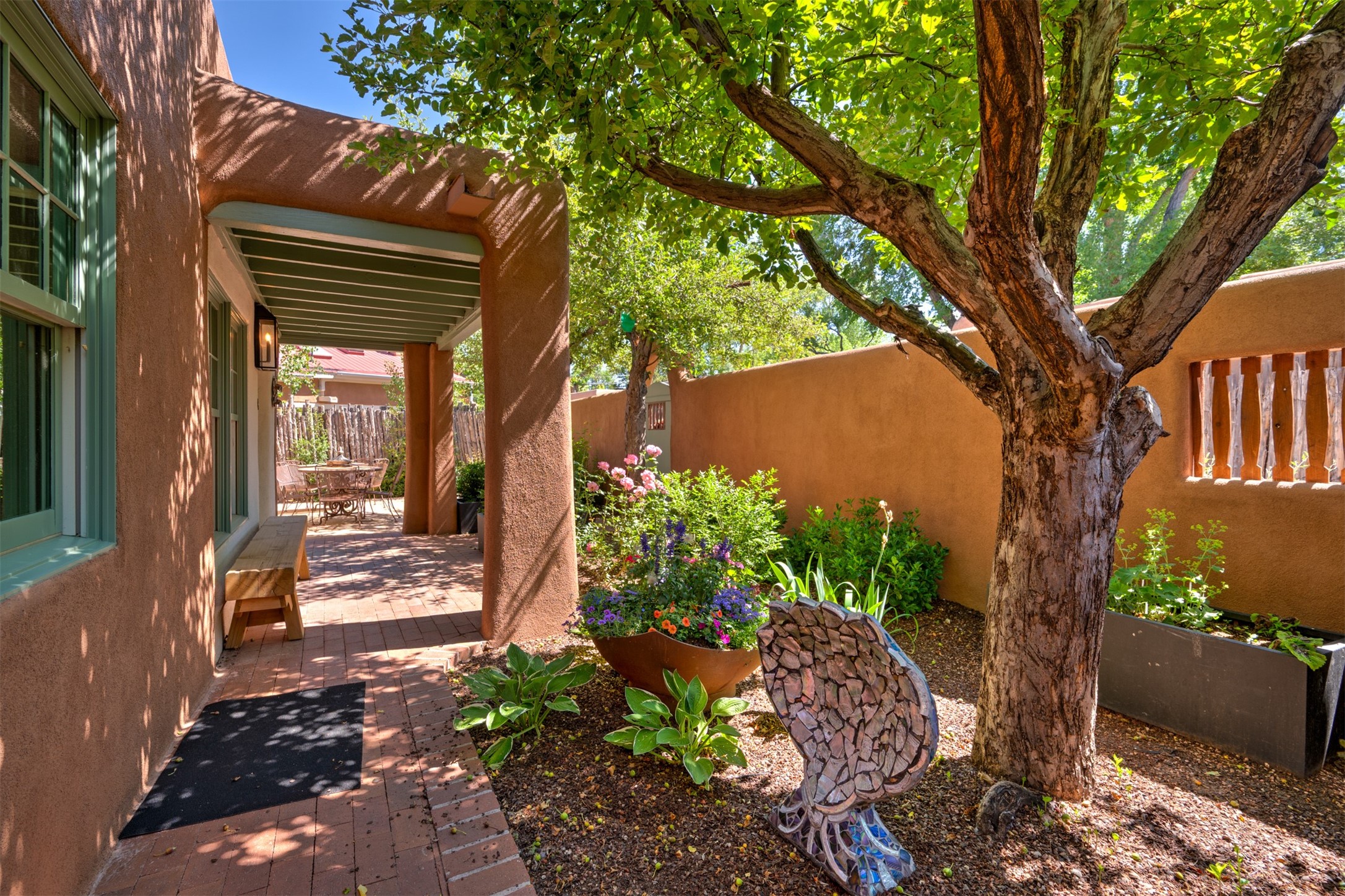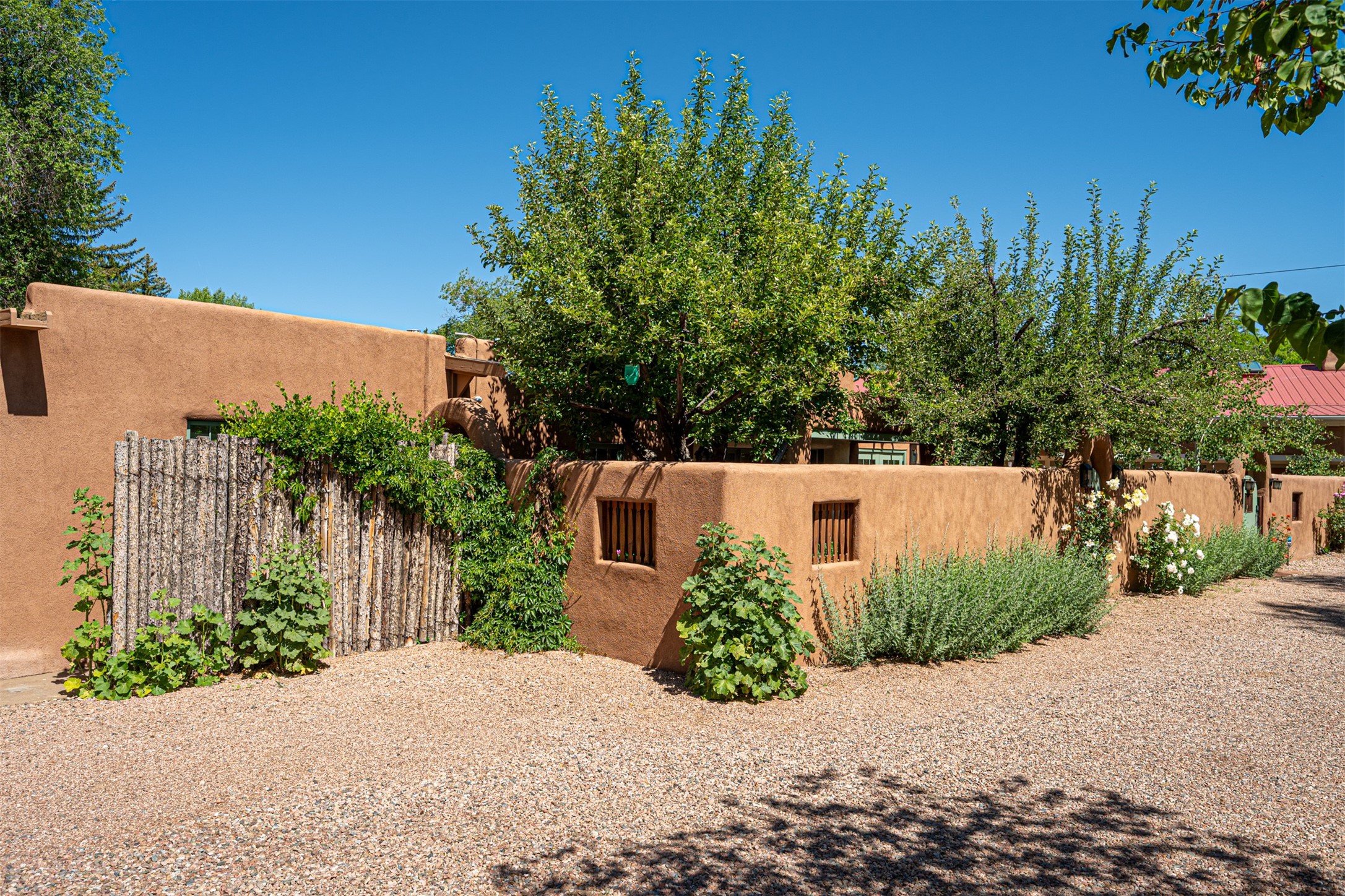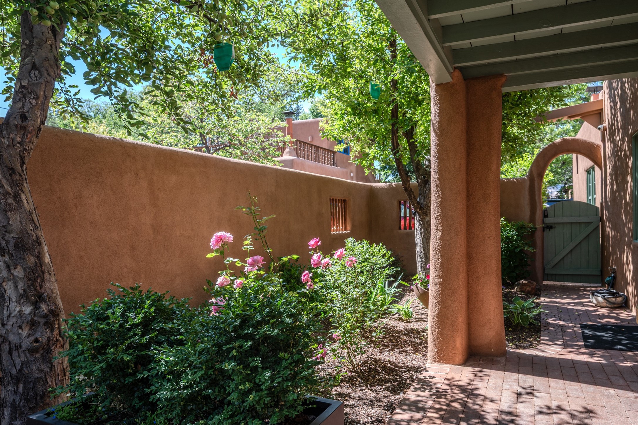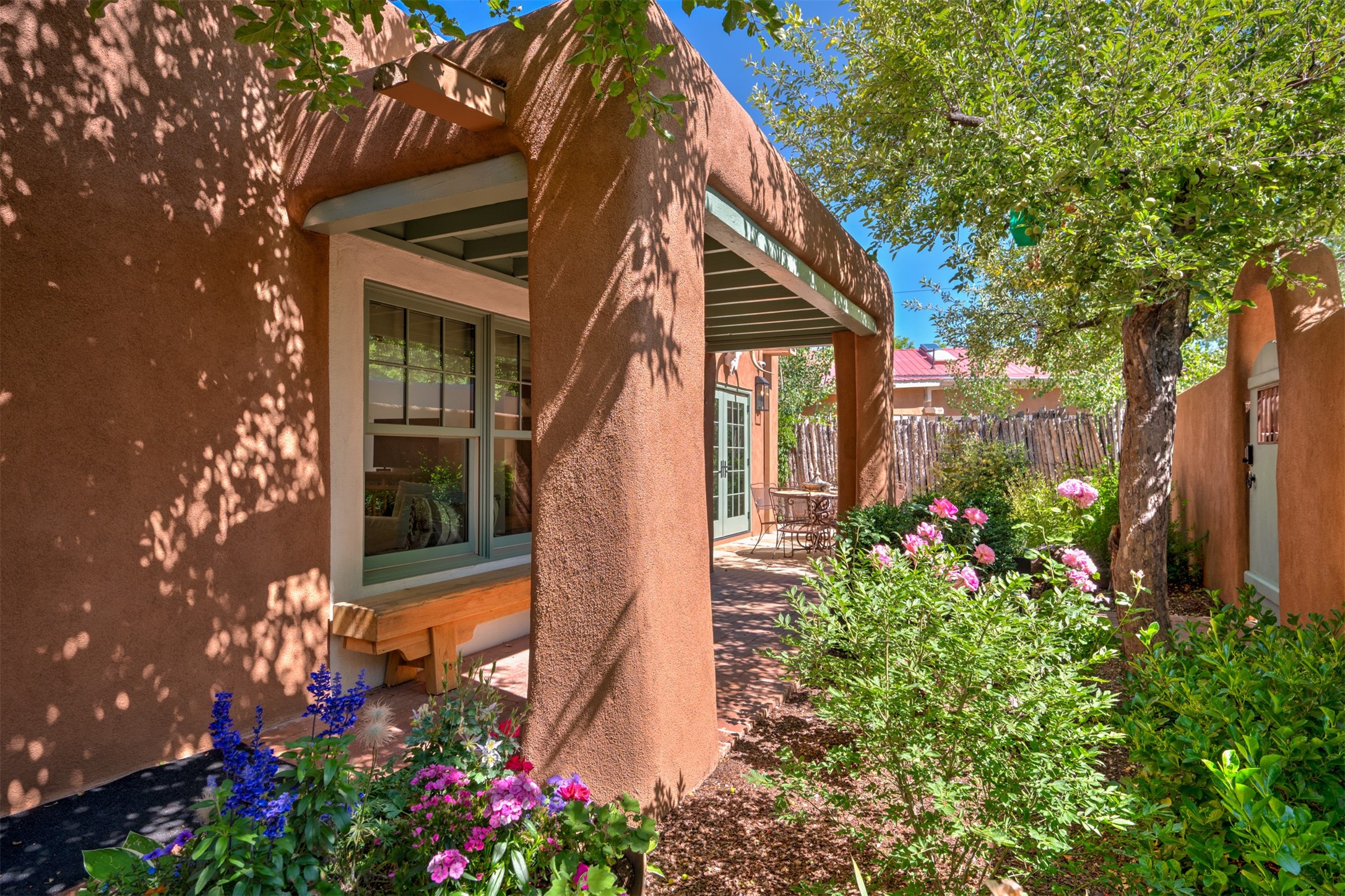 This entirely remodeled condo is free standing in historic downtown Santa Fe.. Fine dining, Canyon Road galleries and shopping is at your fingertips. No stone is left unturned in this romantic well appointed 2 bedroom each ensuite including an office, and powder room.. The inviting open kitchen & dining is spacious and light with access to two courtyards behind adobe walls and coyote fencing. Styled with a designer's detailed eye, this is rare perfection. Enter the private courtyard through a traditional gate. An oasis awaits with mature landscaping, roses, fruit trees all irrigated. This home has more than you expect of a gracious Eastside adobe. A one car garage, alarm system throughout and off street parking down a sleepy lane on the historic Acequia Madre make this the best Santa Fe get-a-way/lock up and go.