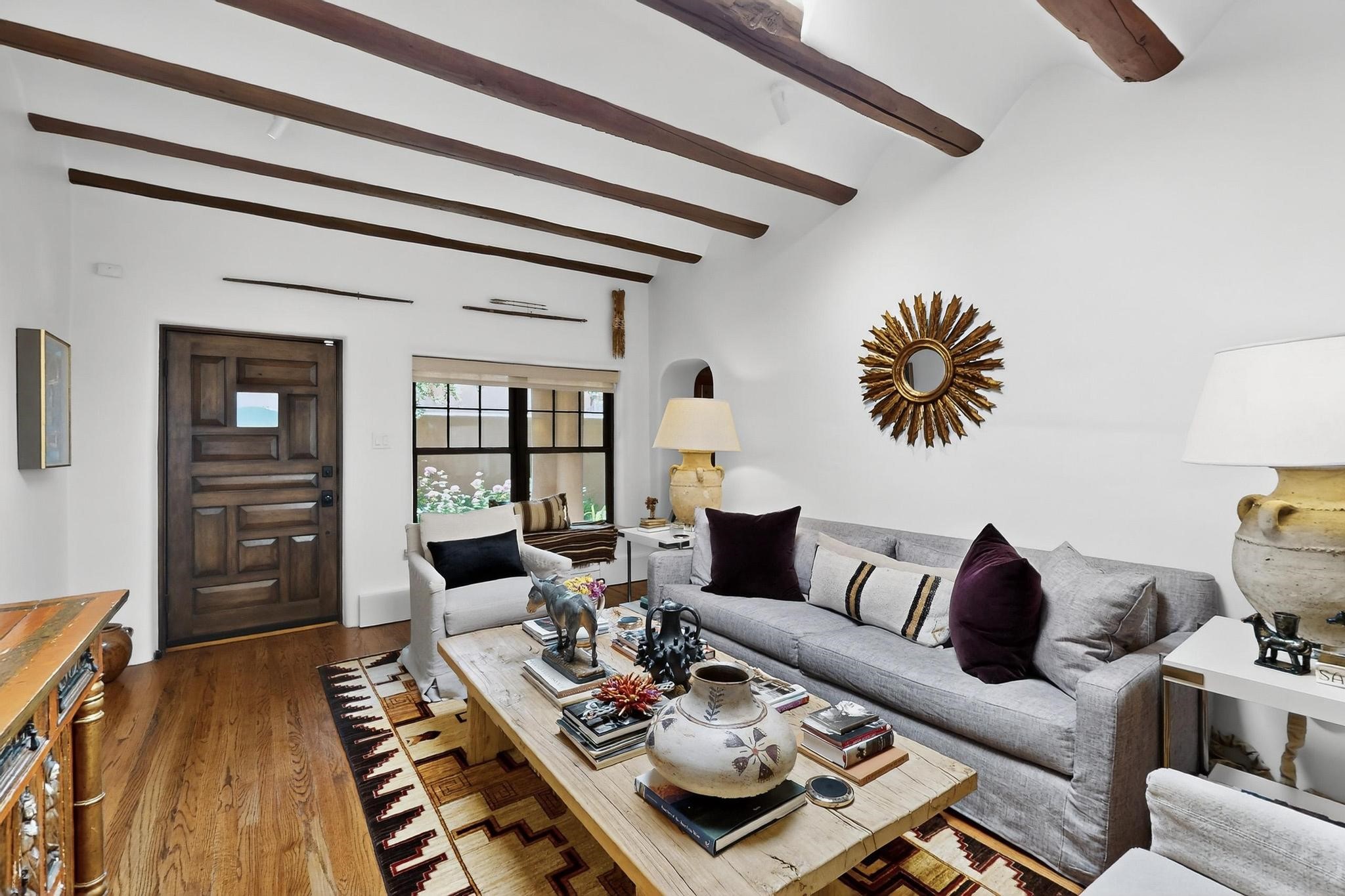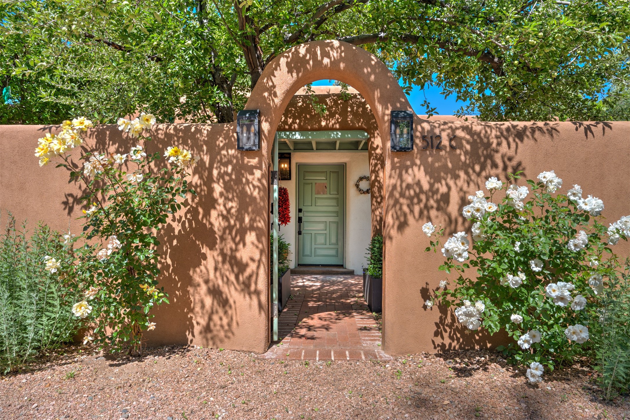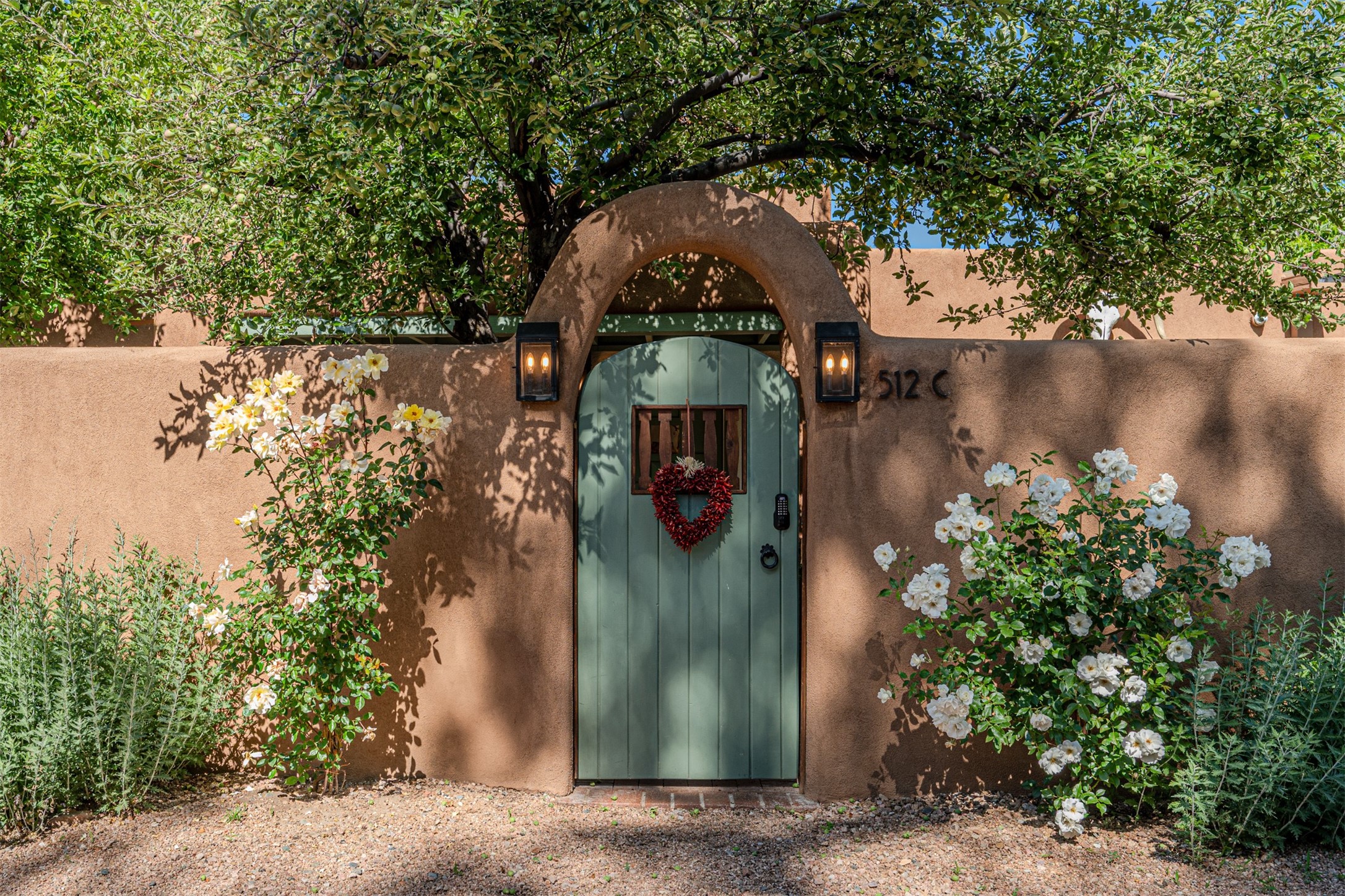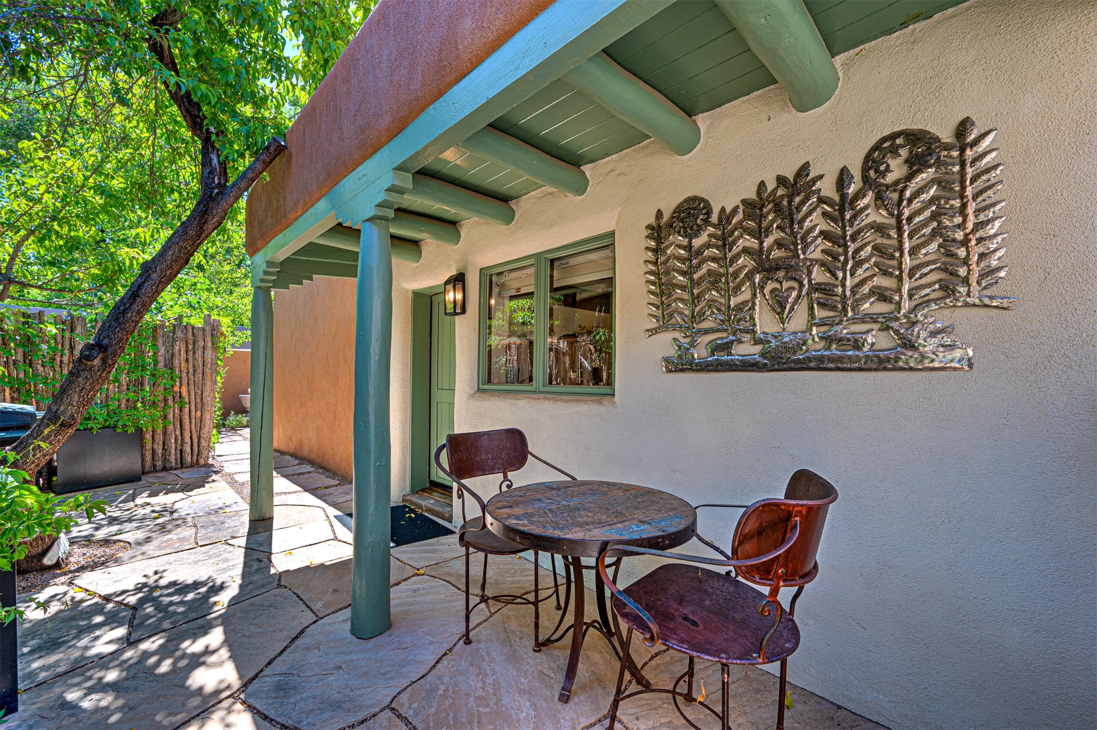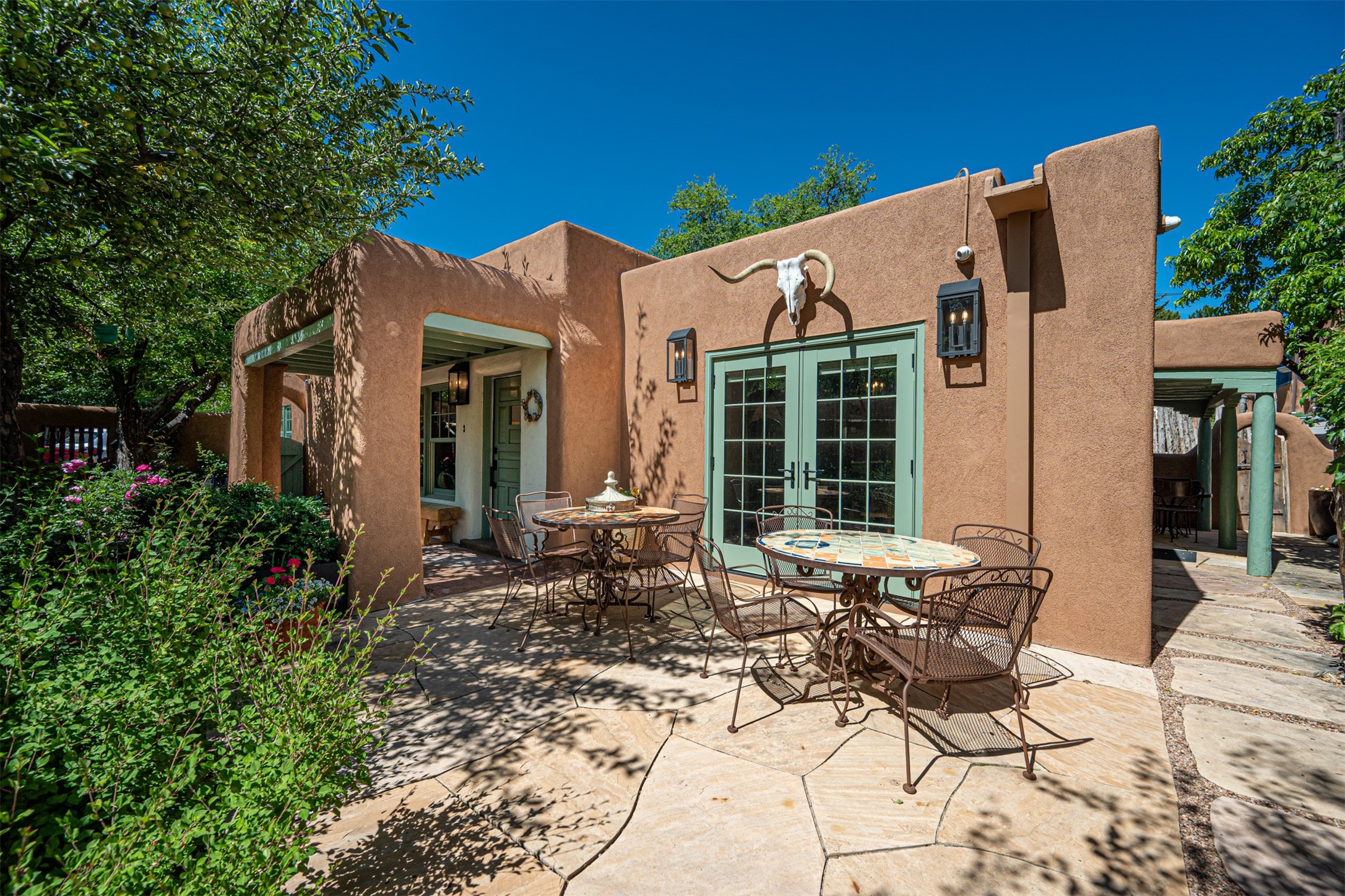 This entirely remodeled condo is free standing in historic downtown Santa Fe.. Fine dining, Canyon Road galleries and shopping is at your fingertips. No stone is left unturned in this romantic well appointed 2 bedroom each ensuite including an office, and powder room.. The inviting open kitchen & dining is spacious and light with access to two courtyards behind adobe walls and coyote fencing. Styled with a designer's detailed eye, this is rare perfection. Enter the private courtyard through a traditional gate. An oasis awaits with mature landscaping, roses, fruit trees all irrigated. This home has more than you expect of a gracious Eastside adobe. A one car garage, alarm system throughout and off street parking down a sleepy lane on the historic Acequia Madre make this the best Santa Fe get-a-way/lock up and go.