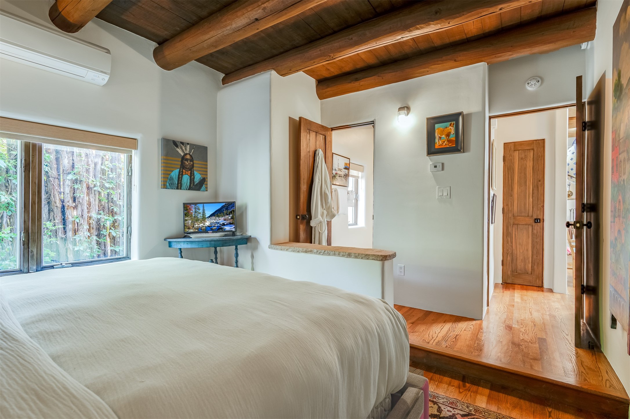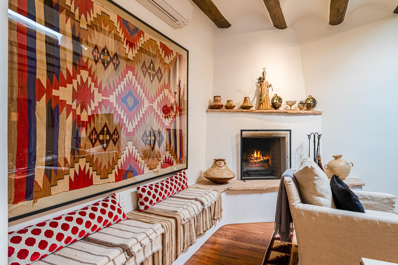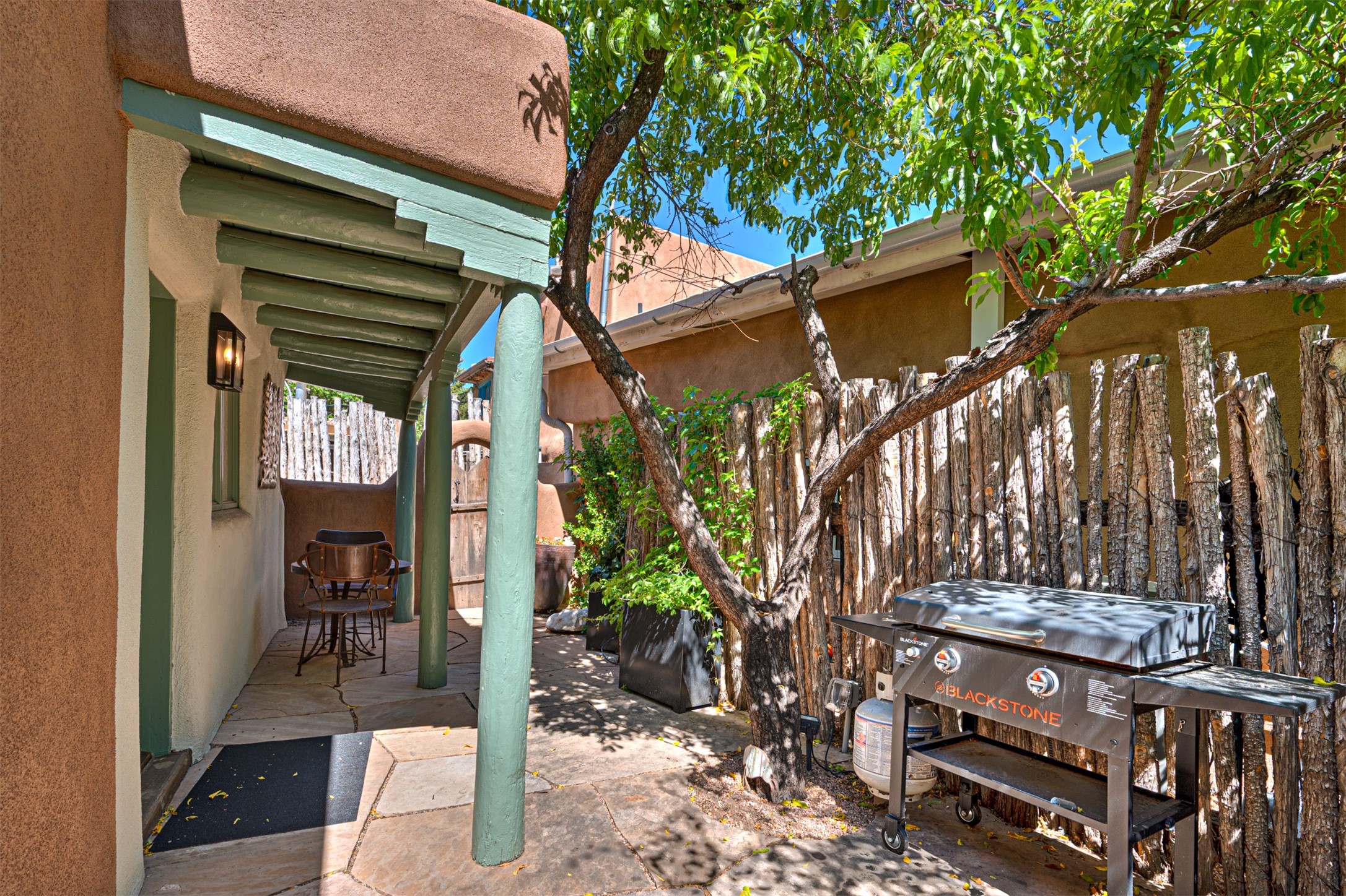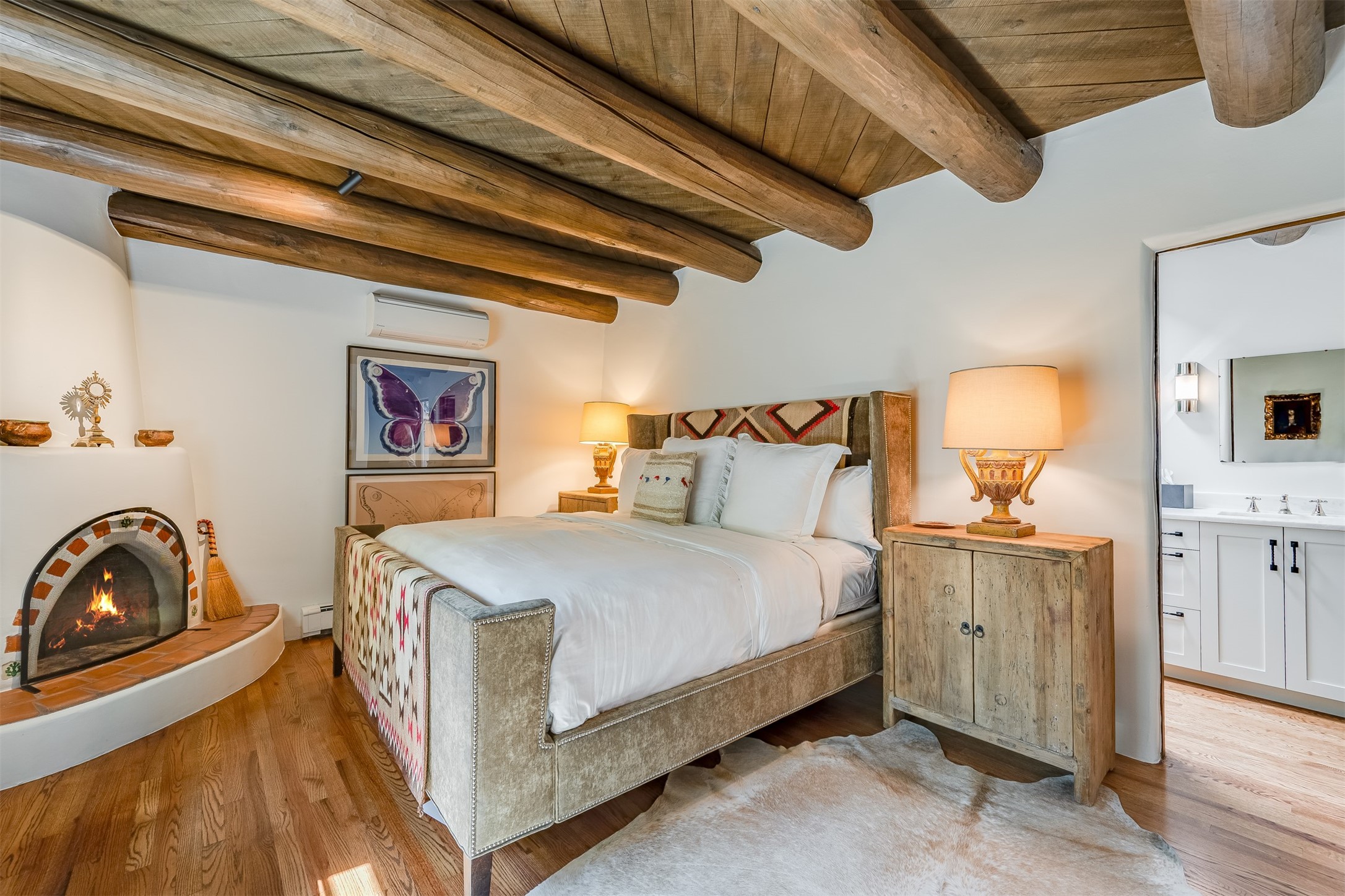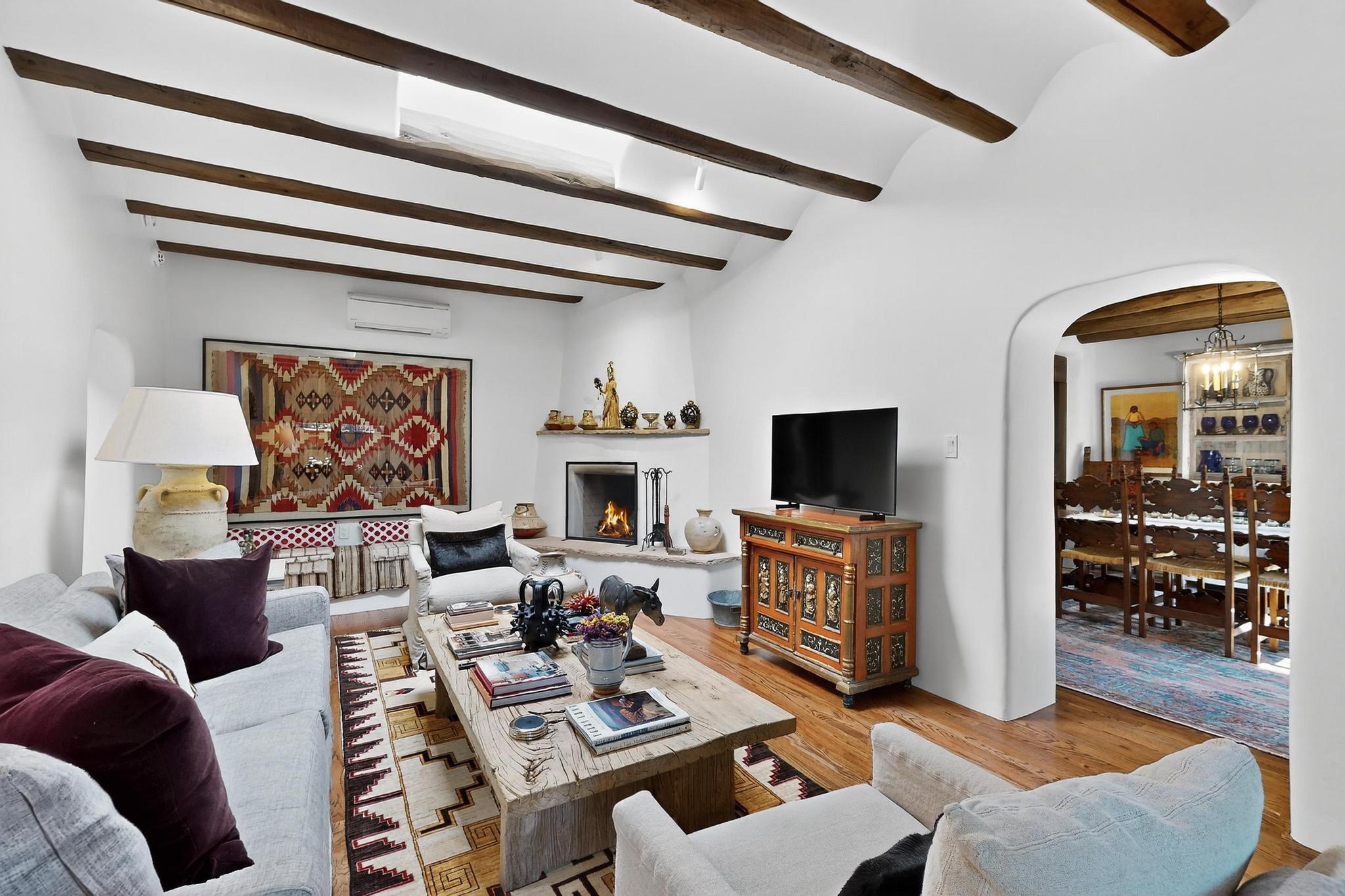 This entirely remodeled condo is free standing in historic downtown Santa Fe.. Fine dining, Canyon Road galleries and shopping is at your fingertips. No stone is left unturned in this romantic well appointed 2 bedroom each ensuite including an office, and powder room.. The inviting open kitchen & dining is spacious and light with access to two courtyards behind adobe walls and coyote fencing. Styled with a designer's detailed eye, this is rare perfection. Enter the private courtyard through a traditional gate. An oasis awaits with mature landscaping, roses, fruit trees all irrigated. This home has more than you expect of a gracious Eastside adobe. A one car garage, alarm system throughout and off street parking down a sleepy lane on the historic Acequia Madre make this the best Santa Fe get-a-way/lock up and go.