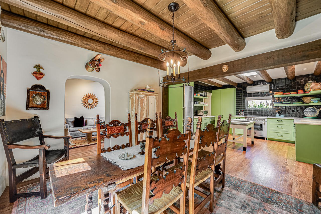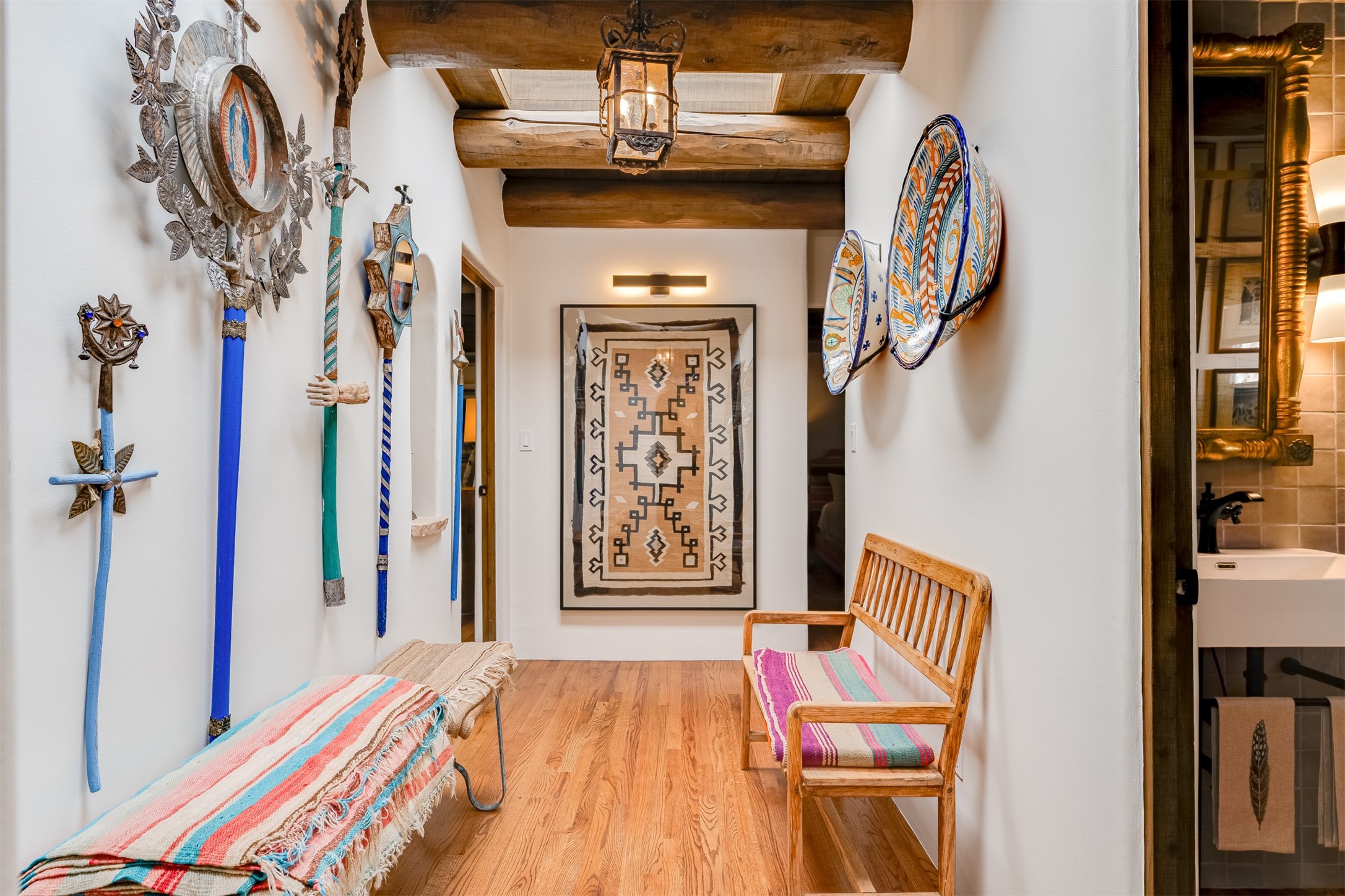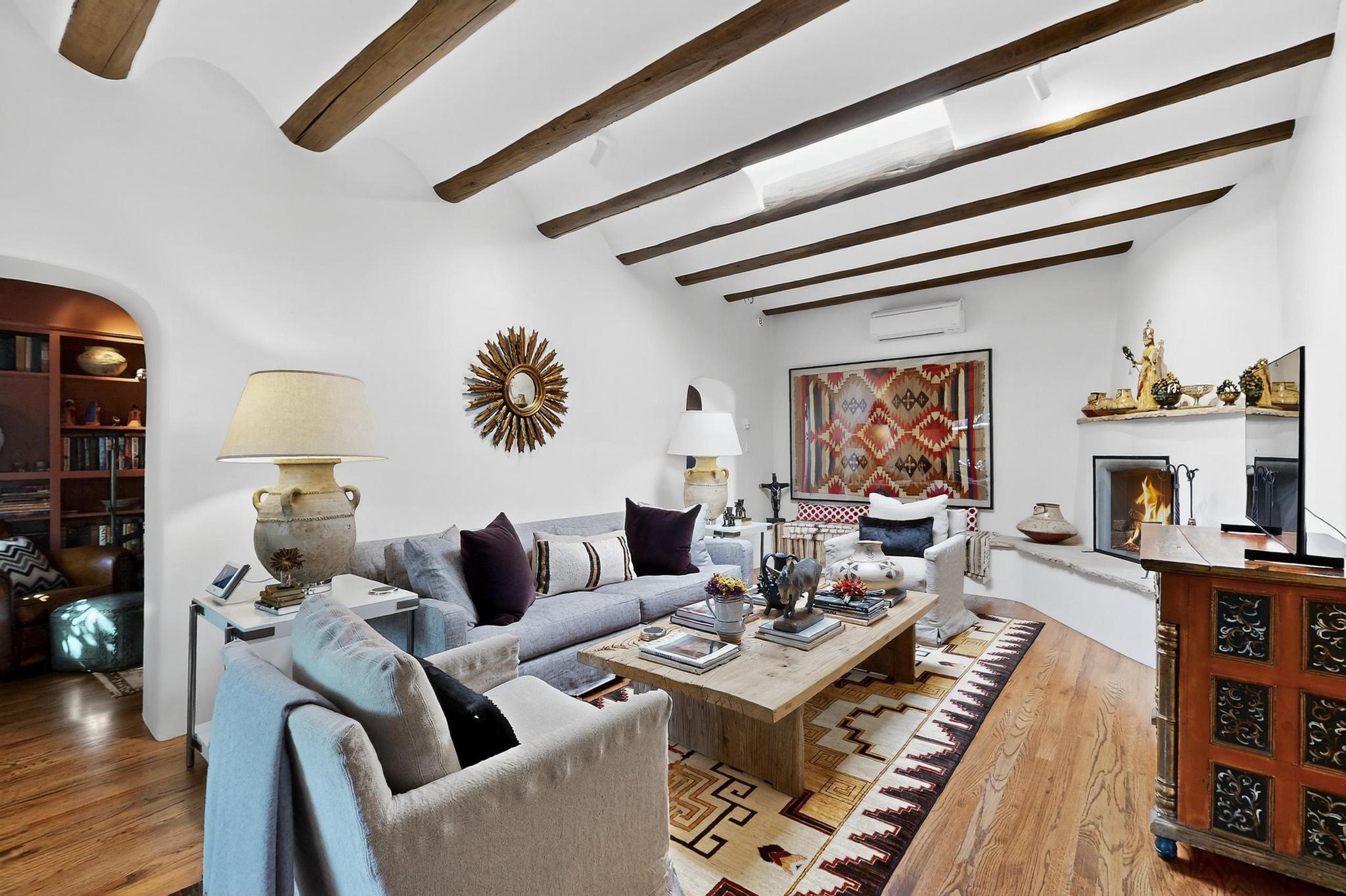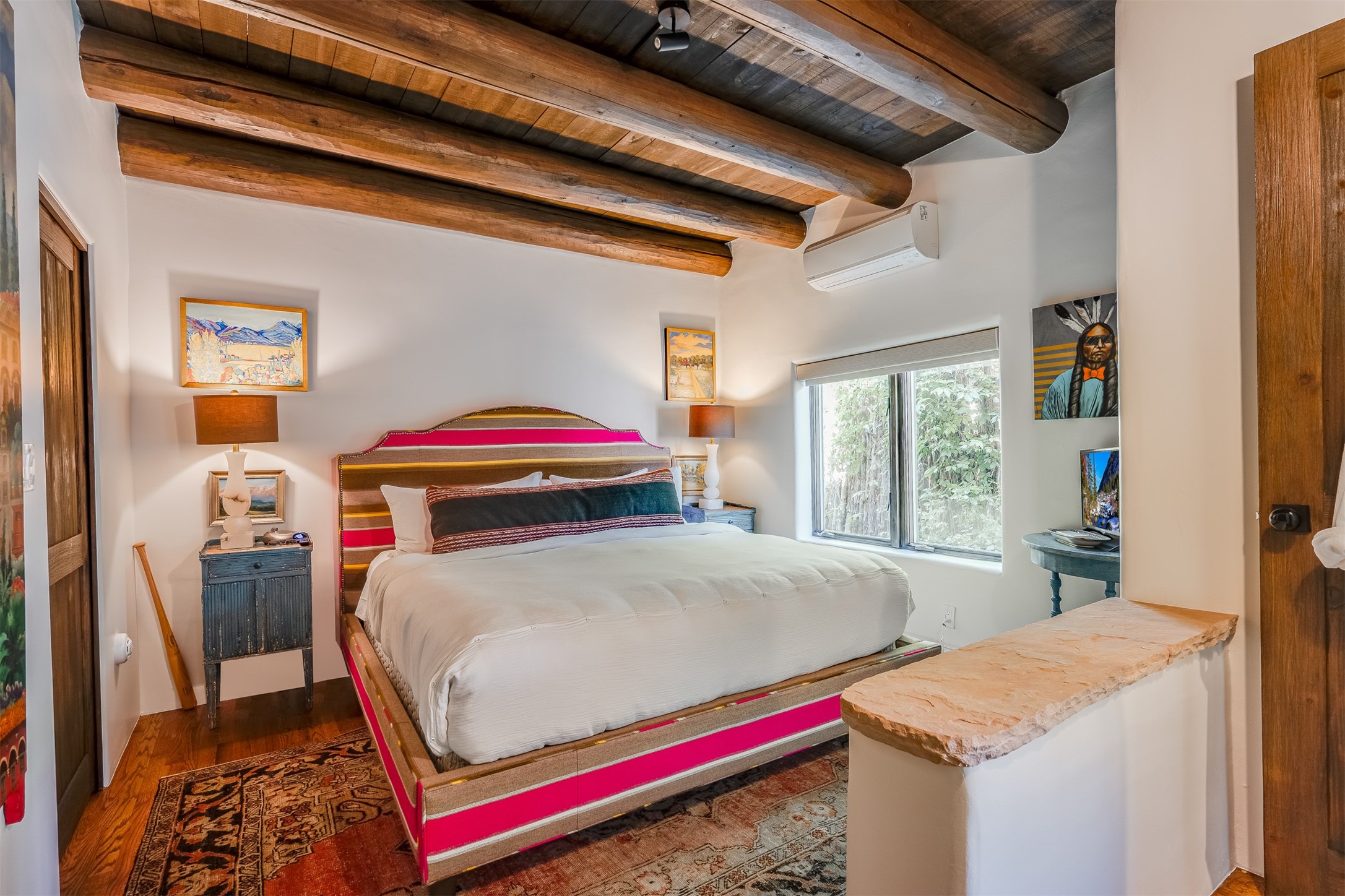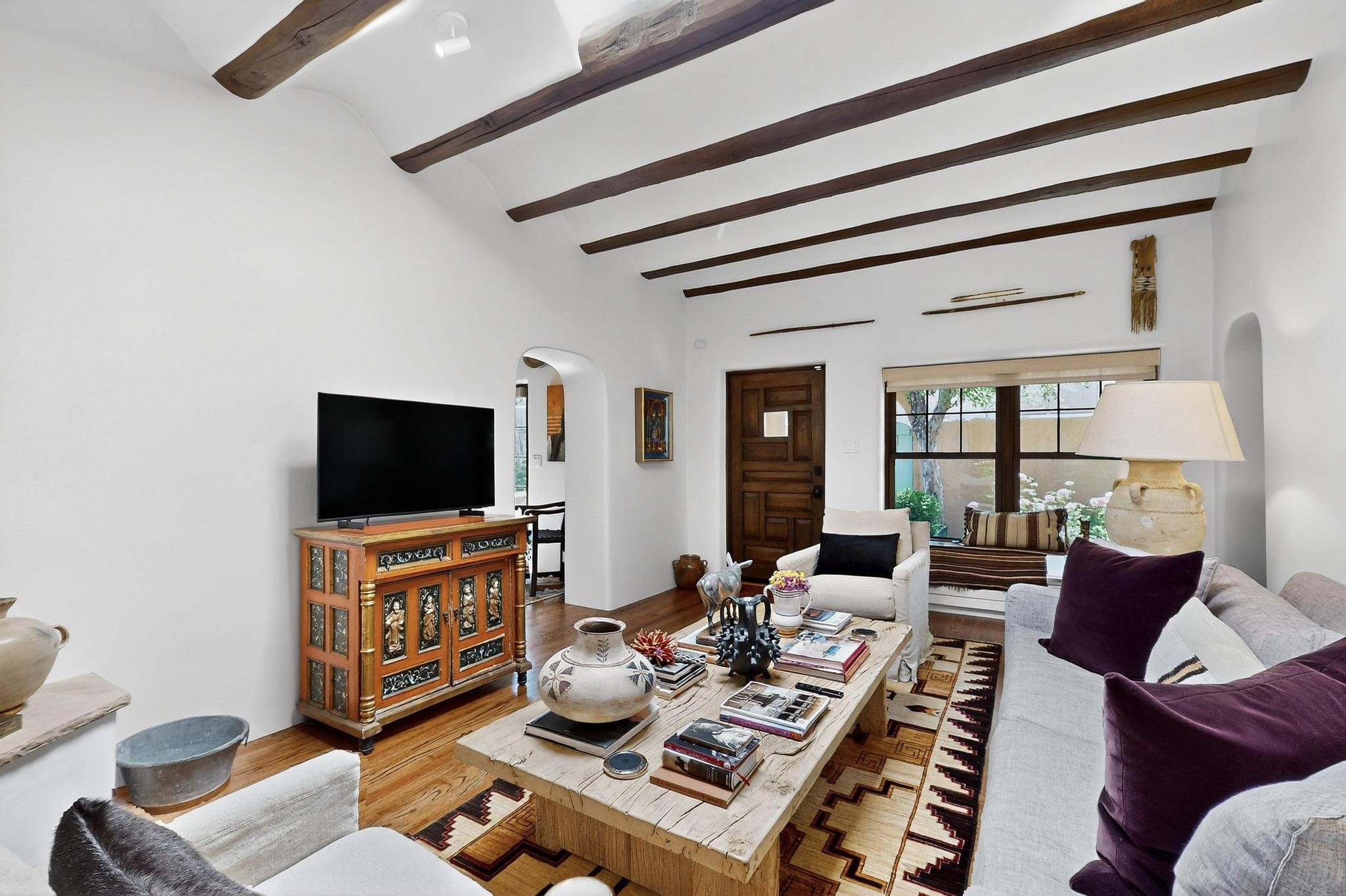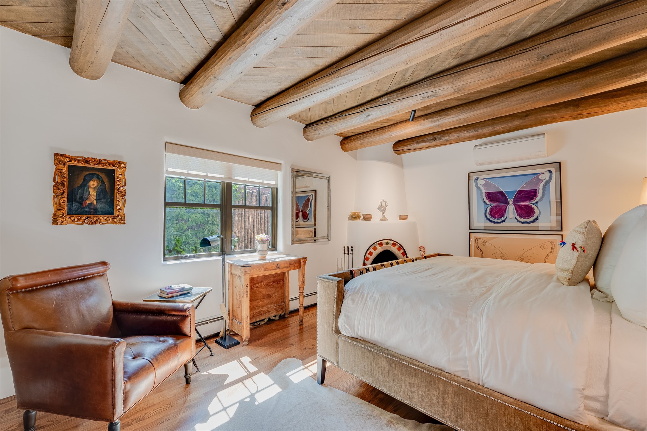 This entirely remodeled condo is free standing in historic downtown Santa Fe.. Fine dining, Canyon Road galleries and shopping is at your fingertips. No stone is left unturned in this romantic well appointed 2 bedroom each ensuite including an office, and powder room.. The inviting open kitchen & dining is spacious and light with access to two courtyards behind adobe walls and coyote fencing. Styled with a designer's detailed eye, this is rare perfection. Enter the private courtyard through a traditional gate. An oasis awaits with mature landscaping, roses, fruit trees all irrigated. This home has more than you expect of a gracious Eastside adobe. A one car garage, alarm system throughout and off street parking down a sleepy lane on the historic Acequia Madre make this the best Santa Fe get-a-way/lock up and go.