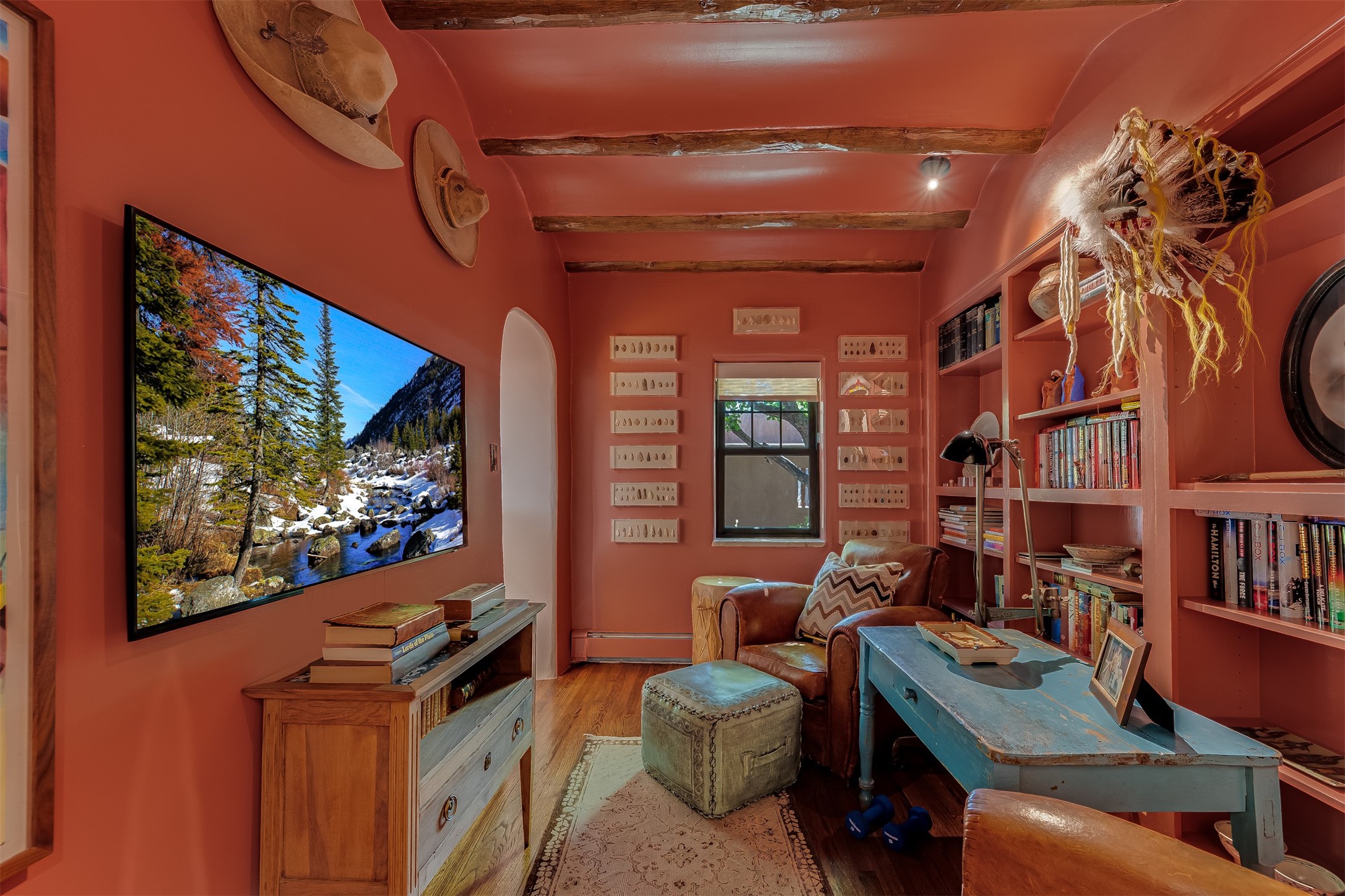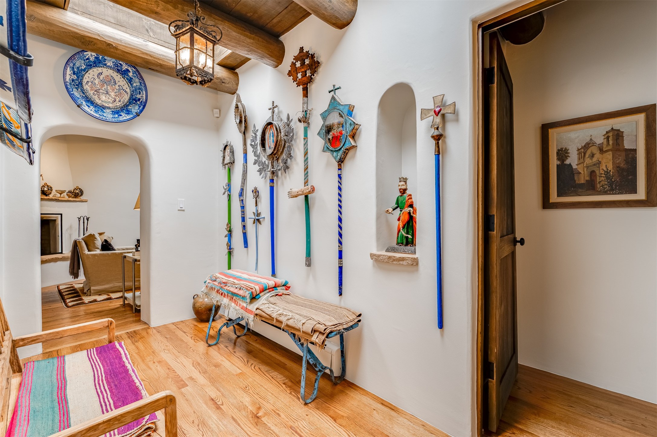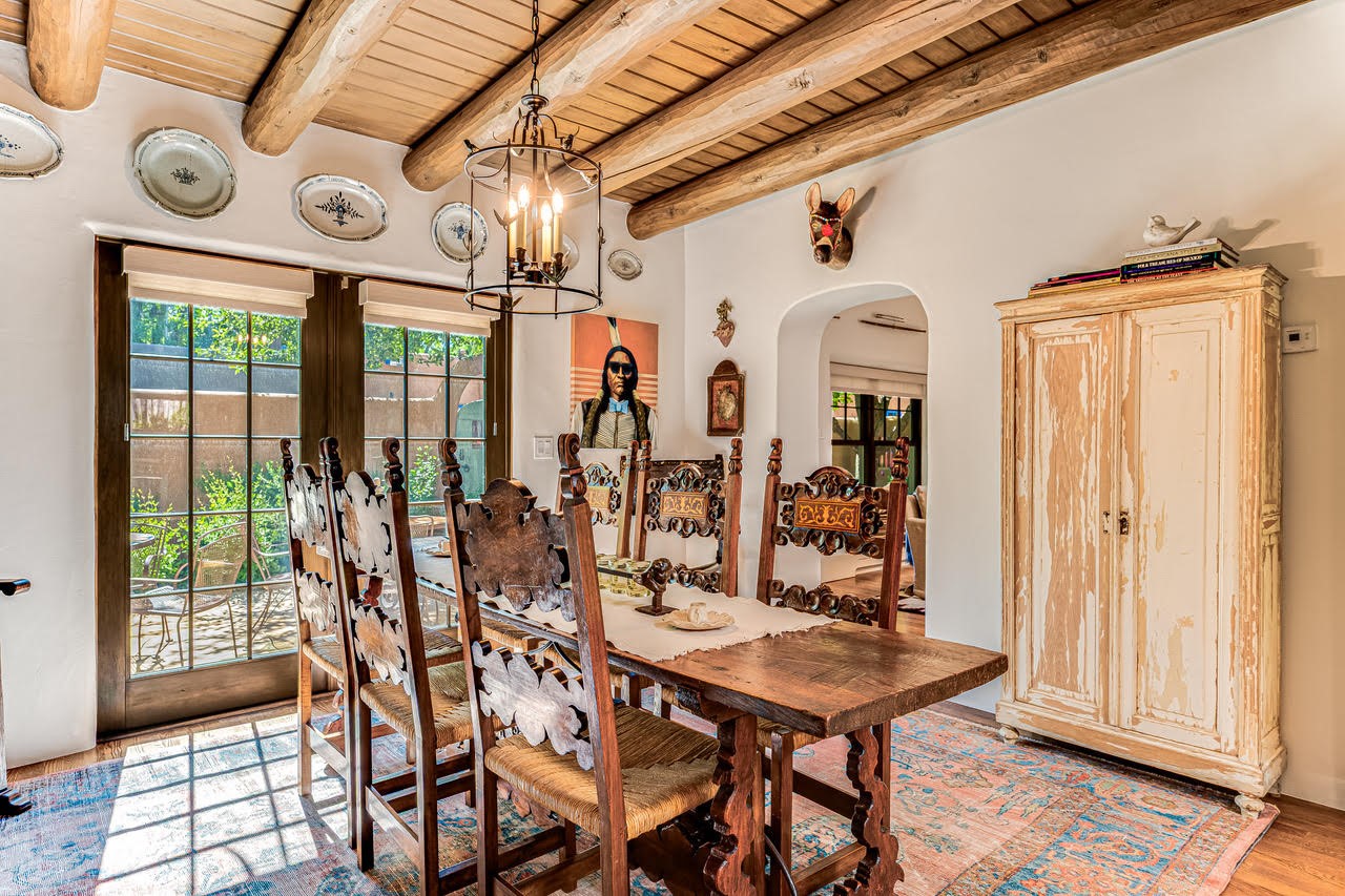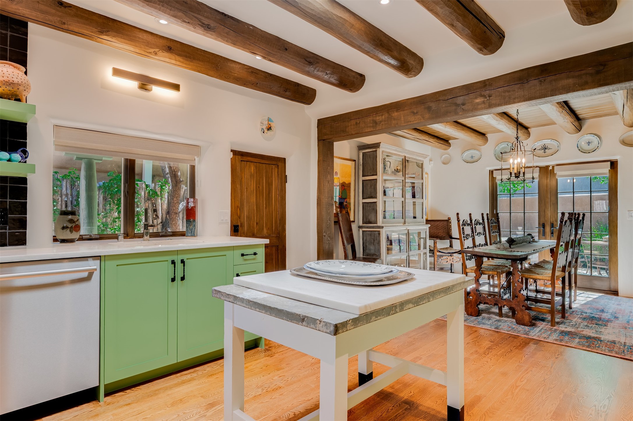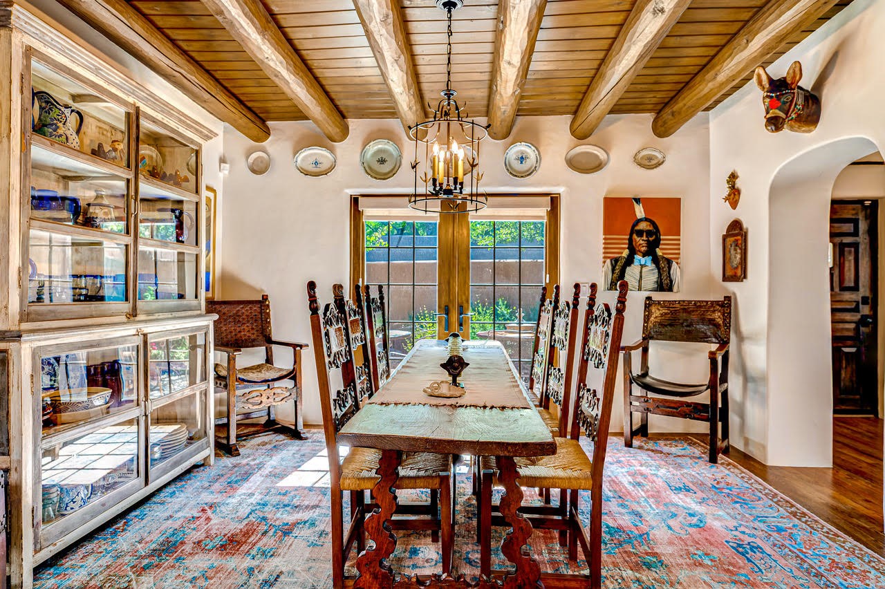 This entirely remodeled condo is free standing in historic downtown Santa Fe.. Fine dining, Canyon Road galleries and shopping is at your fingertips. No stone is left unturned in this romantic well appointed 2 bedroom each ensuite including an office, and powder room.. The inviting open kitchen & dining is spacious and light with access to two courtyards behind adobe walls and coyote fencing. Styled with a designer's detailed eye, this is rare perfection. Enter the private courtyard through a traditional gate. An oasis awaits with mature landscaping, roses, fruit trees all irrigated. This home has more than you expect of a gracious Eastside adobe. A one car garage, alarm system throughout and off street parking down a sleepy lane on the historic Acequia Madre make this the best Santa Fe get-a-way/lock up and go.