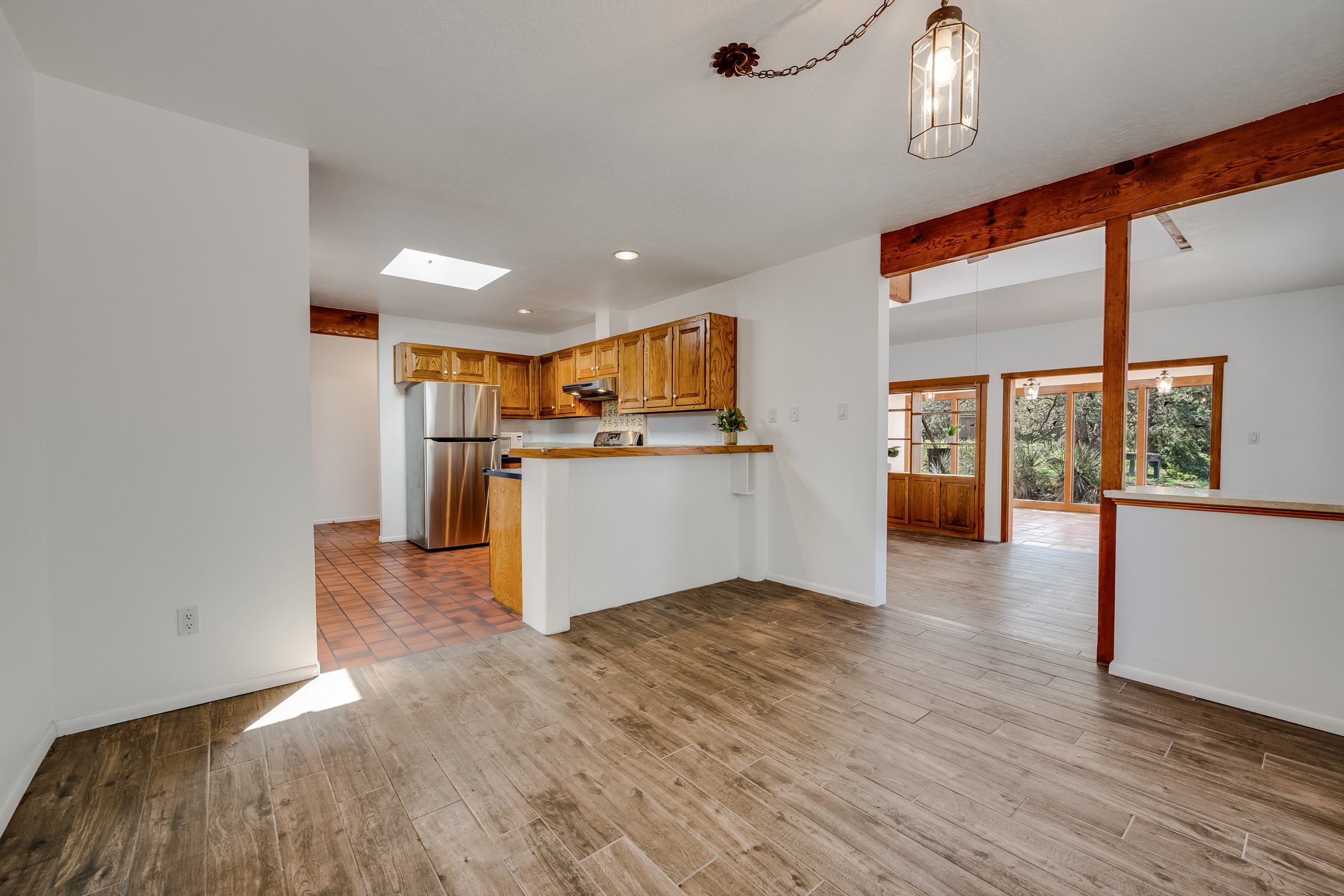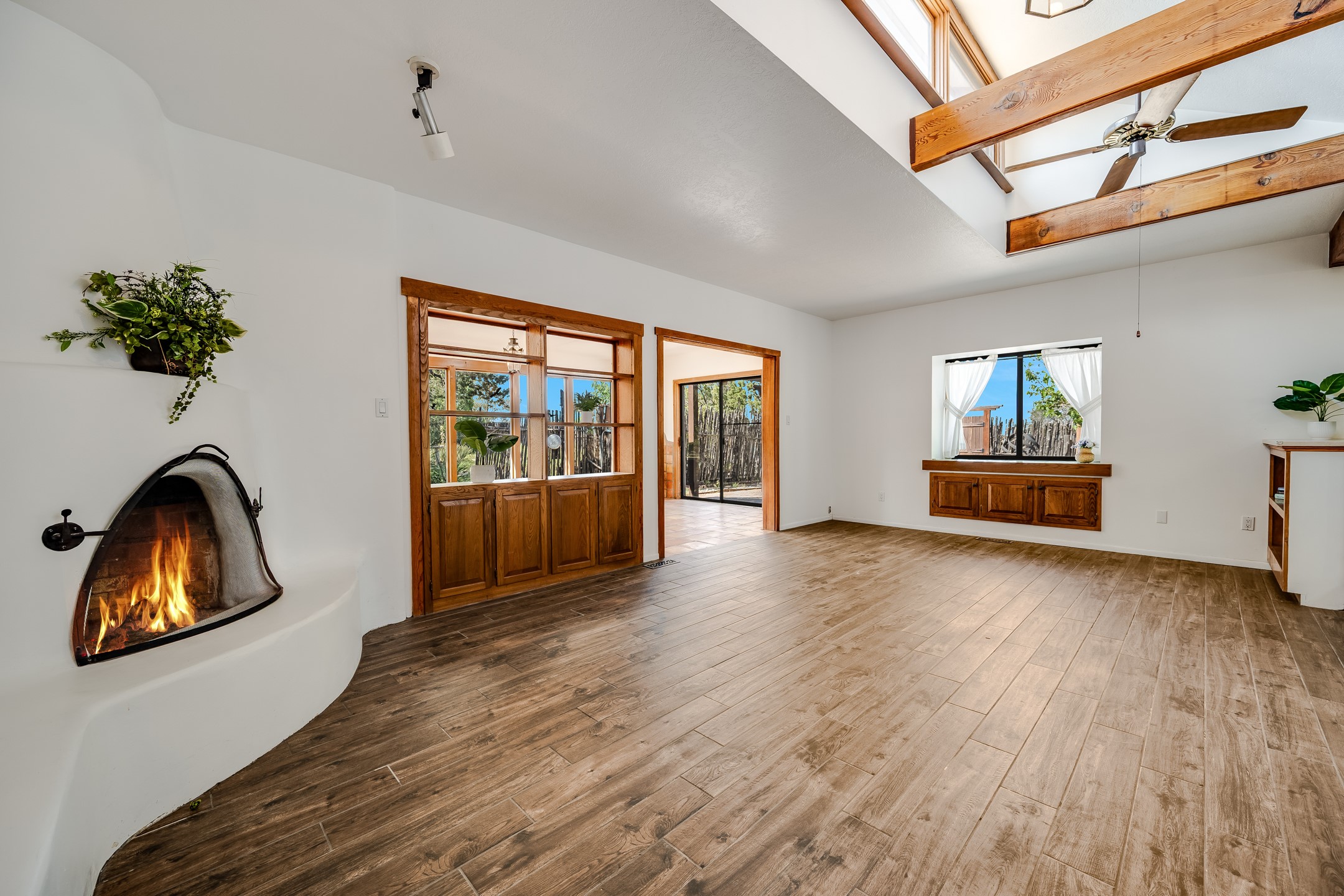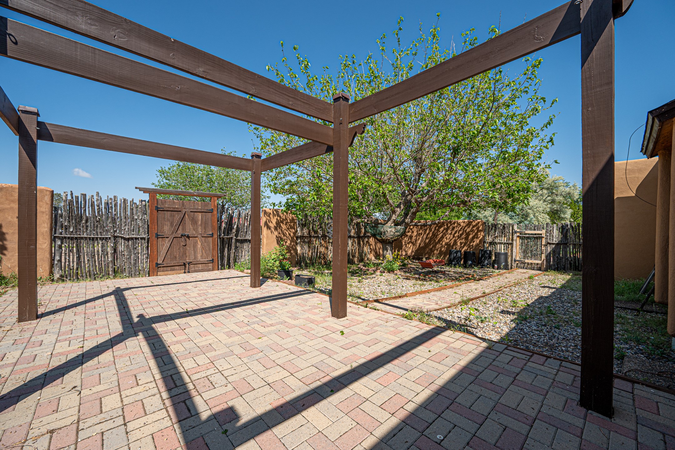This move-in ready, DeVargas Heights home offers +/- 1,900 square feet of comfortable living space on a generous corner lot. The well maintained home features a classic, single-level floorpan with 3 bedrooms and 2 bathrooms, a central kitchen, dedicated living & dining areas, plus a large bonus sunroom with wood-burning stove. Tile flooring, high ceilings, and a cozy kiva fireplace add warmth and light to the interior. Outfitted with stainless steel appliances, and new countertops to enhance the sturdy cabinetry, the kitchen seamlessly transitions from intimate dinners to entertaining guests. The spacious primary bedroom is a peaceful retreat, while the two additional bedrooms offer flexibility for guests or a home office. Outside, the expansive 0.4 acre property boasts mature trees, established high desert plantings, outdoor patio with pergola, and ample room for outdoor living or gardening. A two-car garage offers additional storage or space for hobbies while the new roof c. 2018 and recent stucco will provide peace of mind for years to come. Located near parks, healthcare facilities, and within the Wood Gormley Elementary School footprint, this home combines comfort and practical amenities with Santa Fe charm, in a sought-after Santa Fe neighborhood. **See Broker Remarks for additional details, as provided by Seller.
