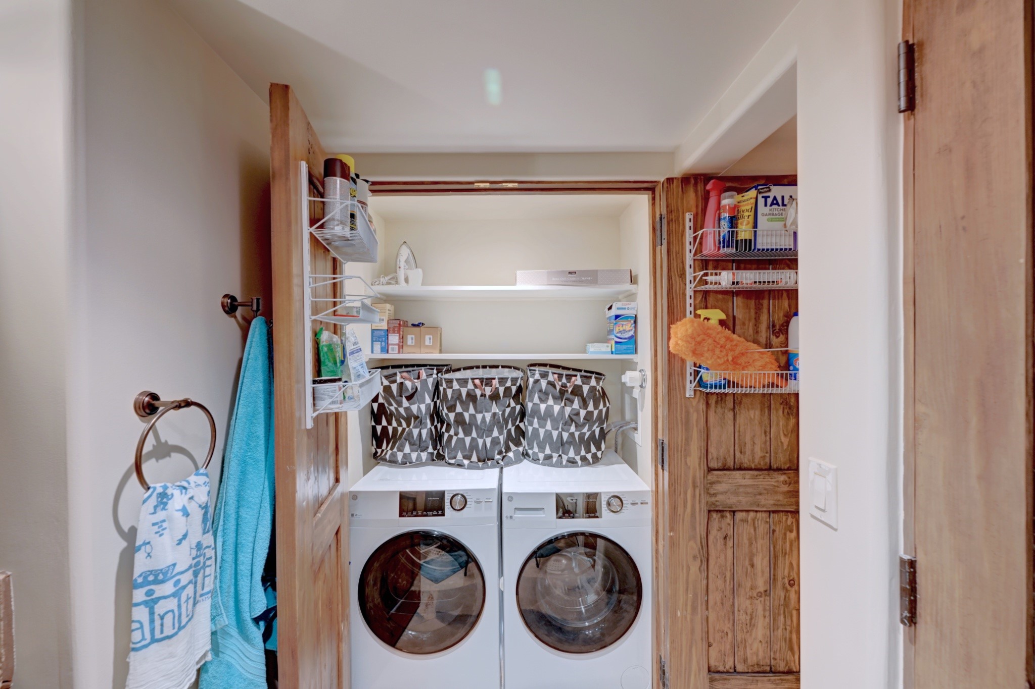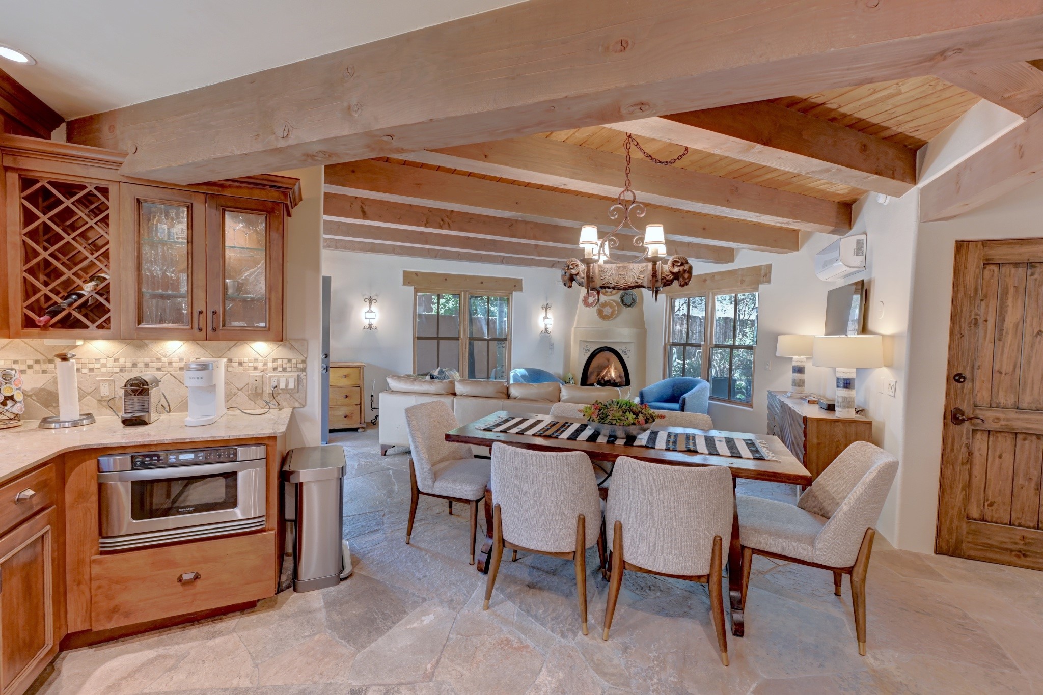 Nestled in the heart of Santa Fe's coveted historic Eastside and located off of Gonzales Rd, this elegant condo captures the essence of Southwestern living. Just a short walk from the famed Canyon Road art district, you'll find yourself perfectly positioned to enjoy the city's rich culture. Step inside to discover authentic Santa Fe style throughout this 1,352 +/- square foot retreat within a two-condo development. Admire beautiful beam and wood-plank ceilings, while gorgeous hand-hewn flagstone floors ground the space in traditional craftsmanship. The well-appointed cook's kitchen flows seamlessly into the living and dining areas, featuring thoughtful touches like a two-drawer dishwasher, convenient pot-filler, and a microwave drawer. Unwind by the kiva fireplace in the living room or step outside to your enchanting garden. This outdoor oasis boasts a hand-stacked rock wall, carved Buddha wooden gate, large, mature Wisteria vine and a soothing fountain surrounded by two distinct seating areas--all beautifully landscaped for easy care. Upstairs, the primary bedroom suite offers a private deck with lovely views, plus an ensuite bathroom featuring a double sink vanity, large soaking tub, and luxurious steam shower. Artistic details abound throughout, from wrought iron stair rails and light fixtures to hand painting on a nicho and fireplace. A charming wooden door with hand-painted Santos leads to the second bedroom, which doubles perfectly as a home office. Every room showcases custom cabinetry, doors, and true divided-light windows. Modern comforts include radiant in-floor heating, ductless mini-splits for cooling comfort, and a new tankless hot water heater. One dedicated parking space completes this package. Located minutes from Canyon Road's galleries, world renown restaurants and the Santa Fe Plaza's downtown attractions, this condo offers both convenience and tranquility. Whether as your Santa Fe pied--terre or full-time residence, this lock-and-leave lifestyle puts the best of The City Different at your doorstep. Please see the Matterport 3-D walkthrough in the listing. An extensive furniture package is available for purchase separately.
