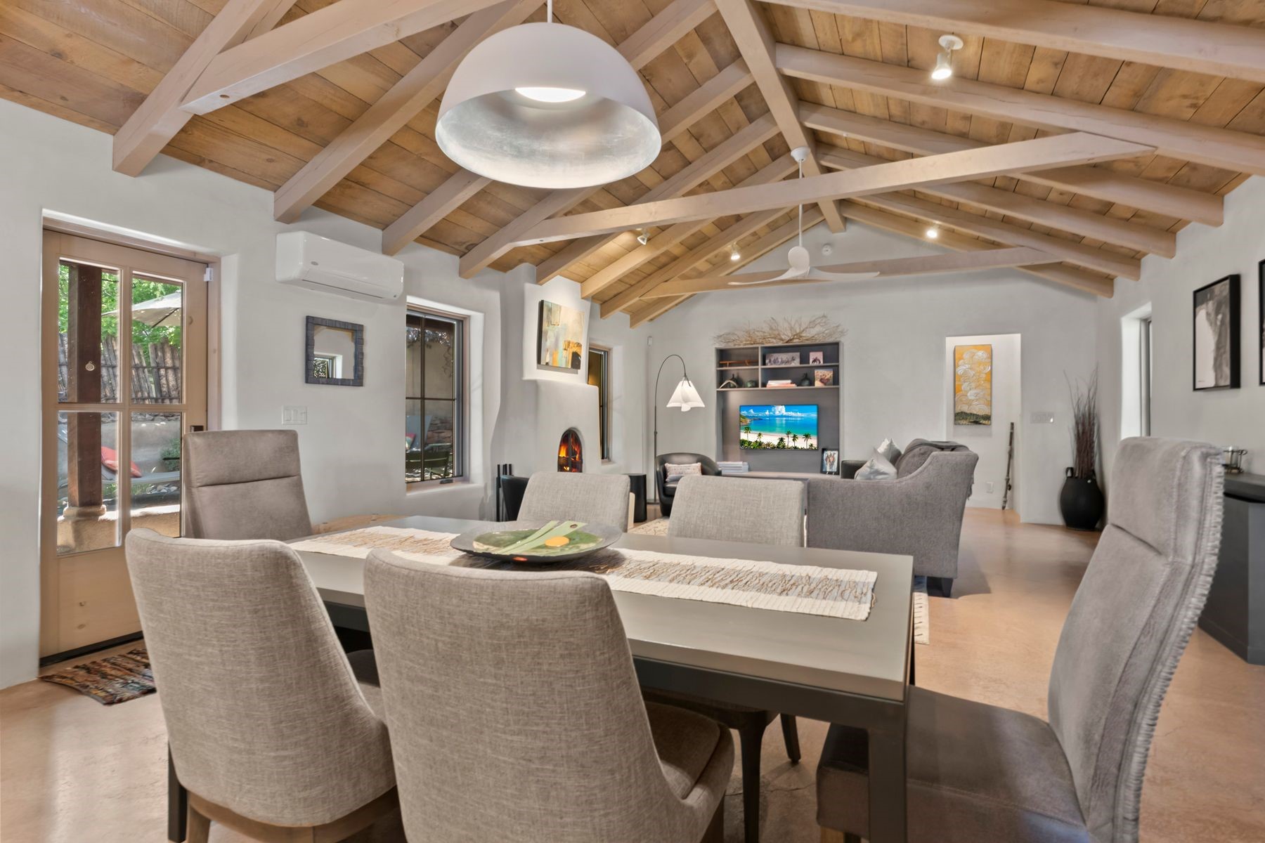 Elegant & Refined, free standing condominium in Pristine, Move-in Condition Eastside Downtown Santa Fe! Built in 2015, this beautiful True North designed Adobe has all of the amenities you desire on the Eastside of Downtown Santa Fe: Northern NM Pitched Roof style, Single level, soaring ceilings with light colored natural wood, plaster walls, and earth toned stained concrete flooring. Two bedrooms are located on either end of the living area: The primary en-suite bedroom is bathed in natural light, with spacious walk in closet, and a full bathroom. The 2nd bedroom is private, located just off the living area and might accommodate family, guests, fitness endeavors, with nearby full bath. The "Great Room" is open and includes a spacious modern kitchen, dining area, and comfortable living space to enjoy quiet evenings in front of the wood burning fireplace. A spacious entry mud room functions as closet and small storage for gear & seasonal items; there is a separate laundry located just off the living room next to a well designed pantry/ bar. The private and fully enclosed back yard allows for intimate gatherings surrounded by native plants and shrubs. All City utilities, Mini Splits for Cooling, in floor radiant heat, contemporary lighting and fixtures. Single car covered carport is attached for private parking; guest parking is available at the entry to this small enclave just off Historic Canyon Rd. A truly Turn Key property located just moments from Canyon Road galleries, restaurants, a park, and Cristo Rey church. Most Furnishings - interior and exterior - may be included with an Acceptable Offer to Purchas-See Remarks.