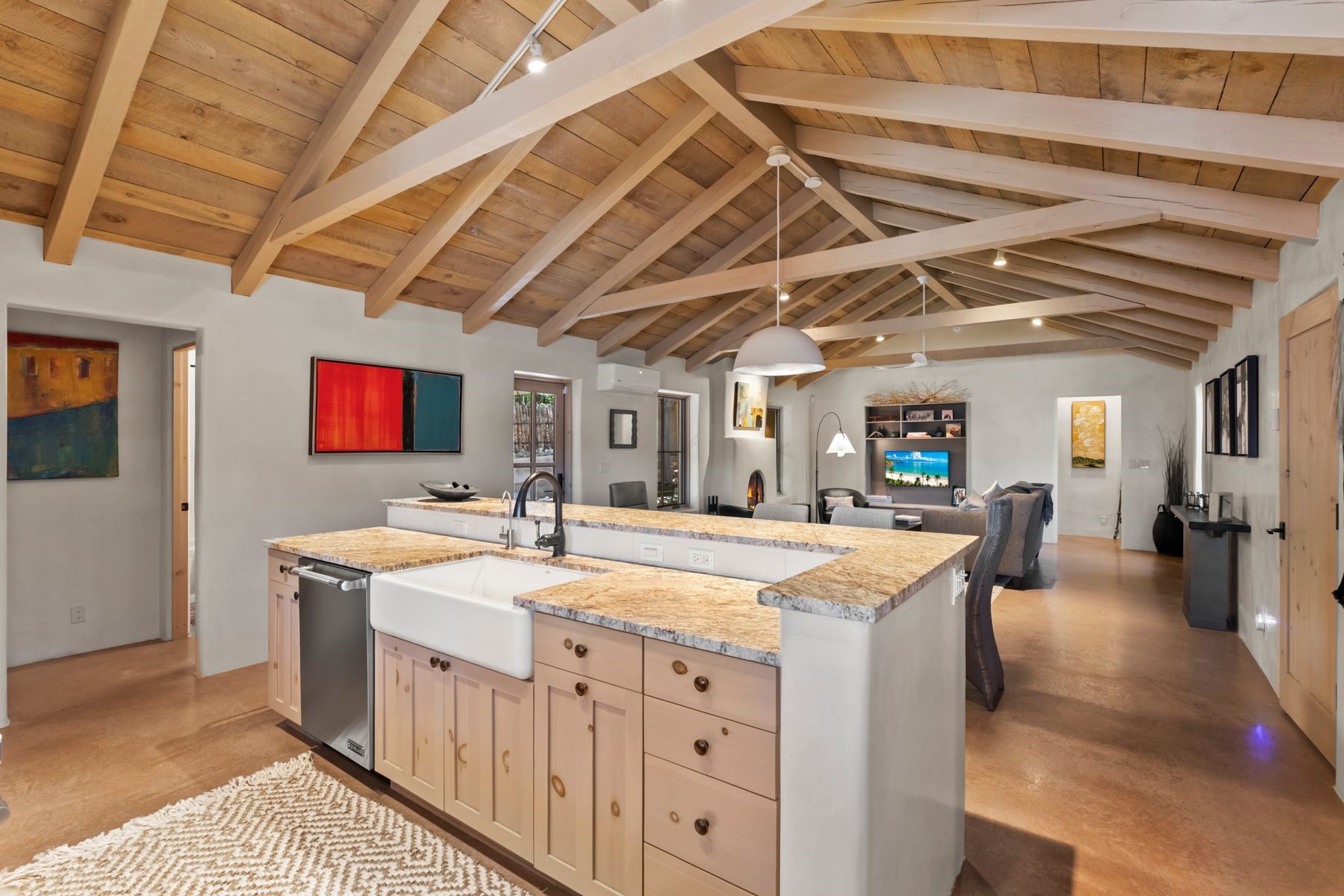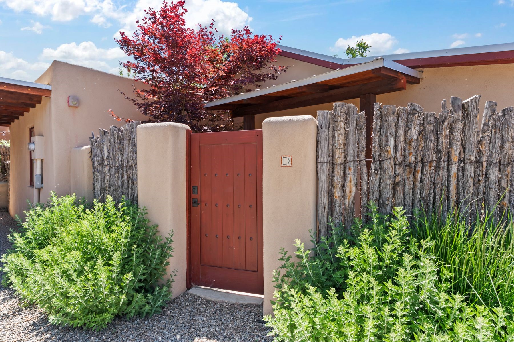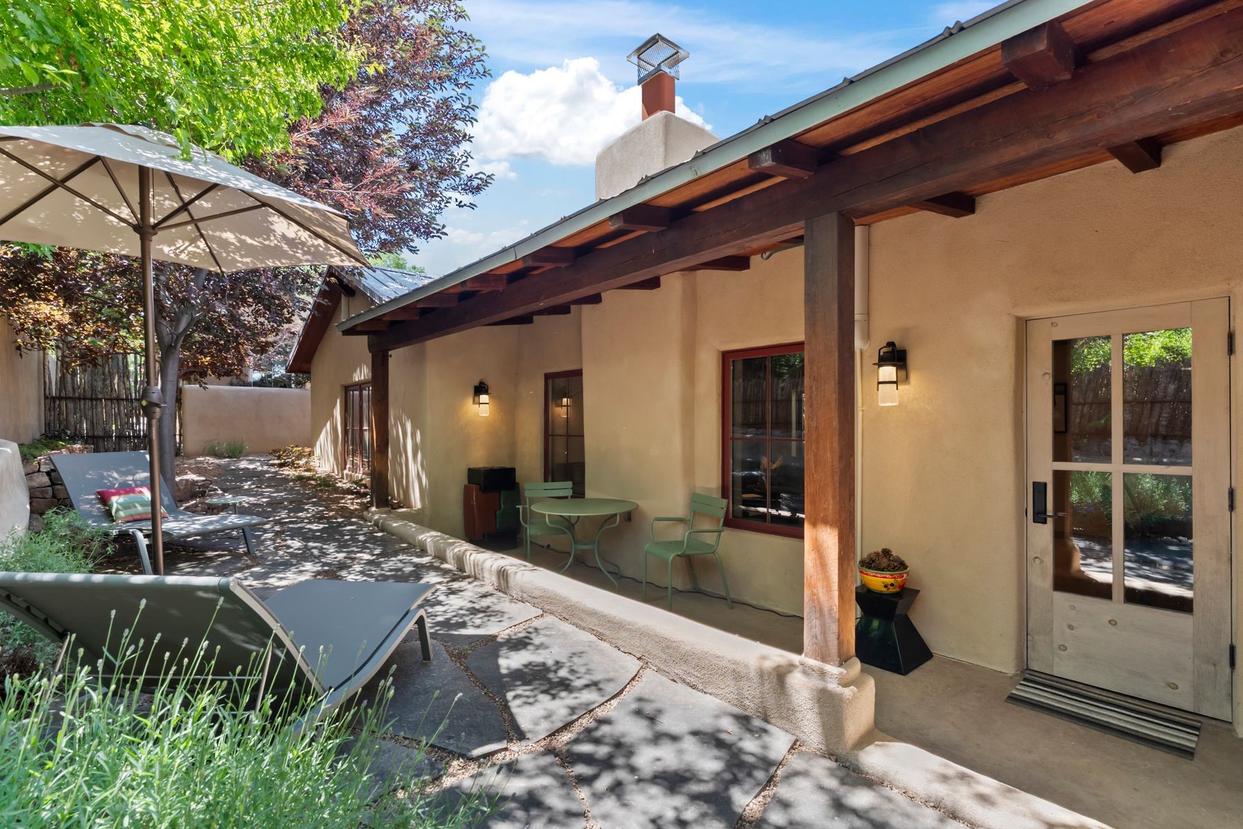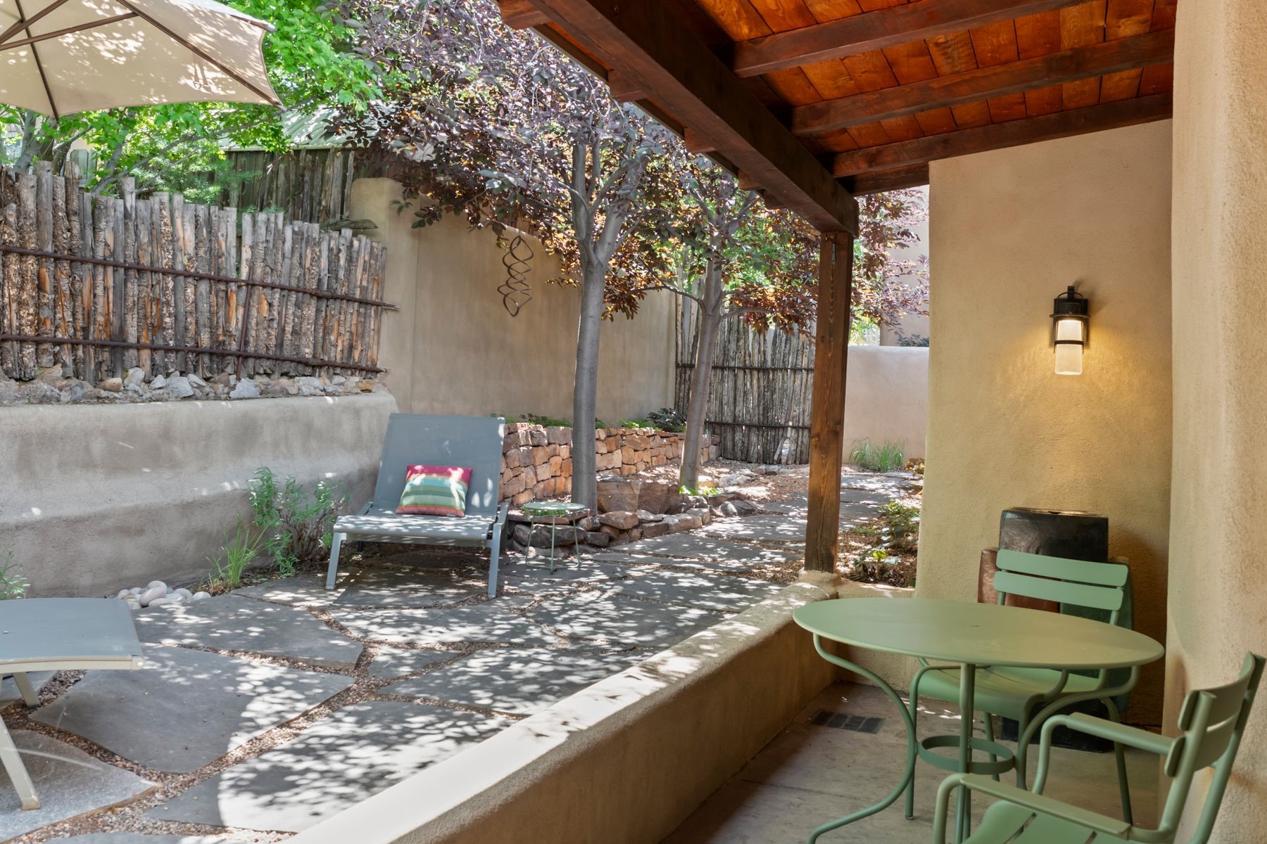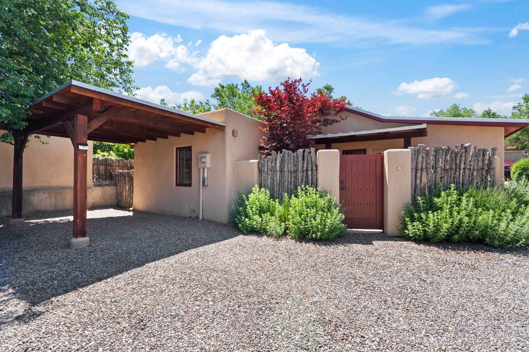 Elegant & Refined, free standing condominium in Pristine, Move-in Condition Eastside Downtown Santa Fe! Built in 2015, this beautiful True North designed Adobe has all of the amenities you desire on the Eastside of Downtown Santa Fe: Northern NM Pitched Roof style, Single level, soaring ceilings with light colored natural wood, plaster walls, and earth toned stained concrete flooring. Two bedrooms are located on either end of the living area: The primary en-suite bedroom is bathed in natural light, with spacious walk in closet, and a full bathroom. The 2nd bedroom is private, located just off the living area and might accommodate family, guests, fitness endeavors, with nearby full bath. The "Great Room" is open and includes a spacious modern kitchen, dining area, and comfortable living space to enjoy quiet evenings in front of the wood burning fireplace. A spacious entry mud room functions as closet and small storage for gear & seasonal items; there is a separate laundry located just off the living room next to a well designed pantry/ bar. The private and fully enclosed back yard allows for intimate gatherings surrounded by native plants and shrubs. All City utilities, Mini Splits for Cooling, in floor radiant heat, contemporary lighting and fixtures. Single car covered carport is attached for private parking; guest parking is available at the entry to this small enclave just off Historic Canyon Rd. A truly Turn Key property located just moments from Canyon Road galleries, restaurants, a park, and Cristo Rey church. Most Furnishings - interior and exterior - may be included with an Acceptable Offer to Purchas-See Remarks.