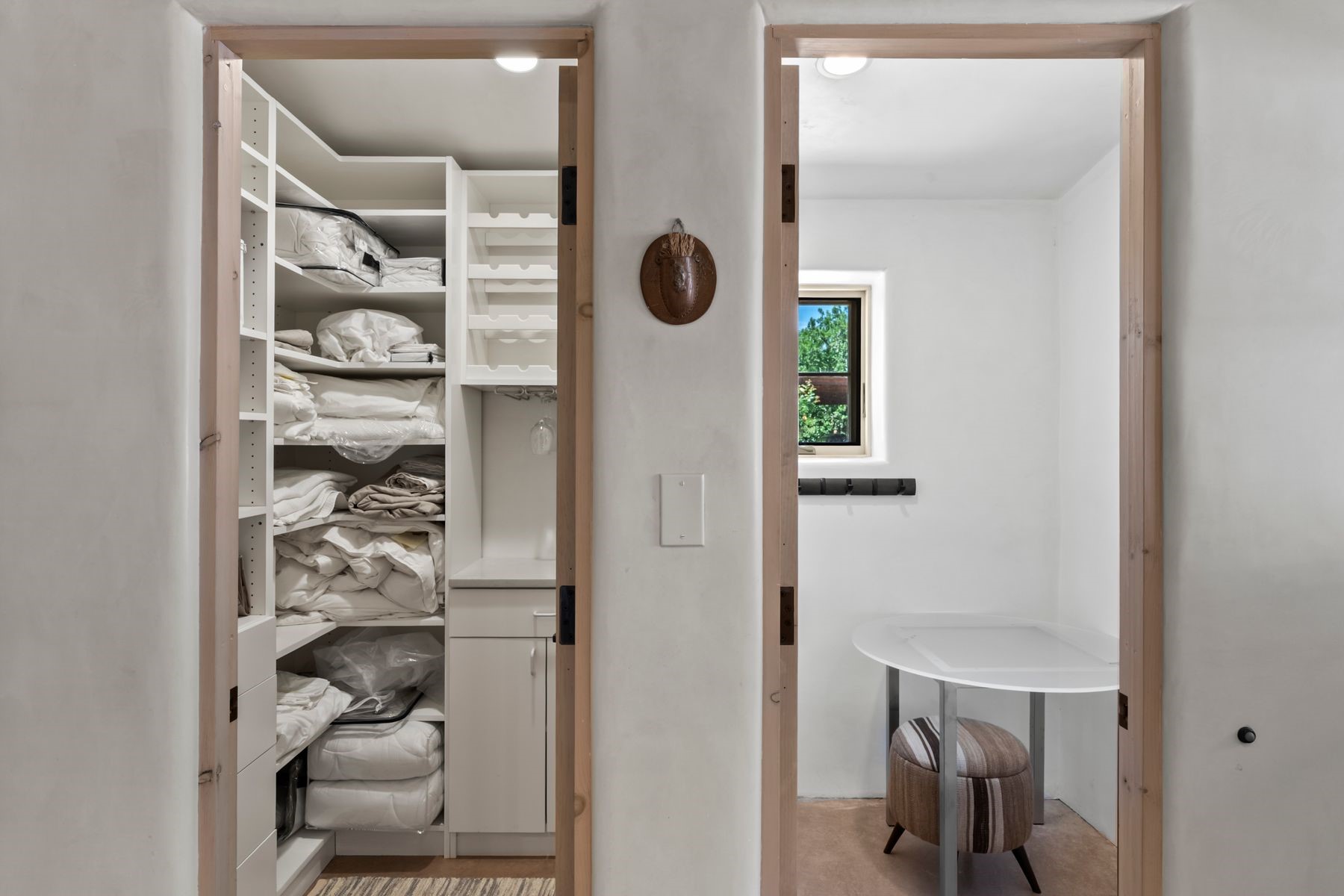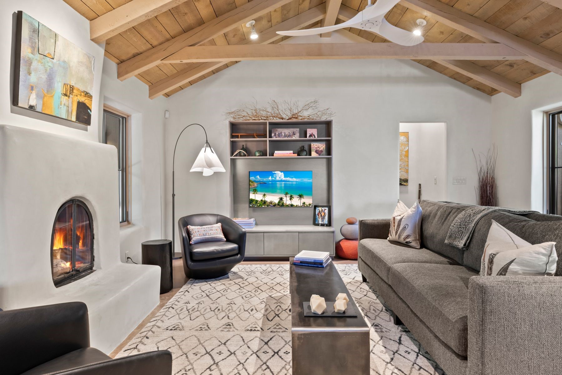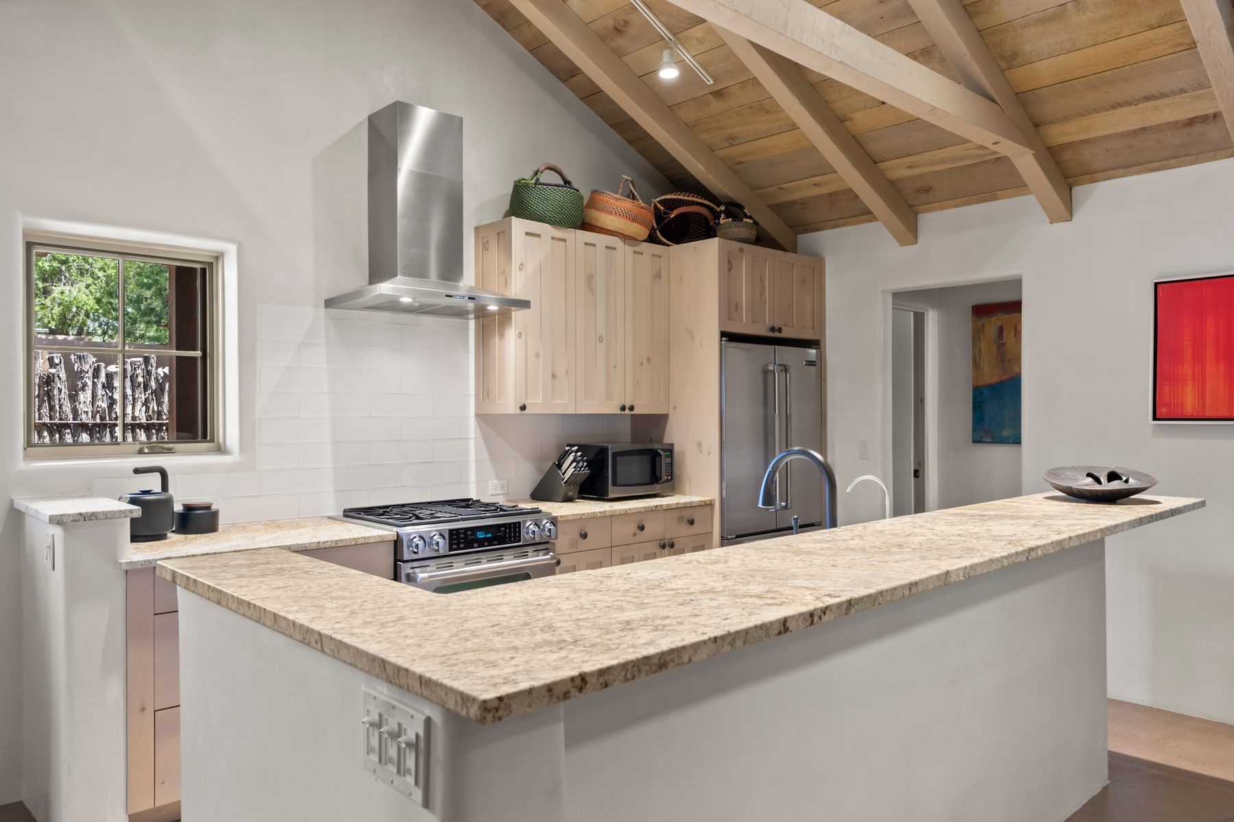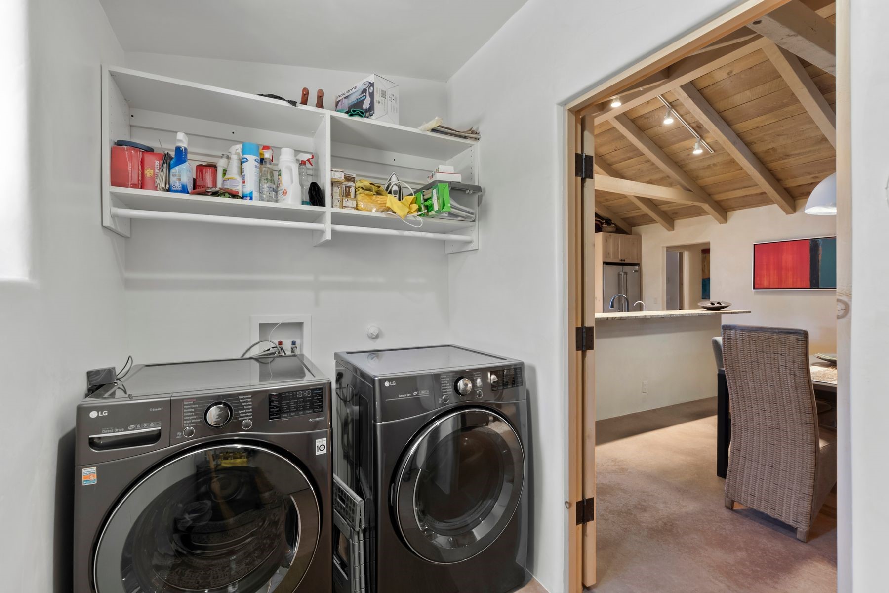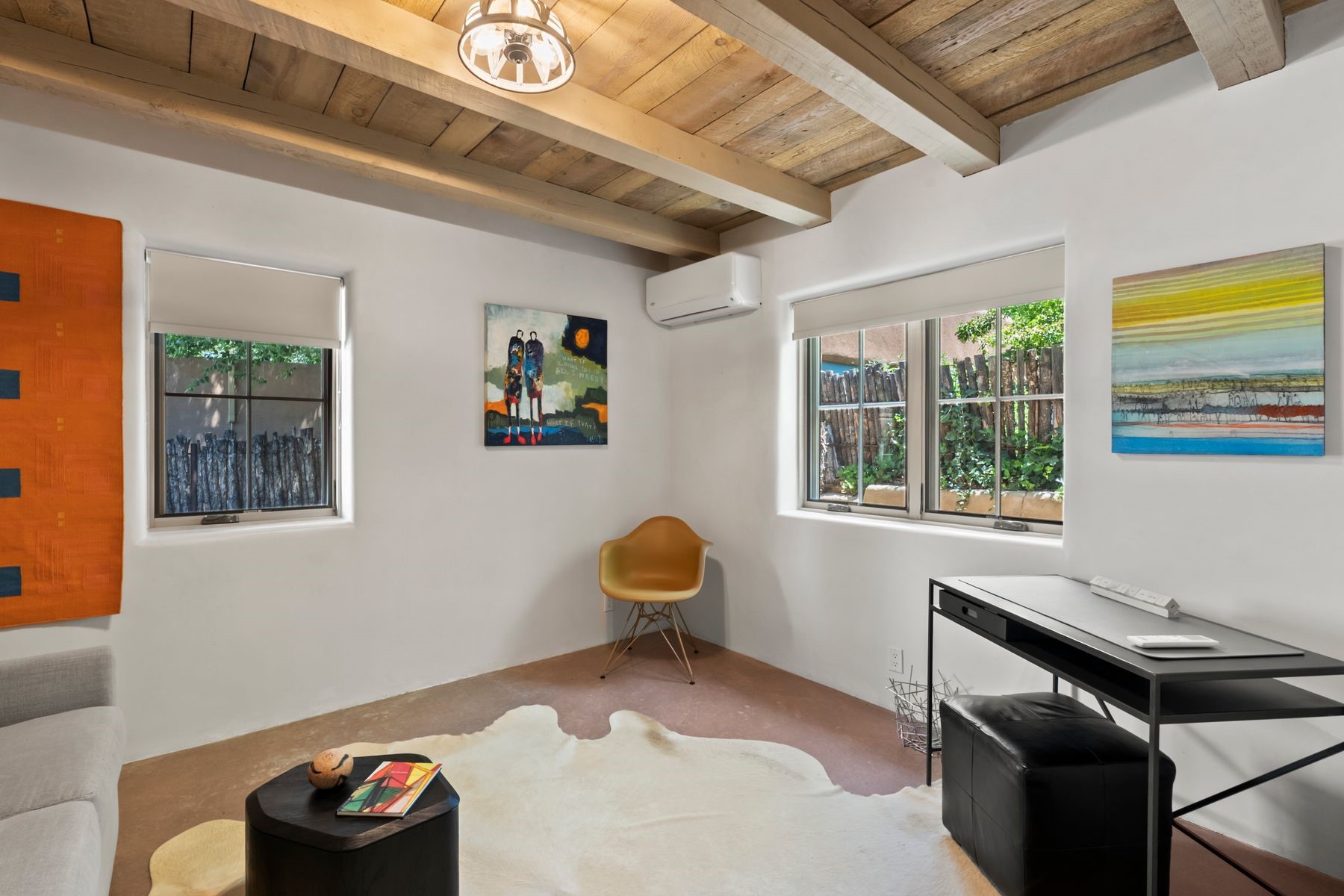 Elegant & Refined, free standing condominium in Pristine, Move-in Condition Eastside Downtown Santa Fe! Built in 2015, this beautiful True North designed Adobe has all of the amenities you desire on the Eastside of Downtown Santa Fe: Northern NM Pitched Roof style, Single level, soaring ceilings with light colored natural wood, plaster walls, and earth toned stained concrete flooring. Two bedrooms are located on either end of the living area: The primary en-suite bedroom is bathed in natural light, with spacious walk in closet, and a full bathroom. The 2nd bedroom is private, located just off the living area and might accommodate family, guests, fitness endeavors, with nearby full bath. The "Great Room" is open and includes a spacious modern kitchen, dining area, and comfortable living space to enjoy quiet evenings in front of the wood burning fireplace. A spacious entry mud room functions as closet and small storage for gear & seasonal items; there is a separate laundry located just off the living room next to a well designed pantry/ bar. The private and fully enclosed back yard allows for intimate gatherings surrounded by native plants and shrubs. All City utilities, Mini Splits for Cooling, in floor radiant heat, contemporary lighting and fixtures. Single car covered carport is attached for private parking; guest parking is available at the entry to this small enclave just off Historic Canyon Rd. A truly Turn Key property located just moments from Canyon Road galleries, restaurants, a park, and Cristo Rey church. Most Furnishings - interior and exterior - may be included with an Acceptable Offer to Purchas-See Remarks.