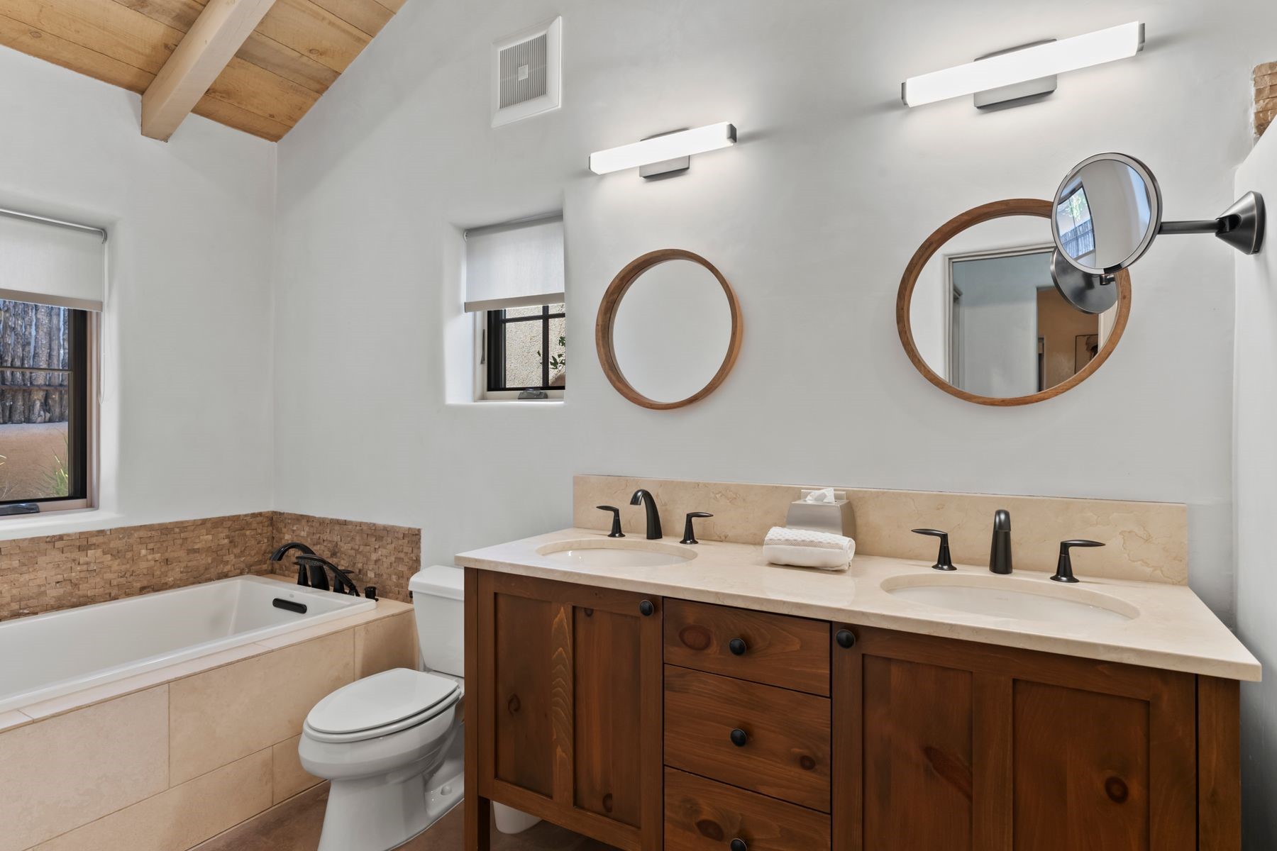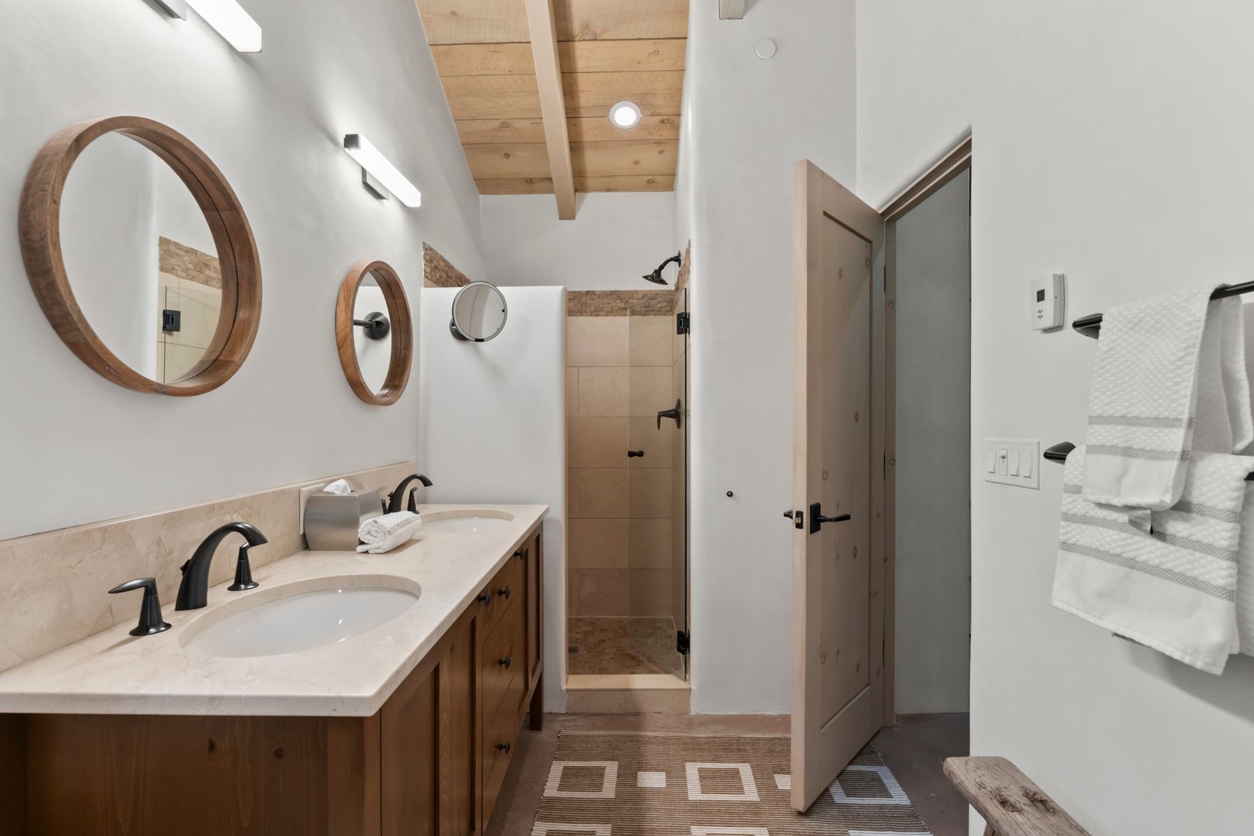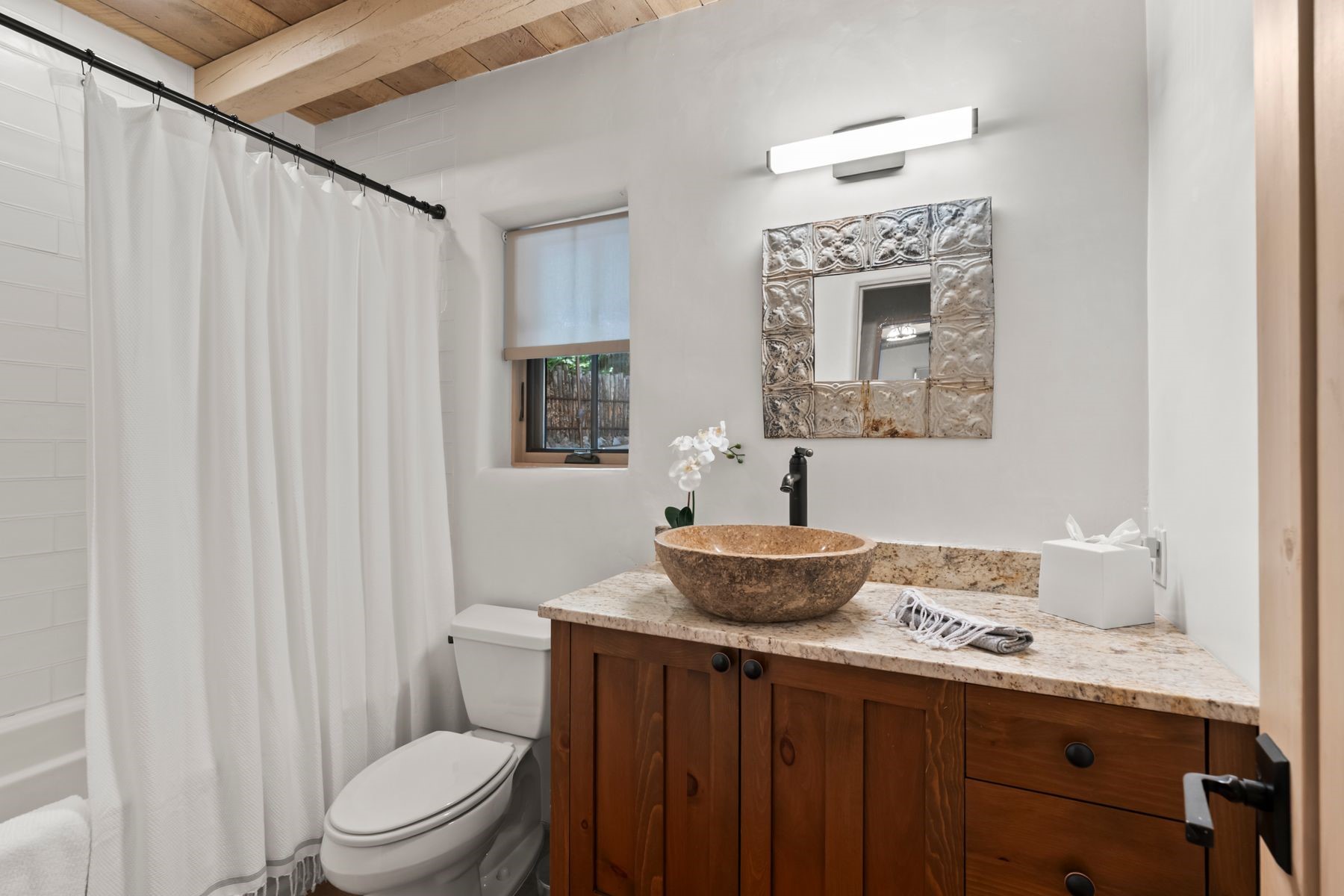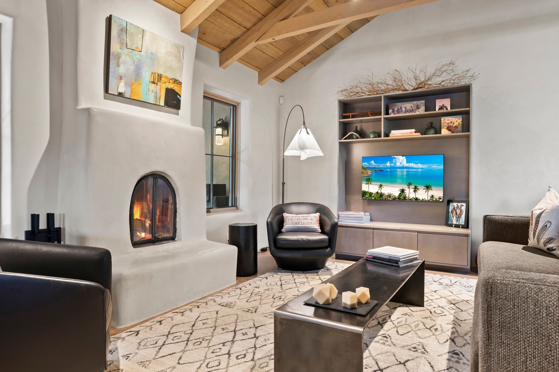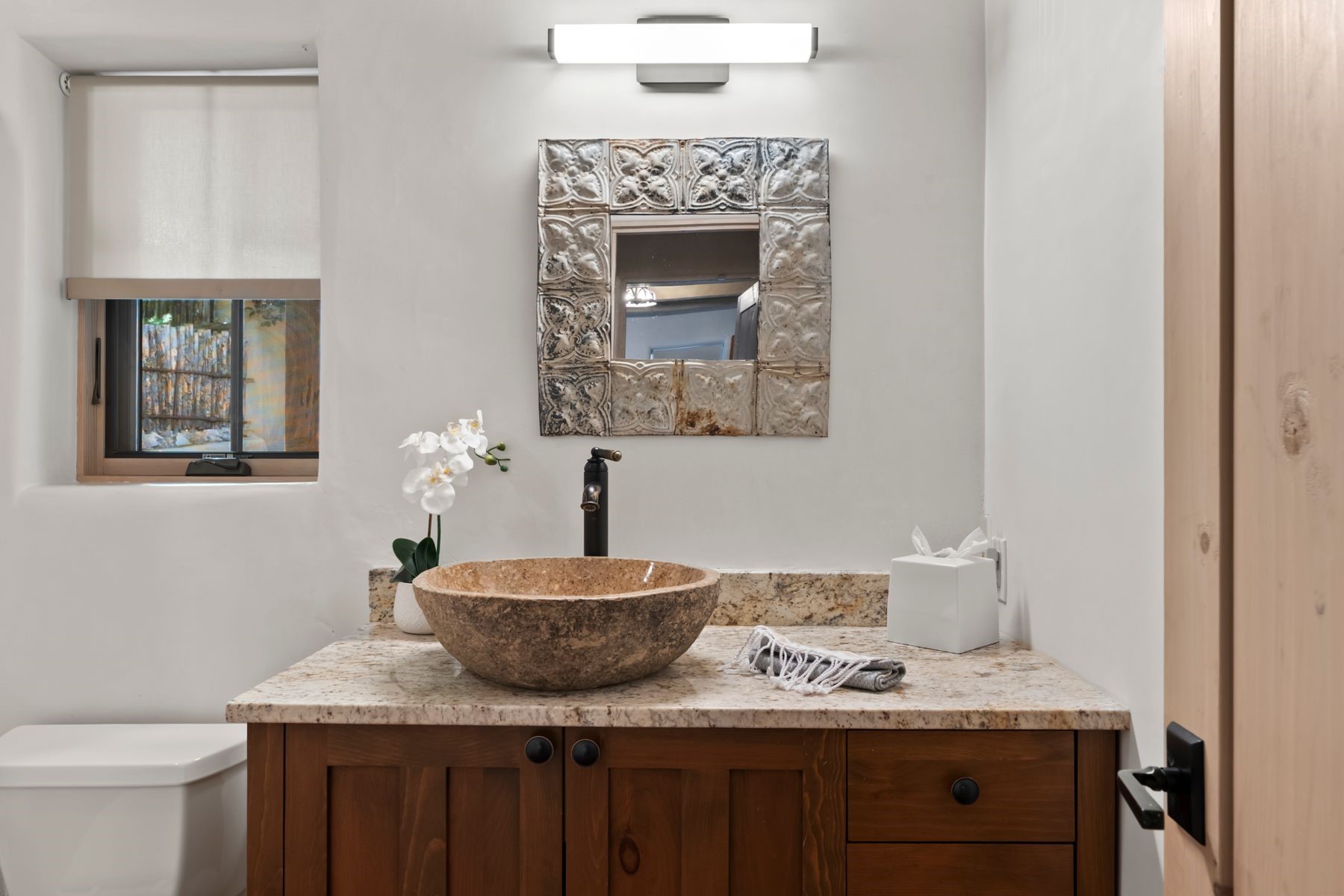 Elegant & Refined, free standing condominium in Pristine, Move-in Condition Eastside Downtown Santa Fe! Built in 2015, this beautiful True North designed Adobe has all of the amenities you desire on the Eastside of Downtown Santa Fe: Northern NM Pitched Roof style, Single level, soaring ceilings with light colored natural wood, plaster walls, and earth toned stained concrete flooring. Two bedrooms are located on either end of the living area: The primary en-suite bedroom is bathed in natural light, with spacious walk in closet, and a full bathroom. The 2nd bedroom is private, located just off the living area and might accommodate family, guests, fitness endeavors, with nearby full bath. The "Great Room" is open and includes a spacious modern kitchen, dining area, and comfortable living space to enjoy quiet evenings in front of the wood burning fireplace. A spacious entry mud room functions as closet and small storage for gear & seasonal items; there is a separate laundry located just off the living room next to a well designed pantry/ bar. The private and fully enclosed back yard allows for intimate gatherings surrounded by native plants and shrubs. All City utilities, Mini Splits for Cooling, in floor radiant heat, contemporary lighting and fixtures. Single car covered carport is attached for private parking; guest parking is available at the entry to this small enclave just off Historic Canyon Rd. A truly Turn Key property located just moments from Canyon Road galleries, restaurants, a park, and Cristo Rey church. Most Furnishings - interior and exterior - may be included with an Acceptable Offer to Purchas-See Remarks.