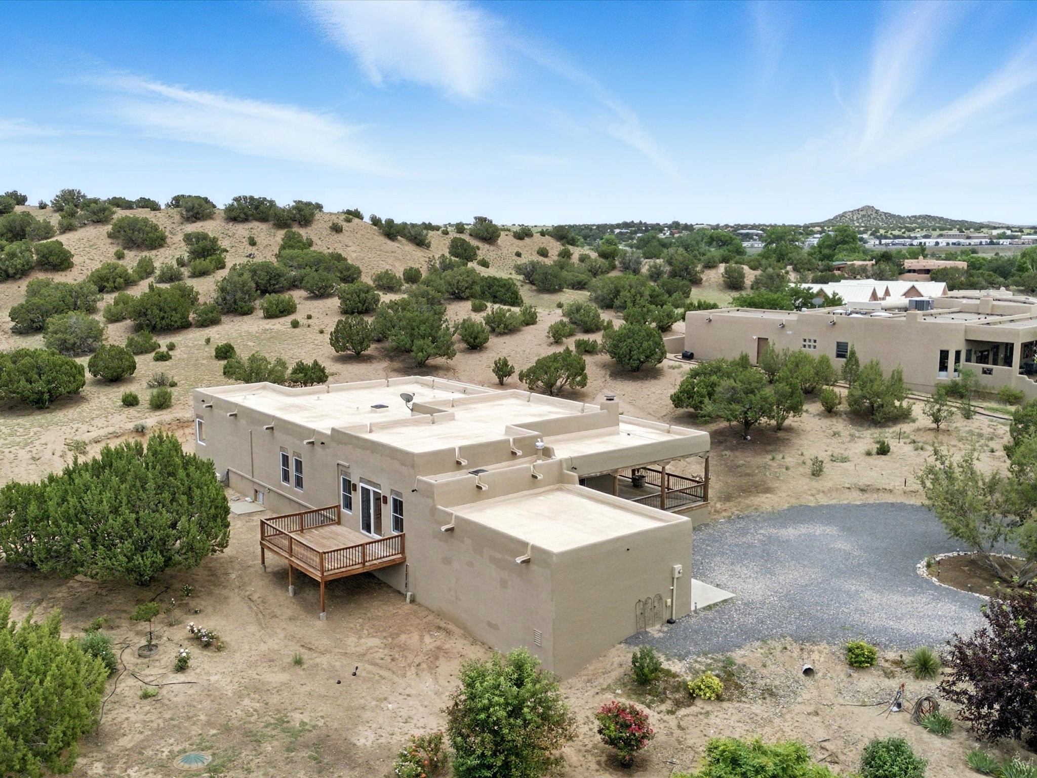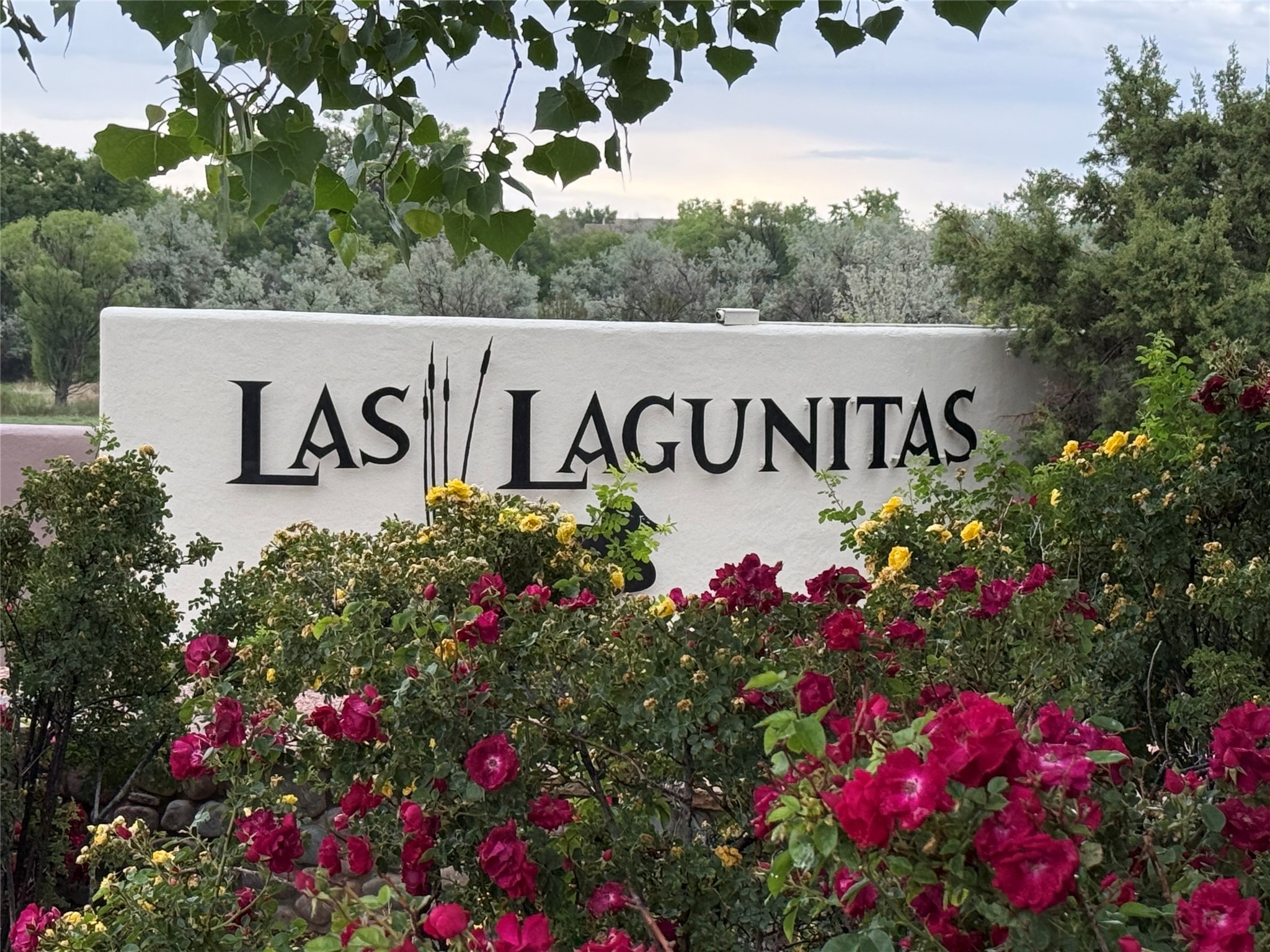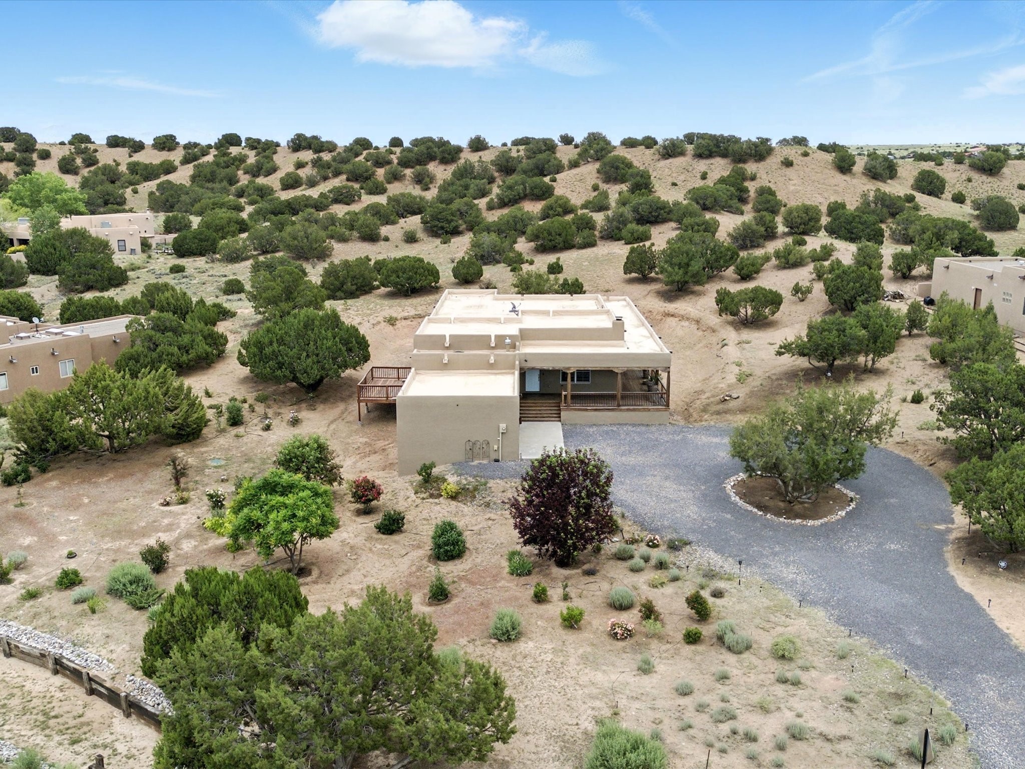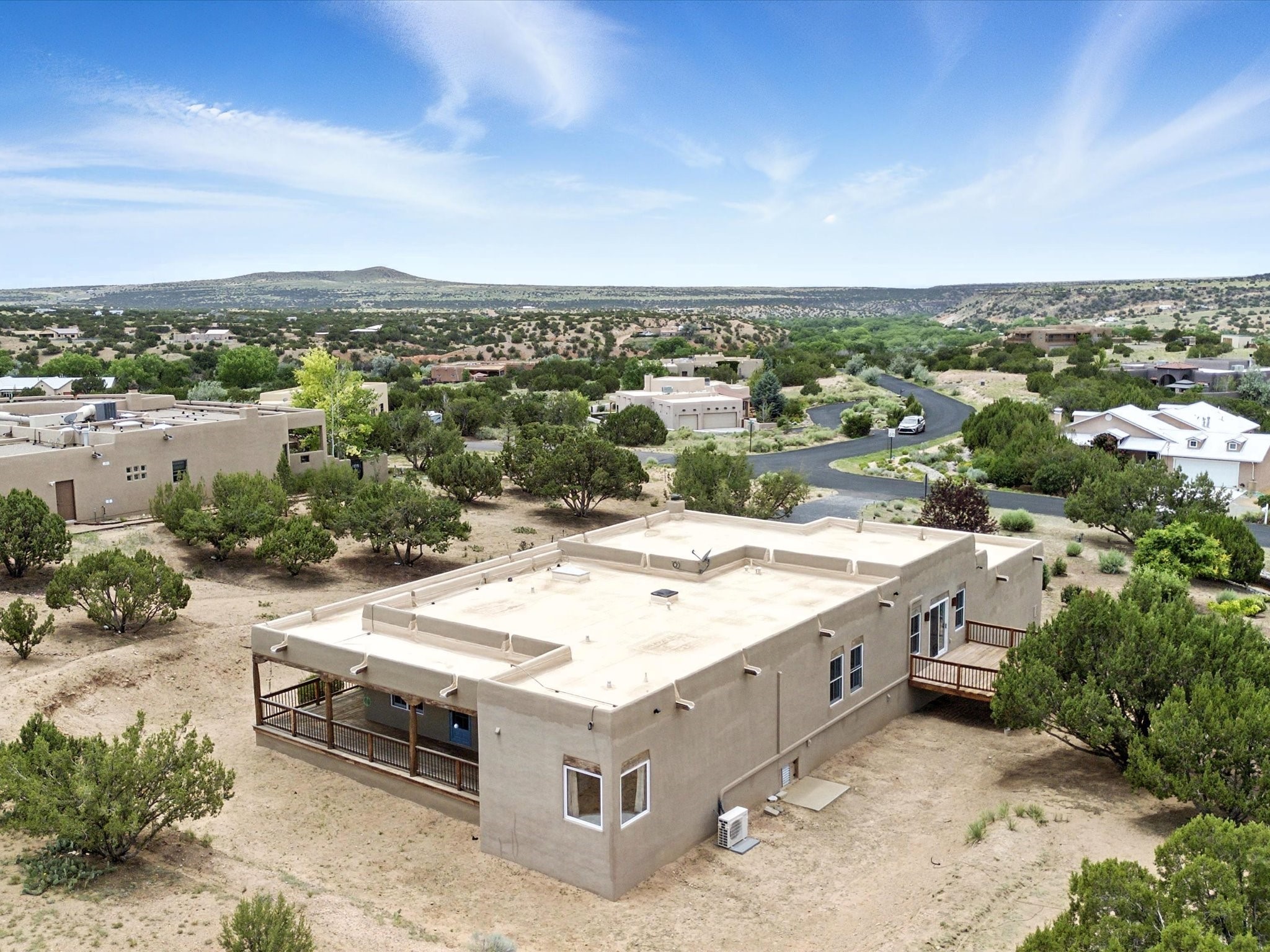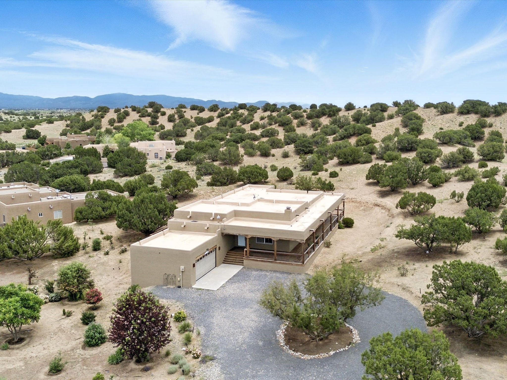 Experience Southwestern charm, stunning landscapes, and unmatched tranquility nestled in the sought-after Las Lagunitas community. This thoughtfully designed 4-bedroom, 2.5-bath custom home sits on 1.26 acres of beautifully landscaped property, featuring vibrant roses, lilacs, butterfly bushes, and mature trees that bloom until the first frost. Step inside to an open-concept layout filled with warmth and character, from natural wood vigas throughout to custom barrel ceilings in the chef's kitchen which features rich custom cabinetry, double ovens, a pantry, and beautiful built-in nichos. The spacious master suite boasts a luxurious soaking tub with peaceful mountain views, a massive walk-in closet, and direct access to the expansive wrap around patio.Three additional bedrooms, including a versatile 4th bedroom/den provide flexibility and function with abundant storage including a generously sized garage with full shelving and a circular driveway for ample parking. Outdoors, choose between the open-air deck or the covered patio, offering panoramic views of mesas, mountains, hills, and those unforgettable Santa Fe sunsets painted in turquoise, pink, and gold. Nature lovers will adore the visits from hummingbirds, roadrunners, robins, and playful rabbits. Las Lagunitas offers quiet, secure living with gated entry, natural walking trails, a picturesque gazebo & pond, and a true sense of community. Homes are thoughtfully spaced for privacy while maintaining a welcoming neighborhood feel. Location Perks: Commuters will love the easy access to I-25 and the Frontage Road, making travel to Los Alamos National Laboratory, downtown Santa Fe, and Albuquerque fast and efficient--ideal for lab employees or anyone seeking peace without sacrificing proximity.