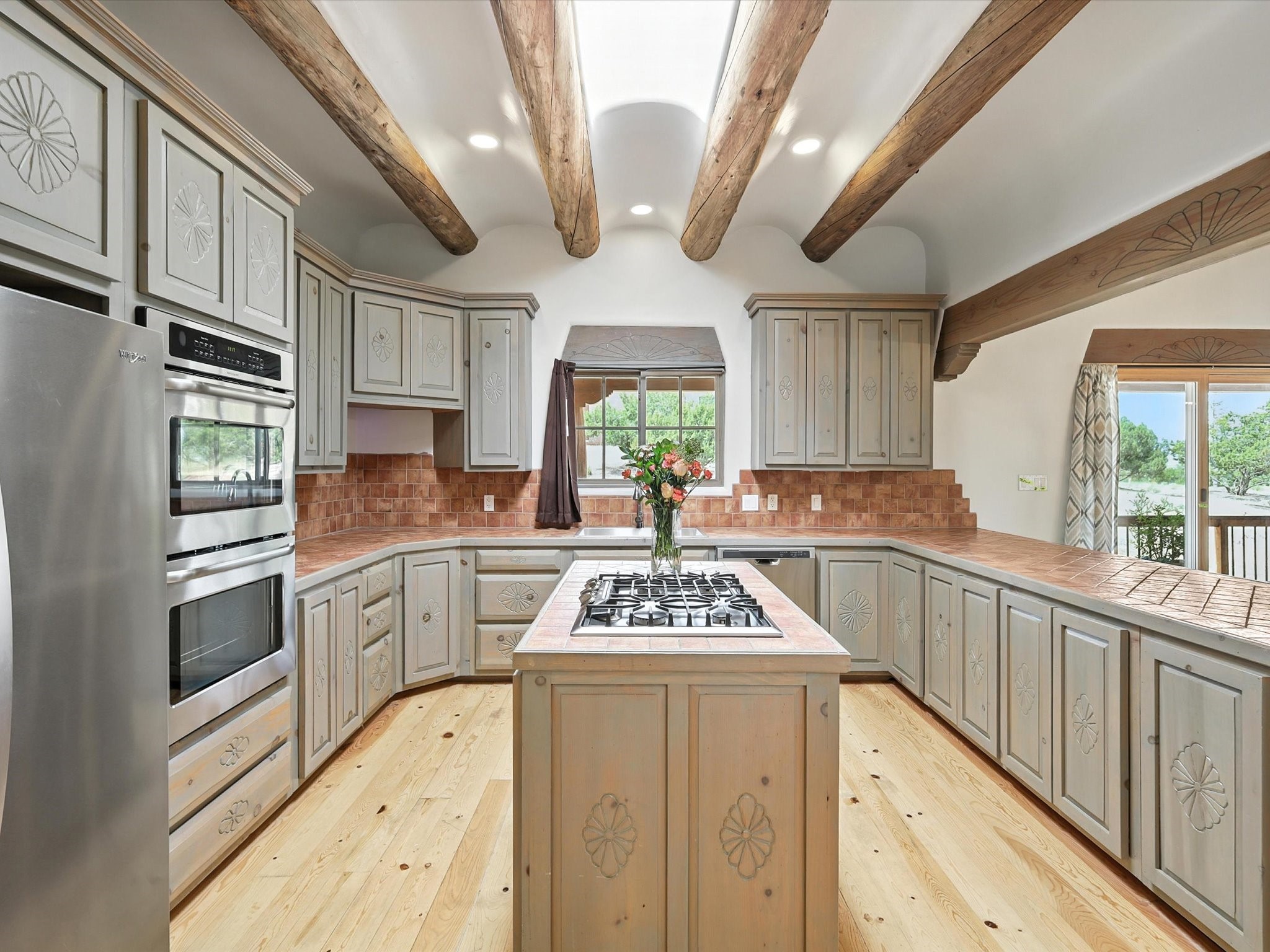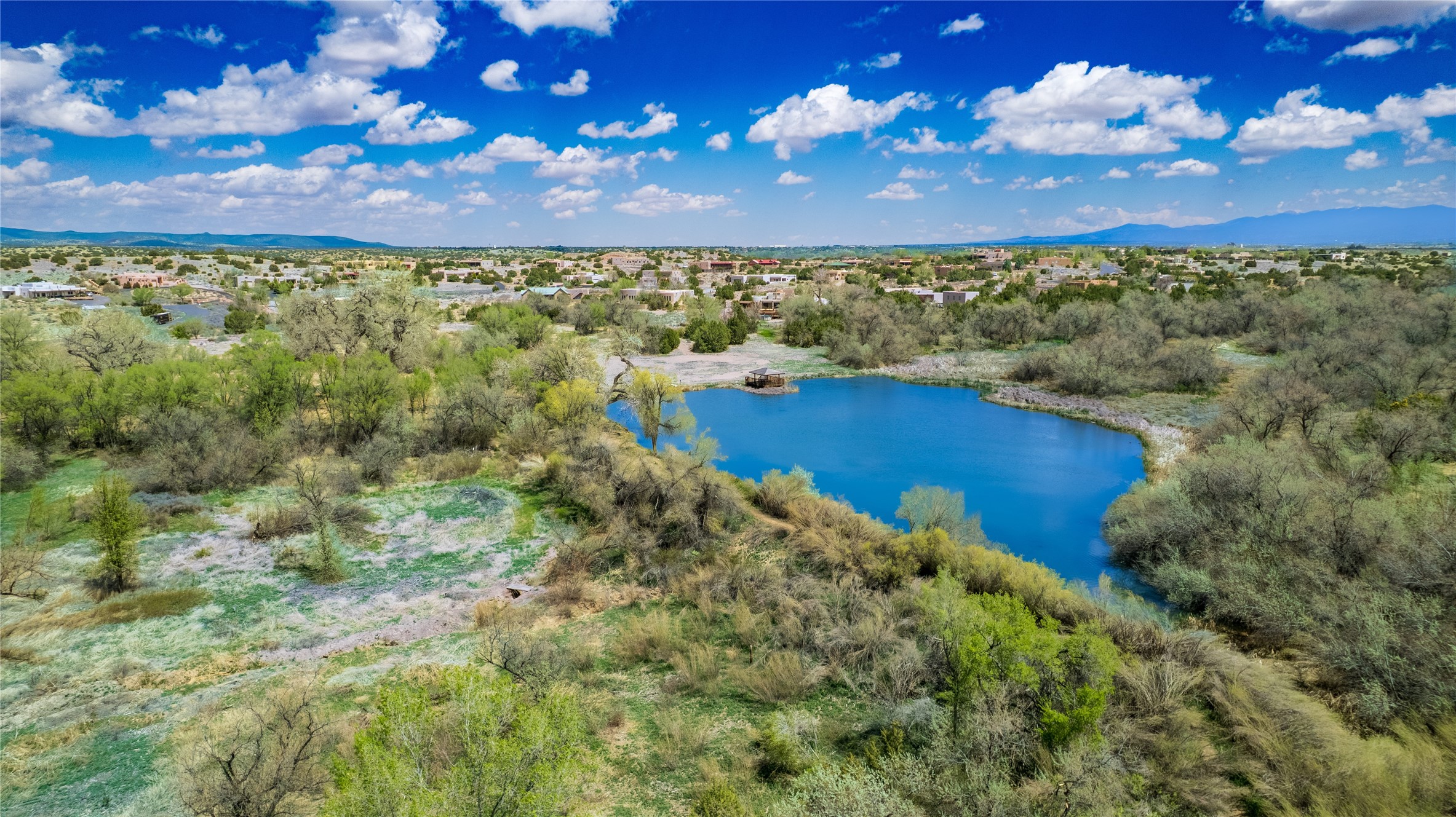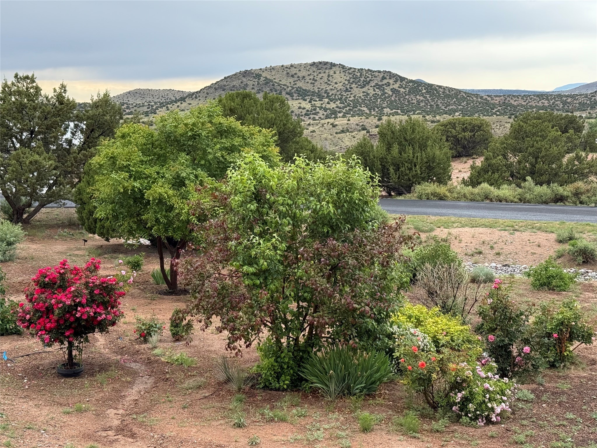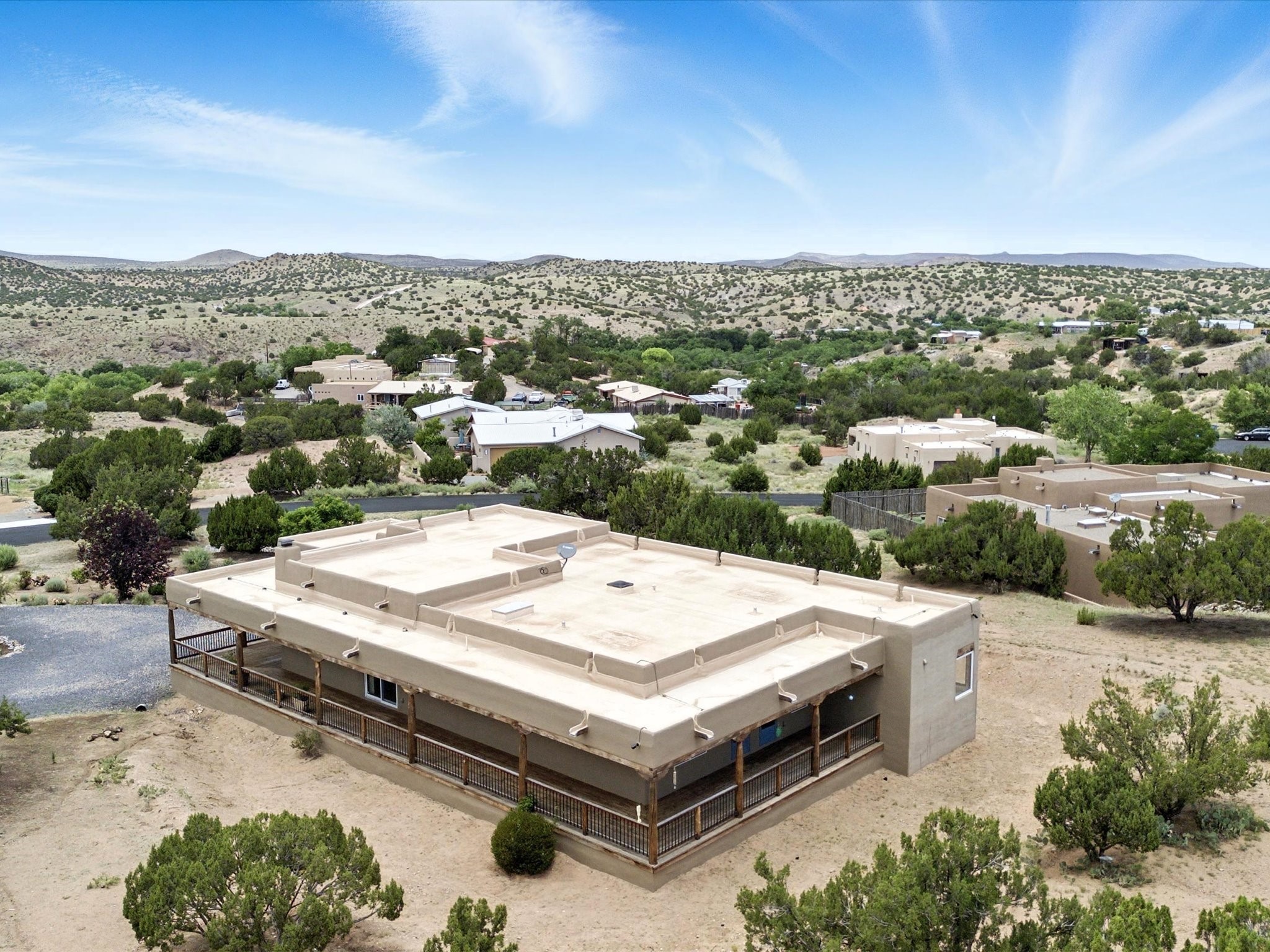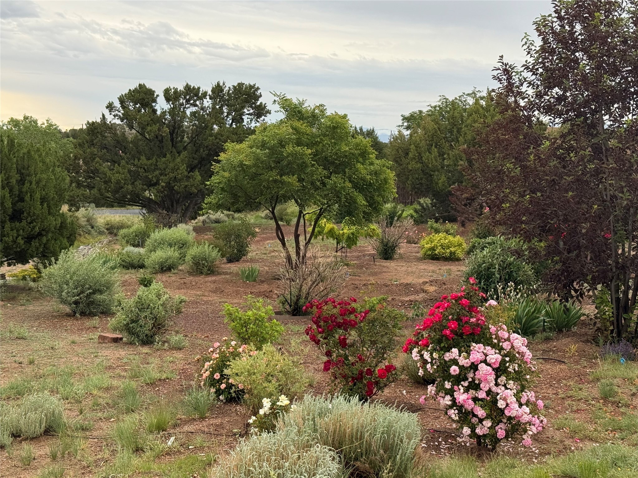 Experience Southwestern charm, stunning landscapes, and unmatched tranquility nestled in the sought-after Las Lagunitas community. This thoughtfully designed 4-bedroom, 2.5-bath custom home sits on 1.26 acres of beautifully landscaped property, featuring vibrant roses, lilacs, butterfly bushes, and mature trees that bloom until the first frost. Step inside to an open-concept layout filled with warmth and character, from natural wood vigas throughout to custom barrel ceilings in the chef's kitchen which features rich custom cabinetry, double ovens, a pantry, and beautiful built-in nichos. The spacious master suite boasts a luxurious soaking tub with peaceful mountain views, a massive walk-in closet, and direct access to the expansive wrap around patio.Three additional bedrooms, including a versatile 4th bedroom/den provide flexibility and function with abundant storage including a generously sized garage with full shelving and a circular driveway for ample parking. Outdoors, choose between the open-air deck or the covered patio, offering panoramic views of mesas, mountains, hills, and those unforgettable Santa Fe sunsets painted in turquoise, pink, and gold. Nature lovers will adore the visits from hummingbirds, roadrunners, robins, and playful rabbits. Las Lagunitas offers quiet, secure living with gated entry, natural walking trails, a picturesque gazebo & pond, and a true sense of community. Homes are thoughtfully spaced for privacy while maintaining a welcoming neighborhood feel. Location Perks: Commuters will love the easy access to I-25 and the Frontage Road, making travel to Los Alamos National Laboratory, downtown Santa Fe, and Albuquerque fast and efficient--ideal for lab employees or anyone seeking peace without sacrificing proximity.