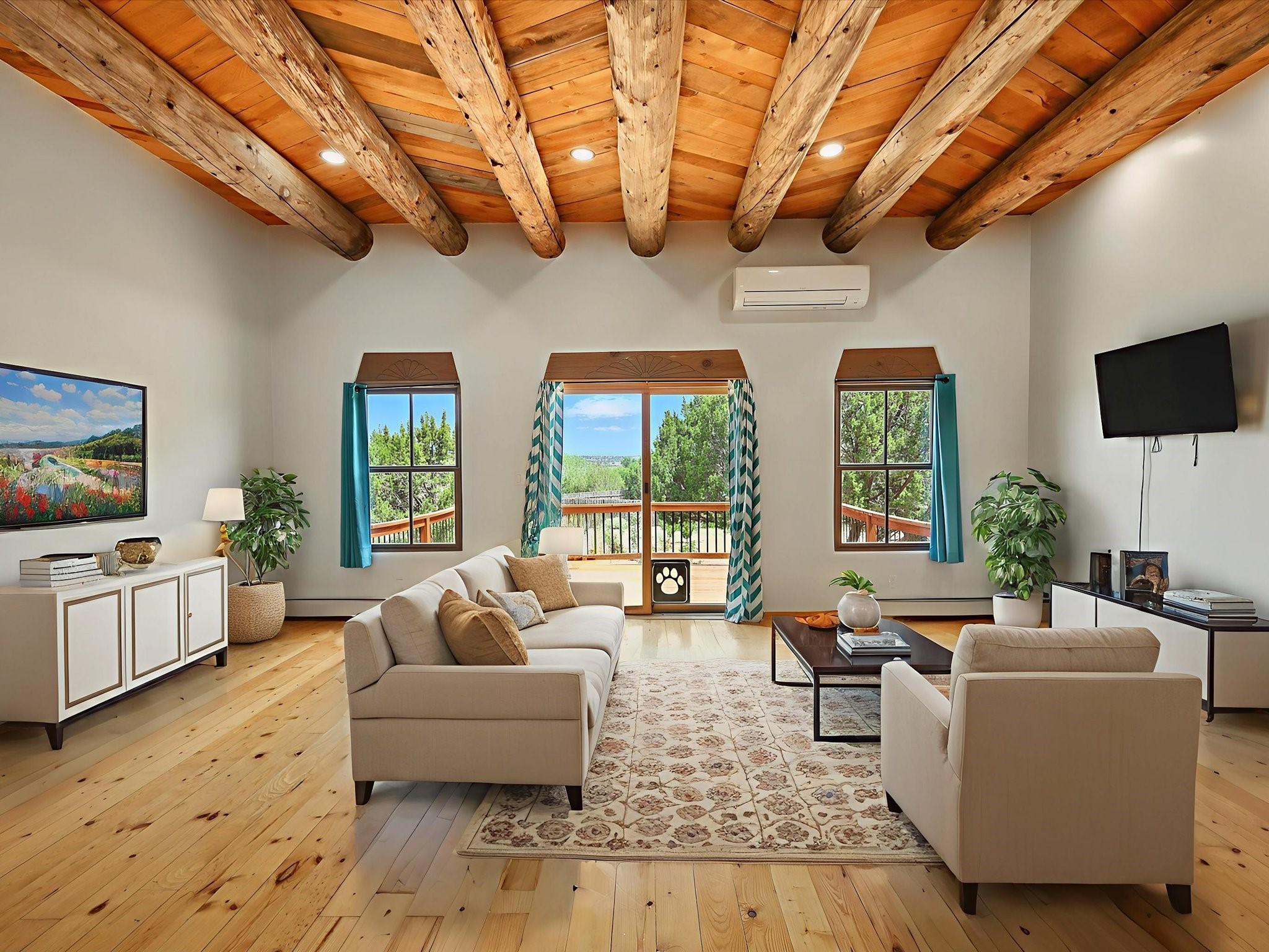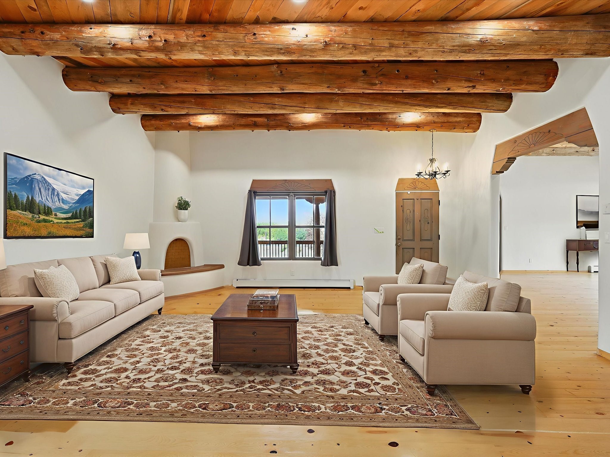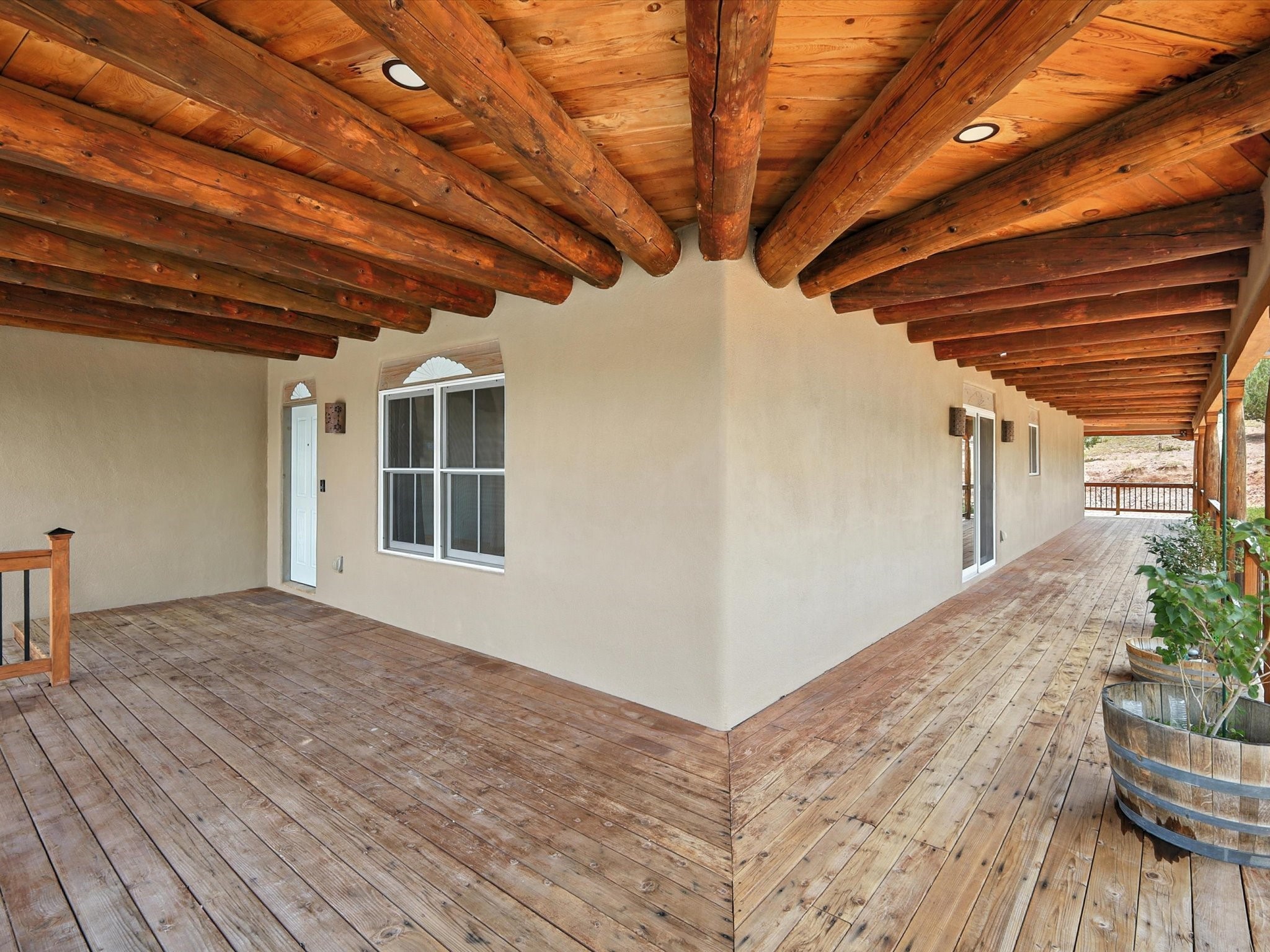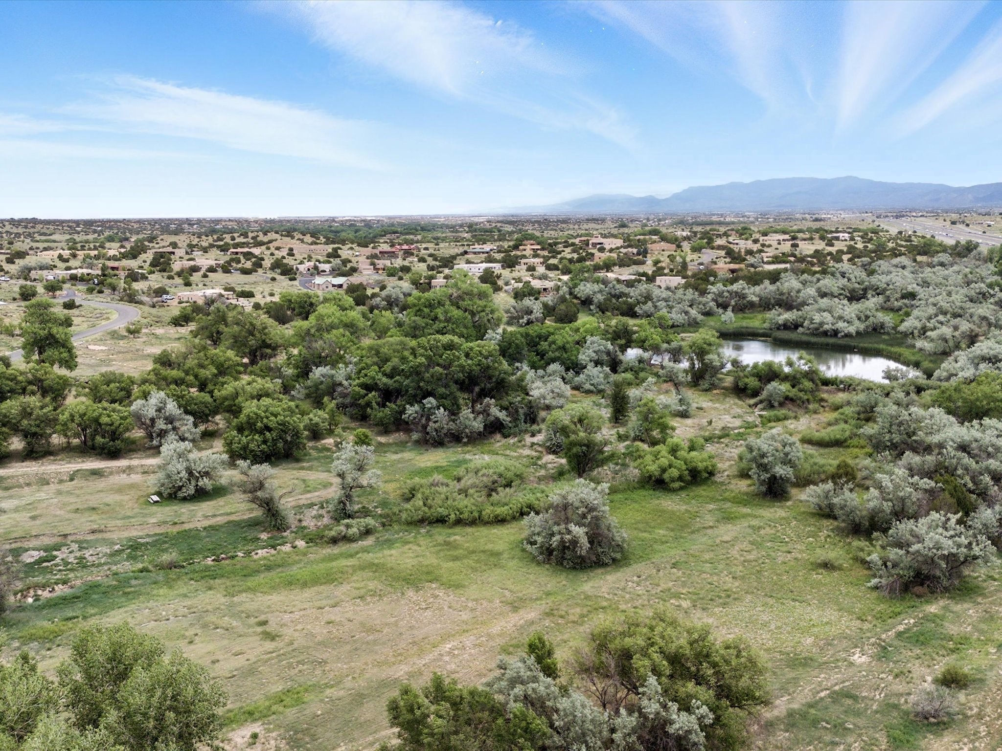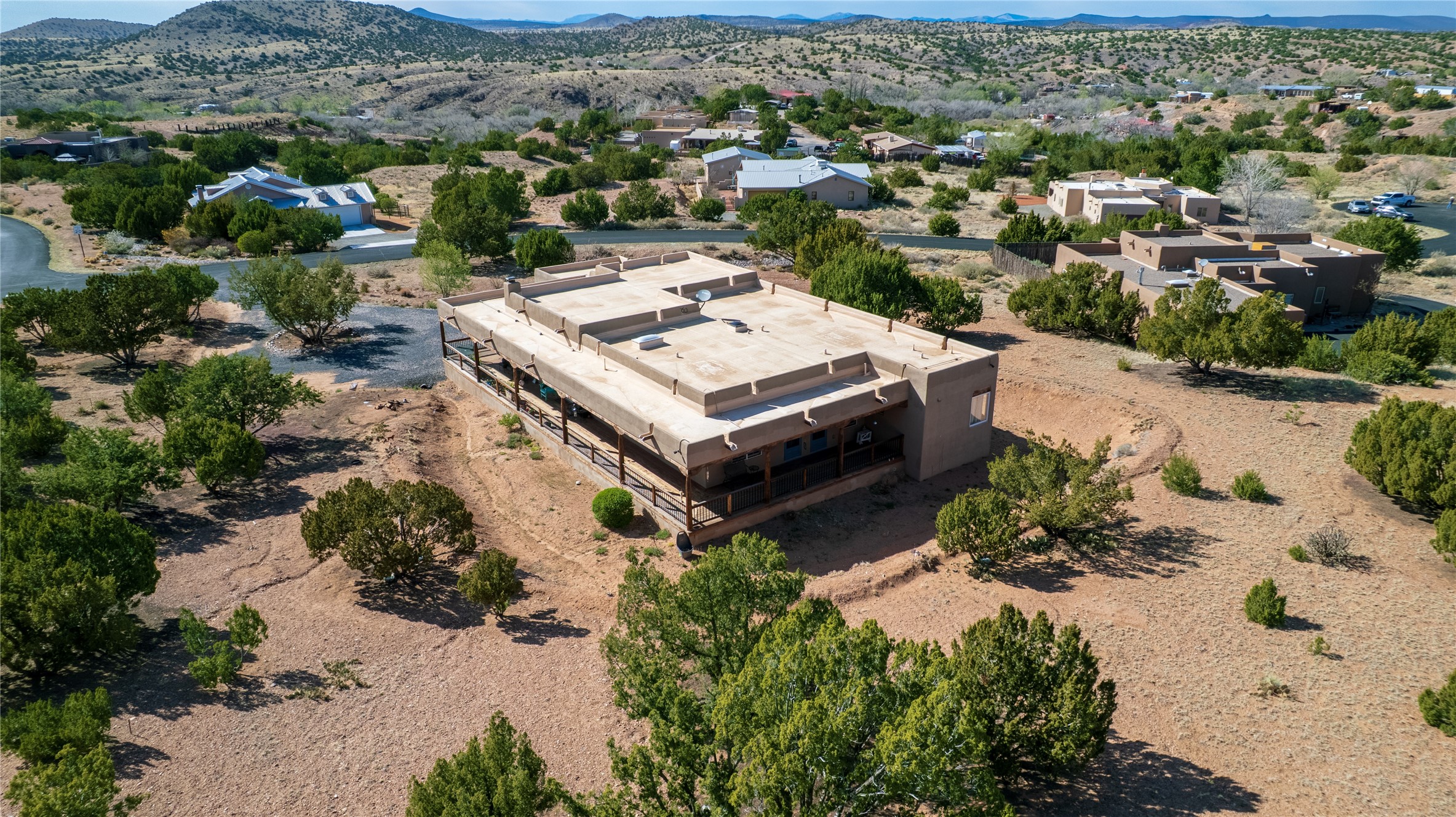 Experience Southwestern charm, stunning landscapes, and unmatched tranquility nestled in the sought-after Las Lagunitas community. This thoughtfully designed 4-bedroom, 2.5-bath custom home sits on 1.26 acres of beautifully landscaped property, featuring vibrant roses, lilacs, butterfly bushes, and mature trees that bloom until the first frost. Step inside to an open-concept layout filled with warmth and character, from natural wood vigas throughout to custom barrel ceilings in the chef's kitchen which features rich custom cabinetry, double ovens, a pantry, and beautiful built-in nichos. The spacious master suite boasts a luxurious soaking tub with peaceful mountain views, a massive walk-in closet, and direct access to the expansive wrap around patio.Three additional bedrooms, including a versatile 4th bedroom/den provide flexibility and function with abundant storage including a generously sized garage with full shelving and a circular driveway for ample parking. Outdoors, choose between the open-air deck or the covered patio, offering panoramic views of mesas, mountains, hills, and those unforgettable Santa Fe sunsets painted in turquoise, pink, and gold. Nature lovers will adore the visits from hummingbirds, roadrunners, robins, and playful rabbits. Las Lagunitas offers quiet, secure living with gated entry, natural walking trails, a picturesque gazebo & pond, and a true sense of community. Homes are thoughtfully spaced for privacy while maintaining a welcoming neighborhood feel. Location Perks: Commuters will love the easy access to I-25 and the Frontage Road, making travel to Los Alamos National Laboratory, downtown Santa Fe, and Albuquerque fast and efficient--ideal for lab employees or anyone seeking peace without sacrificing proximity.