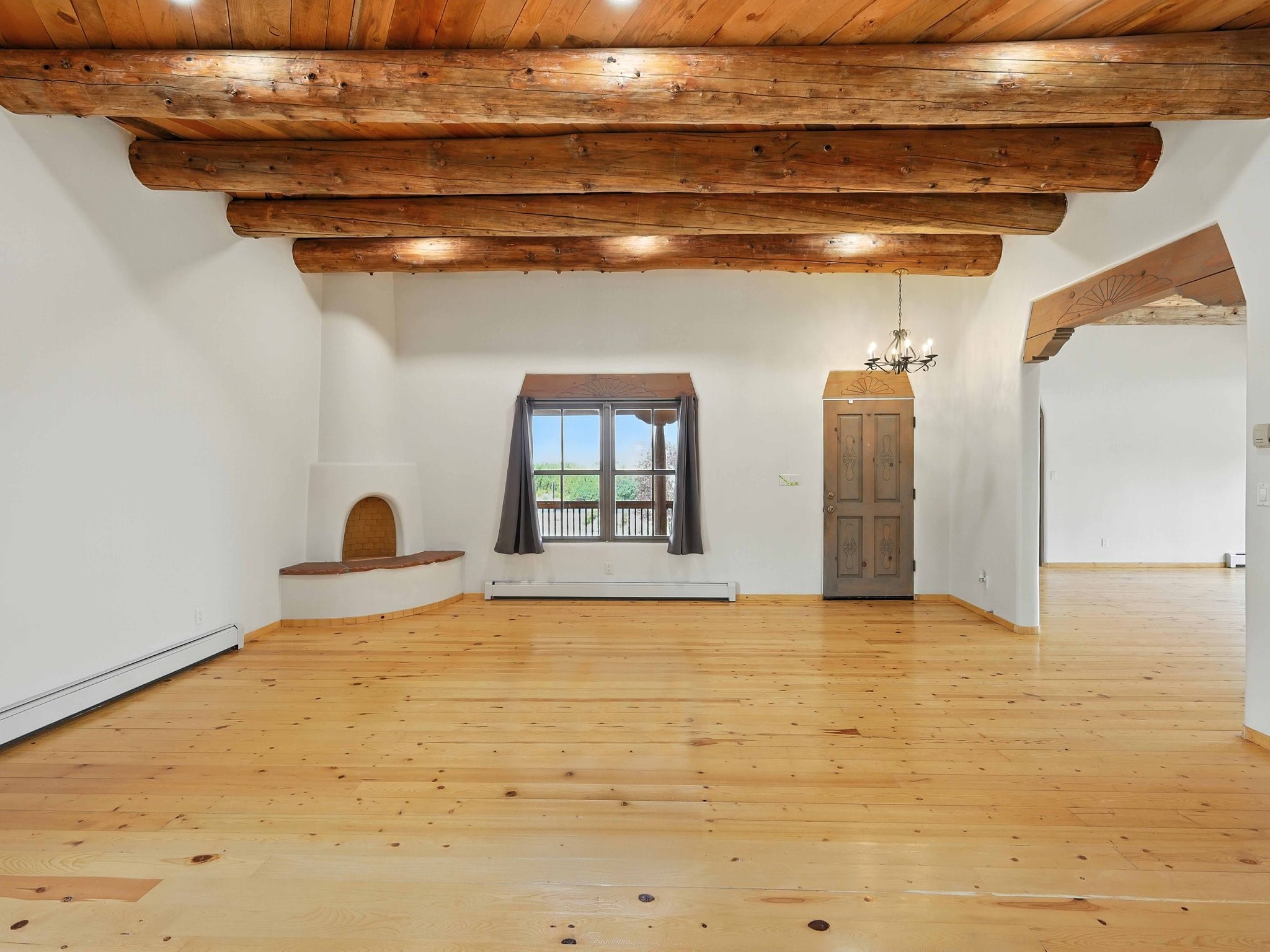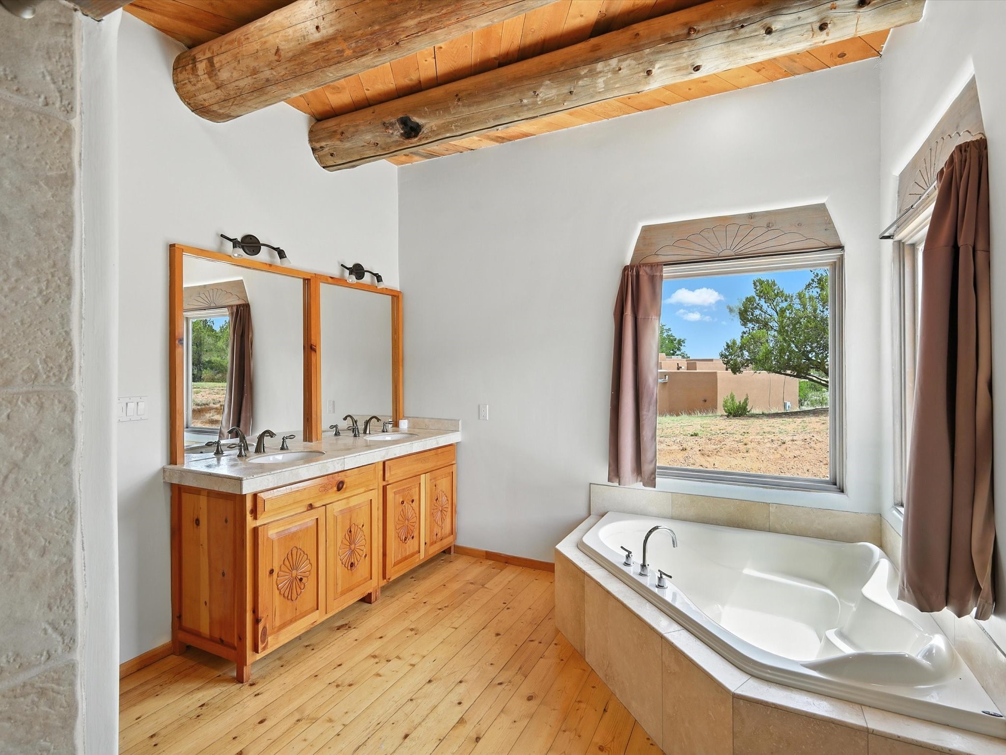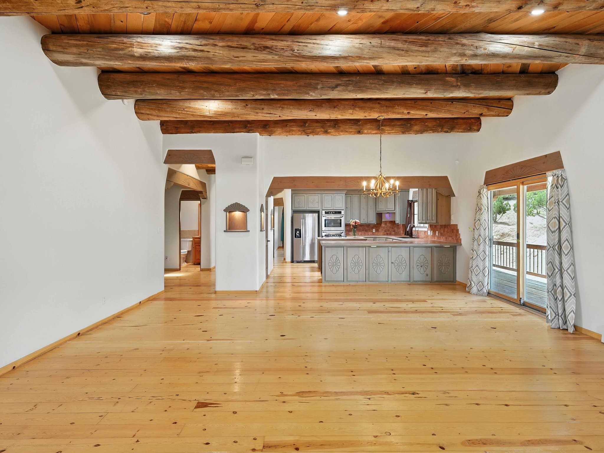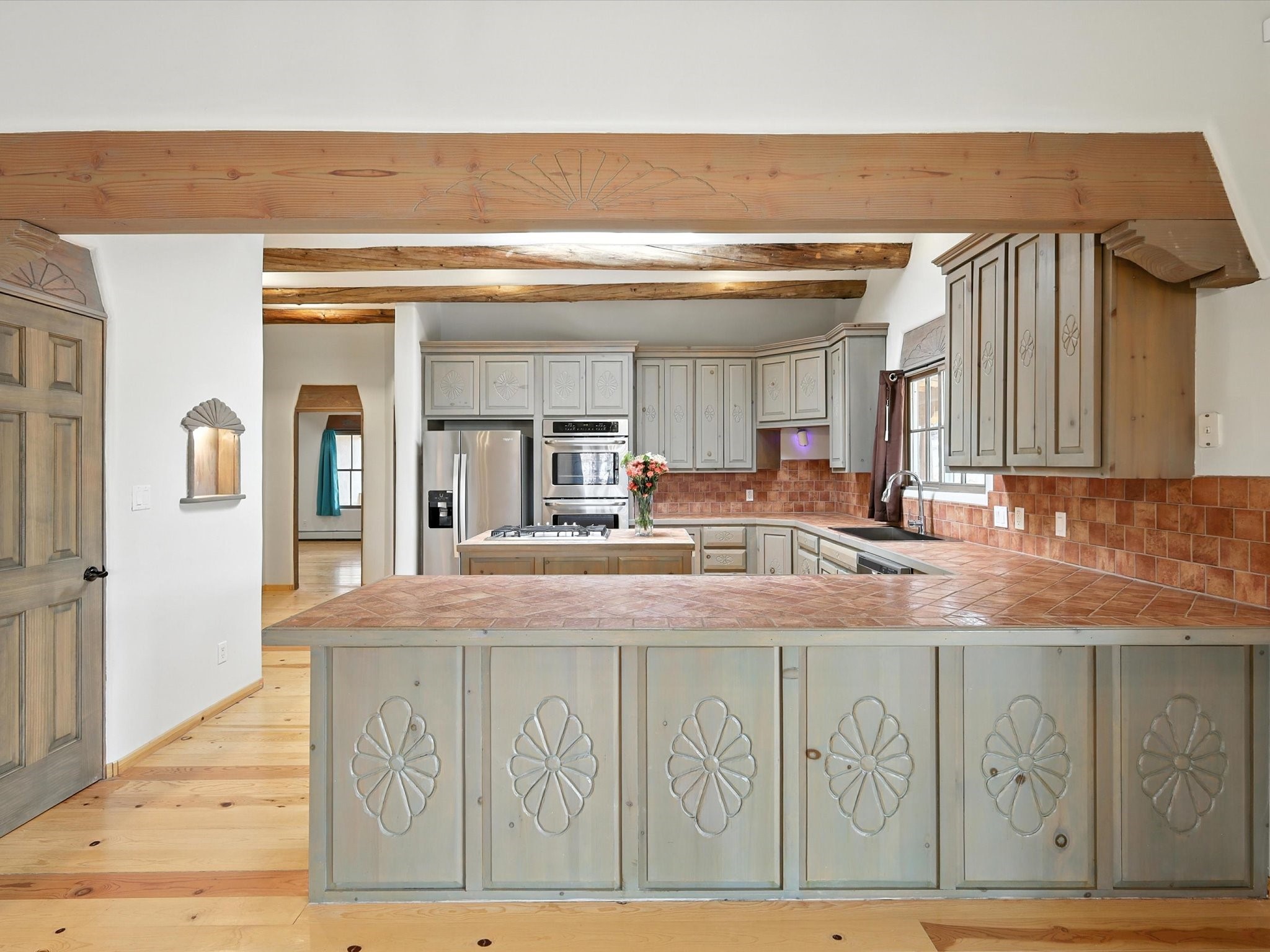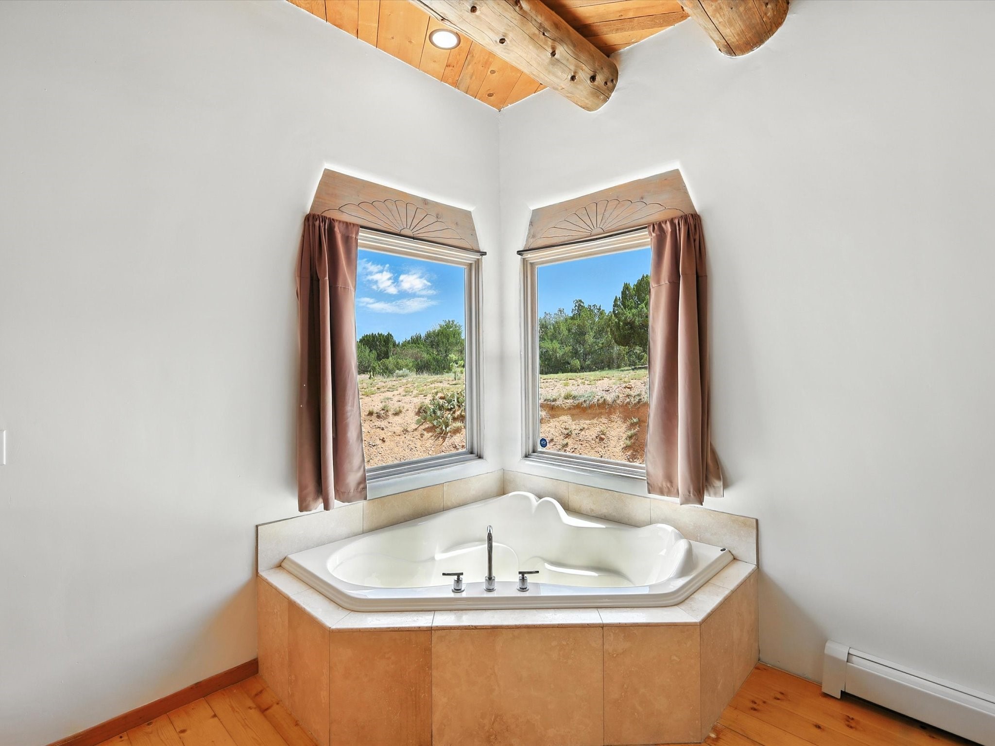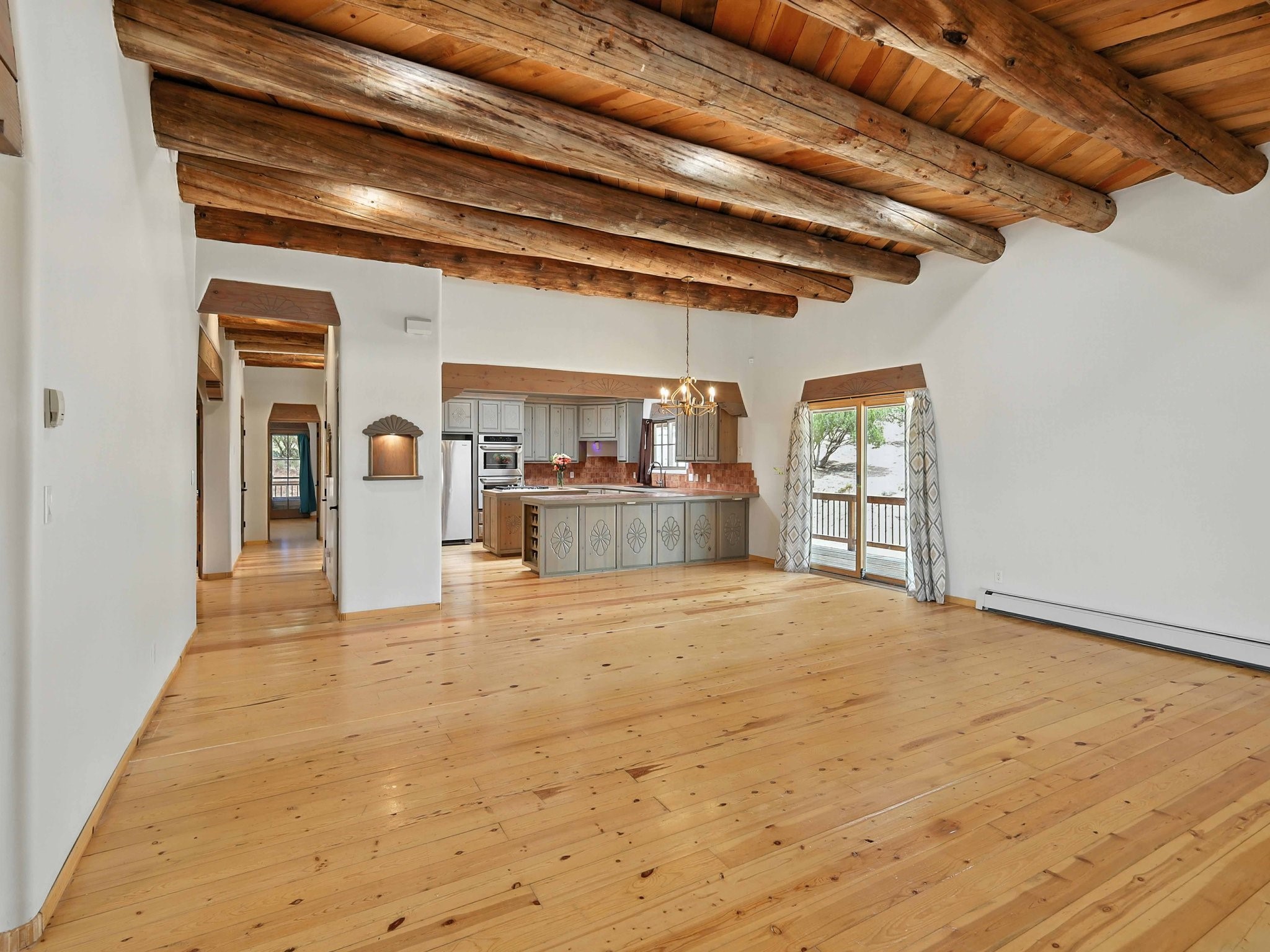 Experience Southwestern charm, stunning landscapes, and unmatched tranquility nestled in the sought-after Las Lagunitas community. This thoughtfully designed 4-bedroom, 2.5-bath custom home sits on 1.26 acres of beautifully landscaped property, featuring vibrant roses, lilacs, butterfly bushes, and mature trees that bloom until the first frost. Step inside to an open-concept layout filled with warmth and character, from natural wood vigas throughout to custom barrel ceilings in the chef's kitchen which features rich custom cabinetry, double ovens, a pantry, and beautiful built-in nichos. The spacious master suite boasts a luxurious soaking tub with peaceful mountain views, a massive walk-in closet, and direct access to the expansive wrap around patio.Three additional bedrooms, including a versatile 4th bedroom/den provide flexibility and function with abundant storage including a generously sized garage with full shelving and a circular driveway for ample parking. Outdoors, choose between the open-air deck or the covered patio, offering panoramic views of mesas, mountains, hills, and those unforgettable Santa Fe sunsets painted in turquoise, pink, and gold. Nature lovers will adore the visits from hummingbirds, roadrunners, robins, and playful rabbits. Las Lagunitas offers quiet, secure living with gated entry, natural walking trails, a picturesque gazebo & pond, and a true sense of community. Homes are thoughtfully spaced for privacy while maintaining a welcoming neighborhood feel. Location Perks: Commuters will love the easy access to I-25 and the Frontage Road, making travel to Los Alamos National Laboratory, downtown Santa Fe, and Albuquerque fast and efficient--ideal for lab employees or anyone seeking peace without sacrificing proximity.