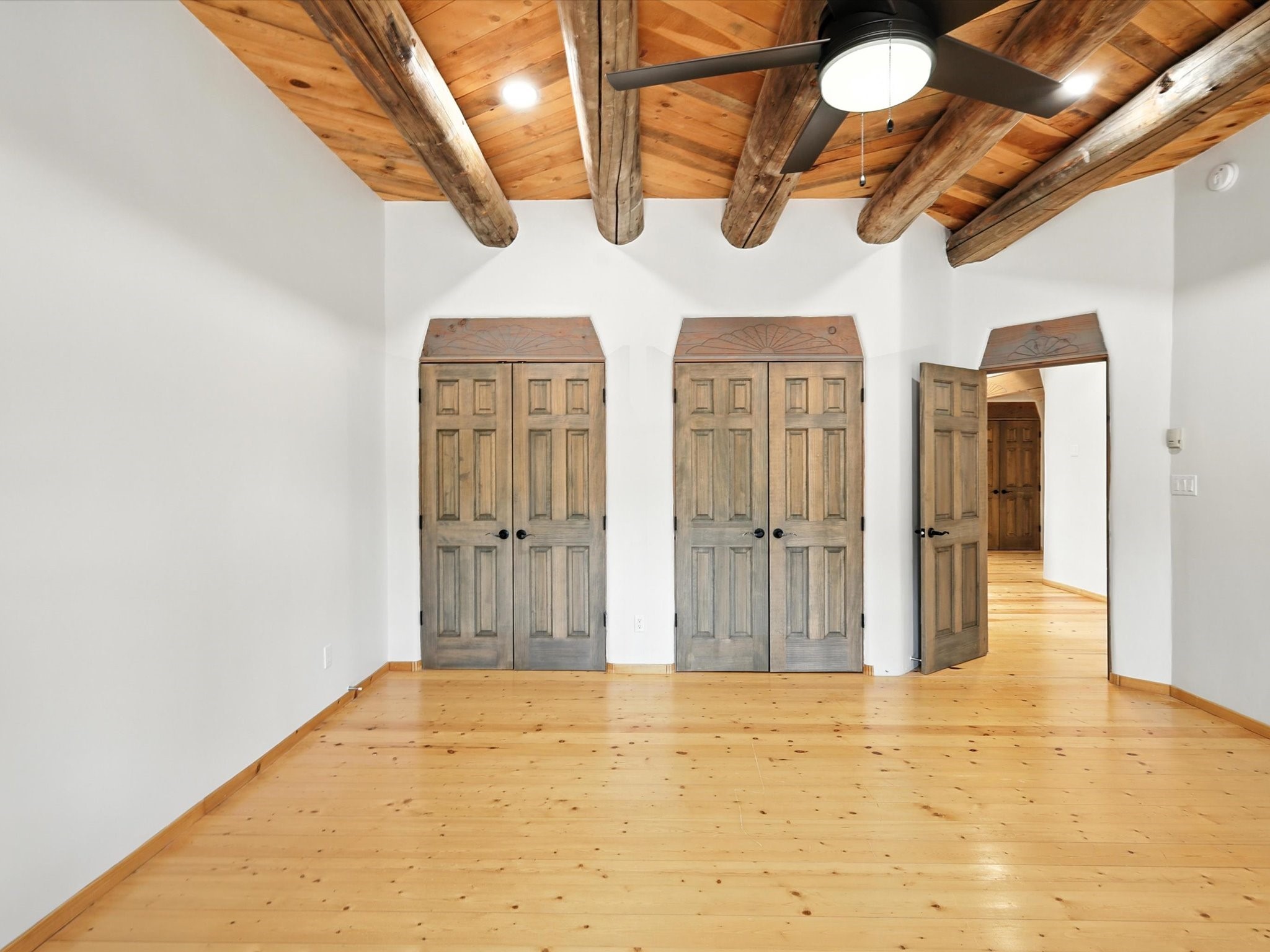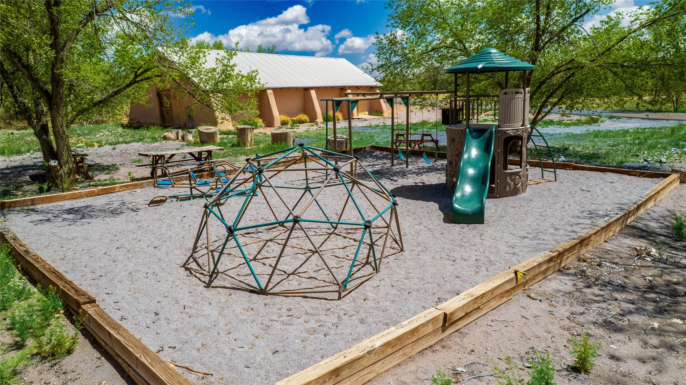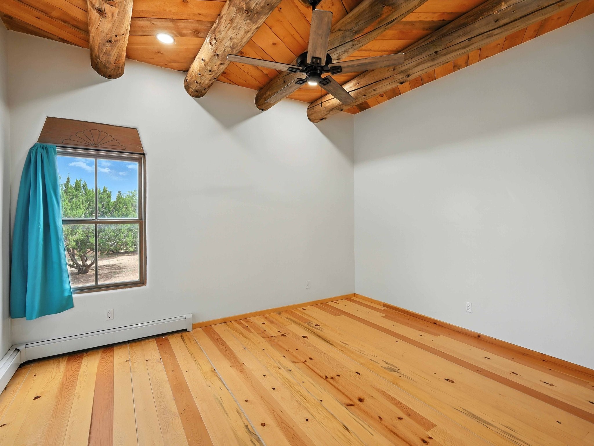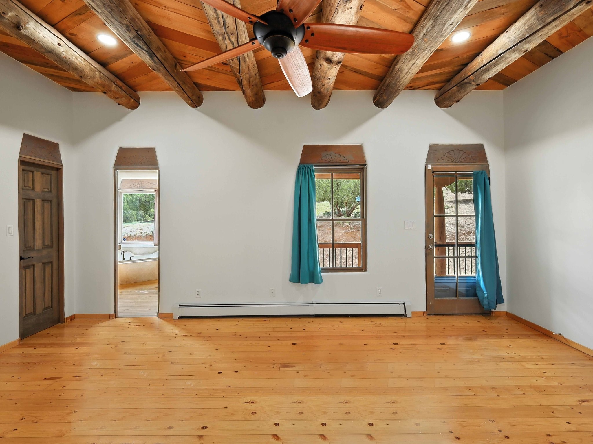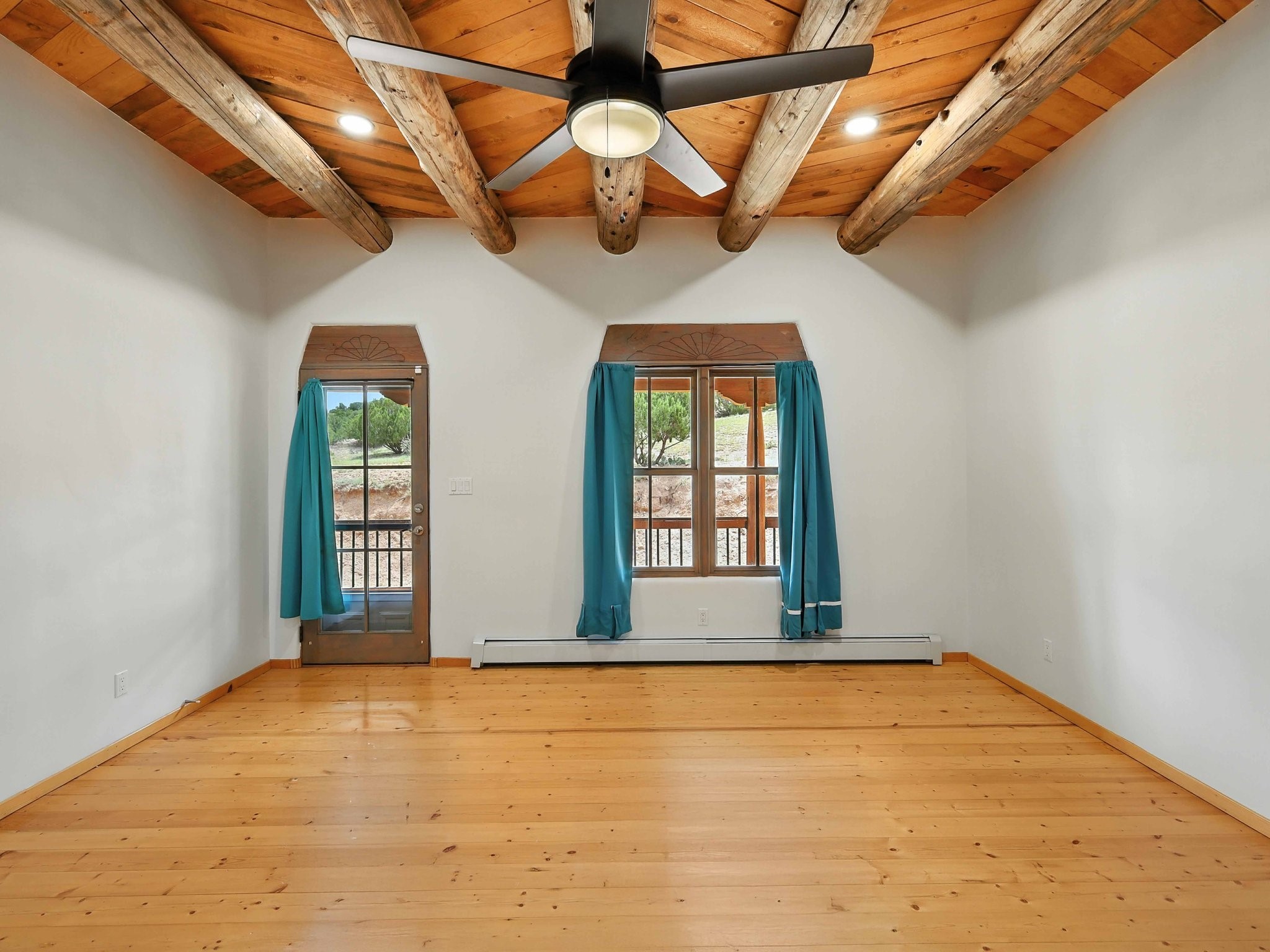 Experience Southwestern charm, stunning landscapes, and unmatched tranquility nestled in the sought-after Las Lagunitas community. This thoughtfully designed 4-bedroom, 2.5-bath custom home sits on 1.26 acres of beautifully landscaped property, featuring vibrant roses, lilacs, butterfly bushes, and mature trees that bloom until the first frost. Step inside to an open-concept layout filled with warmth and character, from natural wood vigas throughout to custom barrel ceilings in the chef's kitchen which features rich custom cabinetry, double ovens, a pantry, and beautiful built-in nichos. The spacious master suite boasts a luxurious soaking tub with peaceful mountain views, a massive walk-in closet, and direct access to the expansive wrap around patio.Three additional bedrooms, including a versatile 4th bedroom/den provide flexibility and function with abundant storage including a generously sized garage with full shelving and a circular driveway for ample parking. Outdoors, choose between the open-air deck or the covered patio, offering panoramic views of mesas, mountains, hills, and those unforgettable Santa Fe sunsets painted in turquoise, pink, and gold. Nature lovers will adore the visits from hummingbirds, roadrunners, robins, and playful rabbits. Las Lagunitas offers quiet, secure living with gated entry, natural walking trails, a picturesque gazebo & pond, and a true sense of community. Homes are thoughtfully spaced for privacy while maintaining a welcoming neighborhood feel. Location Perks: Commuters will love the easy access to I-25 and the Frontage Road, making travel to Los Alamos National Laboratory, downtown Santa Fe, and Albuquerque fast and efficient--ideal for lab employees or anyone seeking peace without sacrificing proximity.