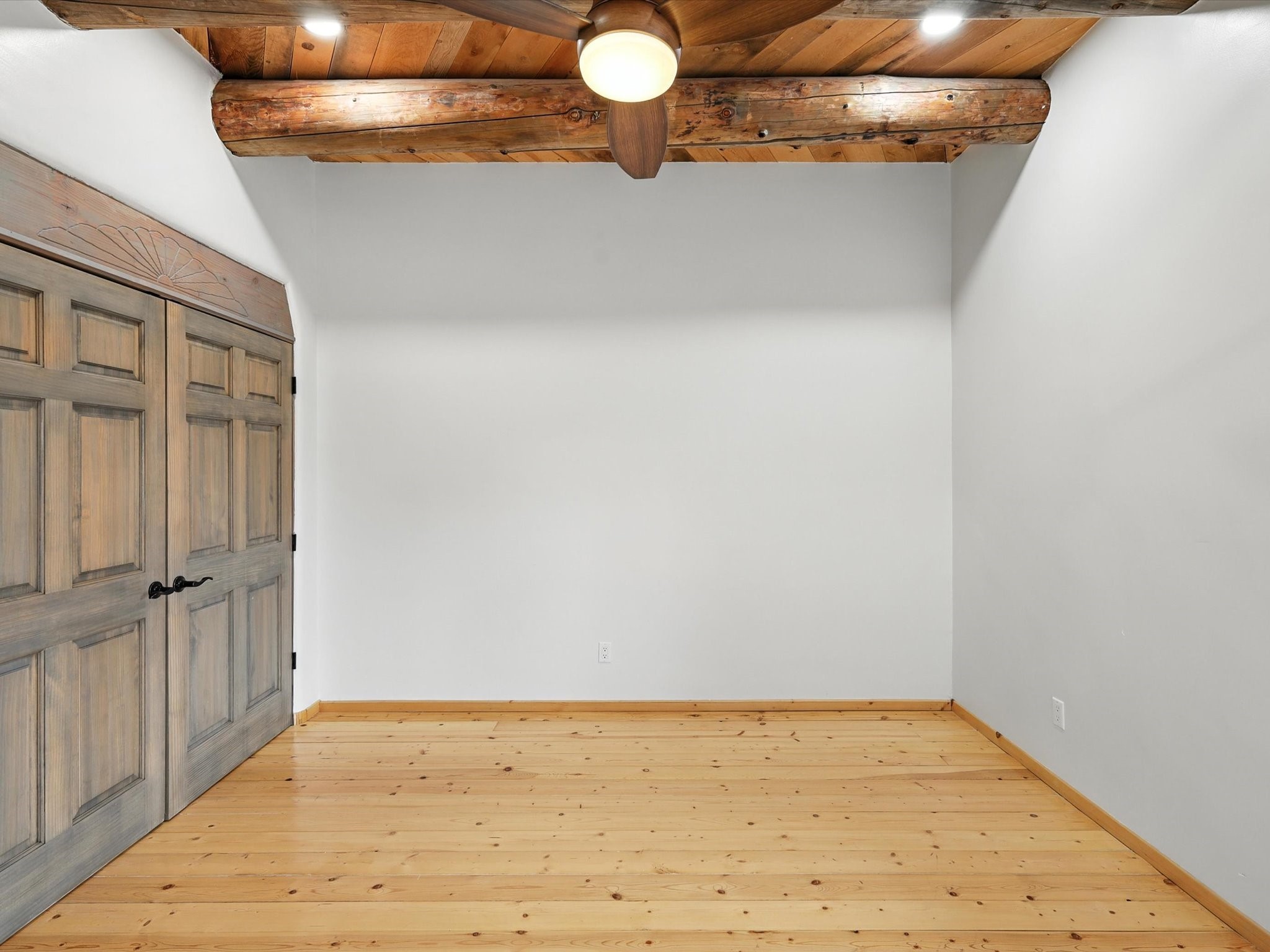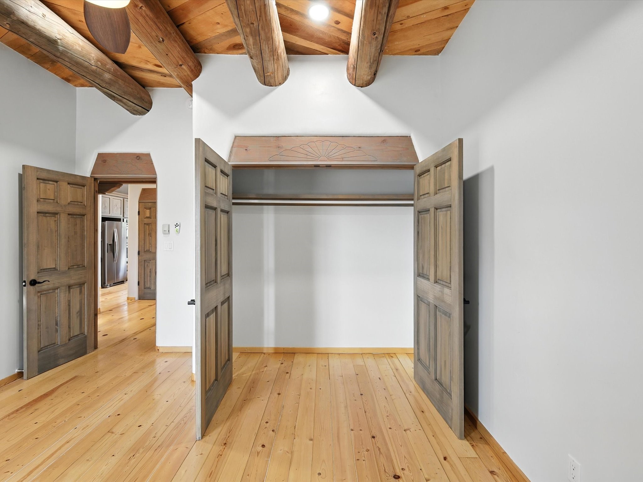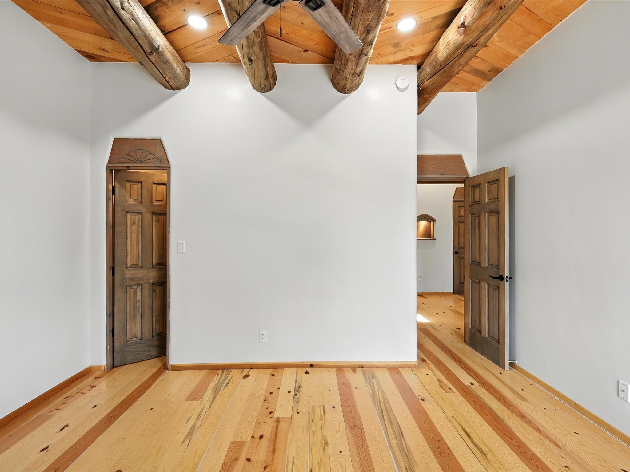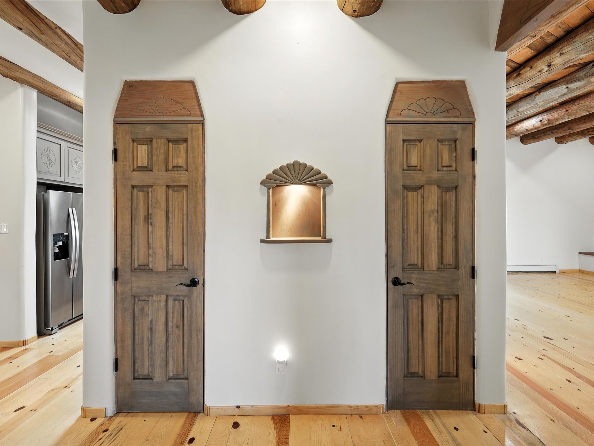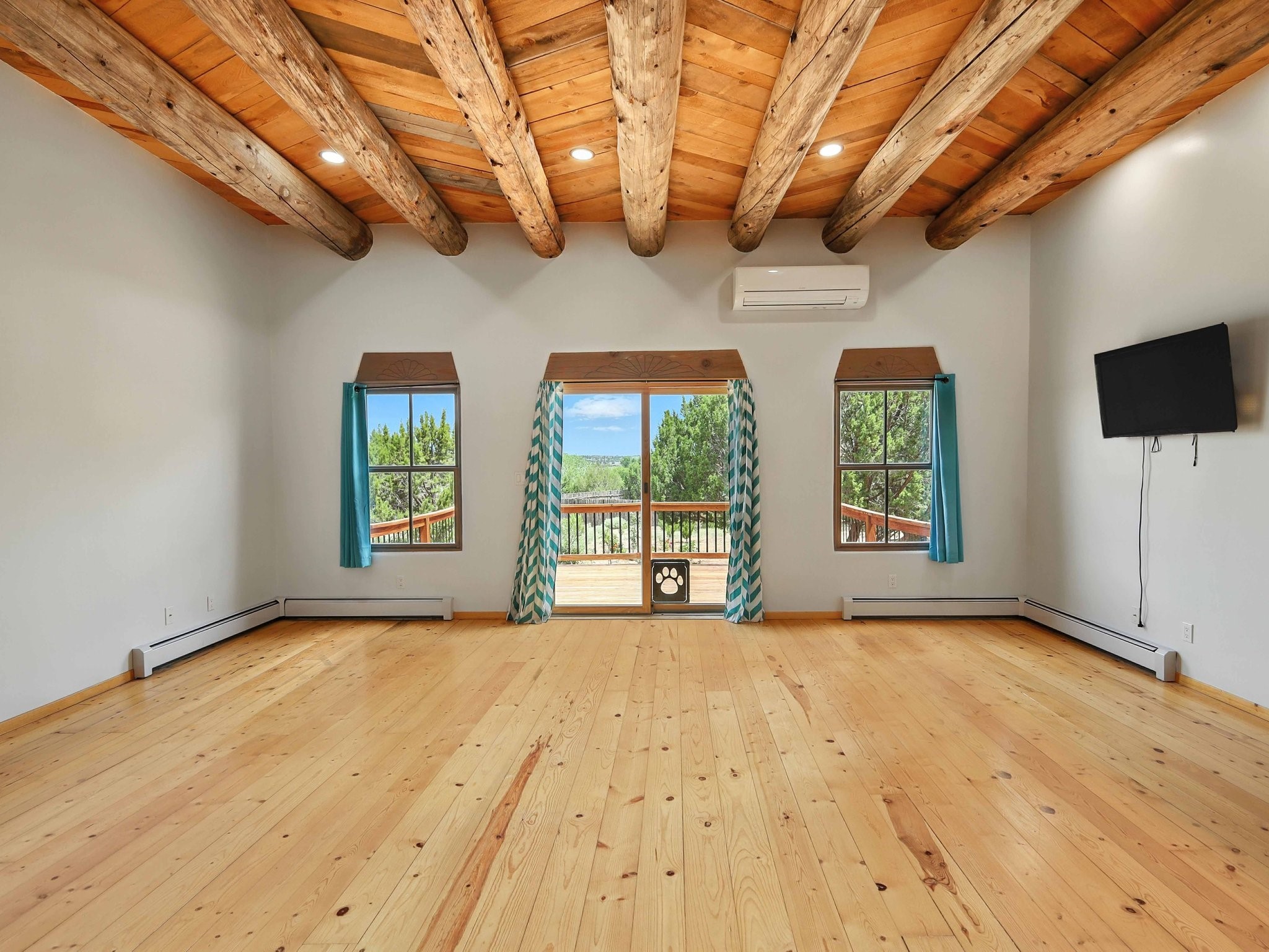 Experience Southwestern charm, stunning landscapes, and unmatched tranquility nestled in the sought-after Las Lagunitas community. This thoughtfully designed 4-bedroom, 2.5-bath custom home sits on 1.26 acres of beautifully landscaped property, featuring vibrant roses, lilacs, butterfly bushes, and mature trees that bloom until the first frost. Step inside to an open-concept layout filled with warmth and character, from natural wood vigas throughout to custom barrel ceilings in the chef's kitchen which features rich custom cabinetry, double ovens, a pantry, and beautiful built-in nichos. The spacious master suite boasts a luxurious soaking tub with peaceful mountain views, a massive walk-in closet, and direct access to the expansive wrap around patio.Three additional bedrooms, including a versatile 4th bedroom/den provide flexibility and function with abundant storage including a generously sized garage with full shelving and a circular driveway for ample parking. Outdoors, choose between the open-air deck or the covered patio, offering panoramic views of mesas, mountains, hills, and those unforgettable Santa Fe sunsets painted in turquoise, pink, and gold. Nature lovers will adore the visits from hummingbirds, roadrunners, robins, and playful rabbits. Las Lagunitas offers quiet, secure living with gated entry, natural walking trails, a picturesque gazebo & pond, and a true sense of community. Homes are thoughtfully spaced for privacy while maintaining a welcoming neighborhood feel. Location Perks: Commuters will love the easy access to I-25 and the Frontage Road, making travel to Los Alamos National Laboratory, downtown Santa Fe, and Albuquerque fast and efficient--ideal for lab employees or anyone seeking peace without sacrificing proximity.