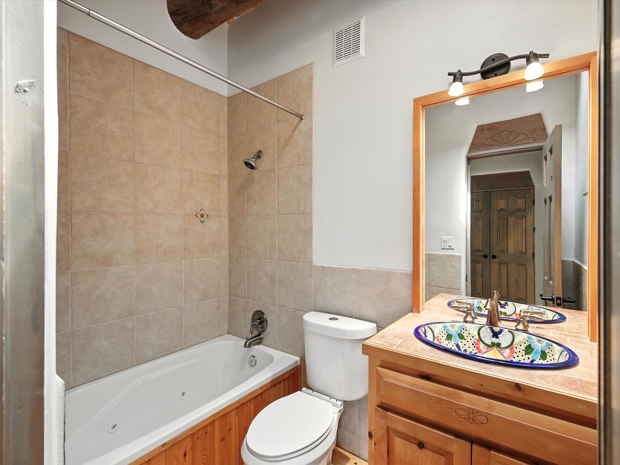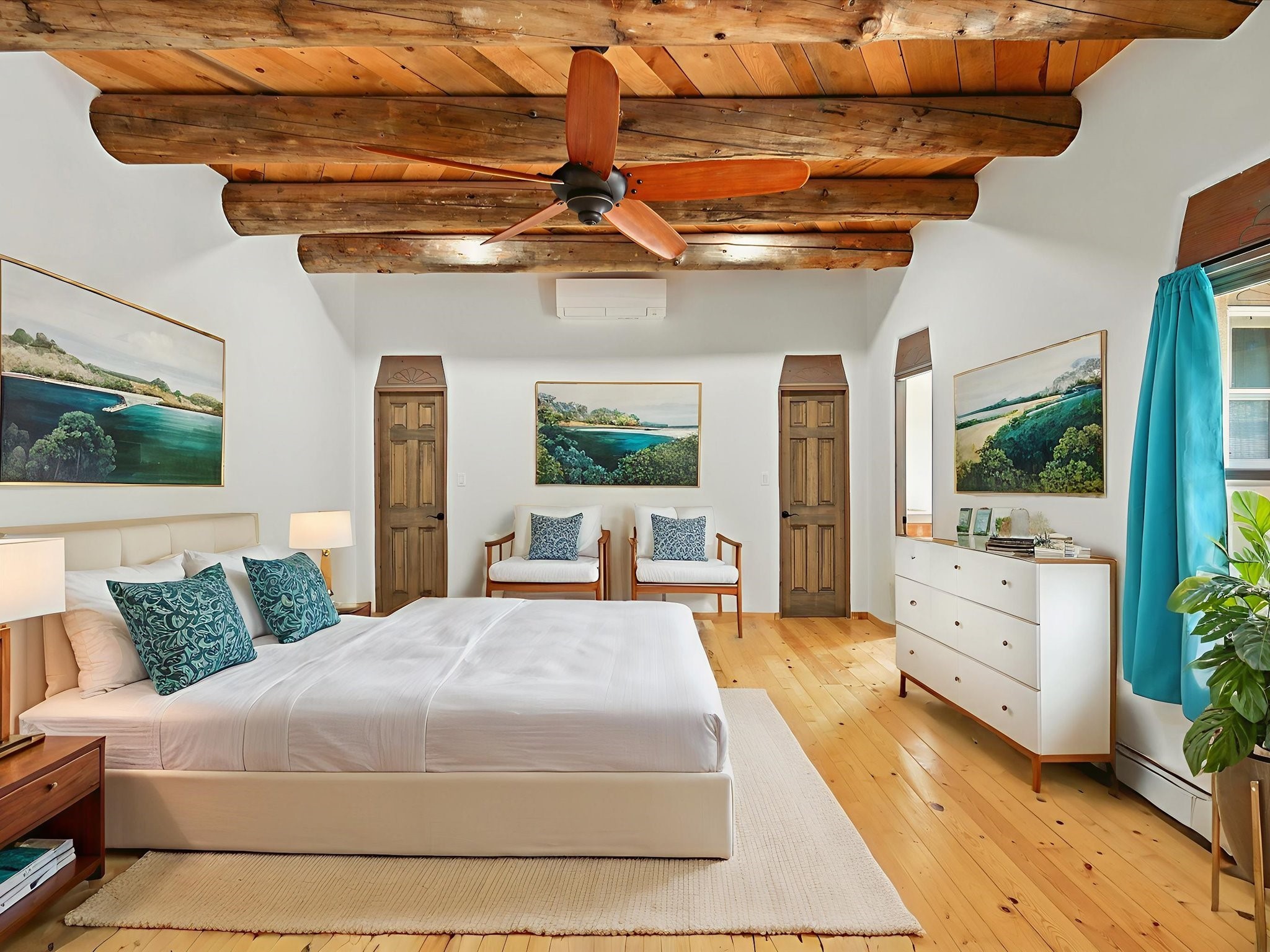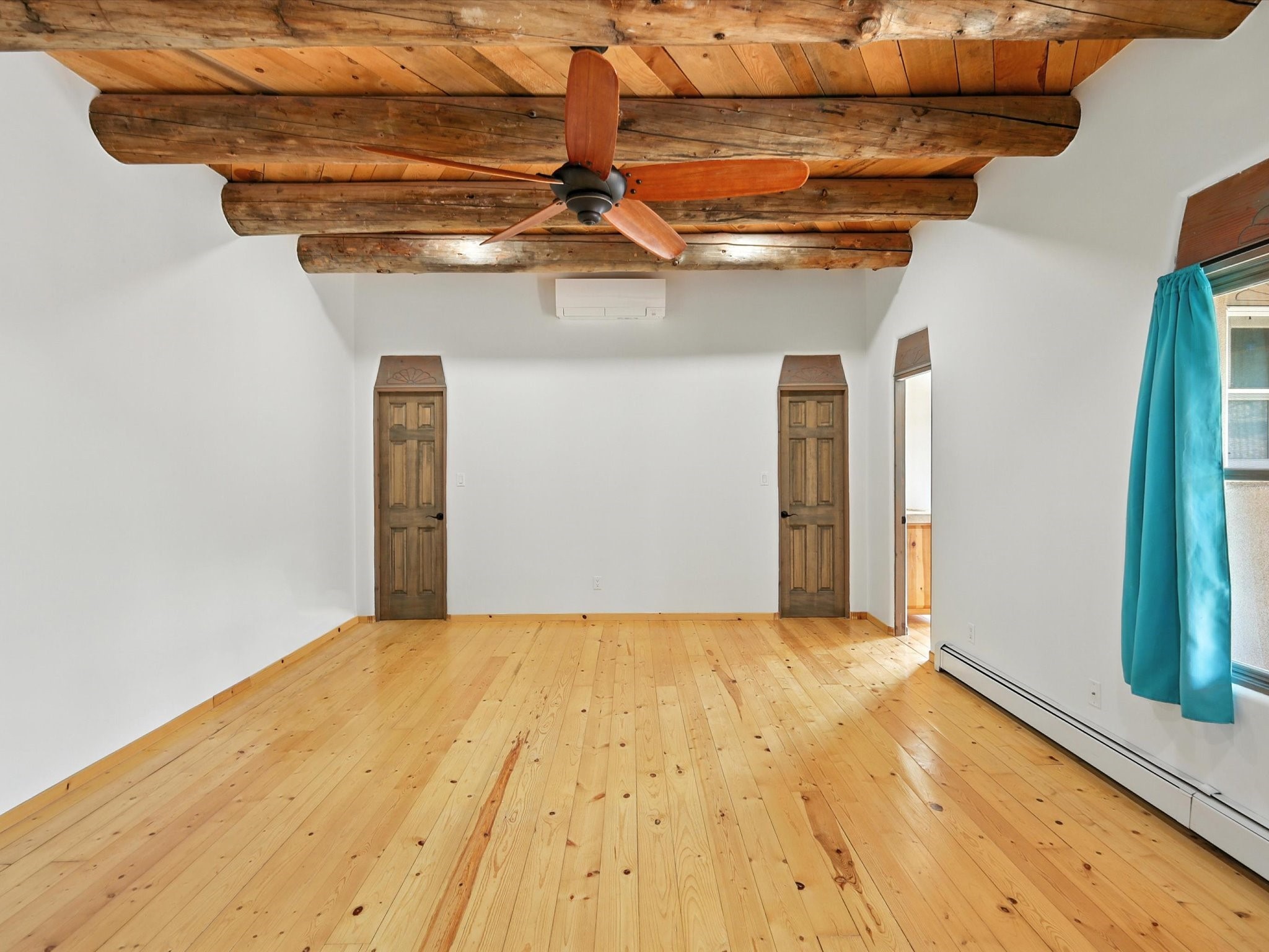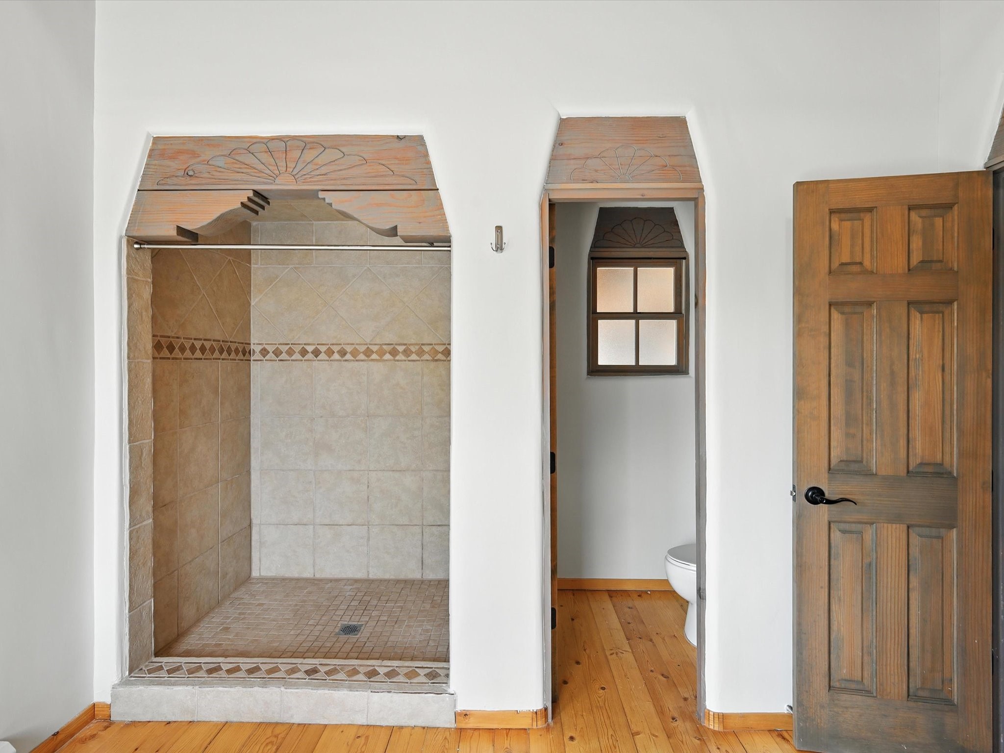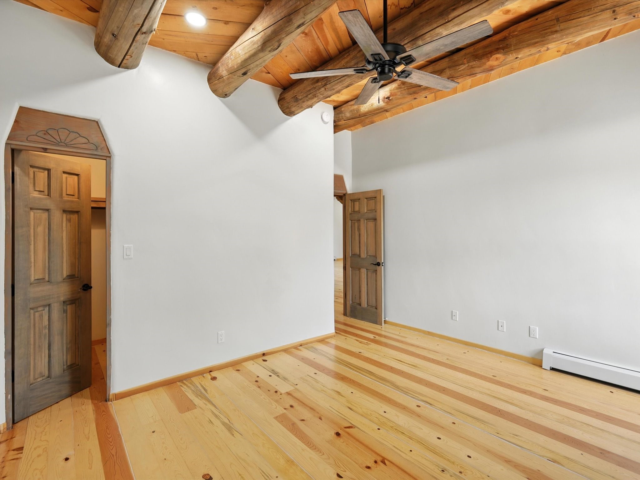 Experience Southwestern charm, stunning landscapes, and unmatched tranquility nestled in the sought-after Las Lagunitas community. This thoughtfully designed 4-bedroom, 2.5-bath custom home sits on 1.26 acres of beautifully landscaped property, featuring vibrant roses, lilacs, butterfly bushes, and mature trees that bloom until the first frost. Step inside to an open-concept layout filled with warmth and character, from natural wood vigas throughout to custom barrel ceilings in the chef's kitchen which features rich custom cabinetry, double ovens, a pantry, and beautiful built-in nichos. The spacious master suite boasts a luxurious soaking tub with peaceful mountain views, a massive walk-in closet, and direct access to the expansive wrap around patio.Three additional bedrooms, including a versatile 4th bedroom/den provide flexibility and function with abundant storage including a generously sized garage with full shelving and a circular driveway for ample parking. Outdoors, choose between the open-air deck or the covered patio, offering panoramic views of mesas, mountains, hills, and those unforgettable Santa Fe sunsets painted in turquoise, pink, and gold. Nature lovers will adore the visits from hummingbirds, roadrunners, robins, and playful rabbits. Las Lagunitas offers quiet, secure living with gated entry, natural walking trails, a picturesque gazebo & pond, and a true sense of community. Homes are thoughtfully spaced for privacy while maintaining a welcoming neighborhood feel. Location Perks: Commuters will love the easy access to I-25 and the Frontage Road, making travel to Los Alamos National Laboratory, downtown Santa Fe, and Albuquerque fast and efficient--ideal for lab employees or anyone seeking peace without sacrificing proximity.