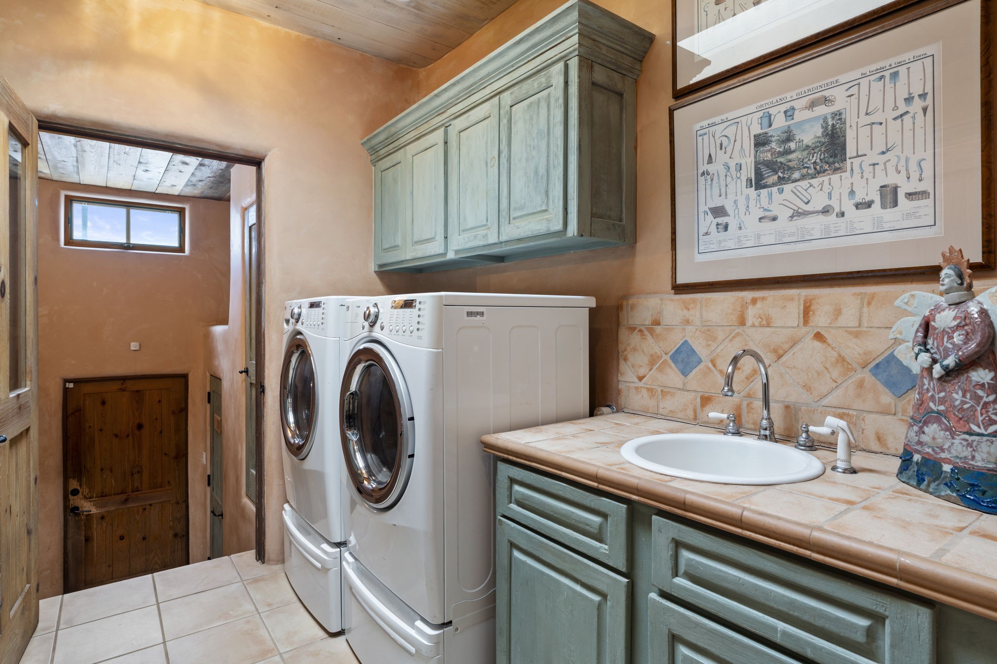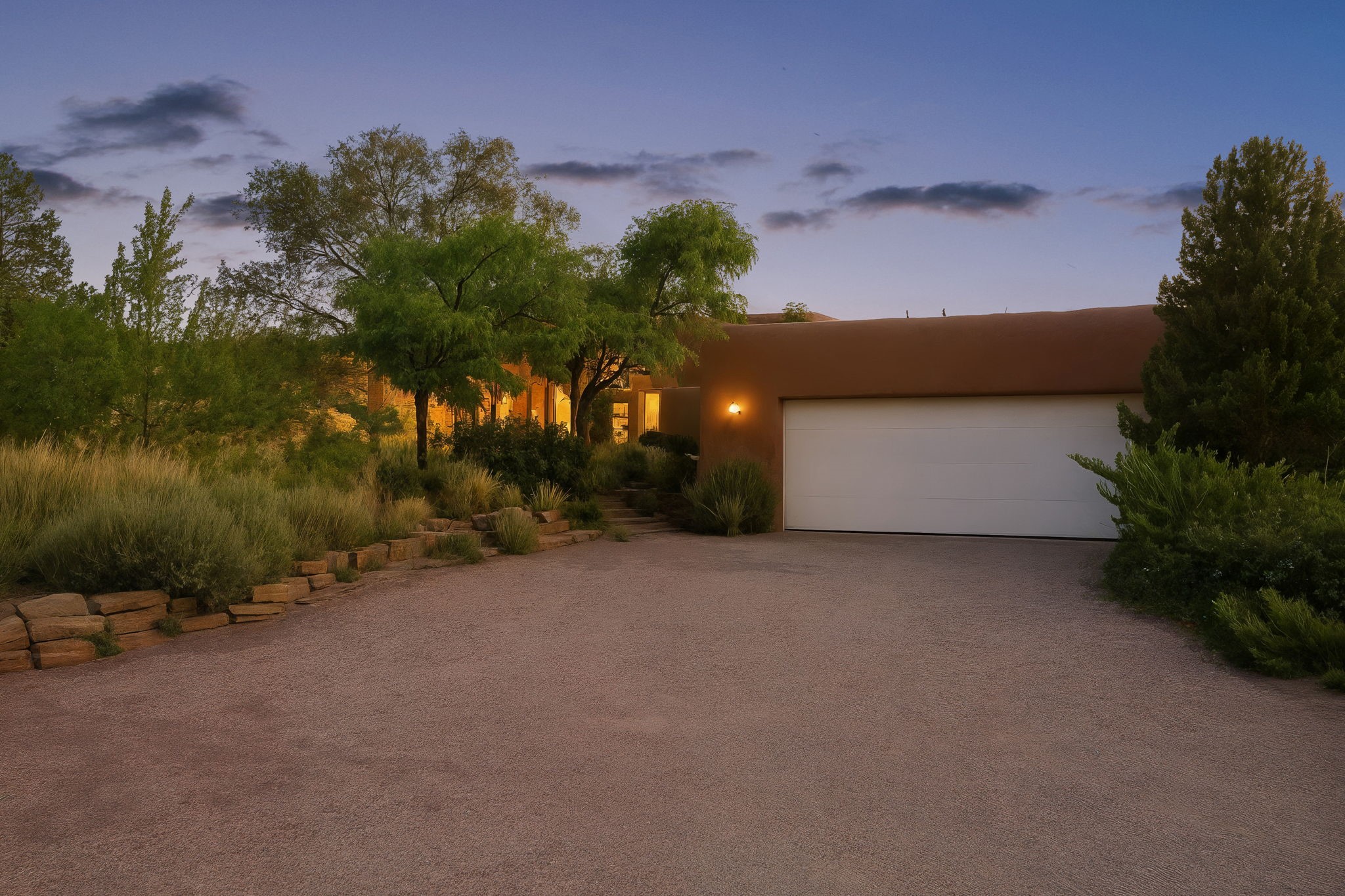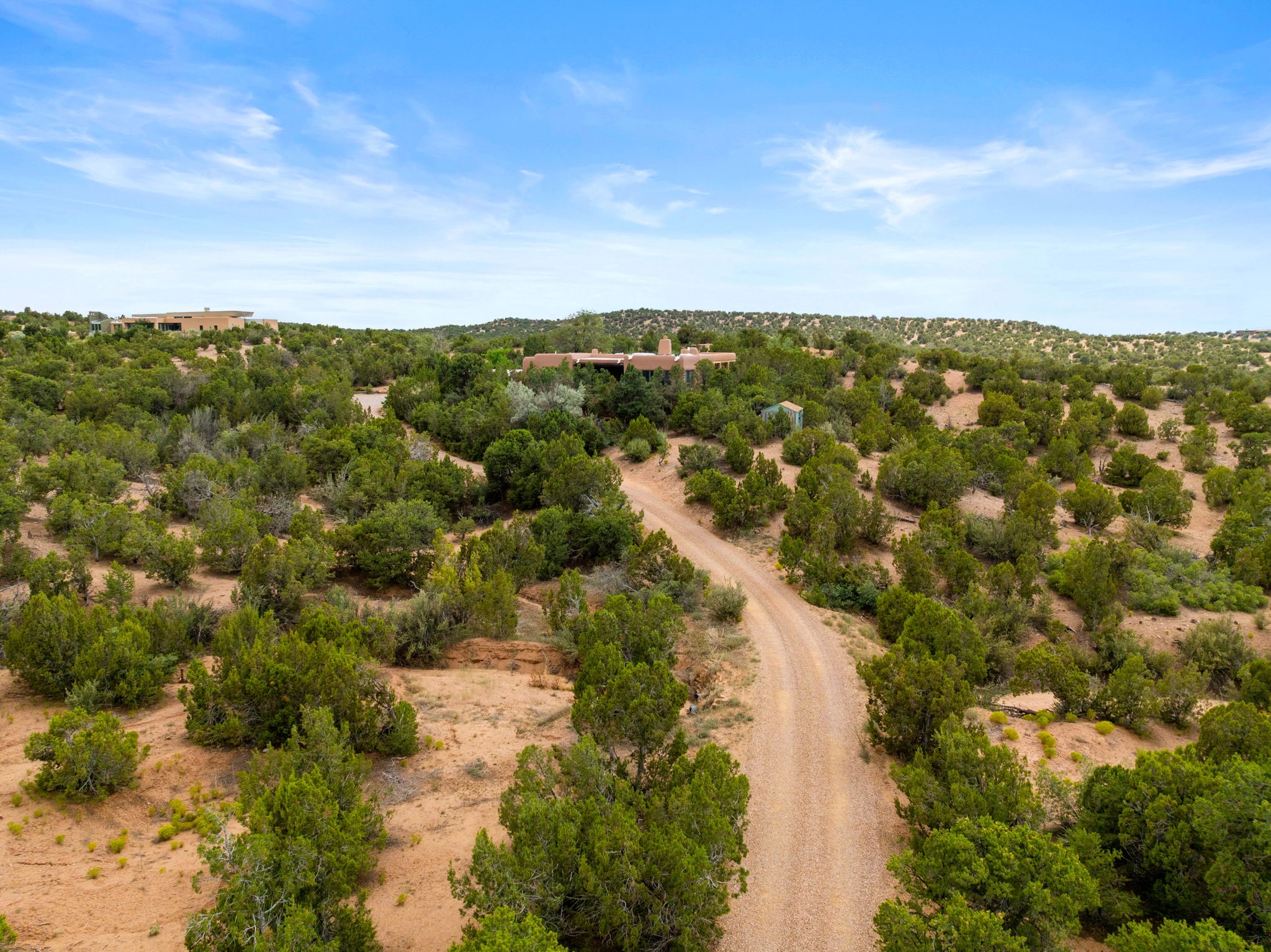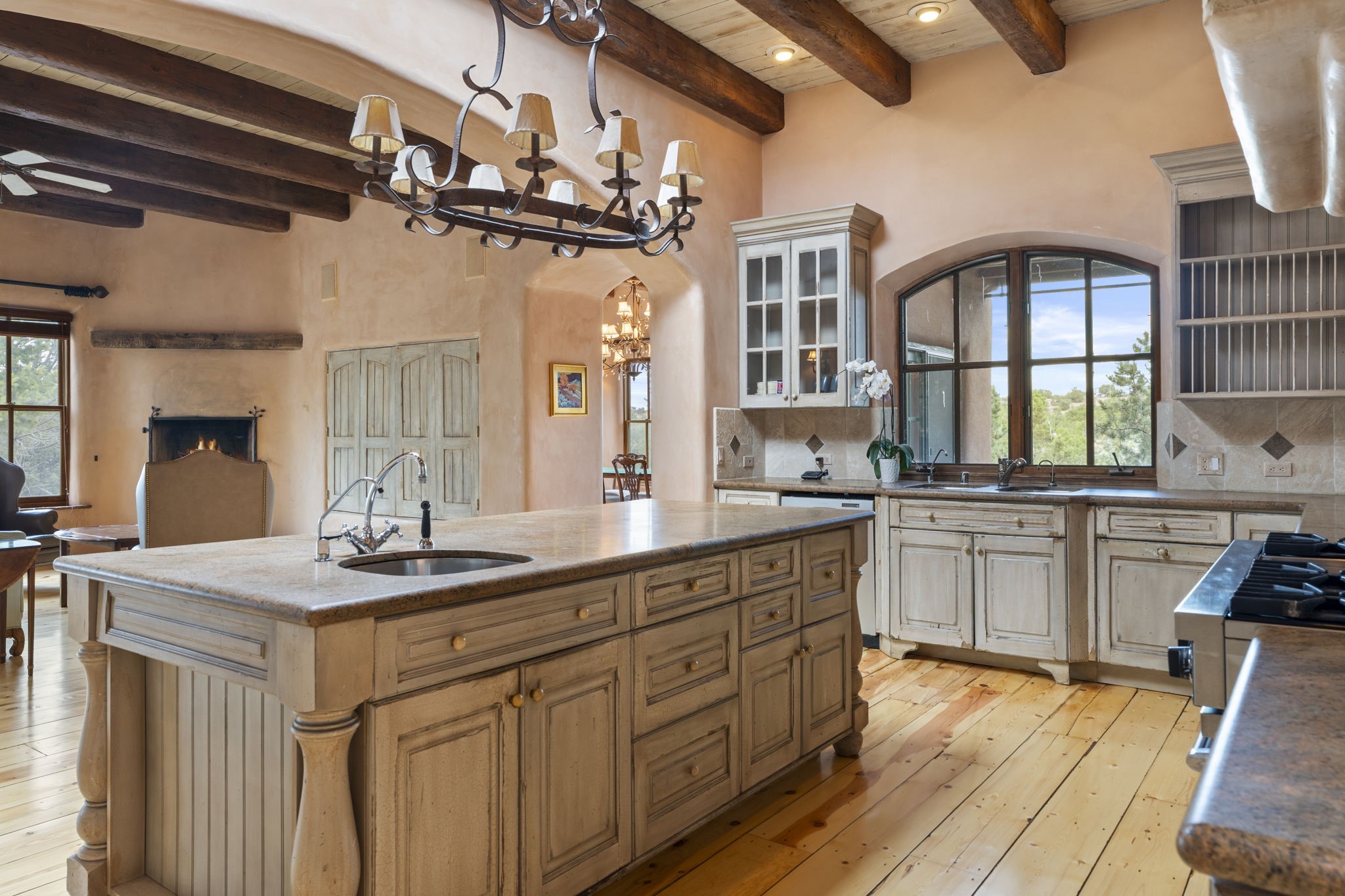 What kind of story are you ready for?? Santa Fe style meets European Country Estate! This 4 bedroom, 4 bathroom, high-quality Rastra construction features soaring ceilings, hand carved vigas, and far-reaching mountain views. Walking into the grand entrance, you are greeted by voluminous curved walls, golden-soft natural light, wide-plank pine floors, and a stately fireplace, which set the stage for an elegant Santa Fe lifestyle. The open concept French country kitchen faces a spacious den with views framed by large picture windows, and features an oversized island topped with granite. There is plenty of counter space for cooking and for entertaining guests. High-end appliances include a large Sub-Zero refrigerator, a six-burner Viking range, and a Bosch dishwasher. Additionally, this home's temperature-controlled wine cave accommodates 1500-2000 bottles for the serious aficionado. Relax in front of one of five fireplaces, and enjoy a large, formal dining room with views that will sweep guests off their feet! Or, linger over a morning cup of coffee on the grand portal overlooking the koi pond and the Jemez mountains. The lavish primary suite is on the main level and will have you living in luxury with a large deep, soaking tub, a private cedar-lined sauna, and a steam shower. There are several rooms downstairs (including a bathroom) which could be used as a mother-in-law suite, offices, or an artist studio. Complete with a TPO roof, an oversized two-car garage, and beautiful landscaping on drip irrigation, this is a timeless space you'll never want to leave. Rastra construction and owned solar panels create an extremely energy efficient environment, with almost non-existent electric bills. New stucco was done in 2025. Enjoy proximity to the club at Las Campanas, but without the high HOA fees. Don't miss this chance to live your dream Santa Fe lifestyle!