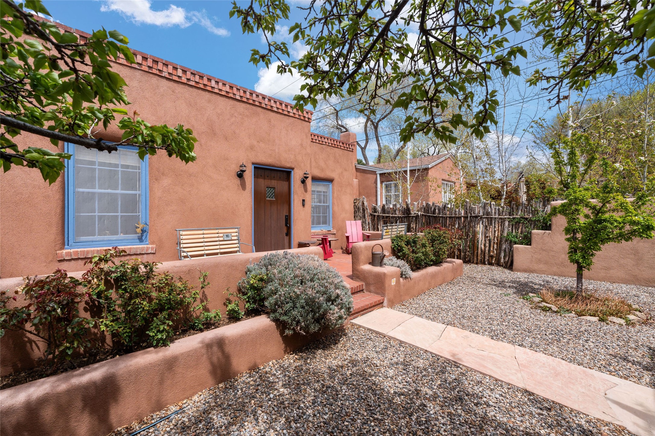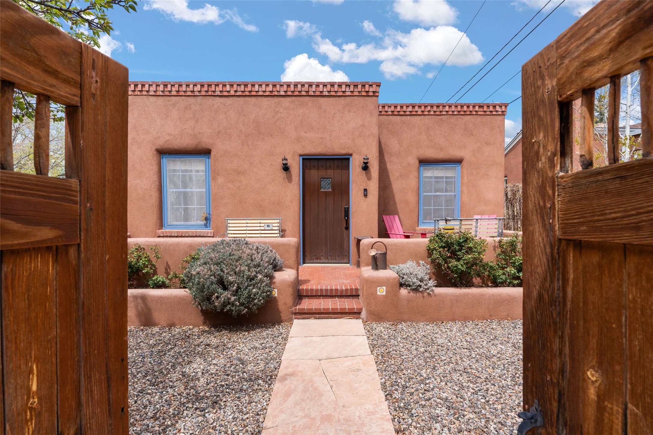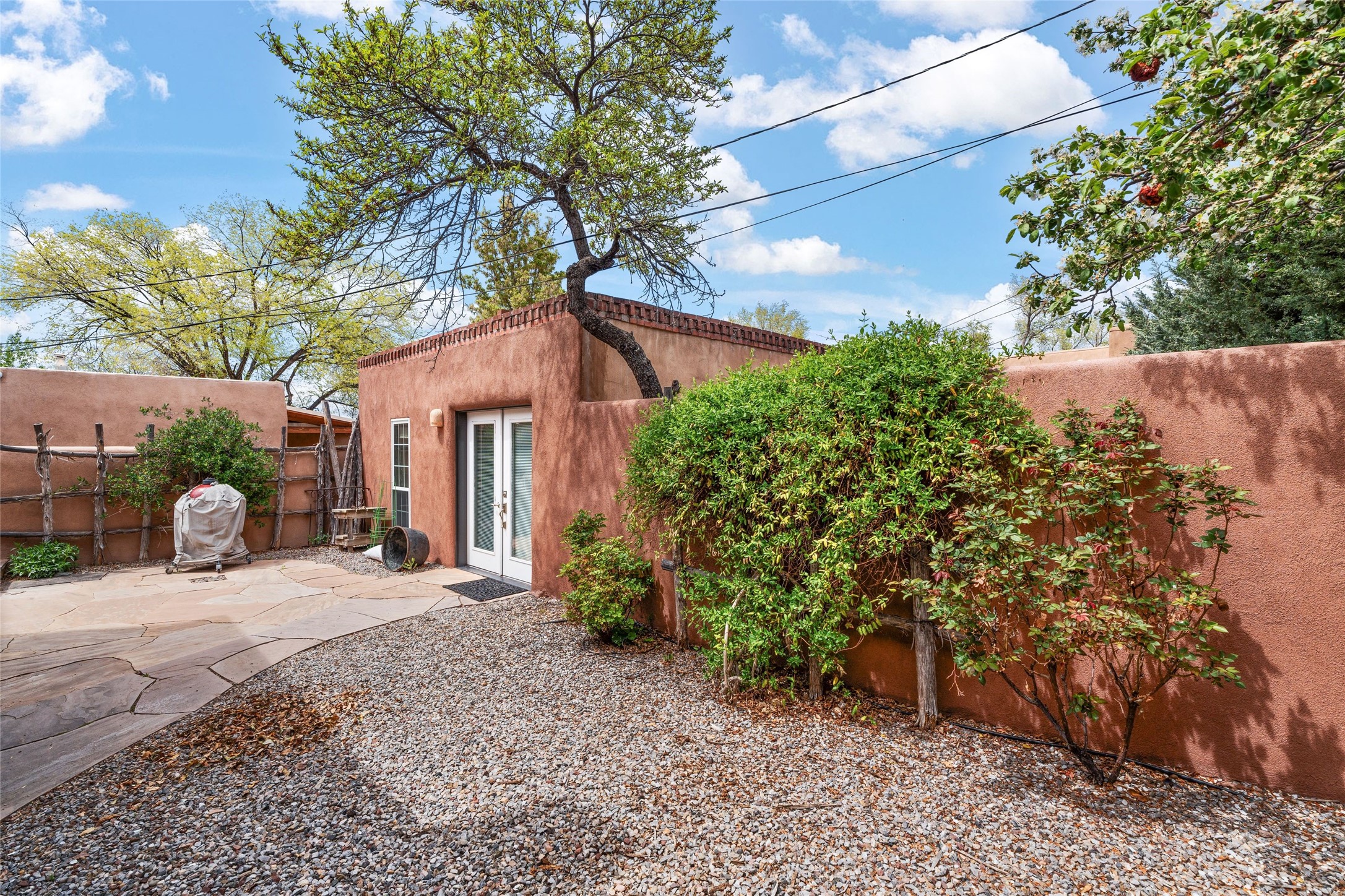 Perfect downtown pied--terre located in the heart of Santa Fe's South Capitol neighborhood. This residence combines classic architecture with modern amenities, creating an inviting atmosphere in a sought-after area. With 1,273 square feet, the main house features a thoughtfully designed layout that includes two spacious bedrooms and two bathrooms. The separate dining room offers an ideal space for gatherings, while the primary suite is a true highlight, complete with its own fireplace and French doors that open to a picturesque courtyard. Culinary enthusiasts will appreciate the well-appointed kitchen, which features a Wolf range and a built-in refrigerator. The charm extends beyond the main house with a detached guesthouse, offering 390 square feet of additional living space. This cozy retreat includes a kitchenette and a full bath, perfect for hosting visitors or enjoying personal time. Outside, the private courtyard showcases lush landscaping, featuring fruit trees that invites relaxation. It serves as a serene escape, ideal for unwinding amidst nature's beauty. An extra bonus is a basement with a washer/dryer and additional storage space. Off street parking for one car. Conveniently positioned in Santa Fe's Historic District, this property is just a stone's throw away from notable attractions, including the Roundhouse, Whole Foods, the Railyard, the Farmers Market, and the lively Santa Fe Plaza.