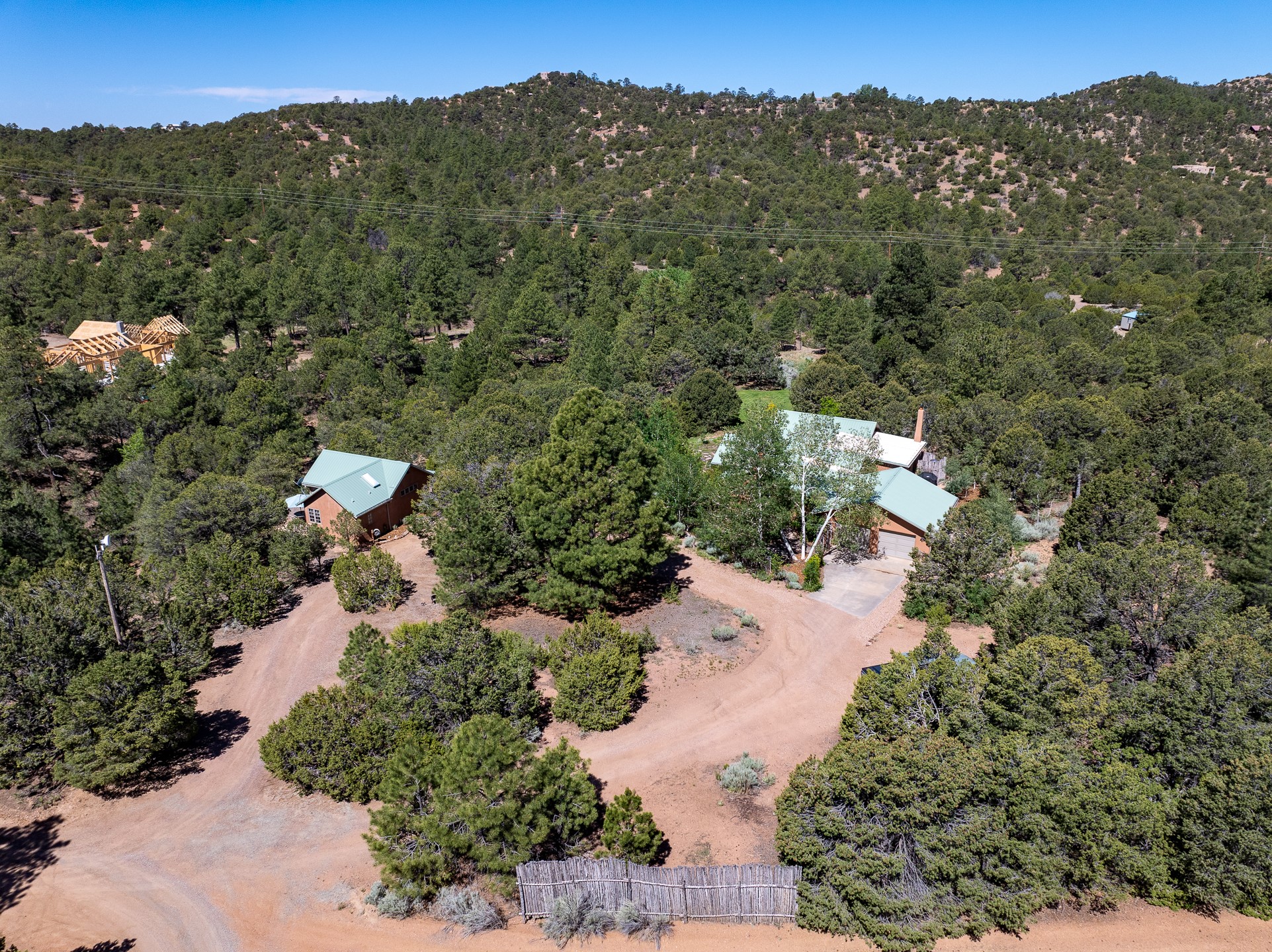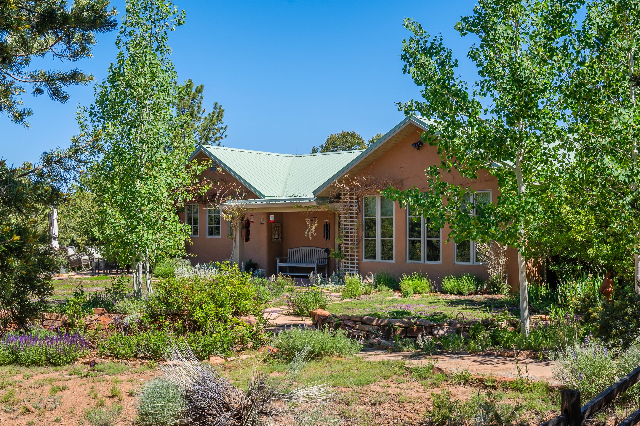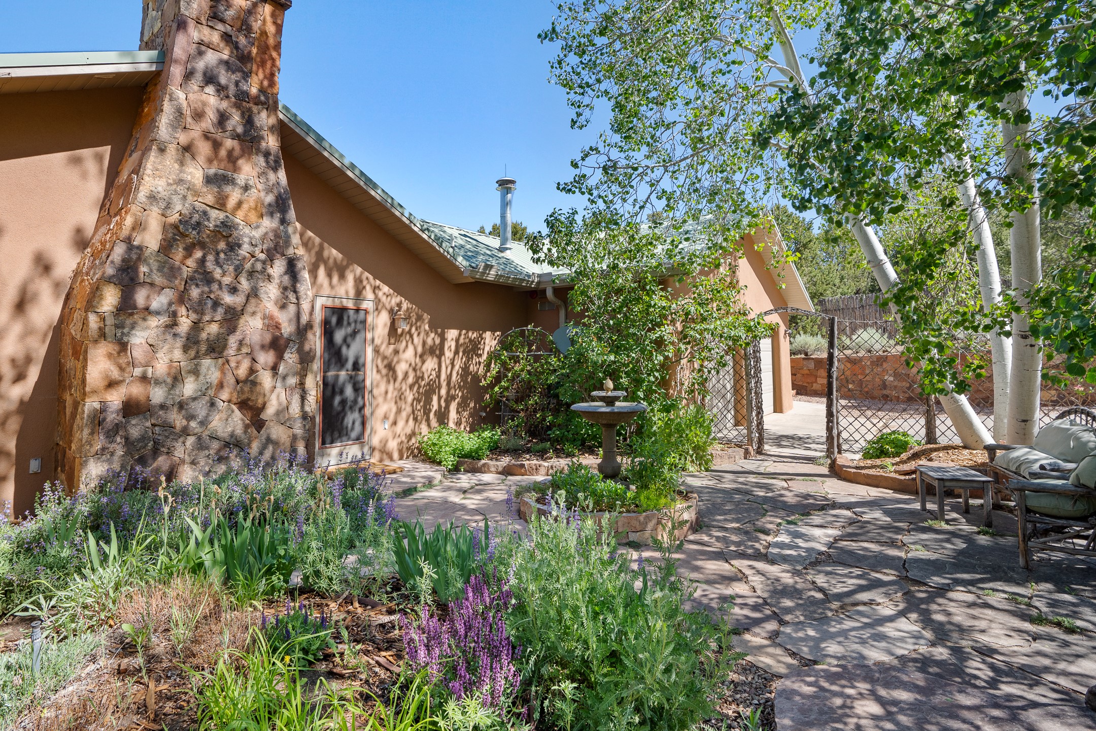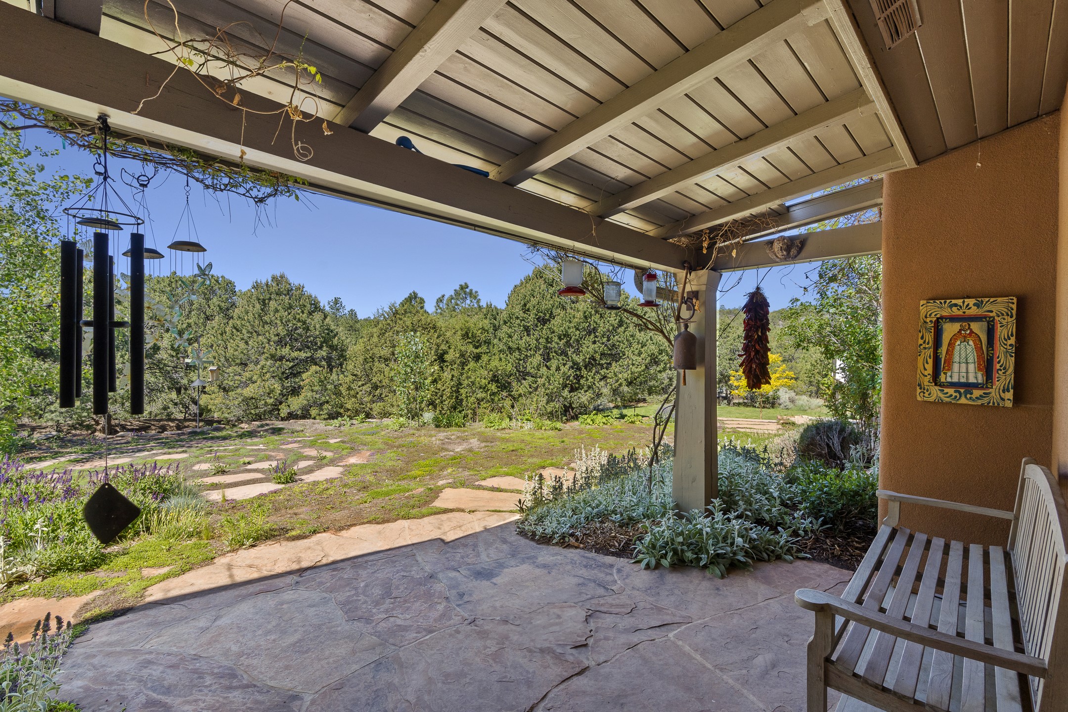 Just 15 minutes from the Santa Fe Plaza, this hidden gem is nestled on 5 acres in a lush, private valley bordering the Santa Fe National Forest. Surrounded by towering aspens, mature ponderosa pines, pions, fruit trees, and established gardens, the property offers rare seclusion, natural beauty, and immediate access to the outdoors. The 2,150 sq ft main residence features a pitched Northern New Mexico roof, radiant heat, mini splits, and a beautifully renovated kitchen with Wolf appliances. Hand-carved granite walls and flagstone patios add timeless character. A detached 625 sq ft one-bedroom guesthouse--fully licensed as a short-term rental--offers privacy for visitors or turn-key income potential. The Dale Ball Trail system--Santa Fe's most beloved network of hiking and biking trails--runs directly through the property, offering unmatched access to miles of scenic exploration right from your door. A large reclaimed seasonal pond adds to the magic of this serene landscape, with endless stargazing by night and wildlife by day. Additional highlights include a 2-car garage (1 bay heated), natural gas utilities, large cistern, and 18-station irrigation system powered by a shared well with 1.5 acre feet of water. The property is part of a small, well-run HOA with low dues and a friendly community. Gated access via Double Arrow ensures privacy and peace of mind. 53 Hidden Valley is a rare opportunity to live immersed in nature--with starry skies above, trails beneath your feet, and Santa Fe's rich culture just minutes away.