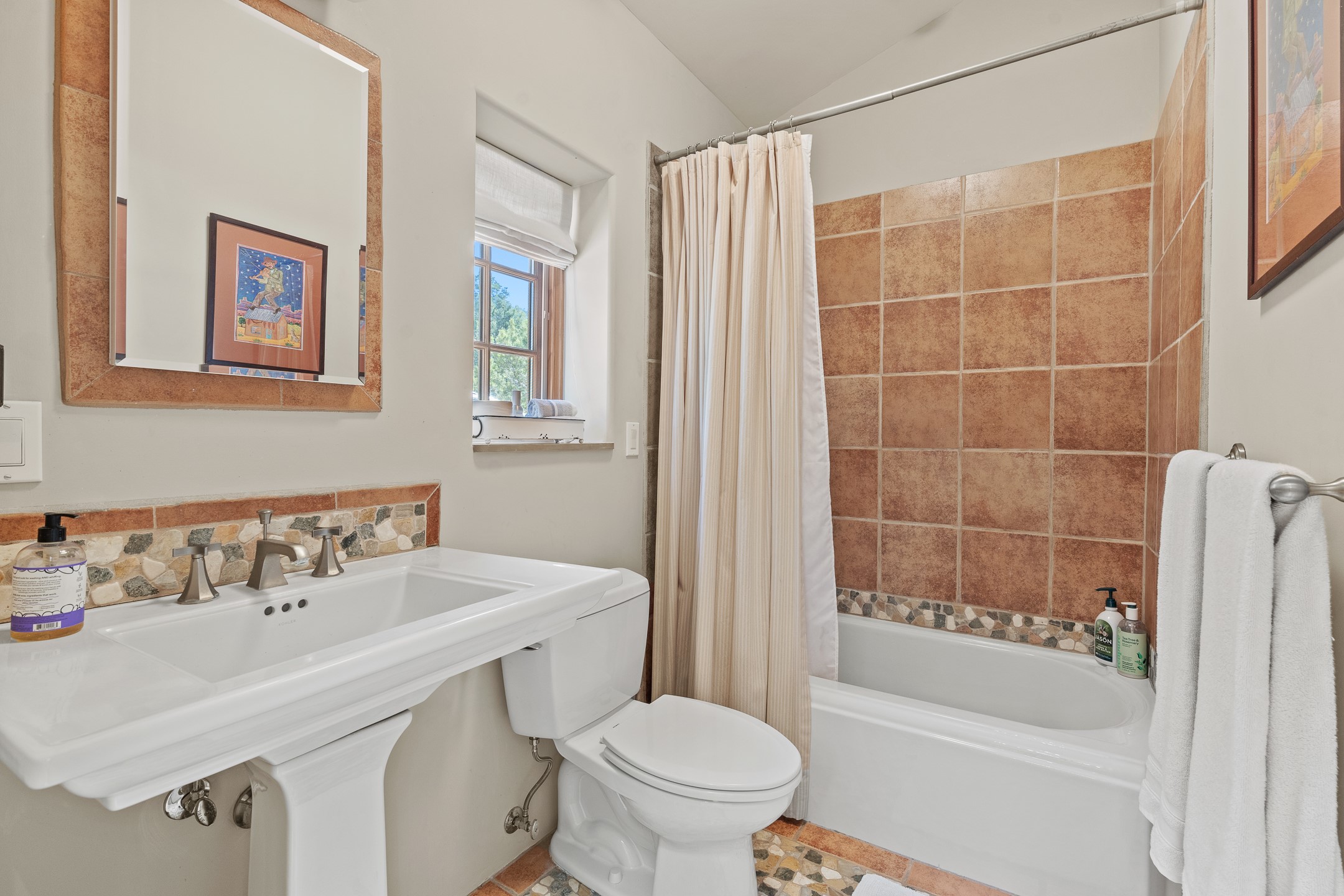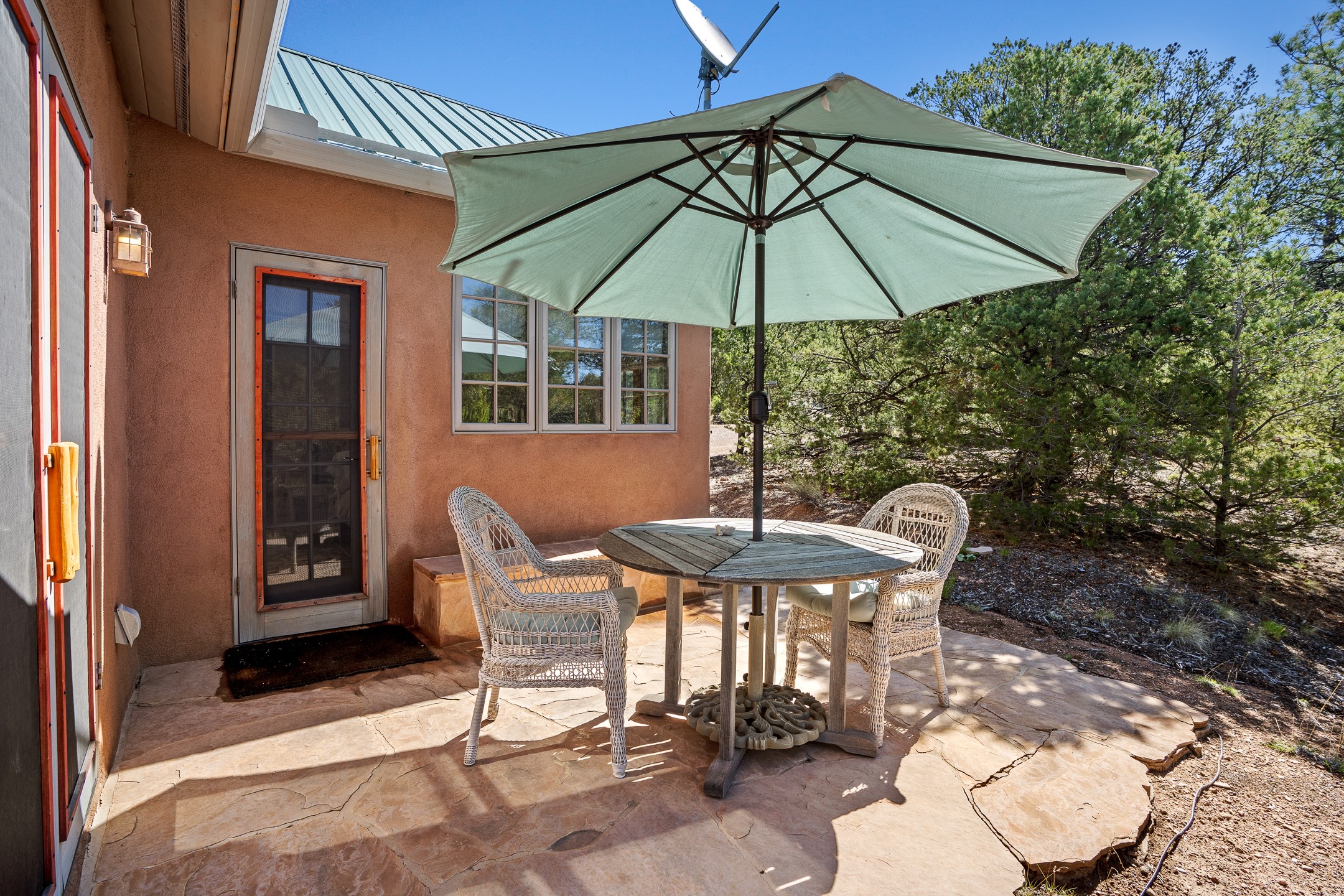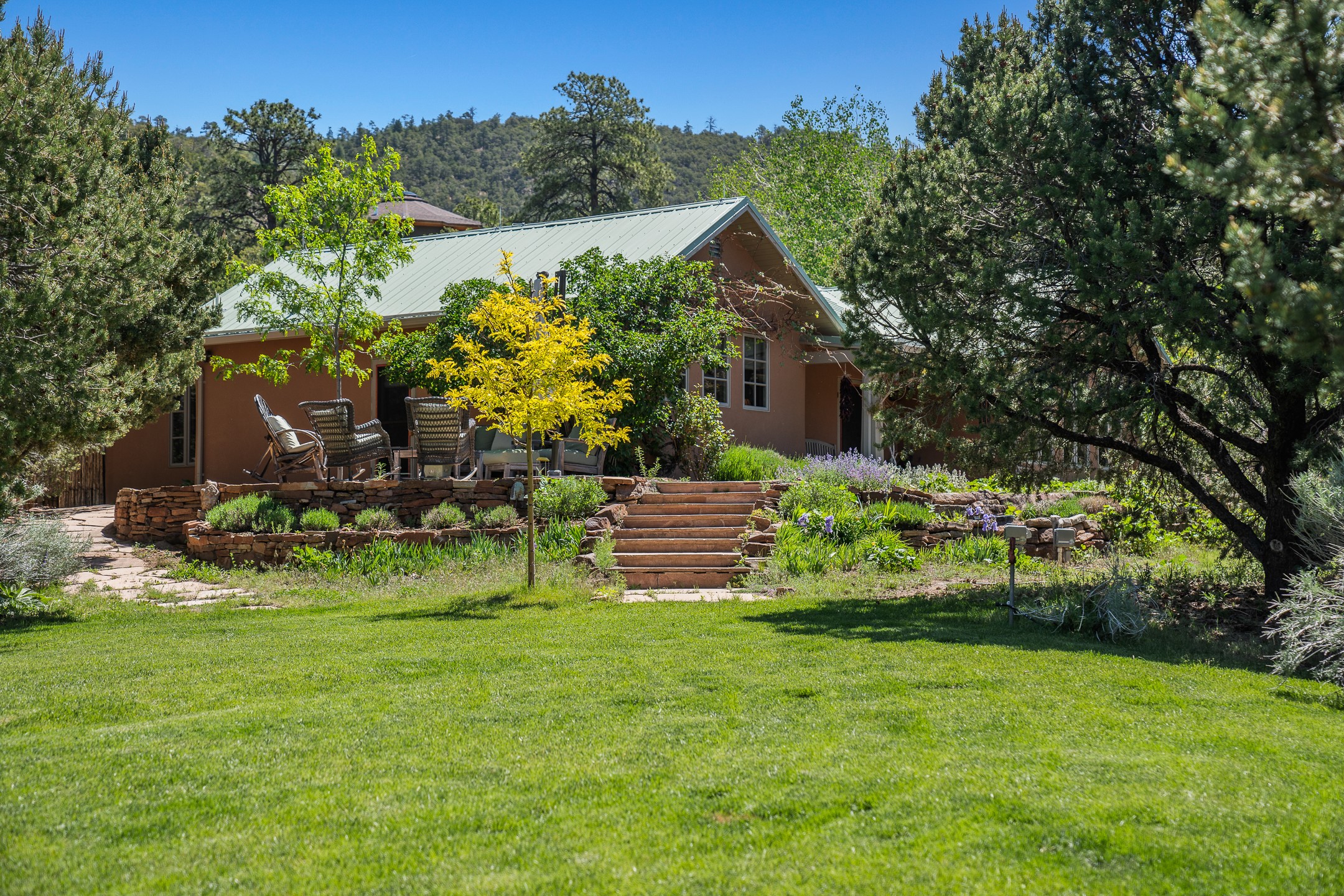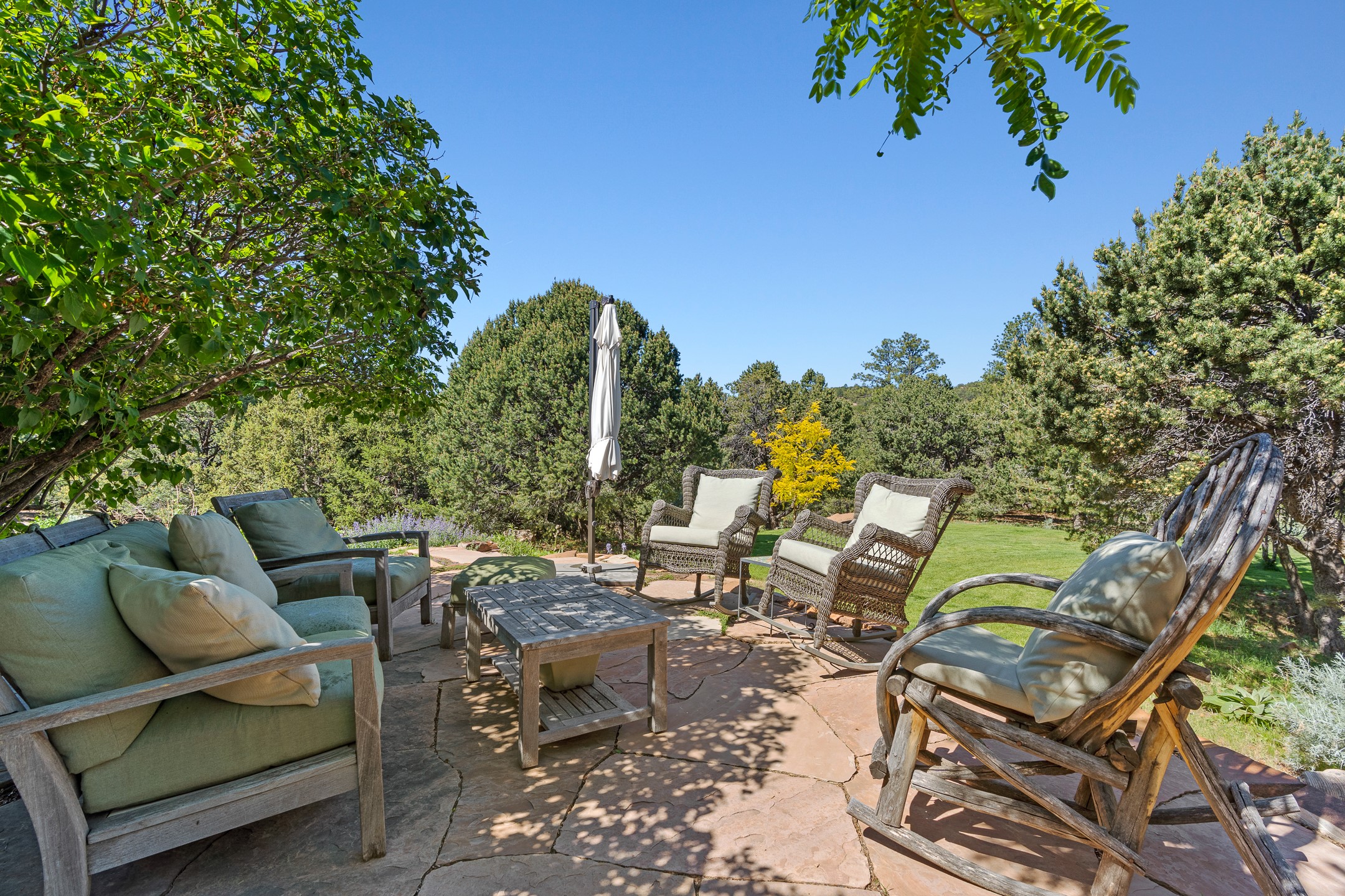 Just 15 minutes from the Santa Fe Plaza, this hidden gem is nestled on 5 acres in a lush, private valley bordering the Santa Fe National Forest. Surrounded by towering aspens, mature ponderosa pines, pions, fruit trees, and established gardens, the property offers rare seclusion, natural beauty, and immediate access to the outdoors. The 2,150 sq ft main residence features a pitched Northern New Mexico roof, radiant heat, mini splits, and a beautifully renovated kitchen with Wolf appliances. Hand-carved granite walls and flagstone patios add timeless character. A detached 625 sq ft one-bedroom guesthouse--fully licensed as a short-term rental--offers privacy for visitors or turn-key income potential. The Dale Ball Trail system--Santa Fe's most beloved network of hiking and biking trails--runs directly through the property, offering unmatched access to miles of scenic exploration right from your door. A large reclaimed seasonal pond adds to the magic of this serene landscape, with endless stargazing by night and wildlife by day. Additional highlights include a 2-car garage (1 bay heated), natural gas utilities, large cistern, and 18-station irrigation system powered by a shared well with 1.5 acre feet of water. The property is part of a small, well-run HOA with low dues and a friendly community. Gated access via Double Arrow ensures privacy and peace of mind. 53 Hidden Valley is a rare opportunity to live immersed in nature--with starry skies above, trails beneath your feet, and Santa Fe's rich culture just minutes away.