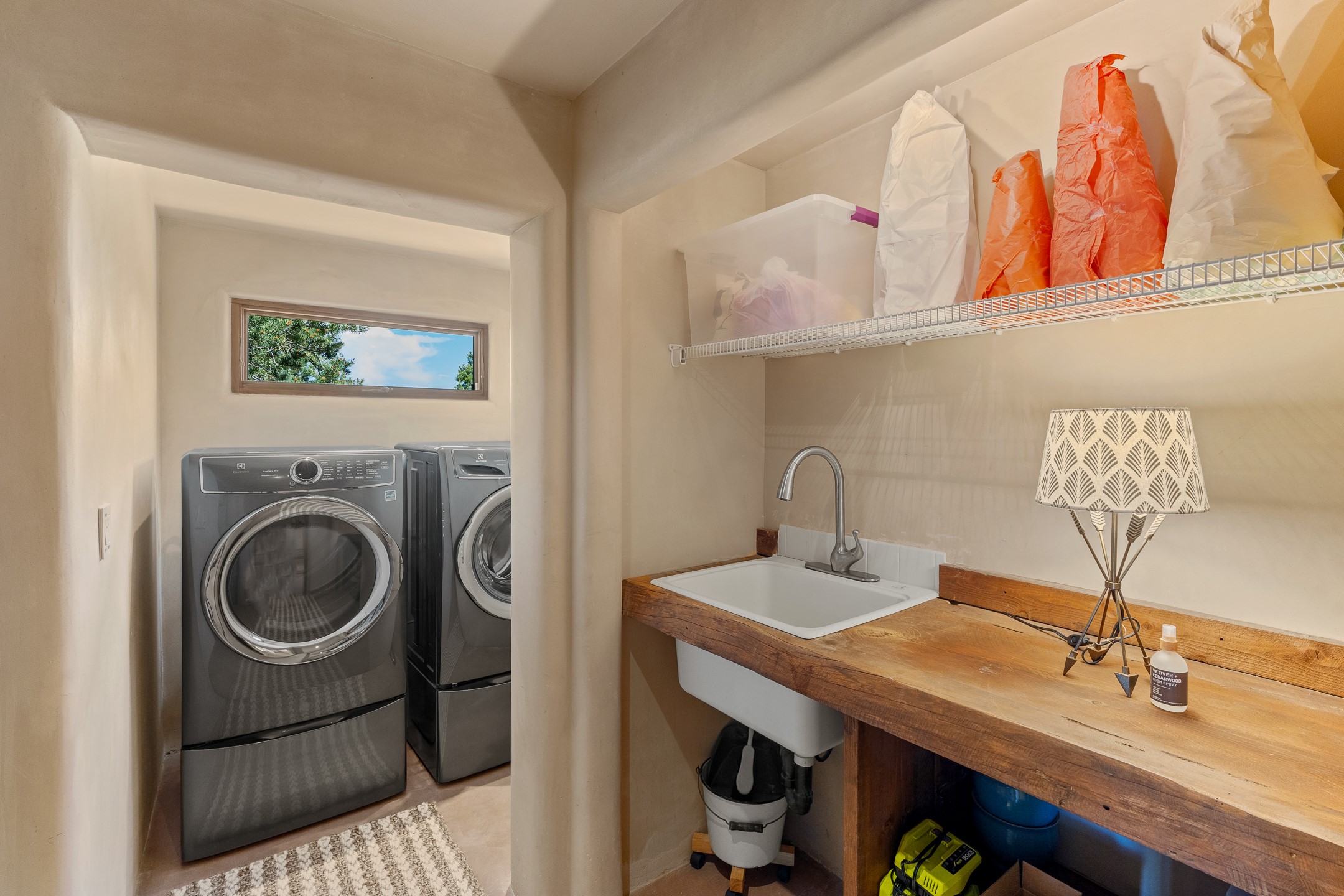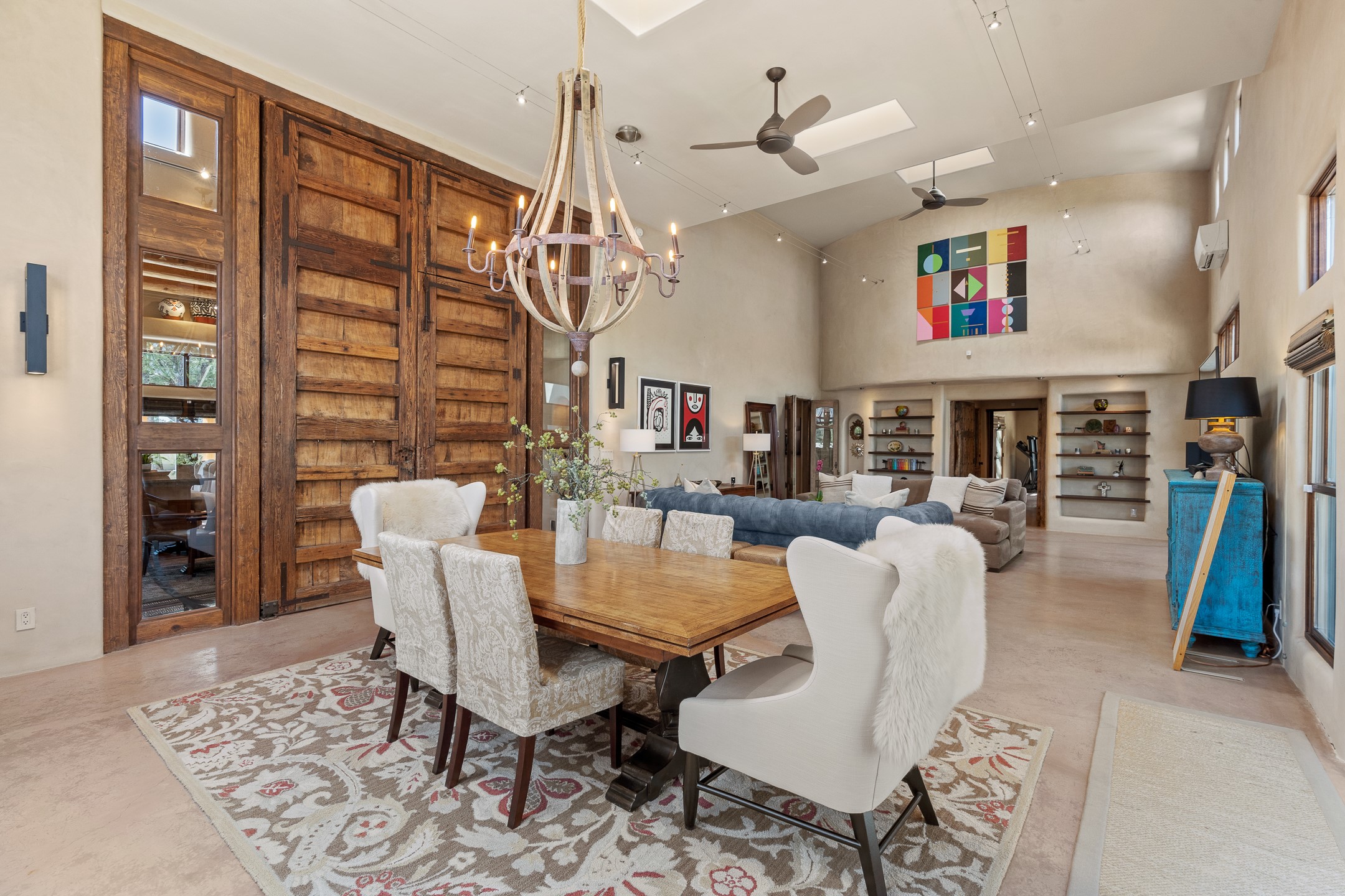 Beautifully sited on 2.5 acres in the foothills of the Sangre de Cristo Mountains, this stunning 3,836 sq. ft. home is a rare blend of traditional Santa Fe style, modern updates, and artistic provenance. Just 12 minutes from the historic Santa Fe Plaza, the property offers beautiful views of the Sangres, Jemez and Sandia Mountains, city lights, and Santa Fe's glorious sunsets. Originally built as a studio for the renowned Native American artist Bruce LaFountain and reimagined in 2001, the home has a distinct soul and history--including its appearance in a feature film. Every detail has been curated with intention, from the antique solid wood doors sourced from La Puerta Originals to the custom American Clay plaster walls, soaring ceilings, exposed vigas and rich natural light throughout. At the heart of the home is a chef's kitchen outfitted with center island, a built-in coffee wet bar with wine refrigerator, and an inviting intimate sitting area centered around a traditional kiva fireplace. This space flows seamlessly to a pergola-covered entertaining patio--ideal for grilling and relaxation. Towering ceilings grace the living room and dining room which also showcases stunning 14-foot antique doors from a Spanish Church and is connected to a spacious view patio ideal for entertaining and taking in the peace and drama of the skies and mountains. The primary suite is located upstairs and features a den/study as well as a spa like bath and a private roof top area with direct access from both the bedroom and bath. The downstairs guest area is separated for ultimate privacy area with each room having direct access to an outdoor space perfect for getting away from it all. Additional highlights include radiant in-floor heating, mini-splits for instant heating and cooling and over $200,000 in thoughtful improvements ensuring ease of living--highlighted by a new boiler and hot water heater, newer roof, newer stucco, newer washer and dryer. An optional designer furniture package is available for purchase, making this extraordinary home move-in ready for those seeking authenticity, elegance, and a true sense of place.