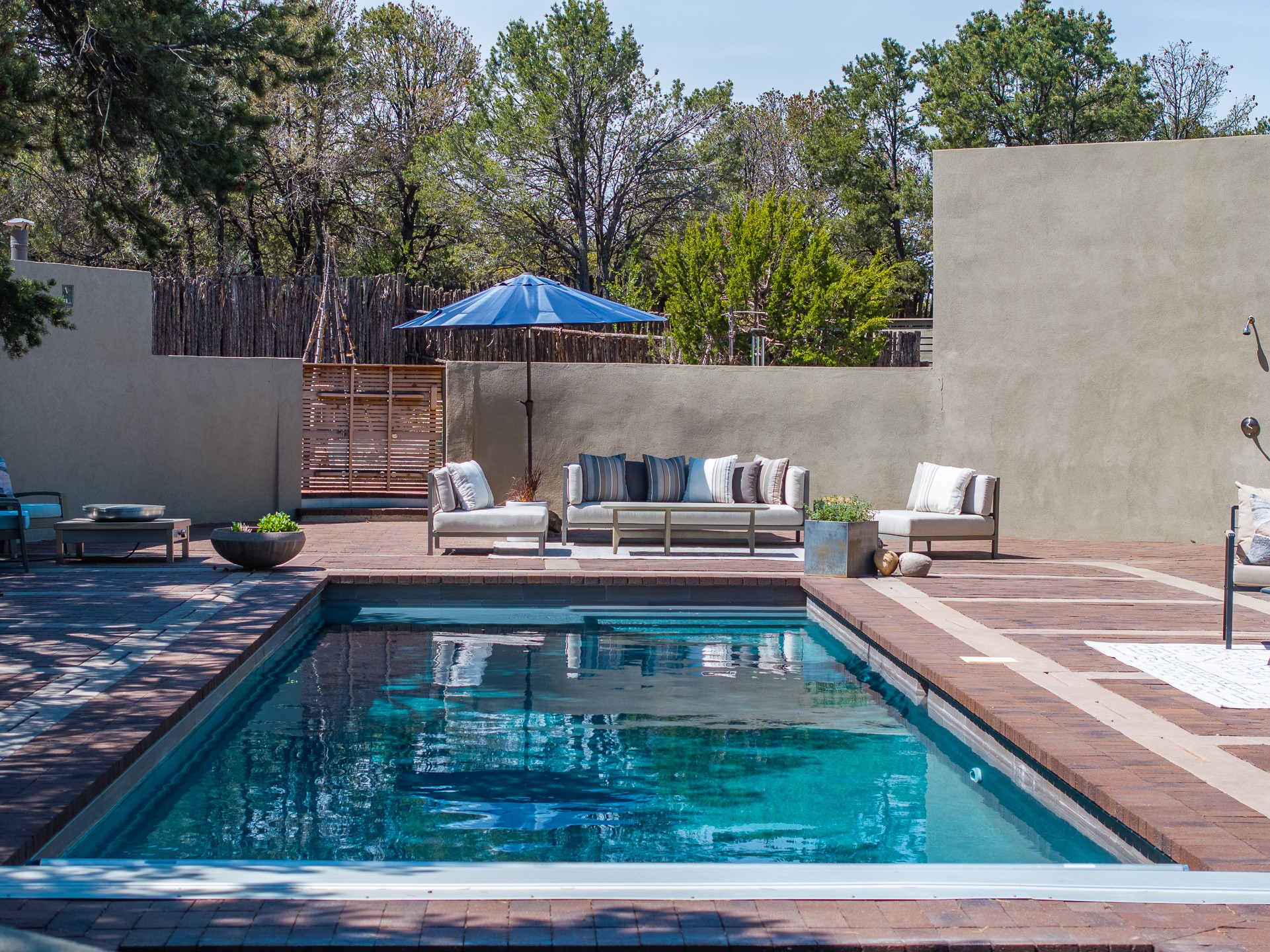 Modern Santa Fe Retreat with Pool, Hot Tub & Sauna on 1.9 Acres. Discover contemporary comfort just off Old Santa Fe Trail. This beautifully designed 4-bedroom, 4-bathroom home offers approx. 3,900 sq. ft. of stylish living space on 1.9 private acres--just 10 minutes from the Santa Fe Plaza. Enjoy a light-filled, open-concept living and dining area with large picture windows that frame views of the expansive backyard, complete with a patio, swimming pool, and hot tub--ideal for entertaining or relaxing under the New Mexico sky. The gourmet kitchen features high-end appliances, plenty of natural light, and a modern layout perfect for cooking and gathering. The spacious primary suite flows into a versatile open area--ideal as a family room, home office, or art studio. Downstairs, three guest bedrooms share a luxurious full bathroom. At the end of the hall is a separate fully finished basement perfect for a family room/game room which includes ample storage space. Adjoining the family room is a cedar sauna and bath for spa-like relaxation. The 1.9 acre lot is adorned by a pinon forest with serene walking trails which connect to the trails of the Mountain Cloud Zen center and the foothills of Santa Fe. This neighborhood boasts the fastest internet in Santa Fe. Whether you're looking for a full-time residence with the perfect work from home environment or a serene escape, this home blends modern amenities with the peaceful charm of Santa Fe living.