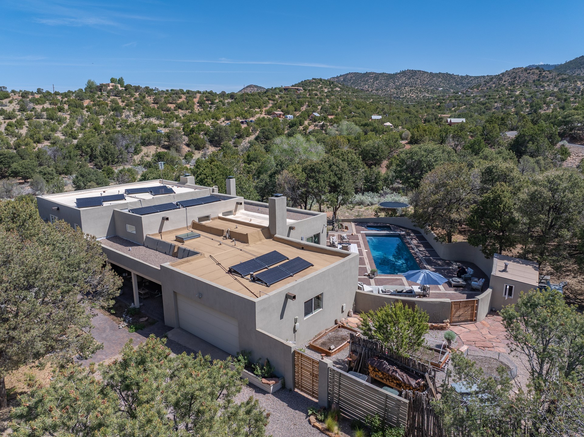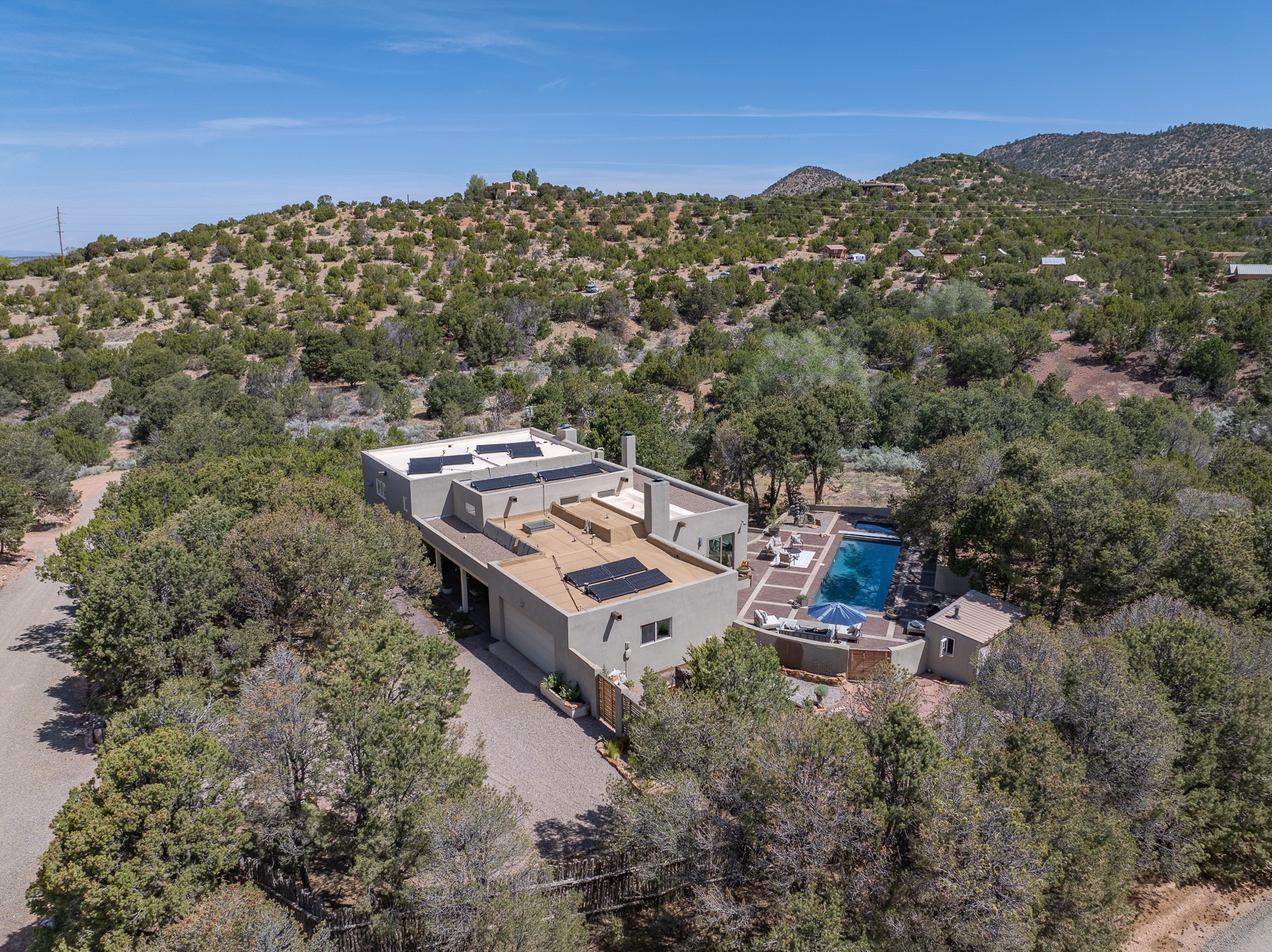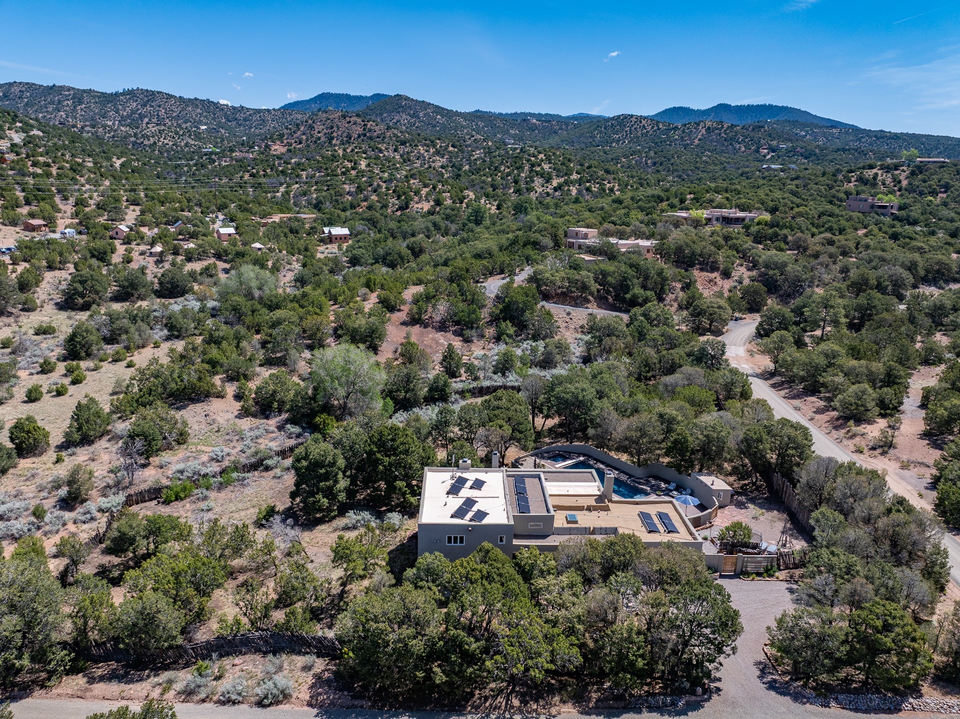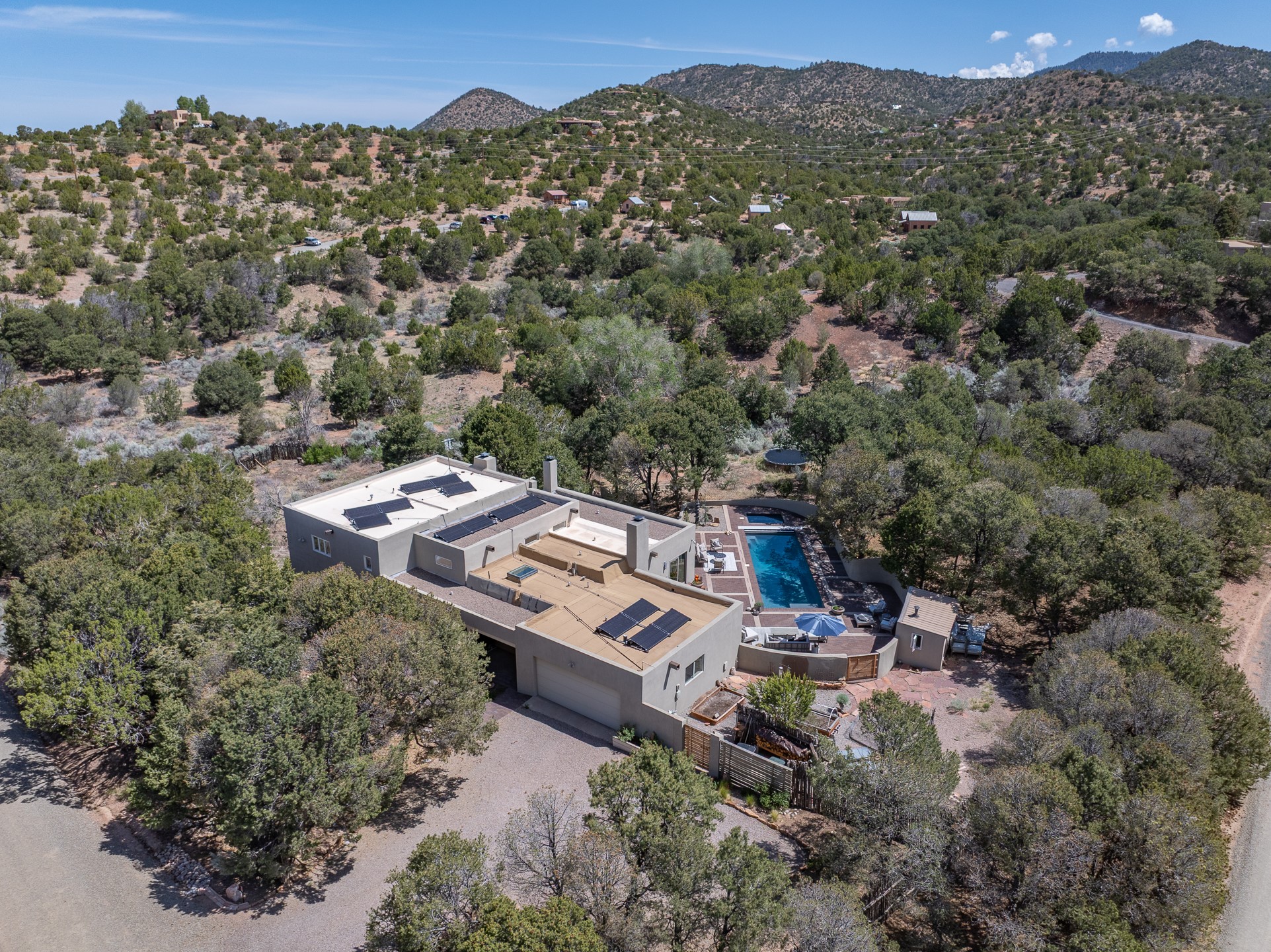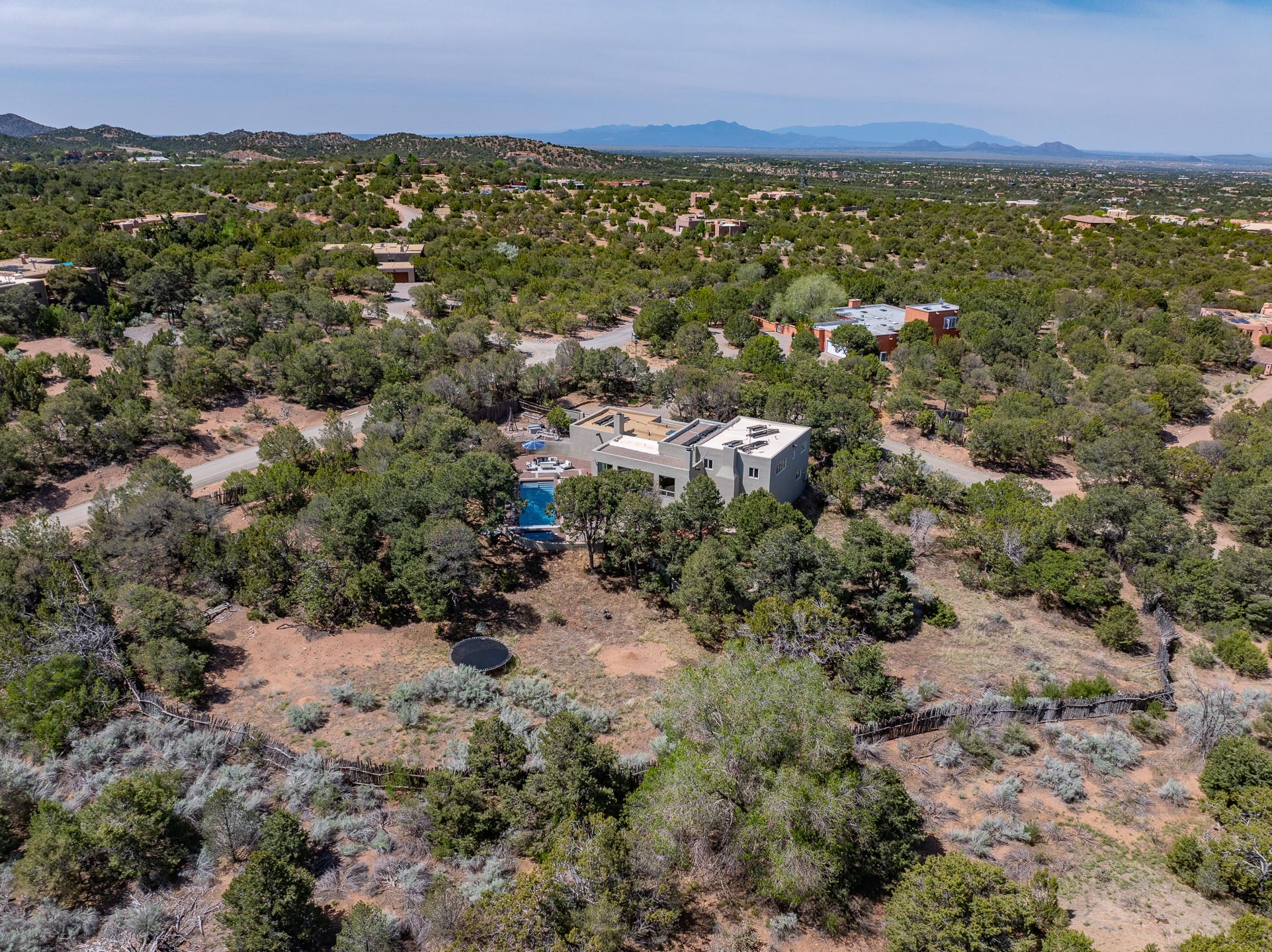 Modern Santa Fe Retreat with Pool, Hot Tub & Sauna on 1.9 Acres. Discover contemporary comfort just off Old Santa Fe Trail. This beautifully designed 4-bedroom, 4-bathroom home offers approx. 3,900 sq. ft. of stylish living space on 1.9 private acres--just 10 minutes from the Santa Fe Plaza. Enjoy a light-filled, open-concept living and dining area with large picture windows that frame views of the expansive backyard, complete with a patio, swimming pool, and hot tub--ideal for entertaining or relaxing under the New Mexico sky. The gourmet kitchen features high-end appliances, plenty of natural light, and a modern layout perfect for cooking and gathering. The spacious primary suite flows into a versatile open area--ideal as a family room, home office, or art studio. Downstairs, three guest bedrooms share a luxurious full bathroom. At the end of the hall is a separate fully finished basement perfect for a family room/game room which includes ample storage space. Adjoining the family room is a cedar sauna and bath for spa-like relaxation. The 1.9 acre lot is adorned by a pinon forest with serene walking trails which connect to the trails of the Mountain Cloud Zen center and the foothills of Santa Fe. This neighborhood boasts the fastest internet in Santa Fe. Whether you're looking for a full-time residence with the perfect work from home environment or a serene escape, this home blends modern amenities with the peaceful charm of Santa Fe living.