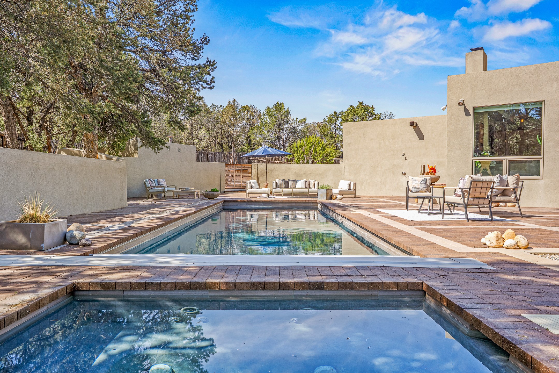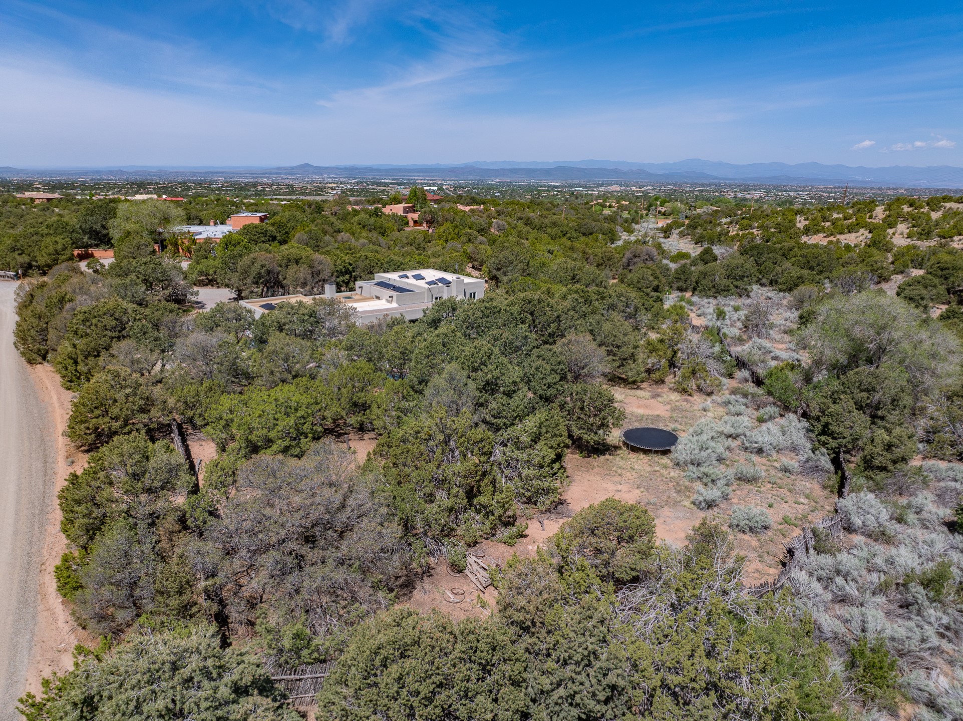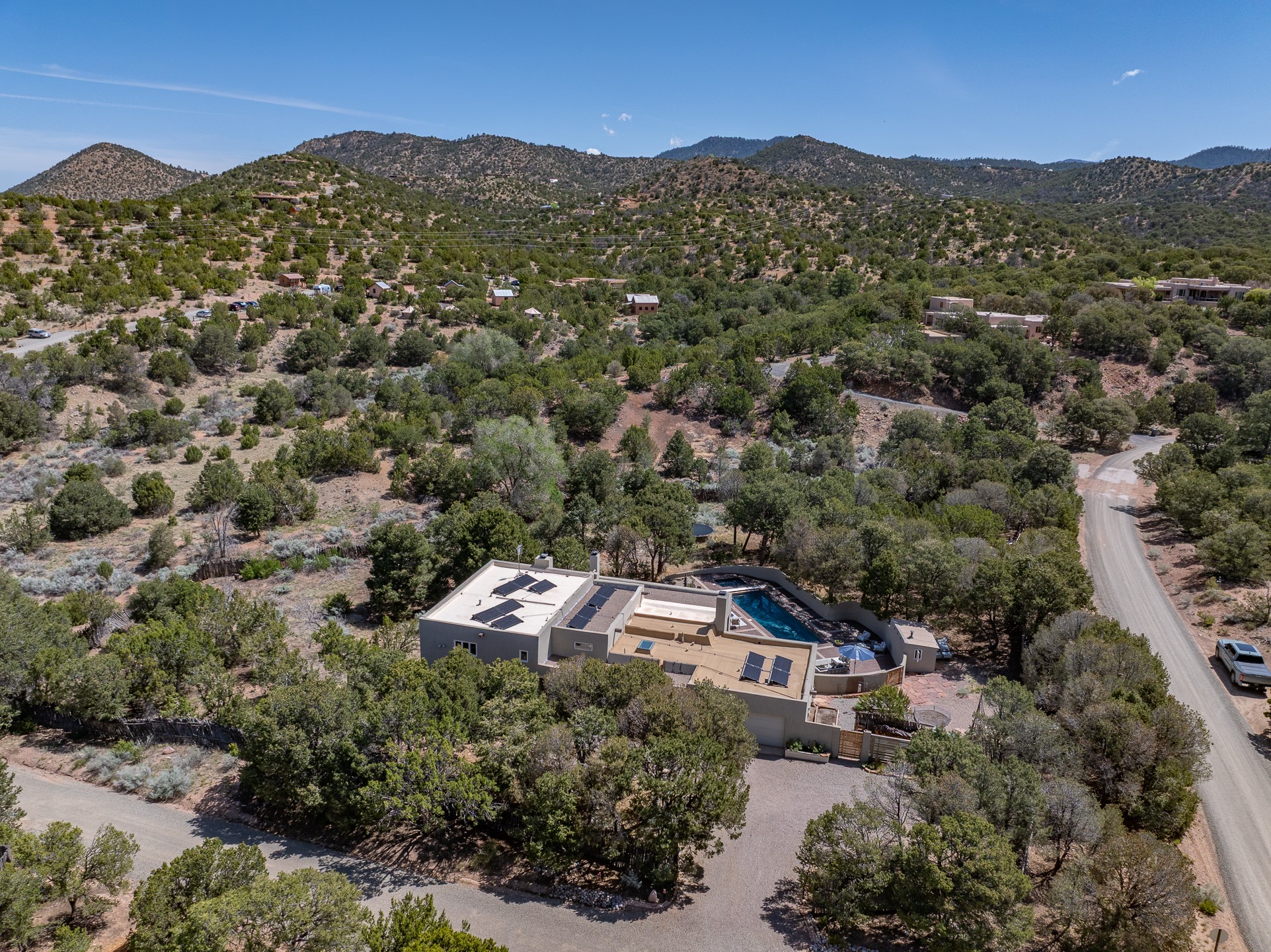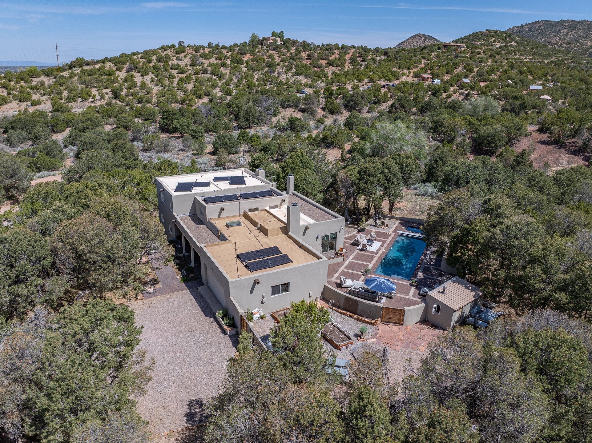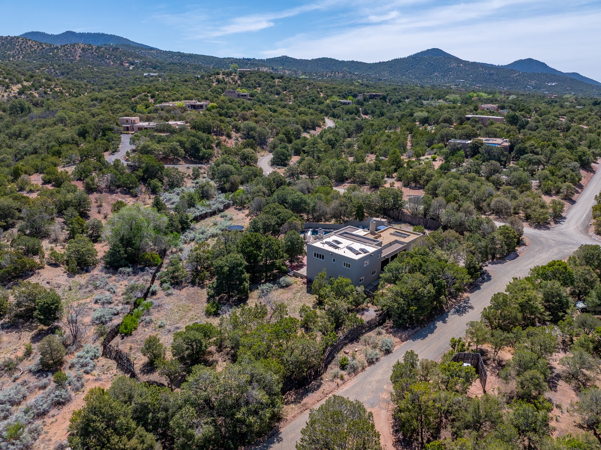 Modern Santa Fe Retreat with Pool, Hot Tub & Sauna on 1.9 Acres. Discover contemporary comfort just off Old Santa Fe Trail. This beautifully designed 4-bedroom, 4-bathroom home offers approx. 3,900 sq. ft. of stylish living space on 1.9 private acres--just 10 minutes from the Santa Fe Plaza. Enjoy a light-filled, open-concept living and dining area with large picture windows that frame views of the expansive backyard, complete with a patio, swimming pool, and hot tub--ideal for entertaining or relaxing under the New Mexico sky. The gourmet kitchen features high-end appliances, plenty of natural light, and a modern layout perfect for cooking and gathering. The spacious primary suite flows into a versatile open area--ideal as a family room, home office, or art studio. Downstairs, three guest bedrooms share a luxurious full bathroom. At the end of the hall is a separate fully finished basement perfect for a family room/game room which includes ample storage space. Adjoining the family room is a cedar sauna and bath for spa-like relaxation. The 1.9 acre lot is adorned by a pinon forest with serene walking trails which connect to the trails of the Mountain Cloud Zen center and the foothills of Santa Fe. This neighborhood boasts the fastest internet in Santa Fe. Whether you're looking for a full-time residence with the perfect work from home environment or a serene escape, this home blends modern amenities with the peaceful charm of Santa Fe living.