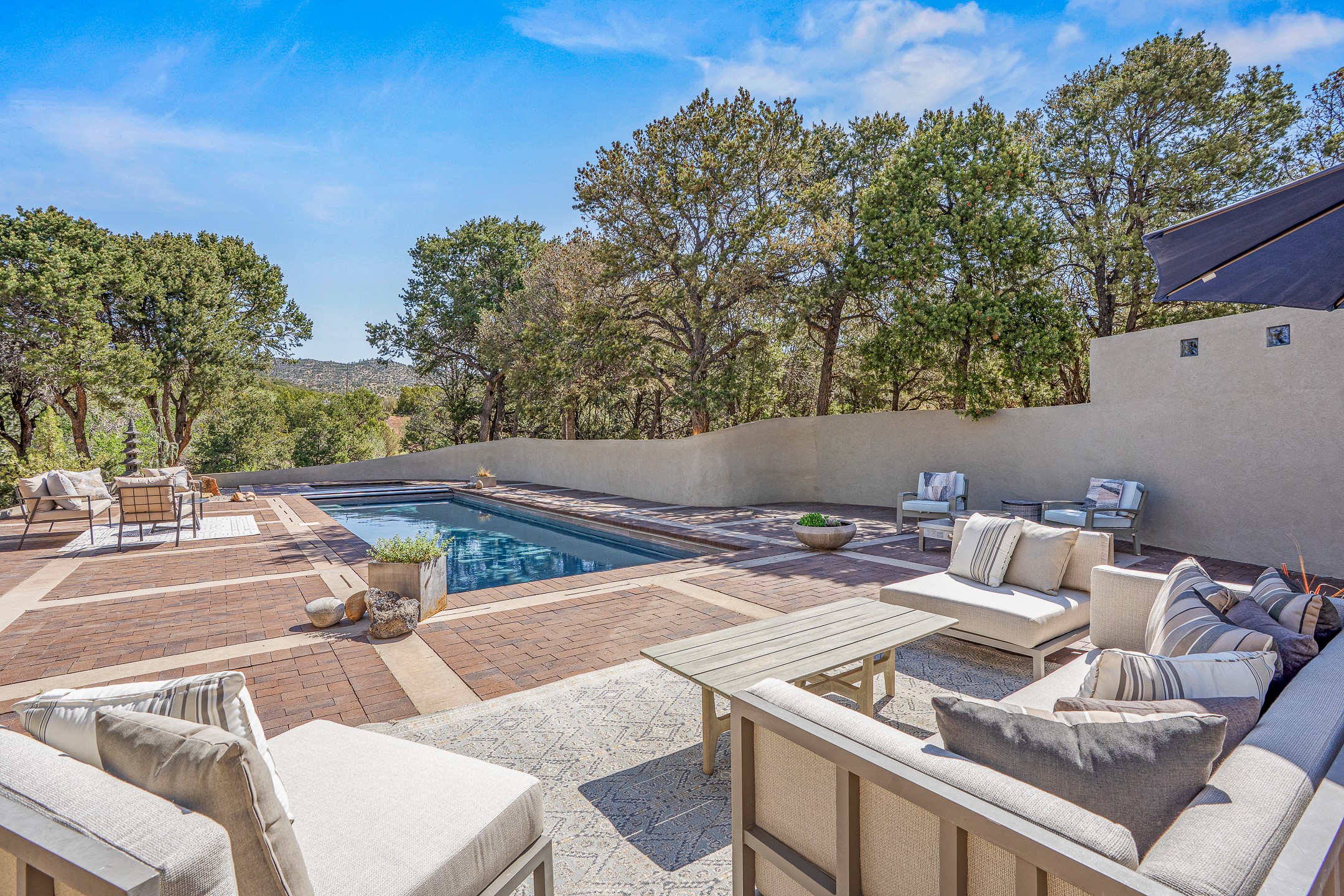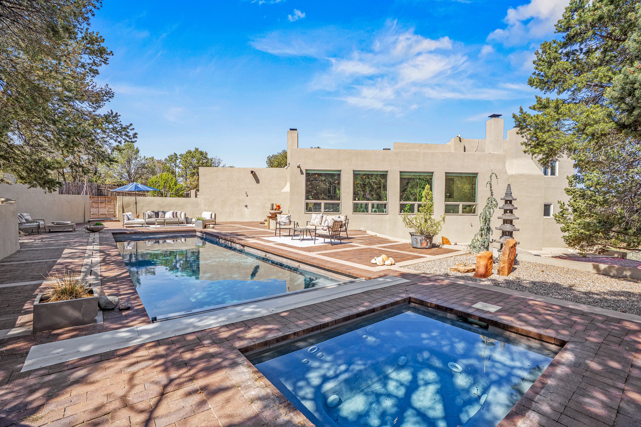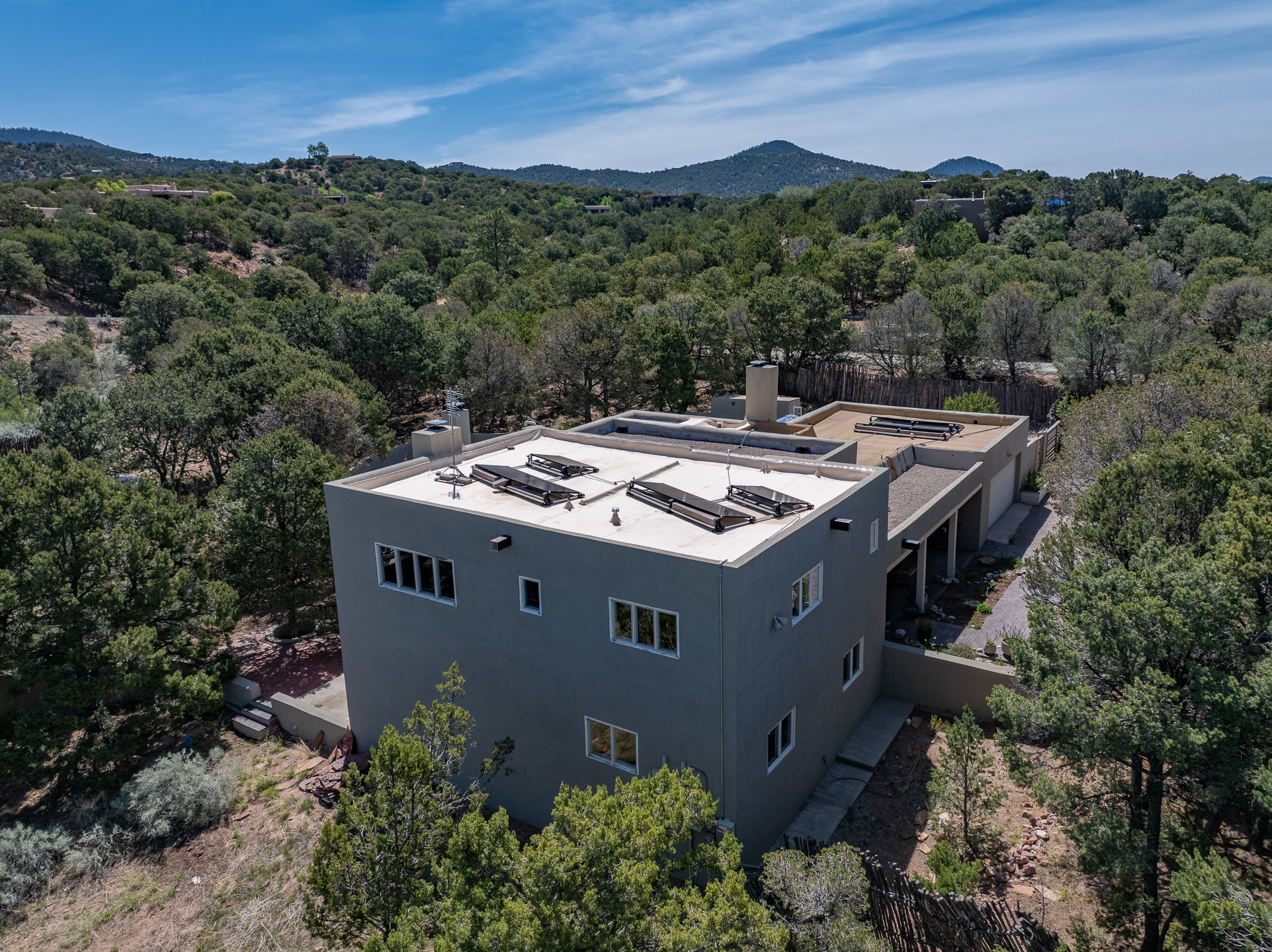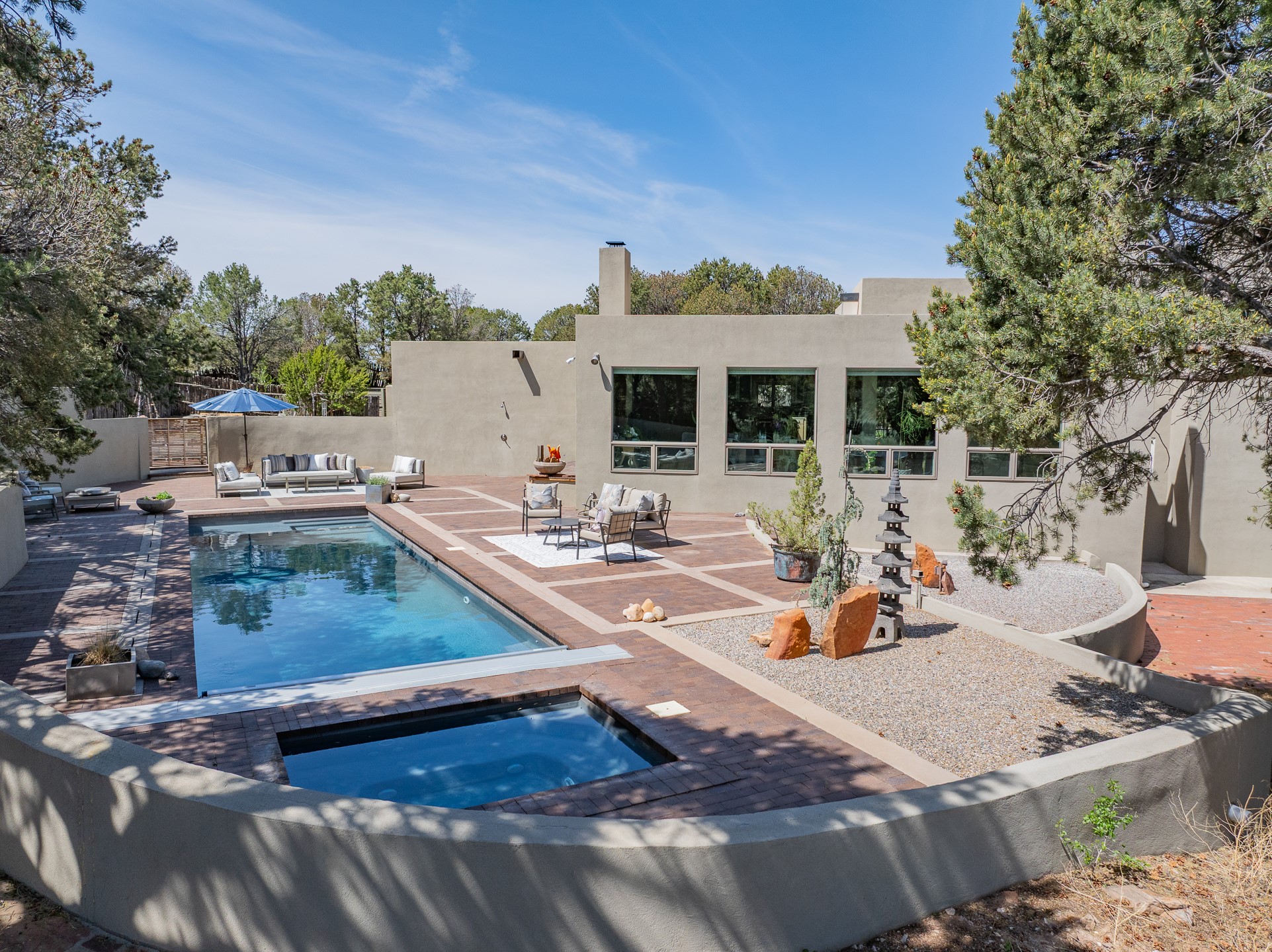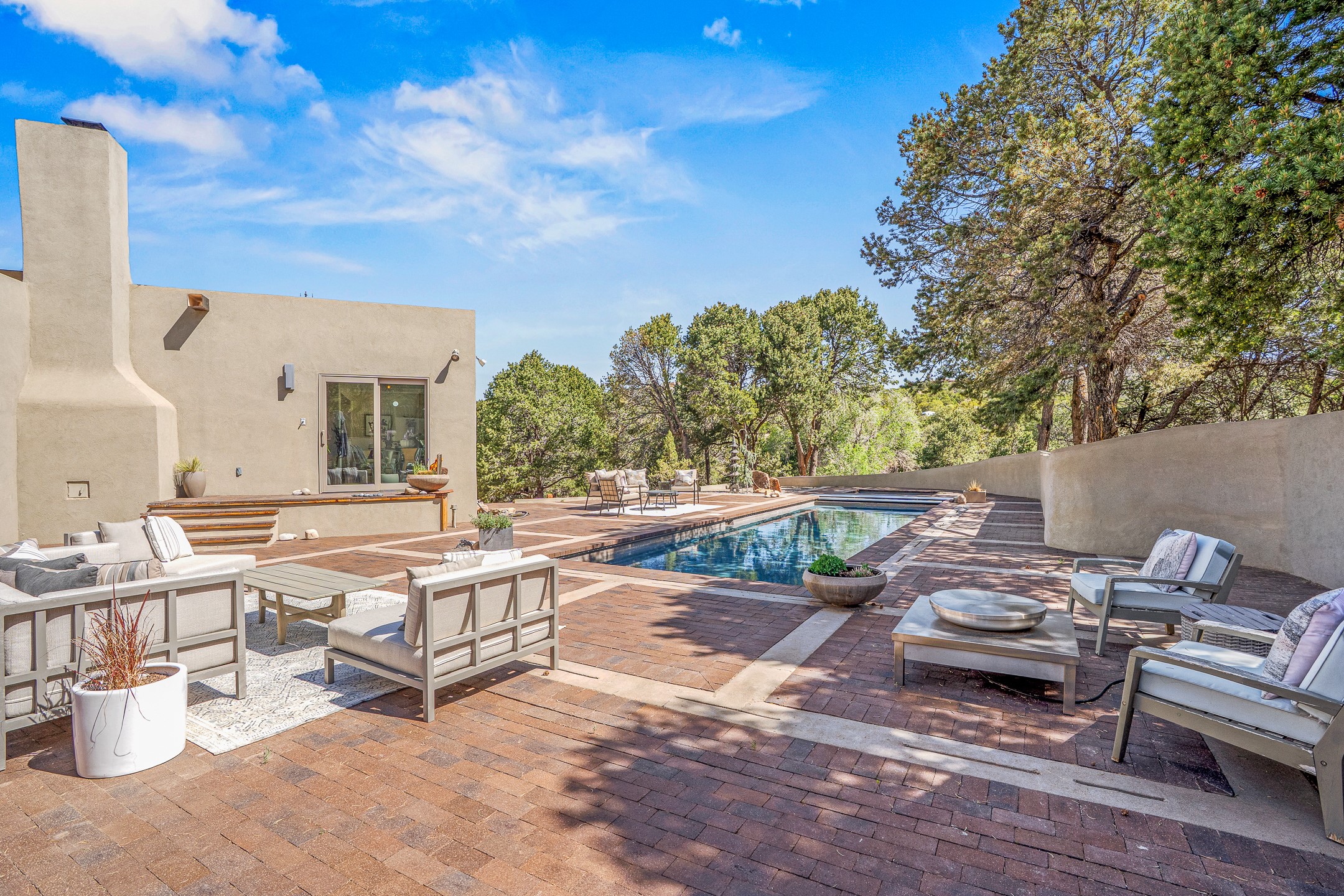 Modern Santa Fe Retreat with Pool, Hot Tub & Sauna on 1.9 Acres. Discover contemporary comfort just off Old Santa Fe Trail. This beautifully designed 4-bedroom, 4-bathroom home offers approx. 3,900 sq. ft. of stylish living space on 1.9 private acres--just 10 minutes from the Santa Fe Plaza. Enjoy a light-filled, open-concept living and dining area with large picture windows that frame views of the expansive backyard, complete with a patio, swimming pool, and hot tub--ideal for entertaining or relaxing under the New Mexico sky. The gourmet kitchen features high-end appliances, plenty of natural light, and a modern layout perfect for cooking and gathering. The spacious primary suite flows into a versatile open area--ideal as a family room, home office, or art studio. Downstairs, three guest bedrooms share a luxurious full bathroom. At the end of the hall is a separate fully finished basement perfect for a family room/game room which includes ample storage space. Adjoining the family room is a cedar sauna and bath for spa-like relaxation. The 1.9 acre lot is adorned by a pinon forest with serene walking trails which connect to the trails of the Mountain Cloud Zen center and the foothills of Santa Fe. This neighborhood boasts the fastest internet in Santa Fe. Whether you're looking for a full-time residence with the perfect work from home environment or a serene escape, this home blends modern amenities with the peaceful charm of Santa Fe living.