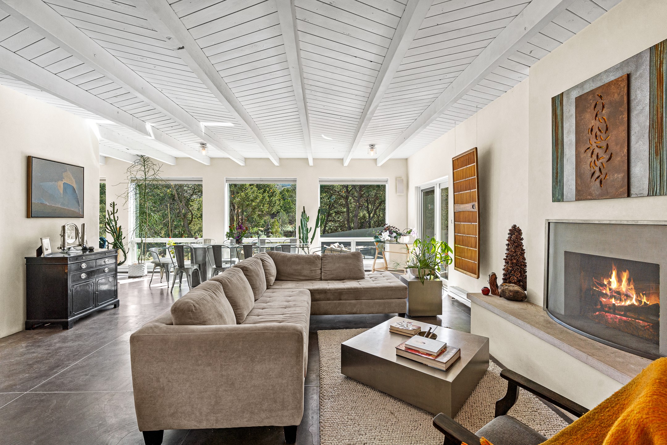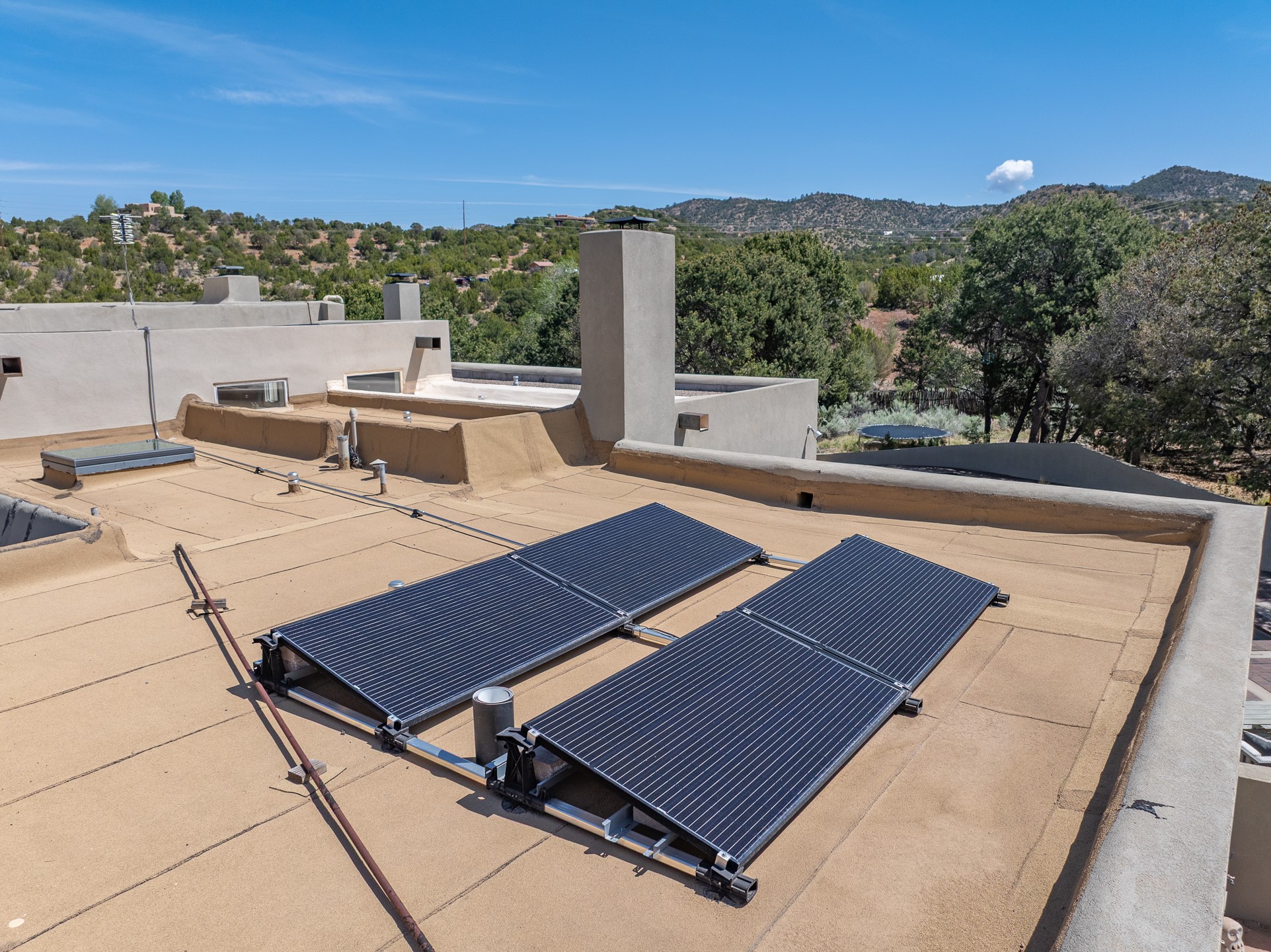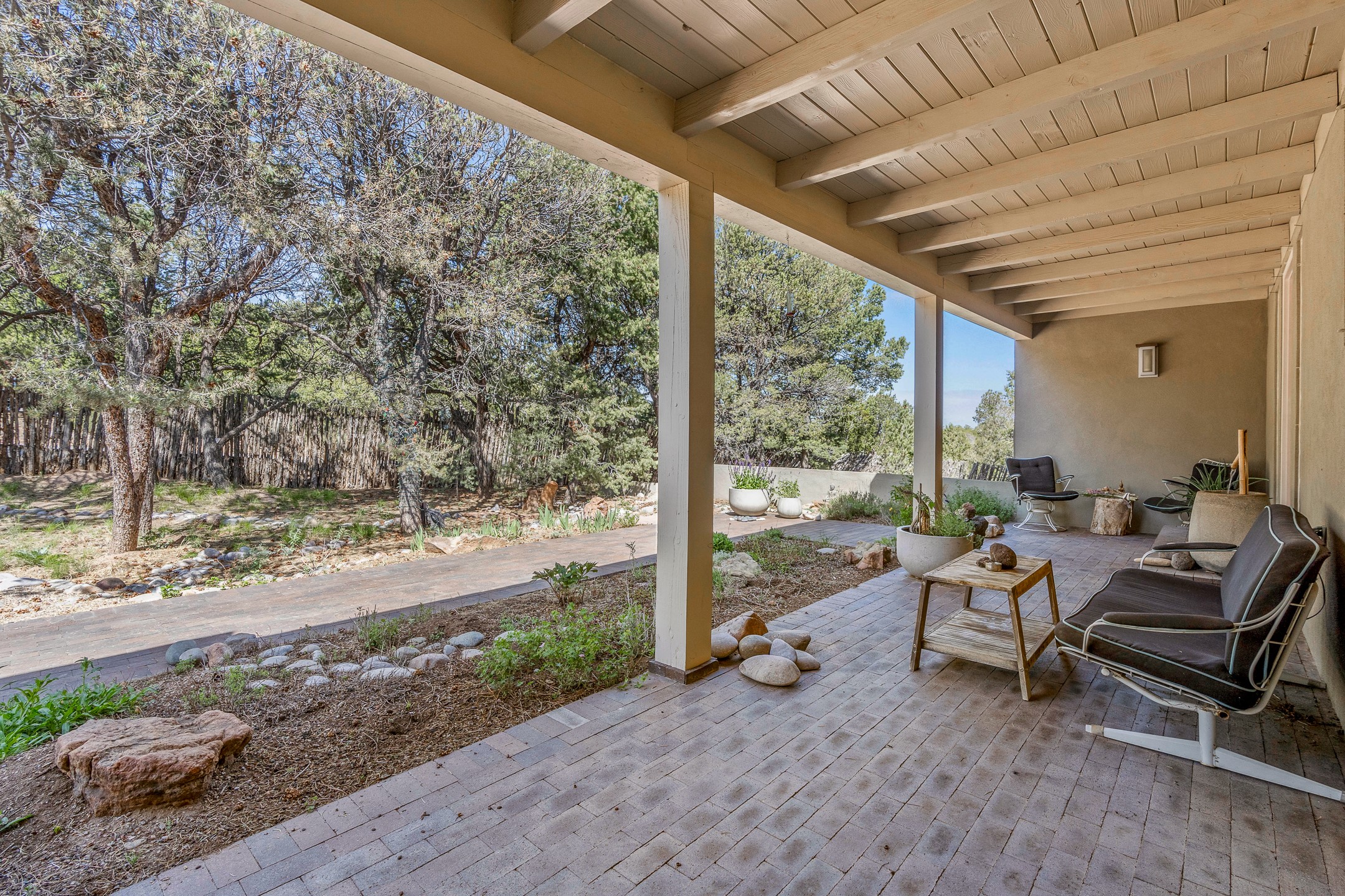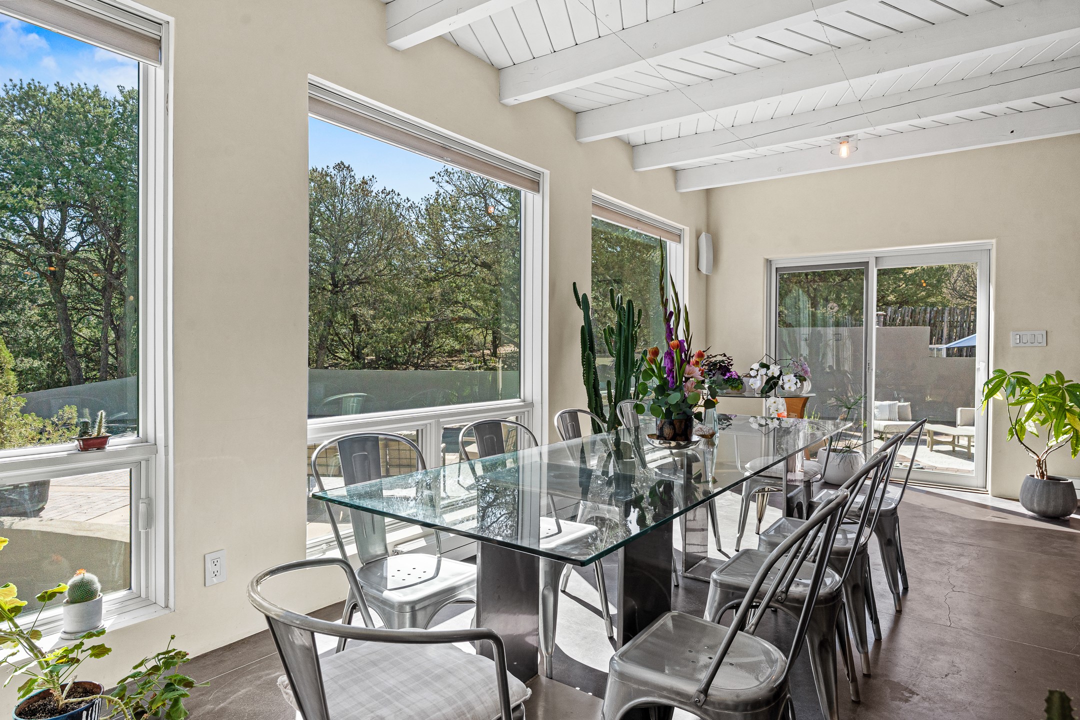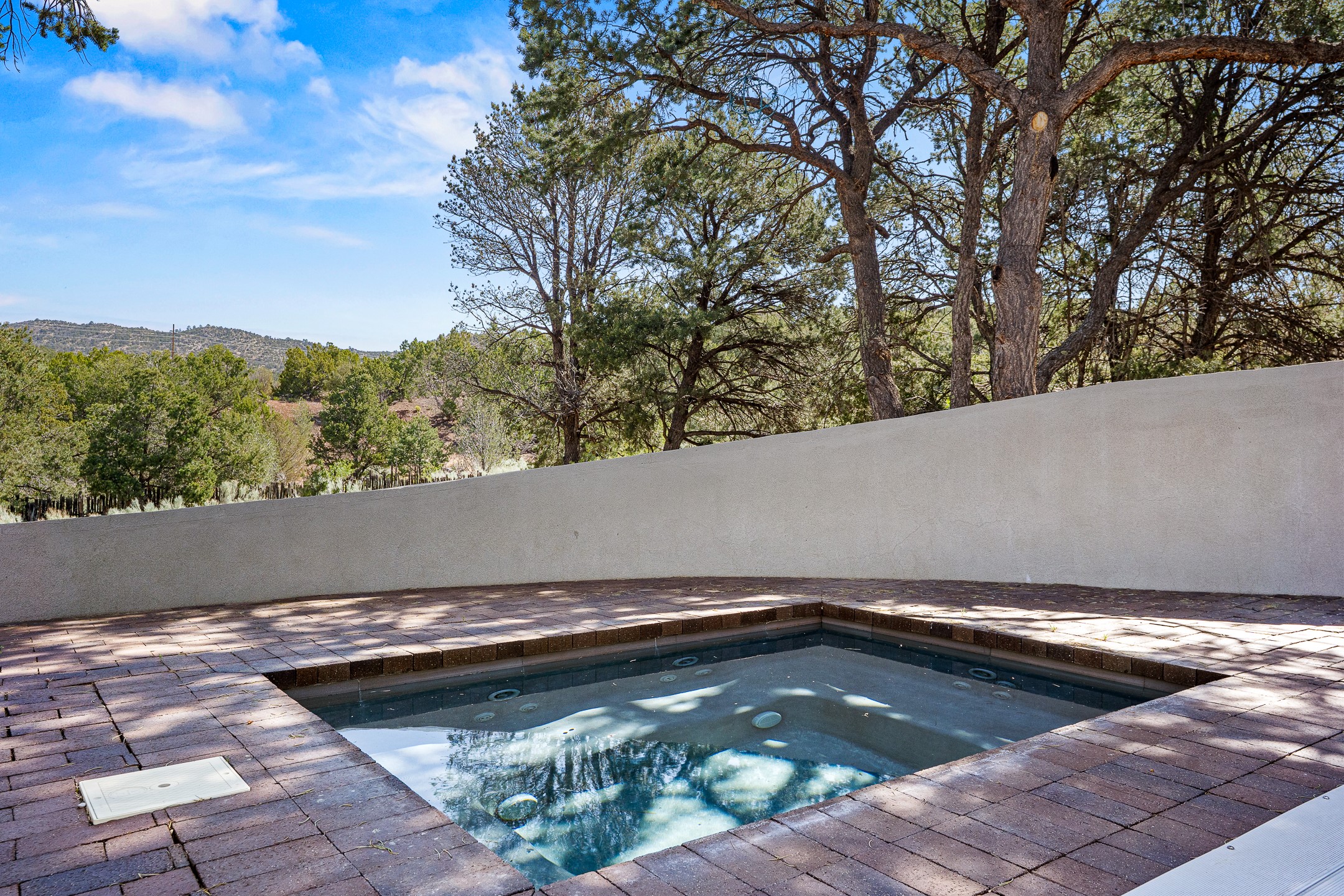 Modern Santa Fe Retreat with Pool, Hot Tub & Sauna on 1.9 Acres. Discover contemporary comfort just off Old Santa Fe Trail. This beautifully designed 4-bedroom, 4-bathroom home offers approx. 3,900 sq. ft. of stylish living space on 1.9 private acres--just 10 minutes from the Santa Fe Plaza. Enjoy a light-filled, open-concept living and dining area with large picture windows that frame views of the expansive backyard, complete with a patio, swimming pool, and hot tub--ideal for entertaining or relaxing under the New Mexico sky. The gourmet kitchen features high-end appliances, plenty of natural light, and a modern layout perfect for cooking and gathering. The spacious primary suite flows into a versatile open area--ideal as a family room, home office, or art studio. Downstairs, three guest bedrooms share a luxurious full bathroom. At the end of the hall is a separate fully finished basement perfect for a family room/game room which includes ample storage space. Adjoining the family room is a cedar sauna and bath for spa-like relaxation. The 1.9 acre lot is adorned by a pinon forest with serene walking trails which connect to the trails of the Mountain Cloud Zen center and the foothills of Santa Fe. This neighborhood boasts the fastest internet in Santa Fe. Whether you're looking for a full-time residence with the perfect work from home environment or a serene escape, this home blends modern amenities with the peaceful charm of Santa Fe living.