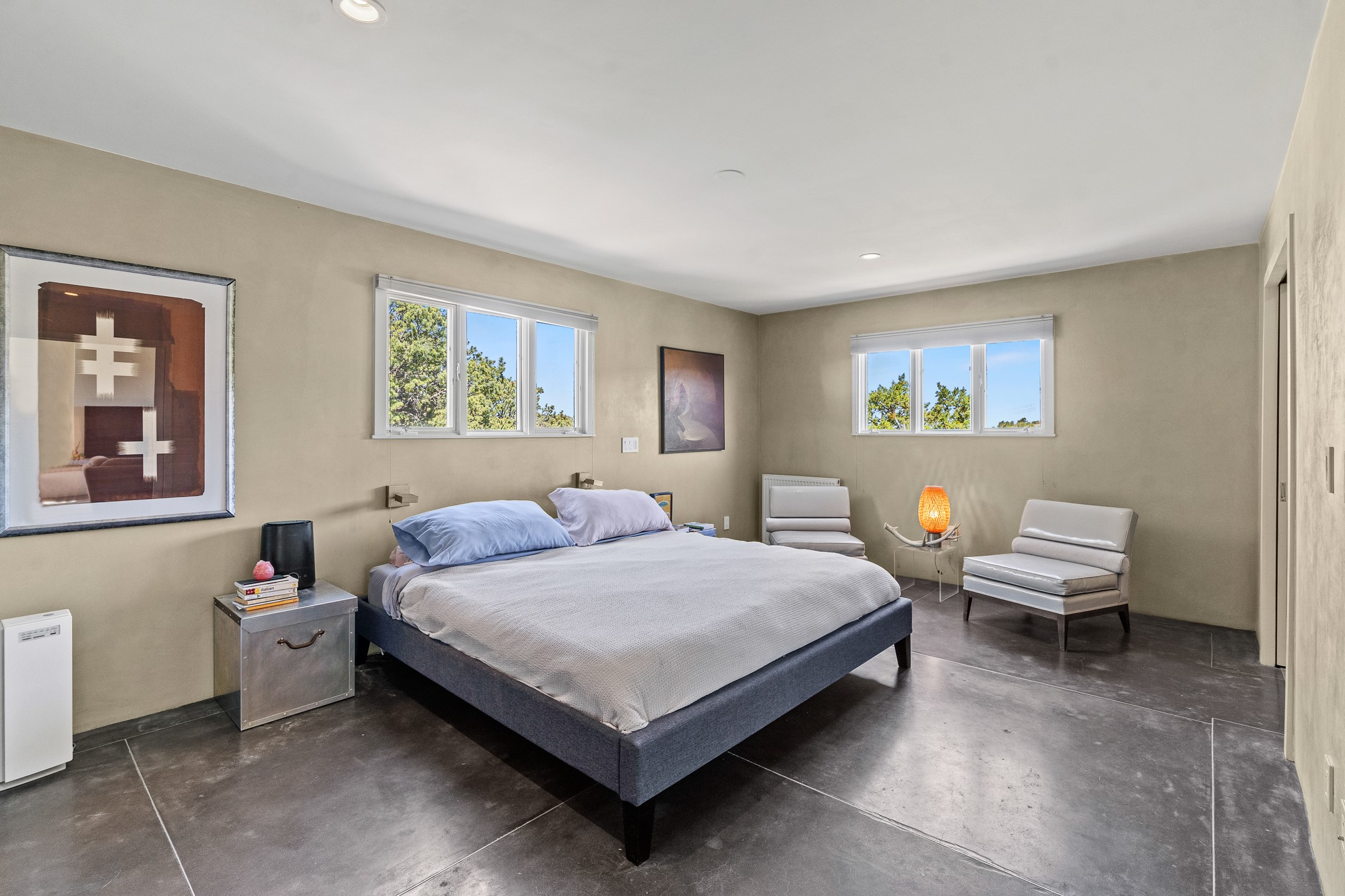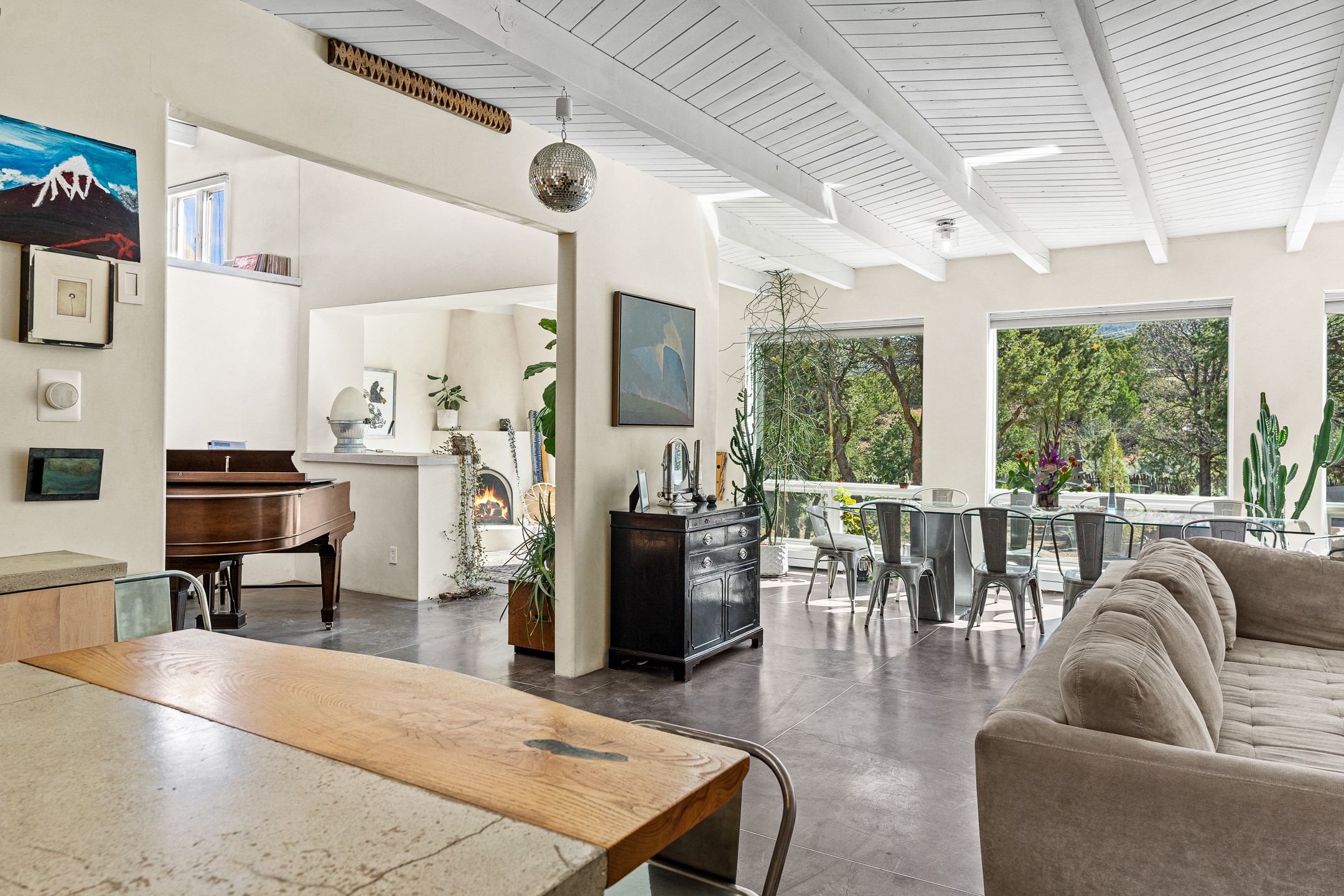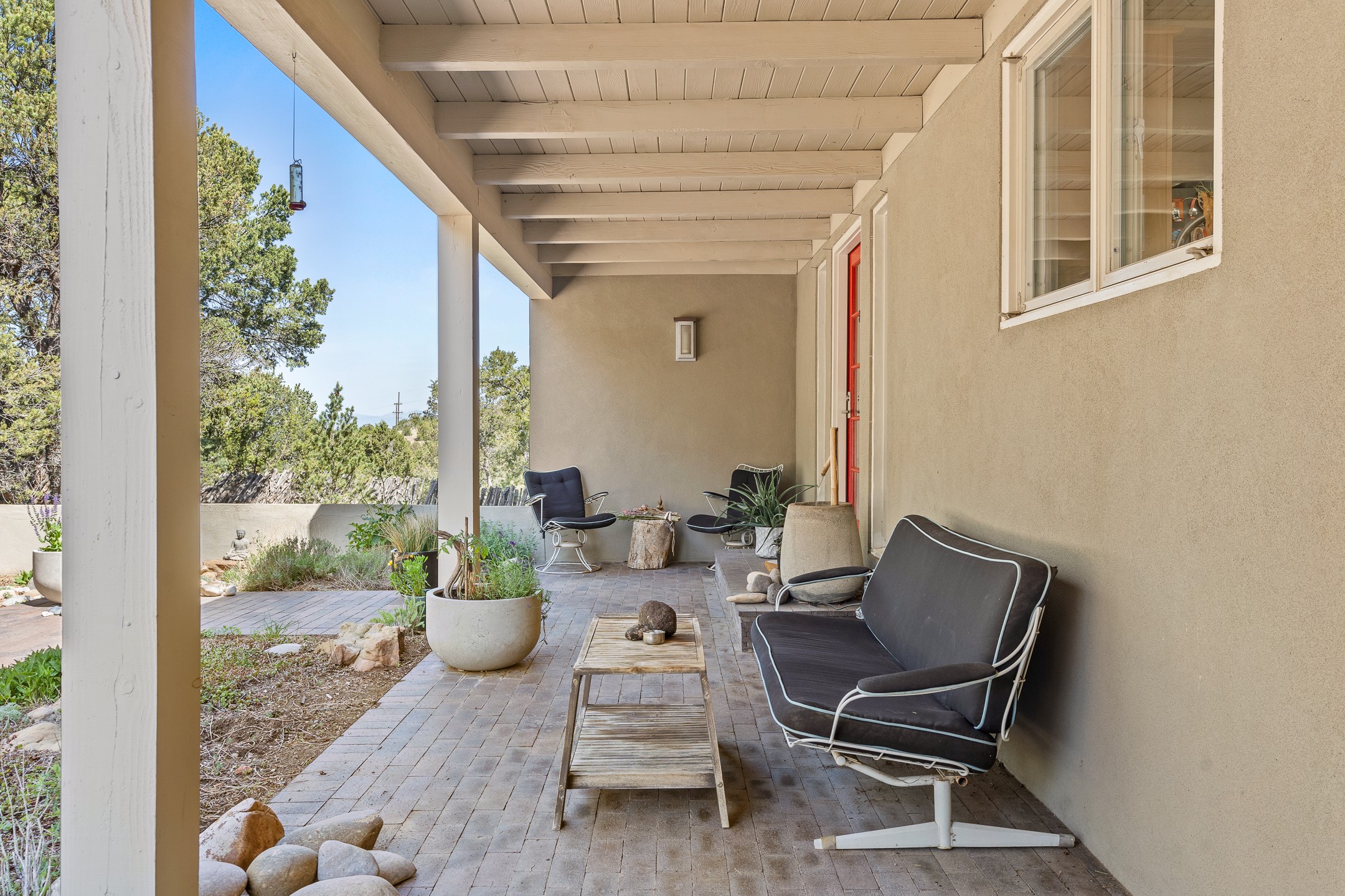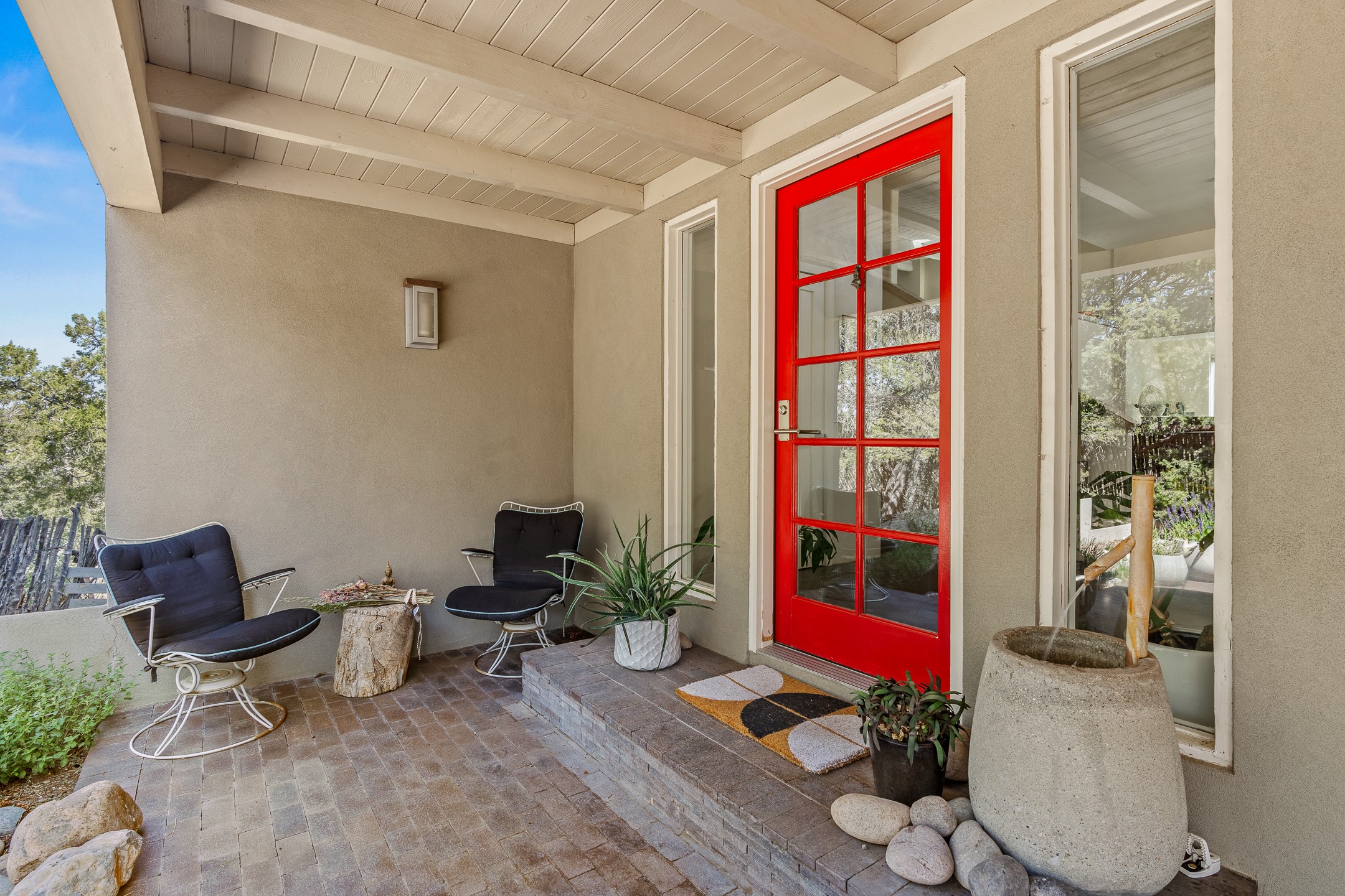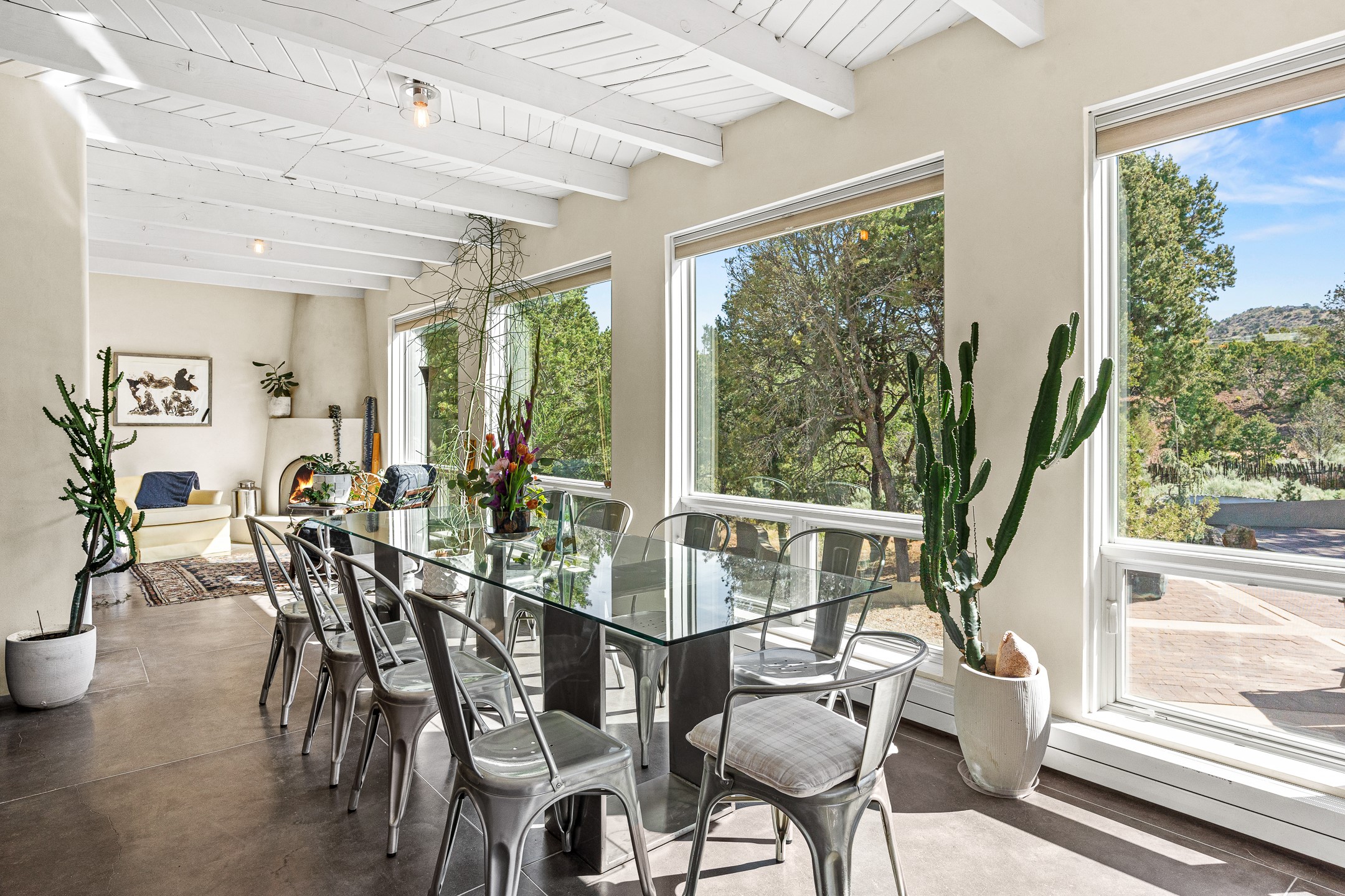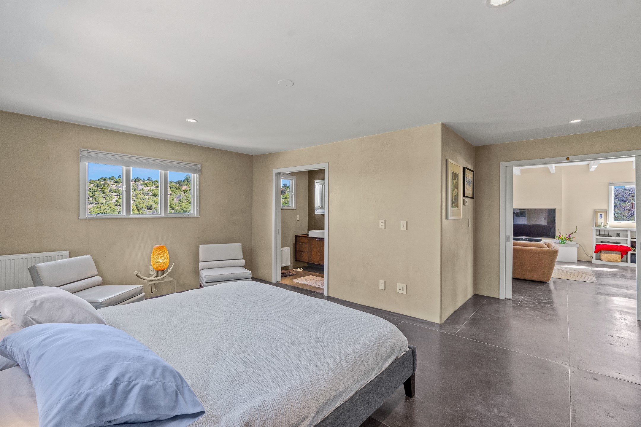 Modern Santa Fe Retreat with Pool, Hot Tub & Sauna on 1.9 Acres. Discover contemporary comfort just off Old Santa Fe Trail. This beautifully designed 4-bedroom, 4-bathroom home offers approx. 3,900 sq. ft. of stylish living space on 1.9 private acres--just 10 minutes from the Santa Fe Plaza. Enjoy a light-filled, open-concept living and dining area with large picture windows that frame views of the expansive backyard, complete with a patio, swimming pool, and hot tub--ideal for entertaining or relaxing under the New Mexico sky. The gourmet kitchen features high-end appliances, plenty of natural light, and a modern layout perfect for cooking and gathering. The spacious primary suite flows into a versatile open area--ideal as a family room, home office, or art studio. Downstairs, three guest bedrooms share a luxurious full bathroom. At the end of the hall is a separate fully finished basement perfect for a family room/game room which includes ample storage space. Adjoining the family room is a cedar sauna and bath for spa-like relaxation. The 1.9 acre lot is adorned by a pinon forest with serene walking trails which connect to the trails of the Mountain Cloud Zen center and the foothills of Santa Fe. This neighborhood boasts the fastest internet in Santa Fe. Whether you're looking for a full-time residence with the perfect work from home environment or a serene escape, this home blends modern amenities with the peaceful charm of Santa Fe living.