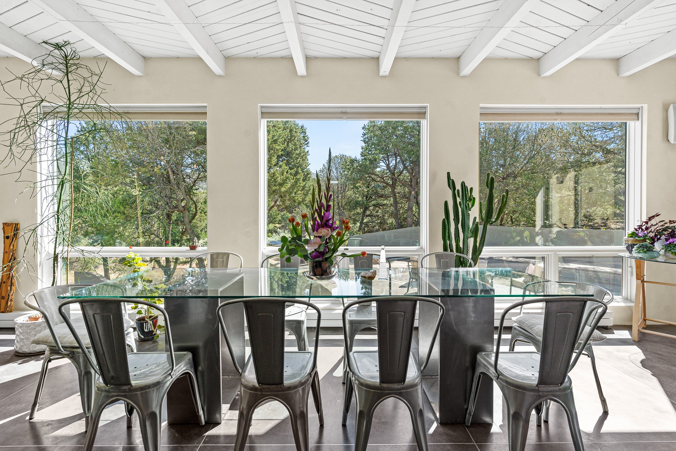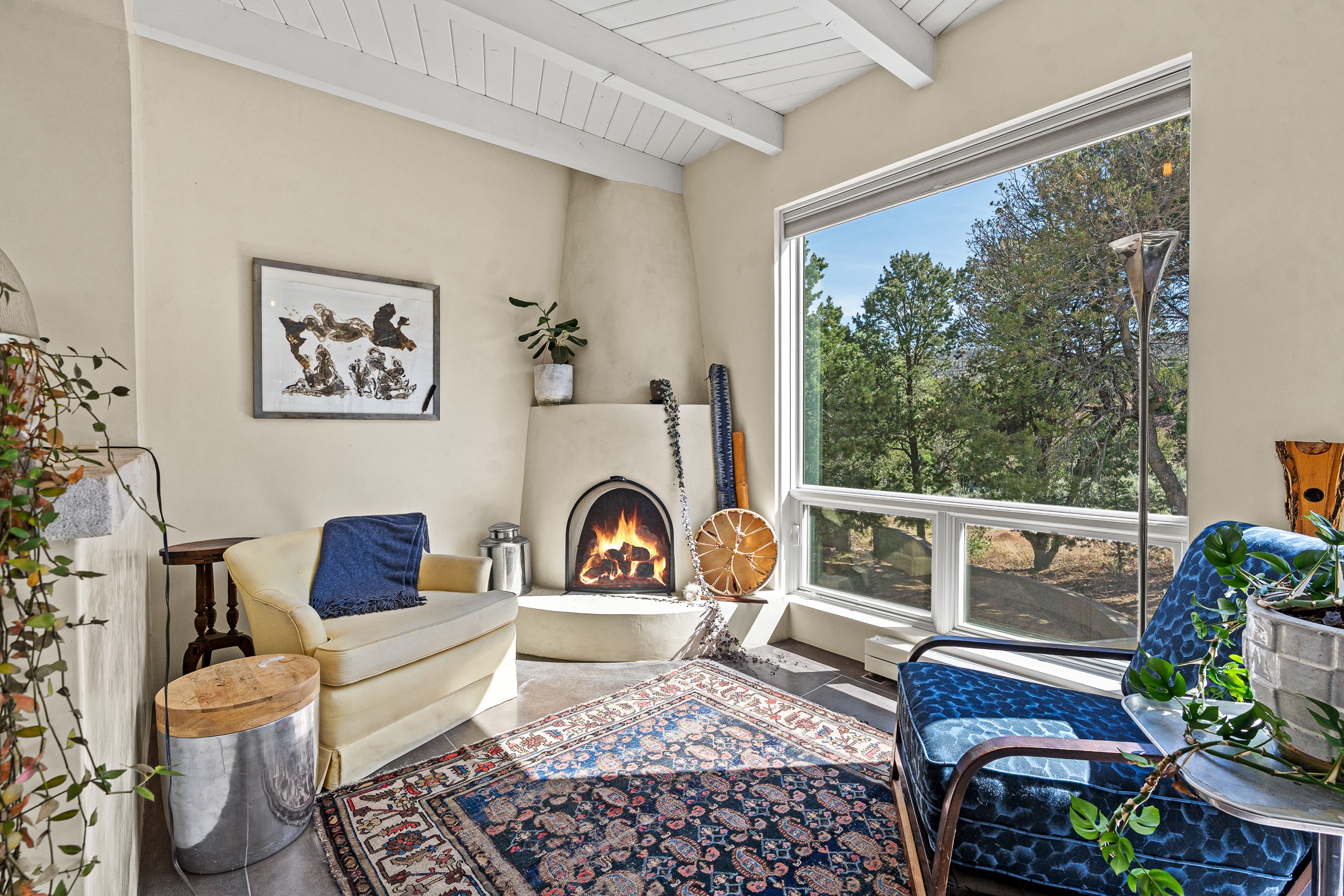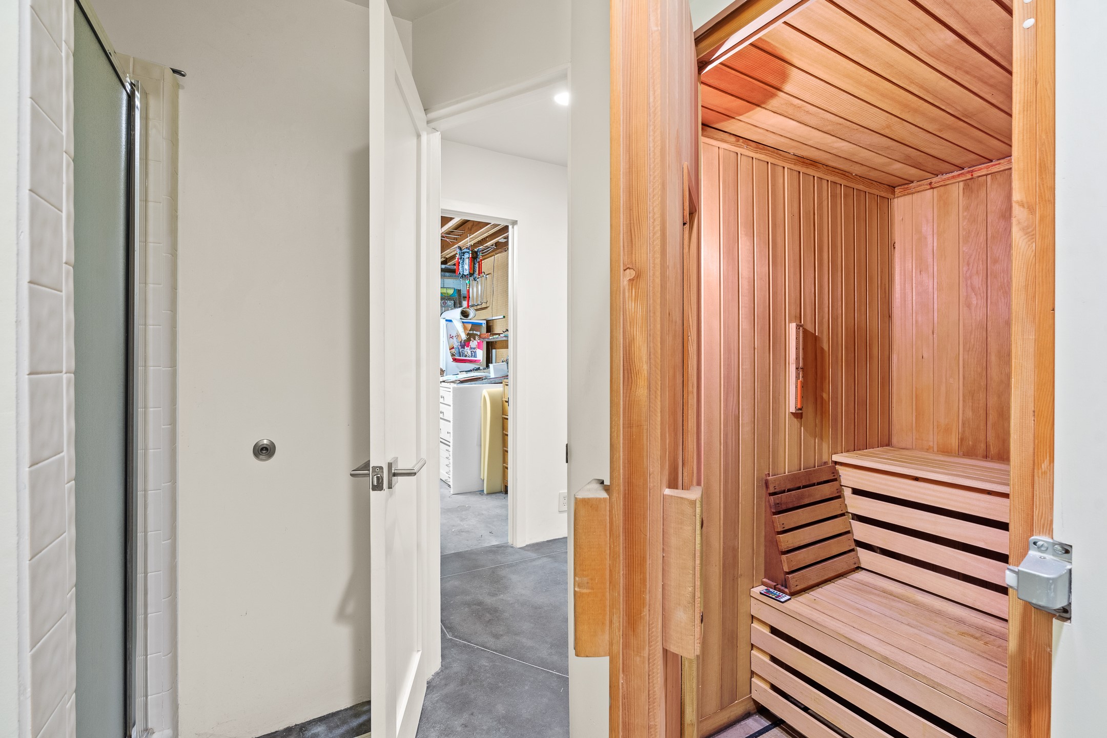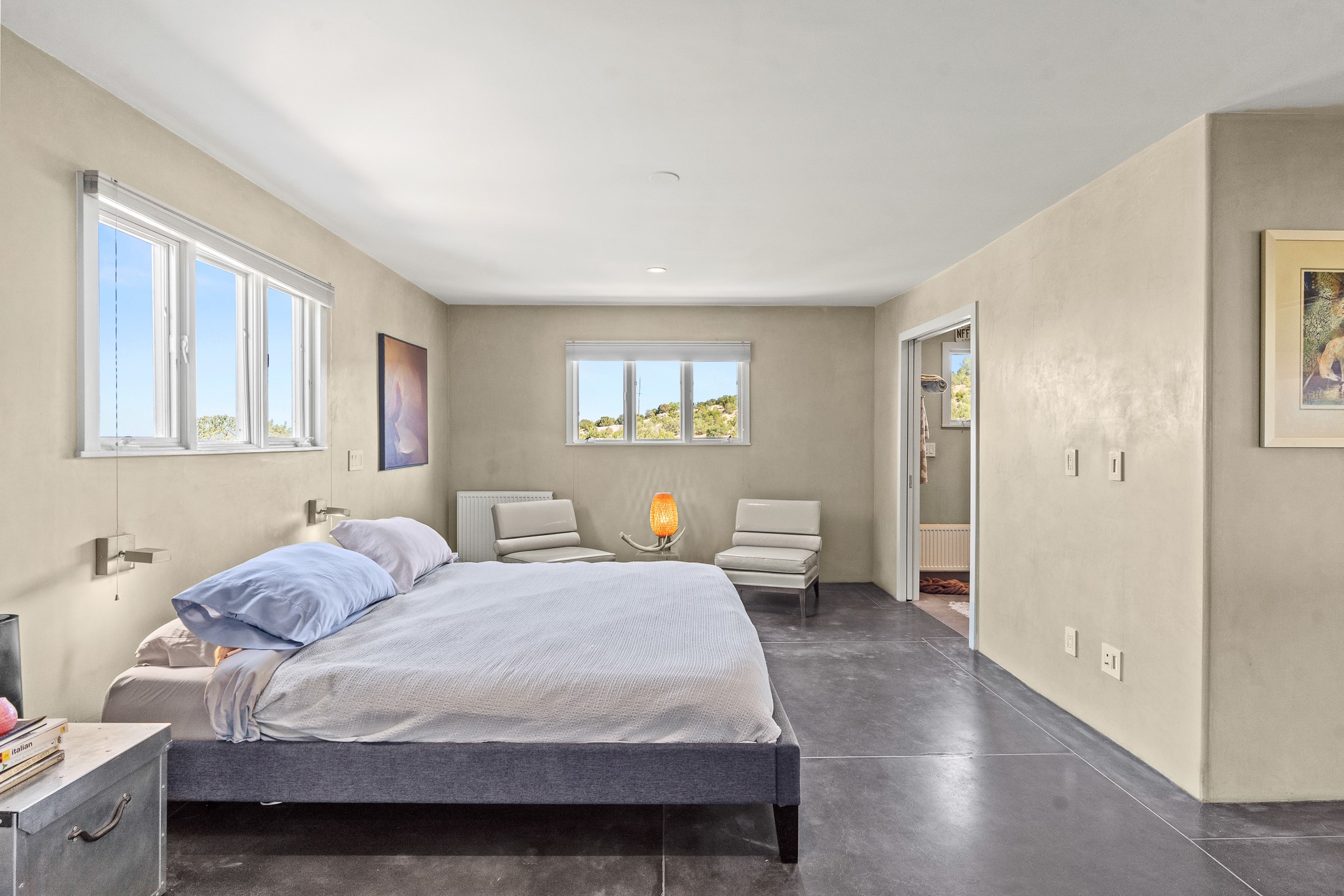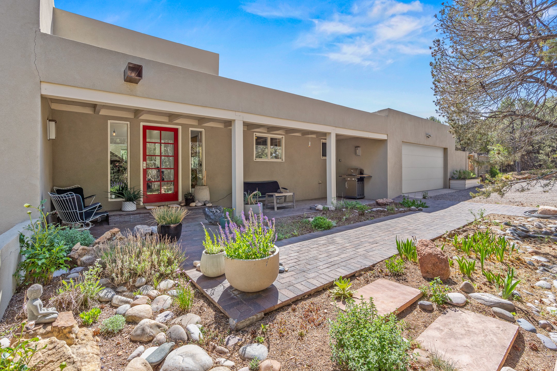 Modern Santa Fe Retreat with Pool, Hot Tub & Sauna on 1.9 Acres. Discover contemporary comfort just off Old Santa Fe Trail. This beautifully designed 4-bedroom, 4-bathroom home offers approx. 3,900 sq. ft. of stylish living space on 1.9 private acres--just 10 minutes from the Santa Fe Plaza. Enjoy a light-filled, open-concept living and dining area with large picture windows that frame views of the expansive backyard, complete with a patio, swimming pool, and hot tub--ideal for entertaining or relaxing under the New Mexico sky. The gourmet kitchen features high-end appliances, plenty of natural light, and a modern layout perfect for cooking and gathering. The spacious primary suite flows into a versatile open area--ideal as a family room, home office, or art studio. Downstairs, three guest bedrooms share a luxurious full bathroom. At the end of the hall is a separate fully finished basement perfect for a family room/game room which includes ample storage space. Adjoining the family room is a cedar sauna and bath for spa-like relaxation. The 1.9 acre lot is adorned by a pinon forest with serene walking trails which connect to the trails of the Mountain Cloud Zen center and the foothills of Santa Fe. This neighborhood boasts the fastest internet in Santa Fe. Whether you're looking for a full-time residence with the perfect work from home environment or a serene escape, this home blends modern amenities with the peaceful charm of Santa Fe living.