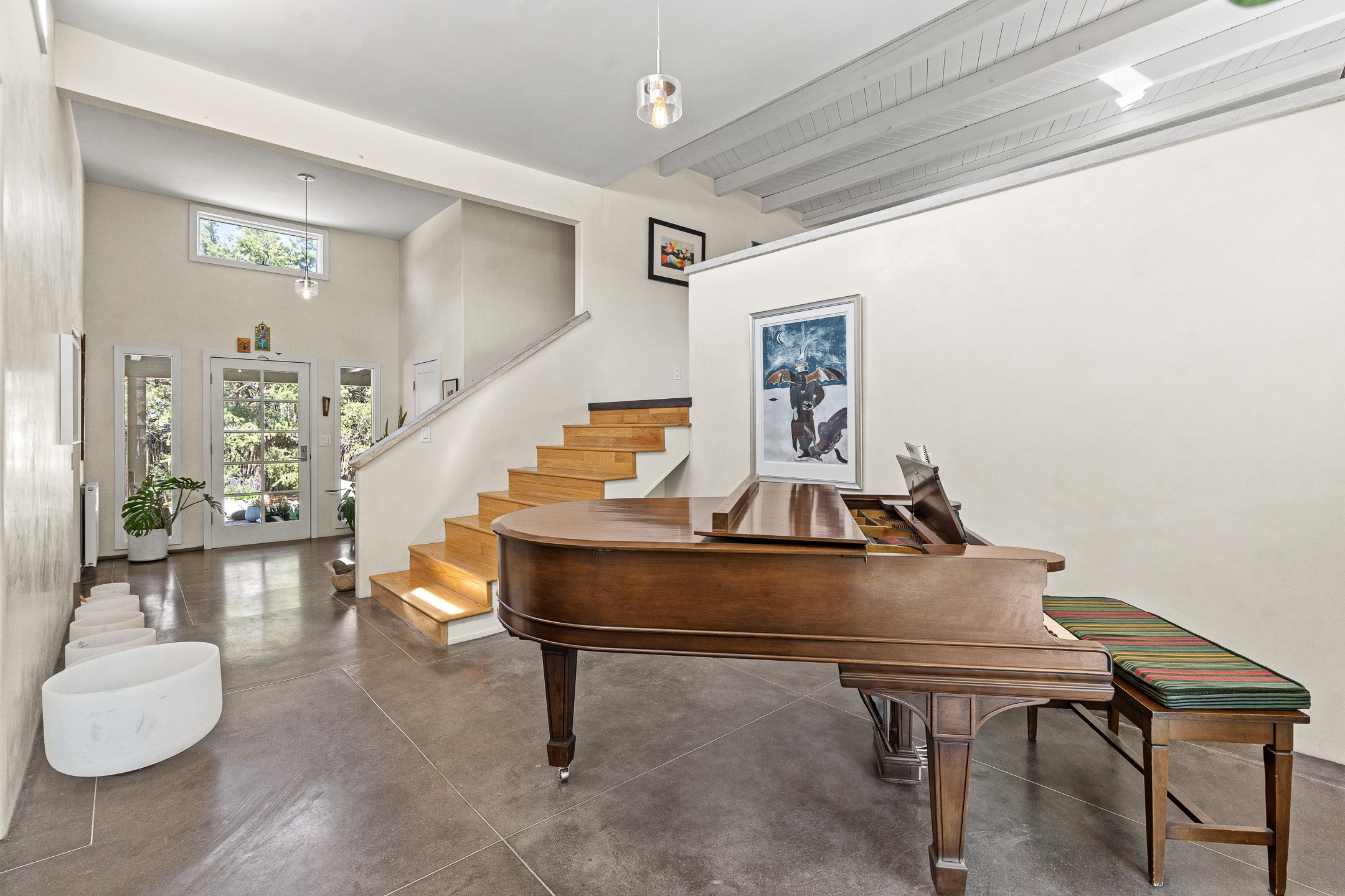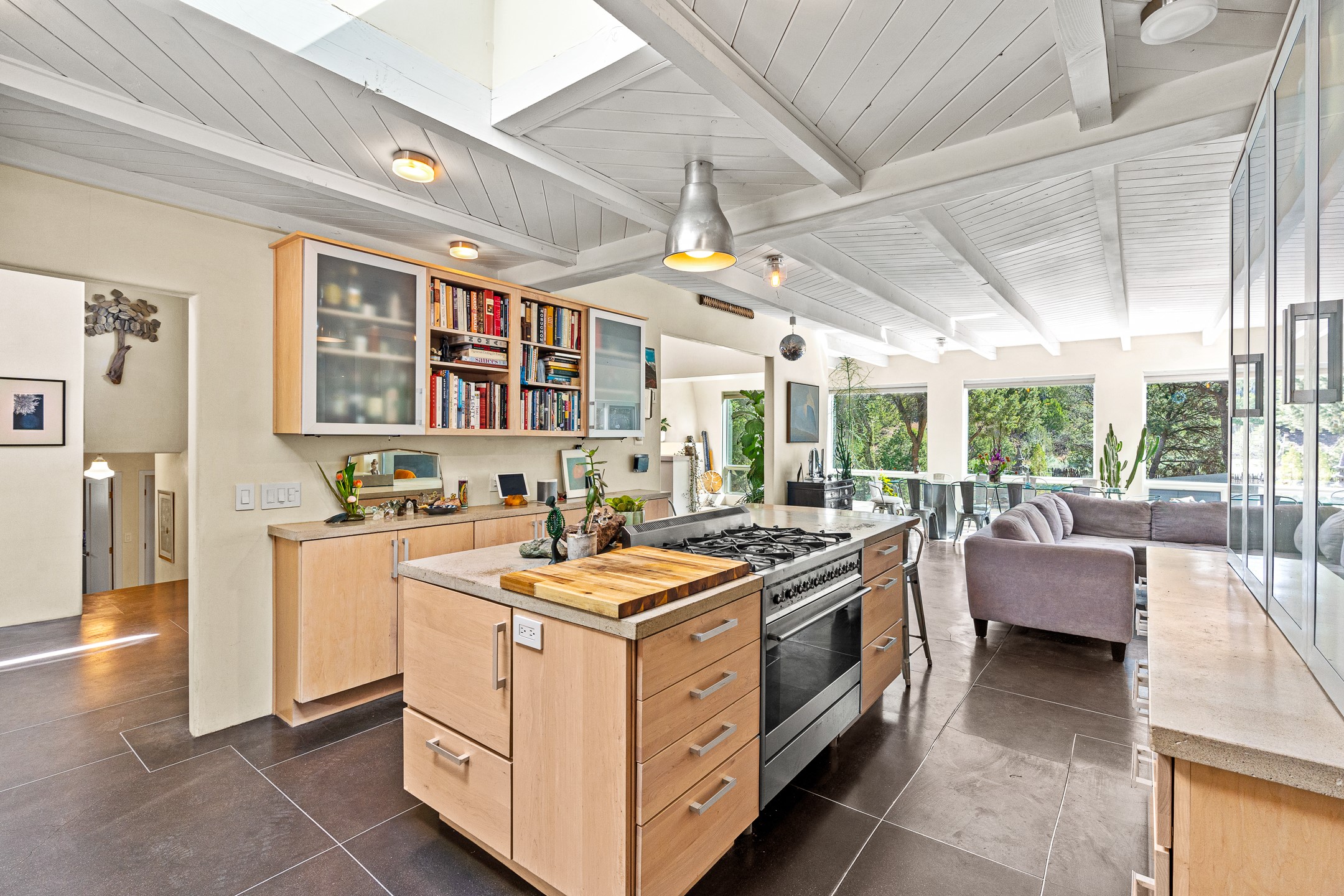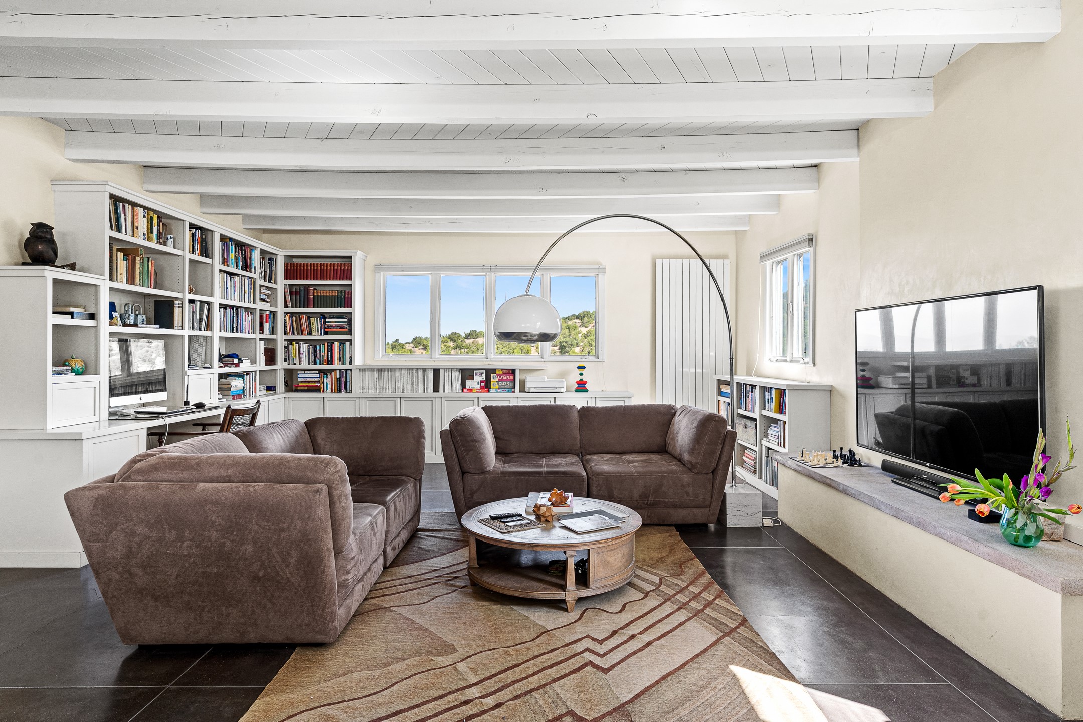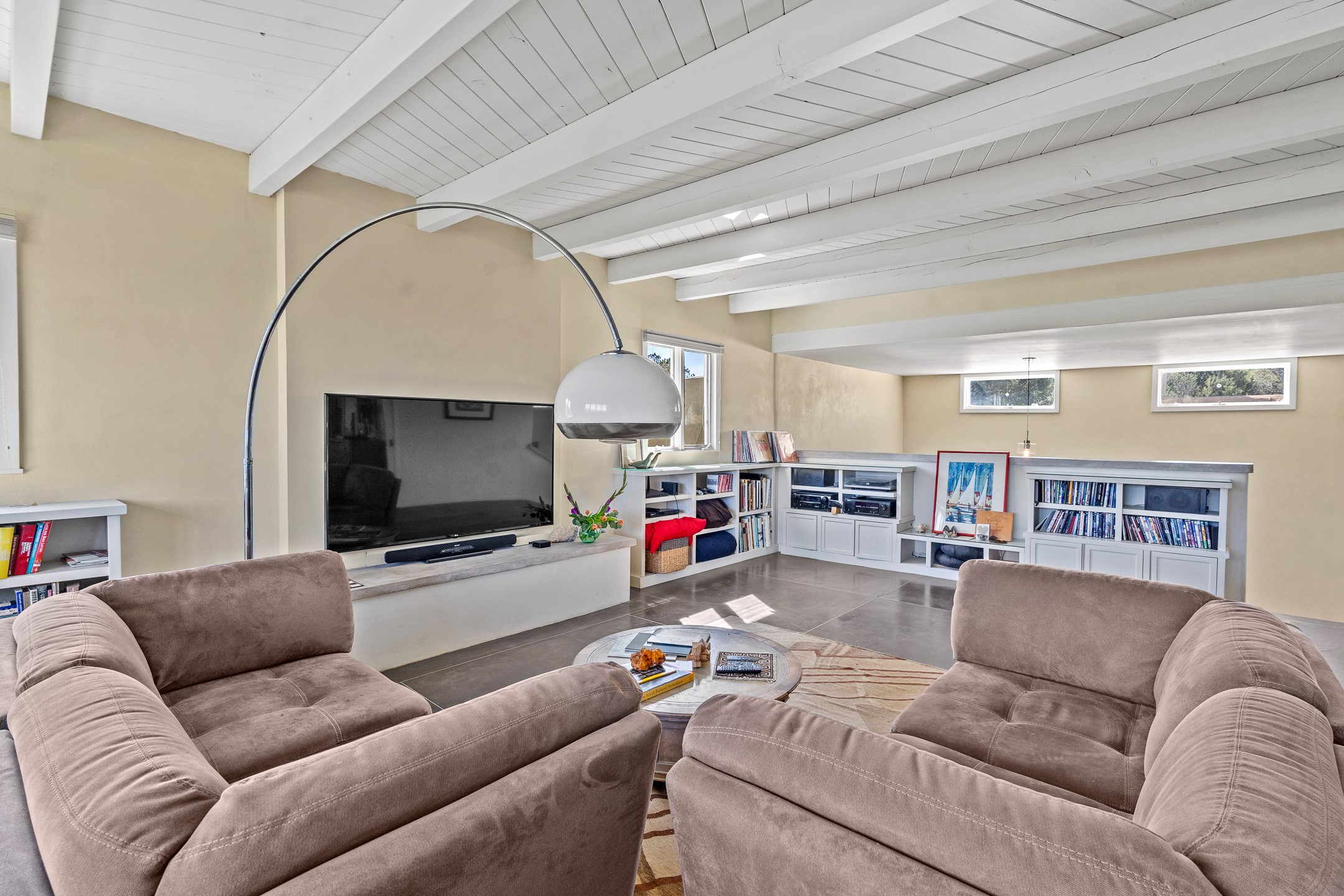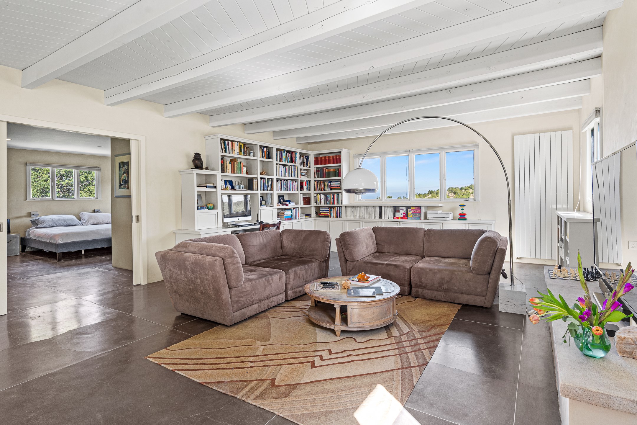Modern Santa Fe Retreat with Pool, Hot Tub & Sauna on 1.9 Acres. Discover contemporary comfort just off Old Santa Fe Trail. This beautifully designed 4-bedroom, 4-bathroom home offers approx. 3,900 sq. ft. of stylish living space on 1.9 private acres--just 10 minutes from the Santa Fe Plaza. Enjoy a light-filled, open-concept living and dining area with large picture windows that frame views of the expansive backyard, complete with a patio, swimming pool, and hot tub--ideal for entertaining or relaxing under the New Mexico sky. The gourmet kitchen features high-end appliances, plenty of natural light, and a modern layout perfect for cooking and gathering. The spacious primary suite flows into a versatile open area--ideal as a family room, home office, or art studio. Downstairs, three guest bedrooms share a luxurious full bathroom. At the end of the hall is a separate fully finished basement perfect for a family room/game room which includes ample storage space. Adjoining the family room is a cedar sauna and bath for spa-like relaxation. The 1.9 acre lot is adorned by a pinon forest with serene walking trails which connect to the trails of the Mountain Cloud Zen center and the foothills of Santa Fe. This neighborhood boasts the fastest internet in Santa Fe. Whether you're looking for a full-time residence with the perfect work from home environment or a serene escape, this home blends modern amenities with the peaceful charm of Santa Fe living.